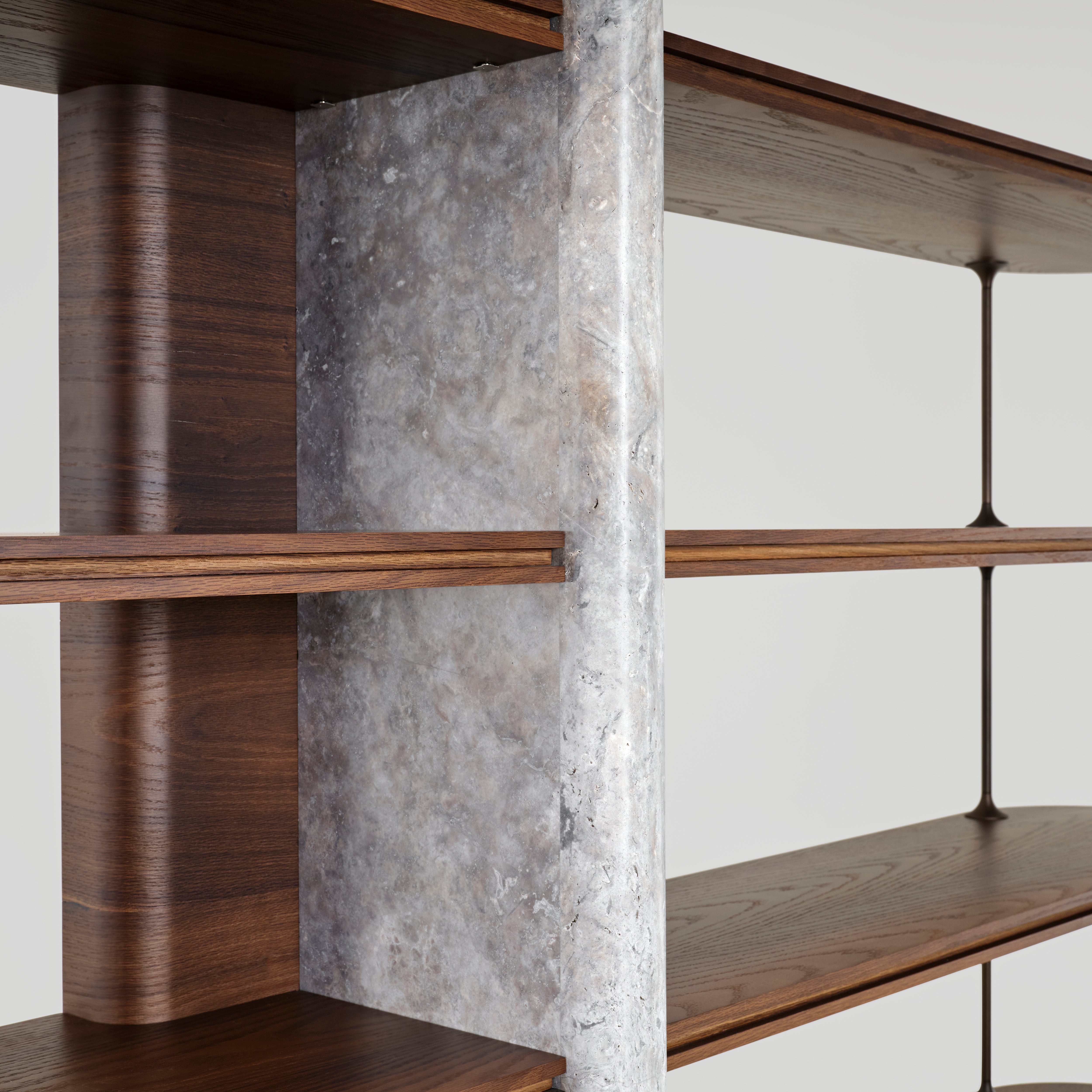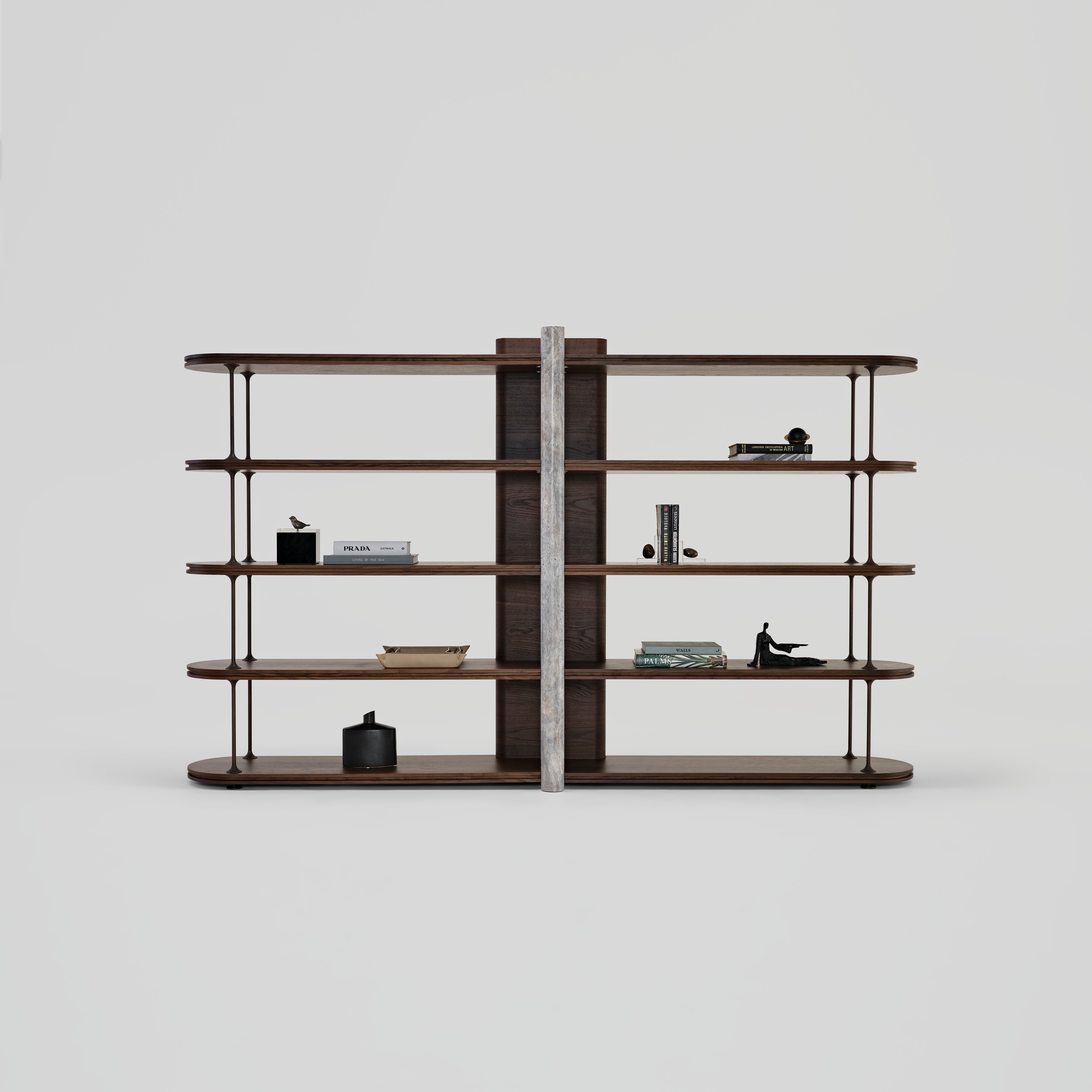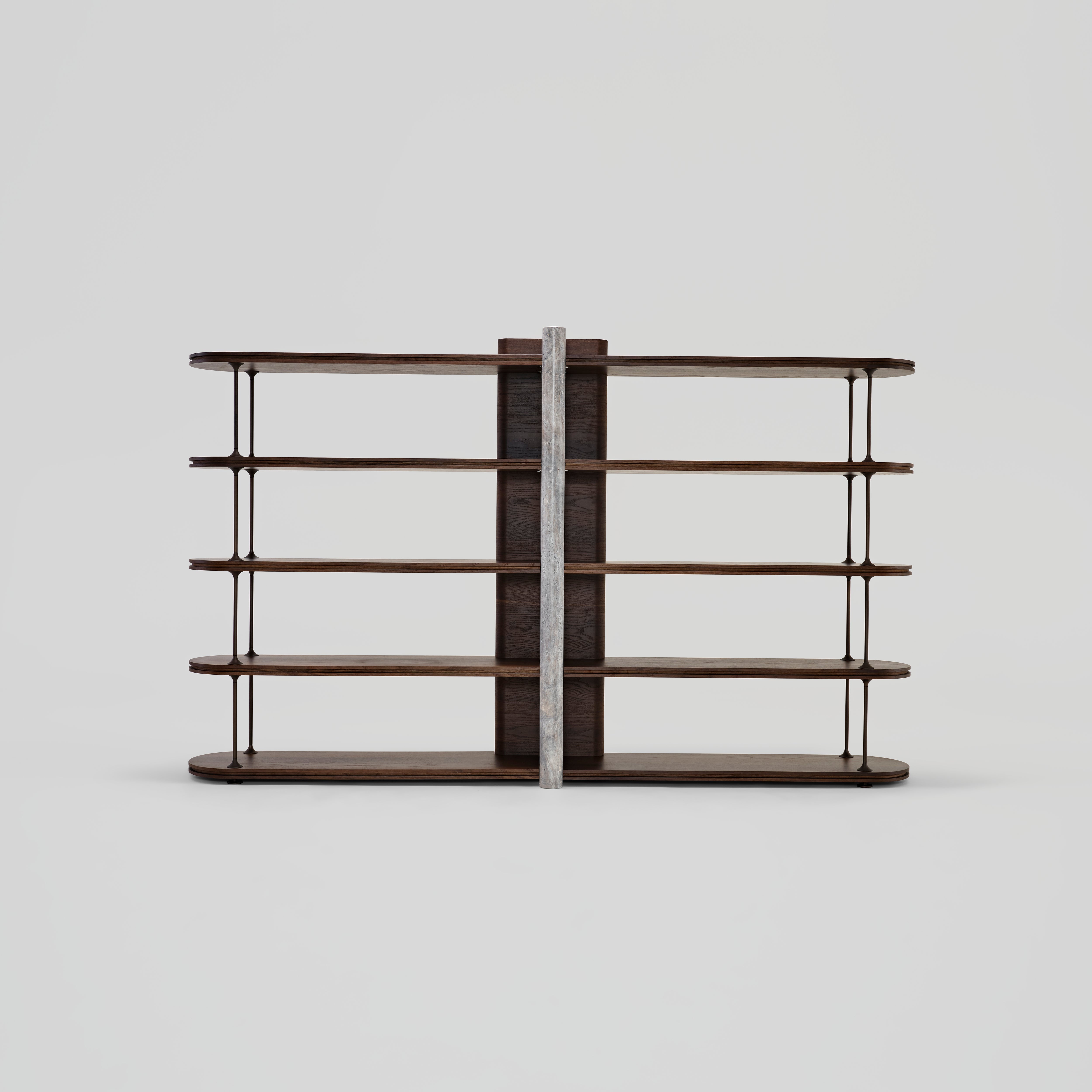 Odeon reads like a piece of contemporary architecture, anchored by a central spine that divides and defines its rhythm. The floating tiers stretch outward with effortless composure, creating spaces that feel both curated and free. Airy, grounded, and quietly commanding, it becomes a sculptural anchor for books, objects, and the room itself.