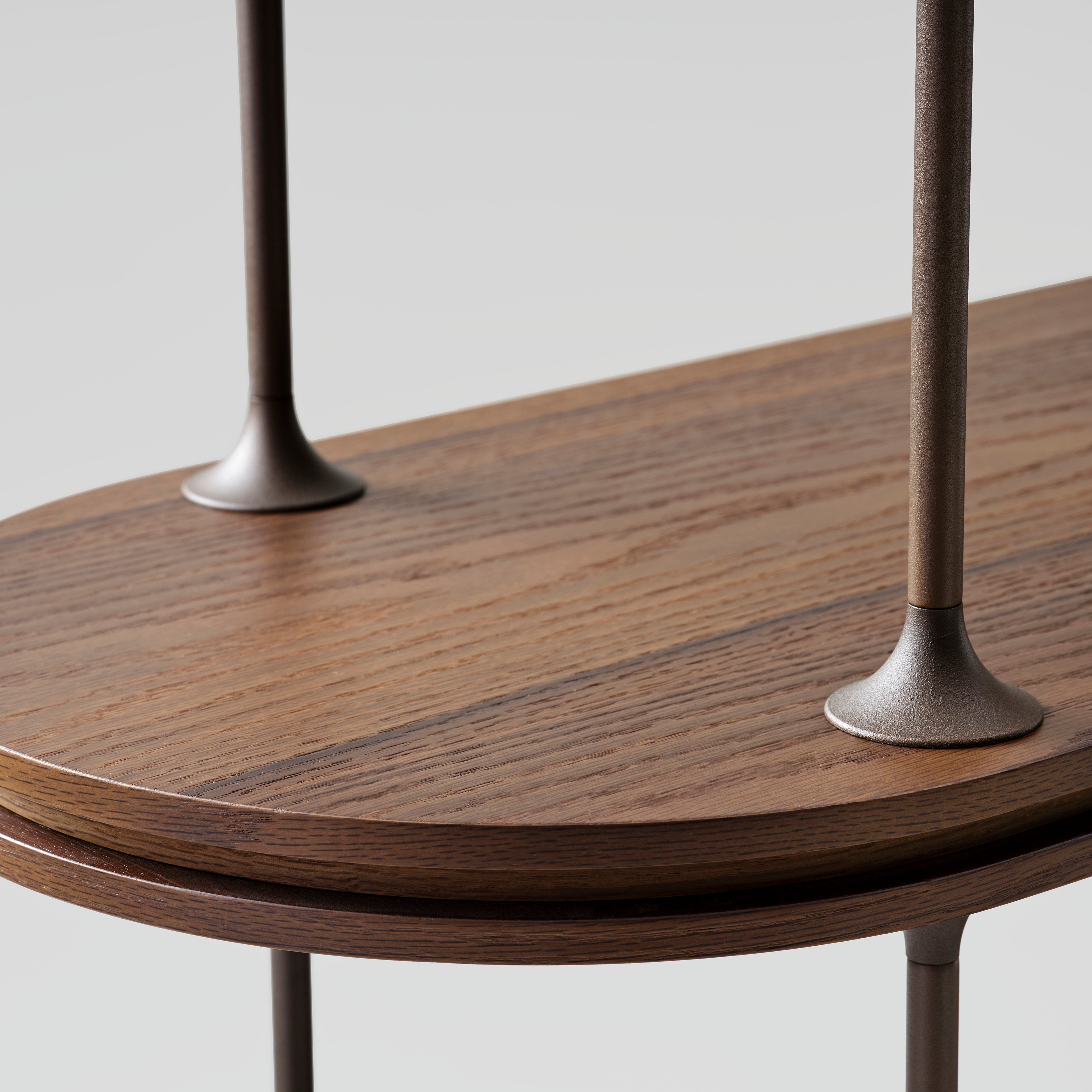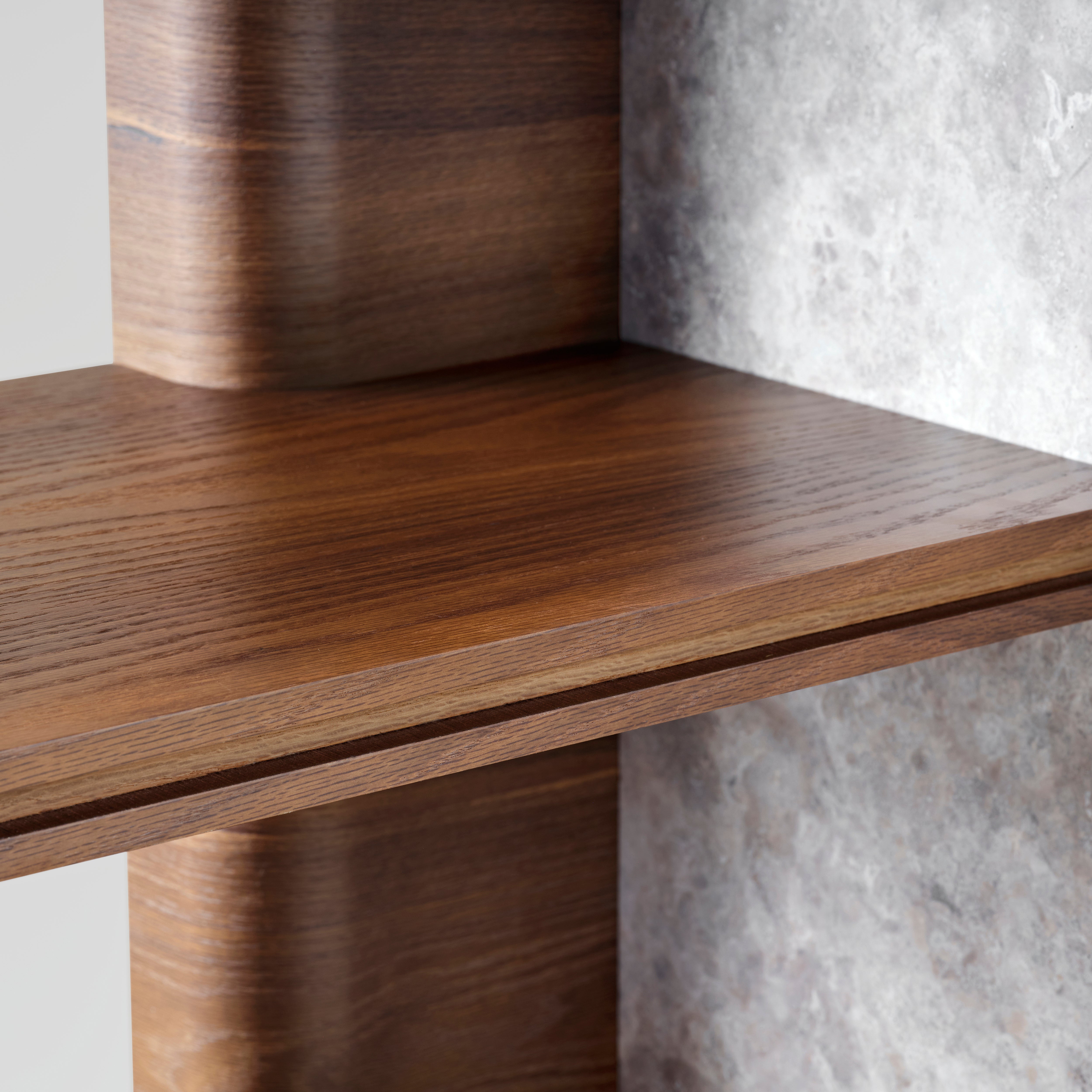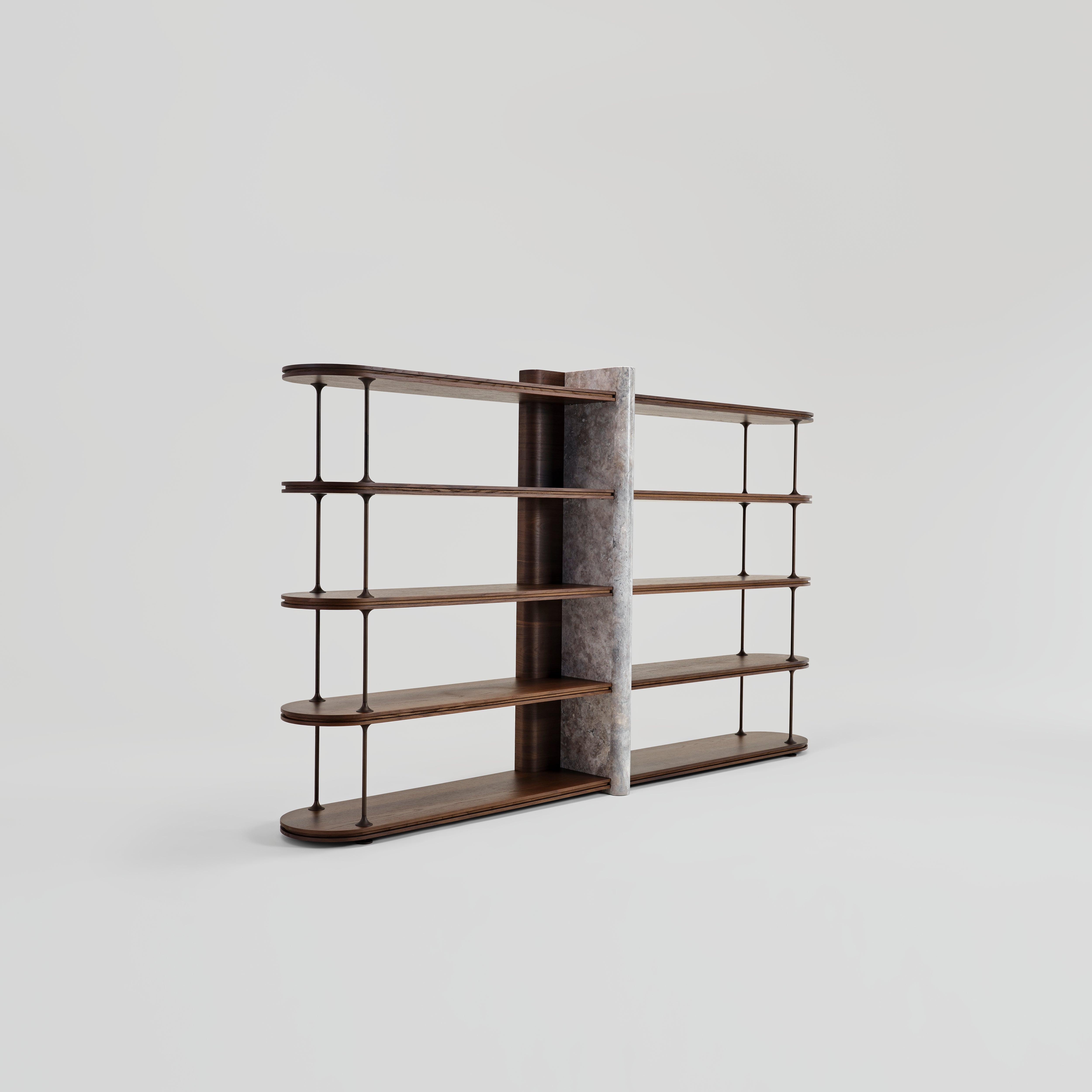 Odeon reads like a piece of contemporary architecture, anchored by a central spine that divides and defines its rhythm. The floating tiers stretch outward with effortless composure, creating spaces that feel both curated and free. Airy, grounded, and quietly commanding, it becomes a sculptural anchor for books, objects, and the room itself.