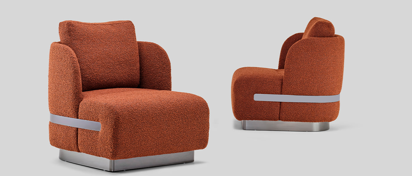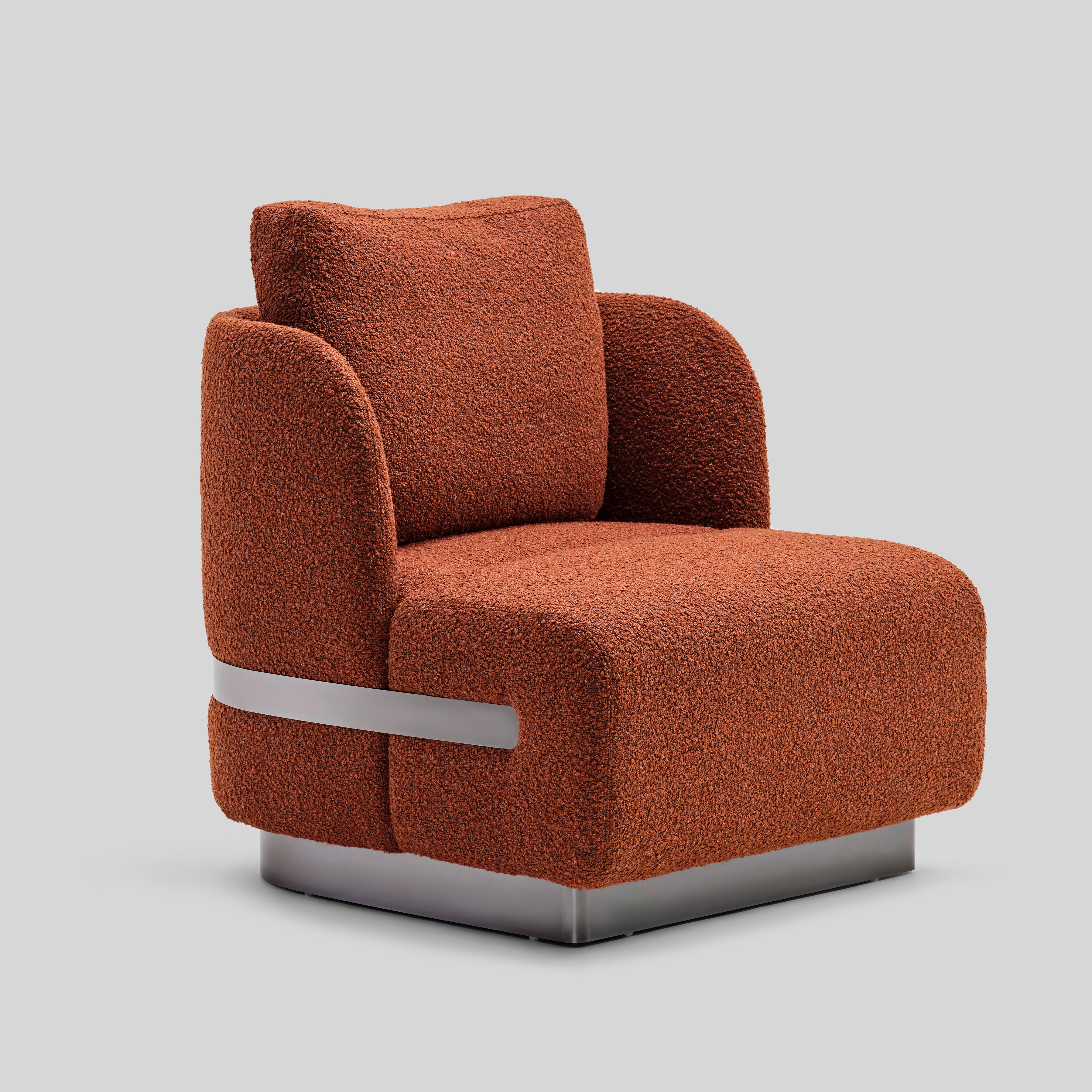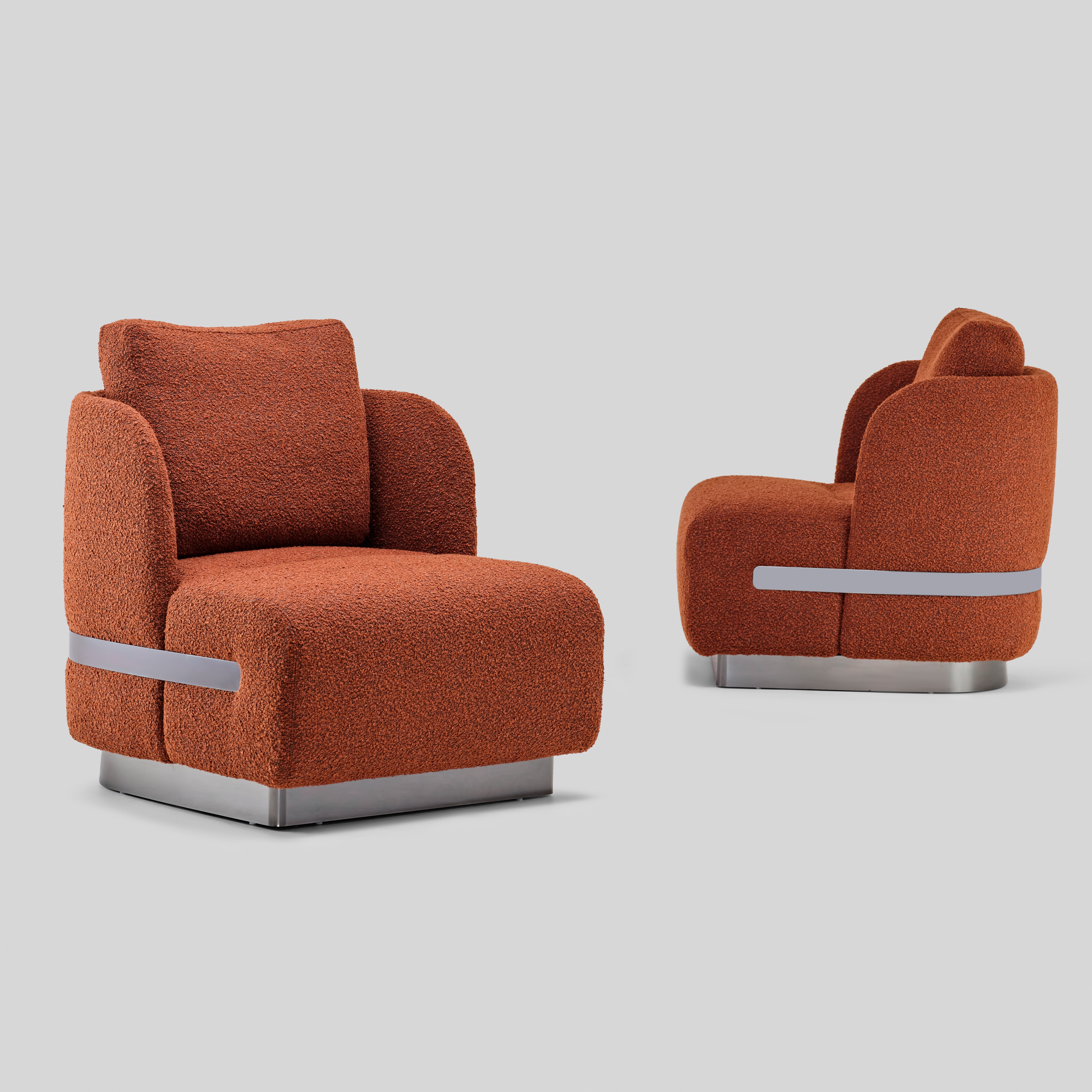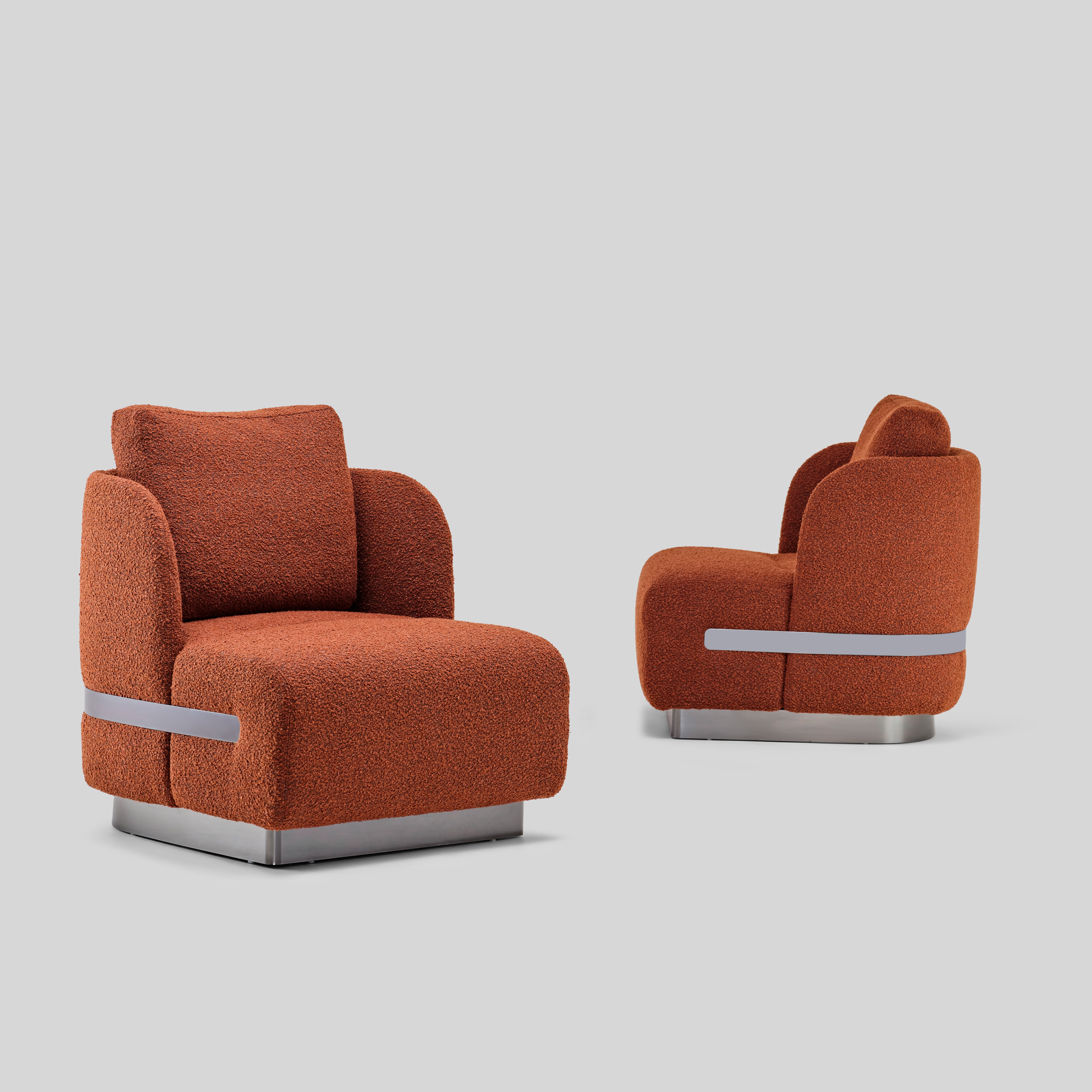 Grace and intention meet in this lounge chair, its gentle arc offering an effortless, welcoming embrace. A refined mid-band adds crisp contemporary contrast, while the fully upholstered form balances structural finesse with quiet emotional warmth, creating a presence that feels artful, composed, and assured.