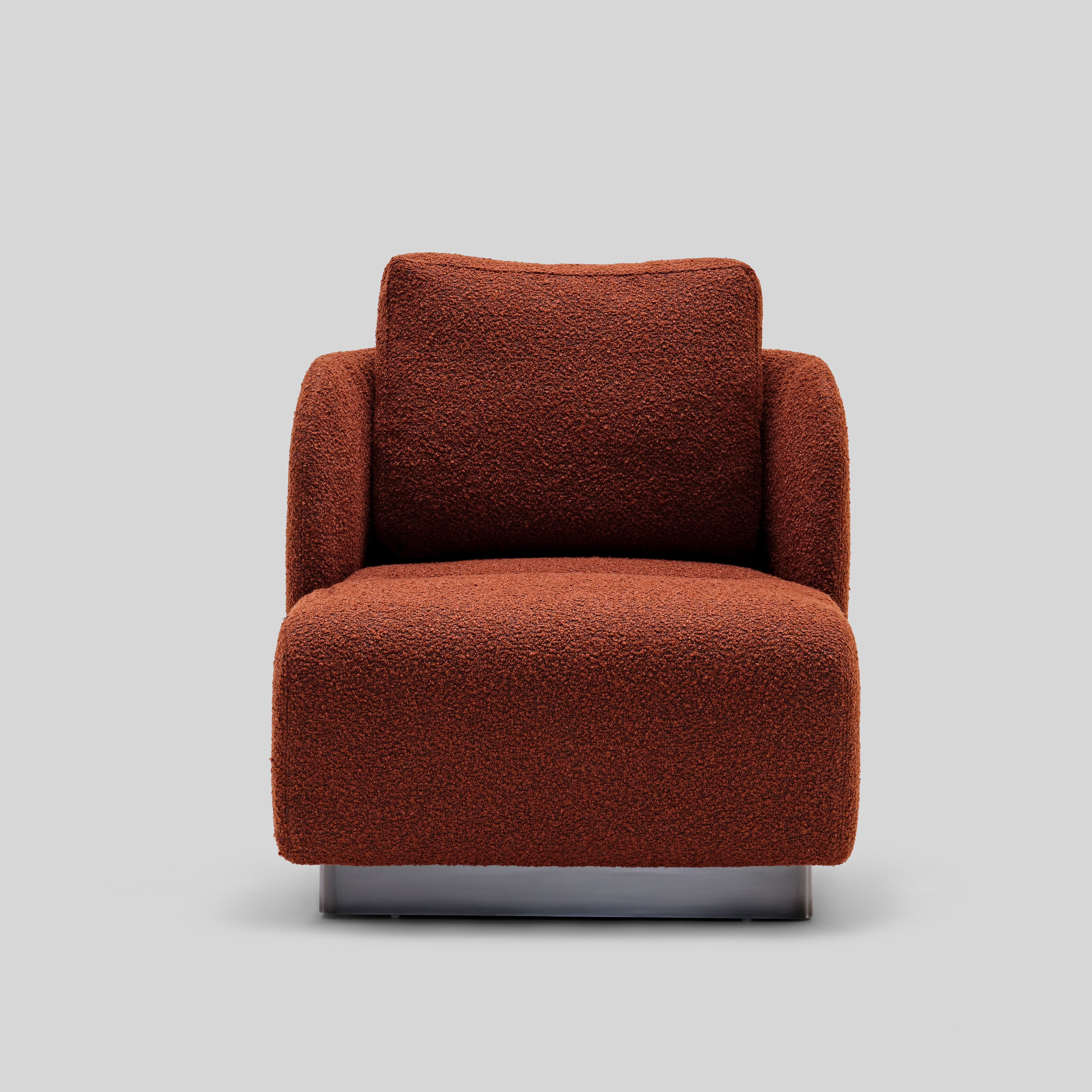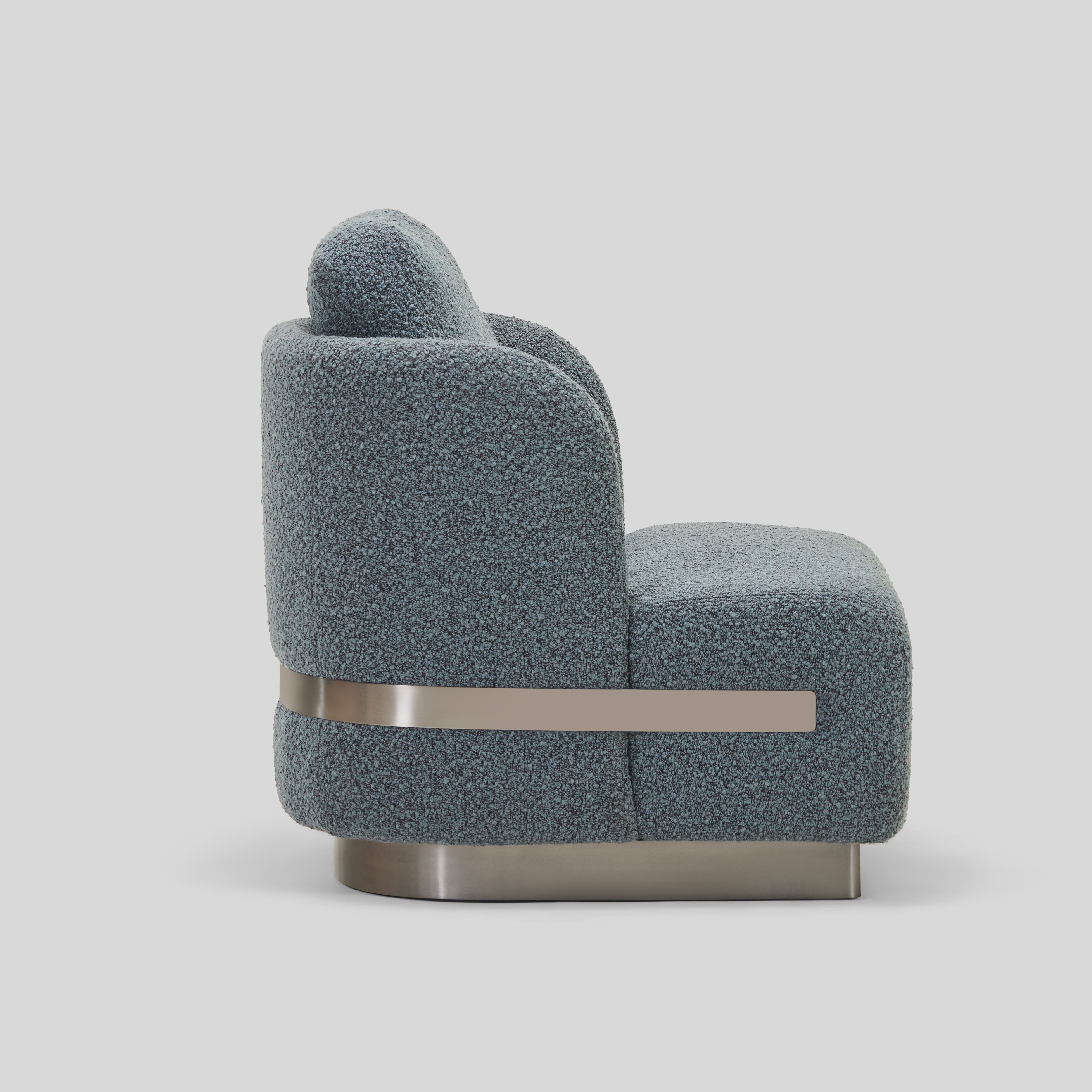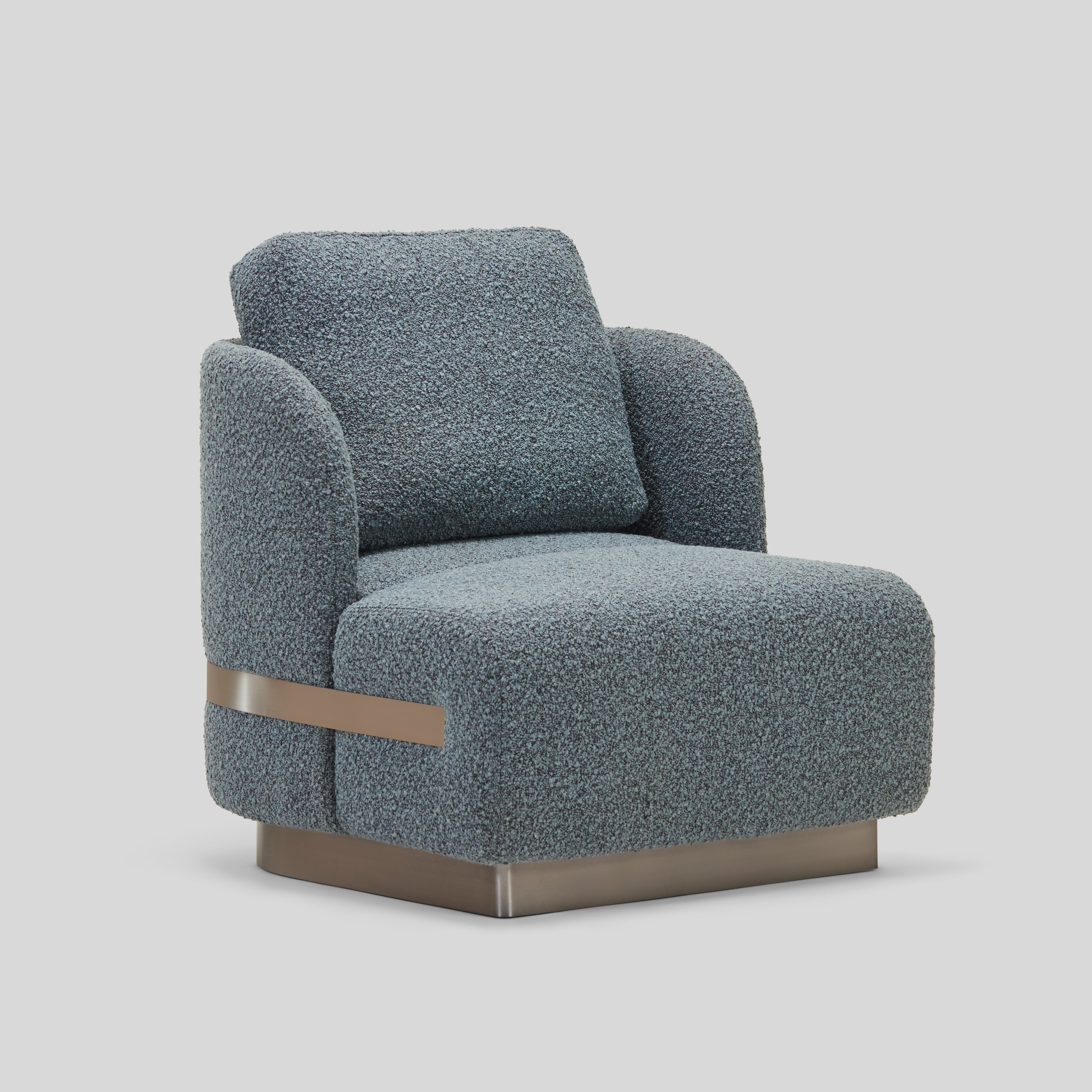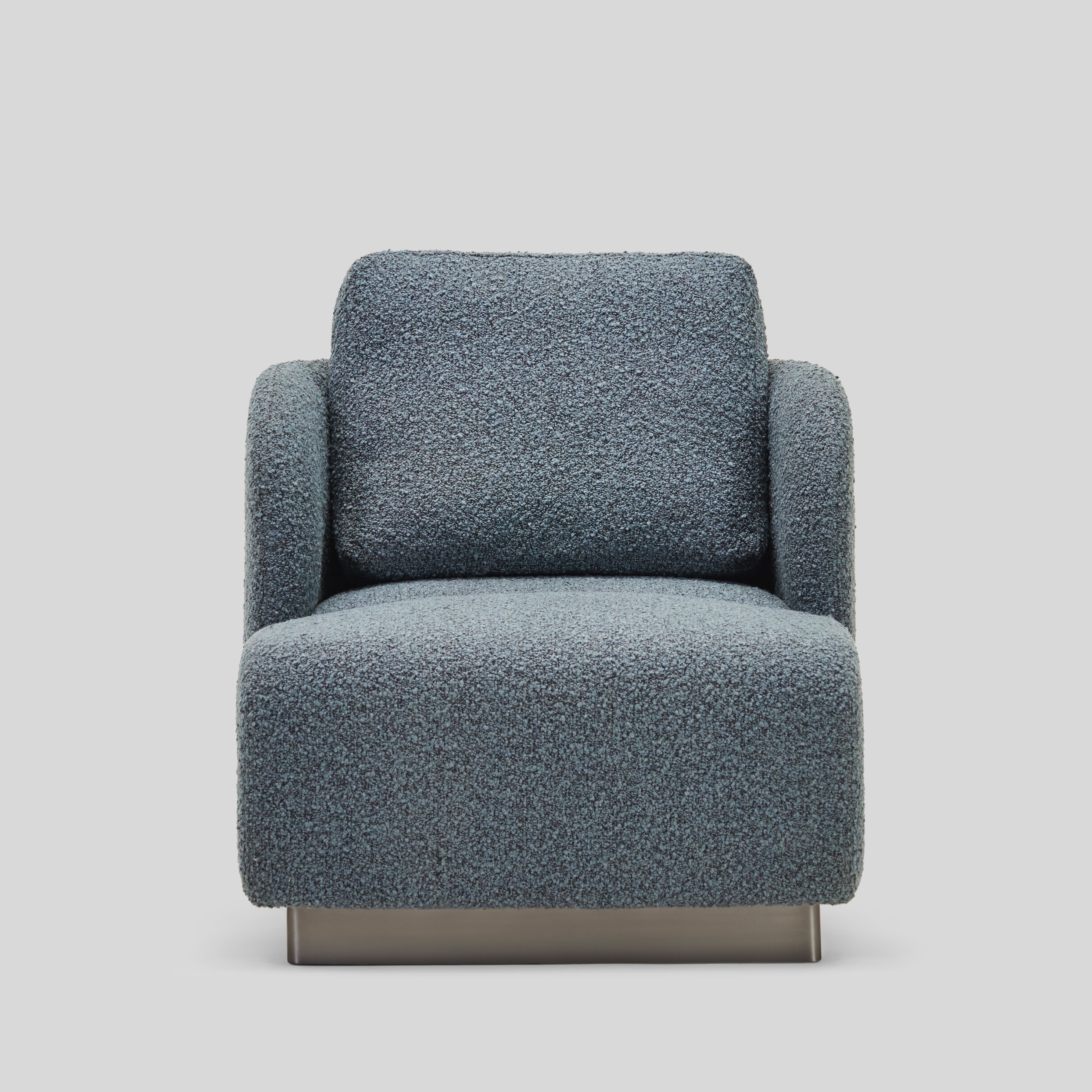 Grace and intention meet in this lounge chair, its gentle arc offering an effortless, welcoming embrace. A refined mid-band adds crisp contemporary contrast, while the fully upholstered form balances structural finesse with quiet emotional warmth, creating a presence that feels artful, composed, and assured.