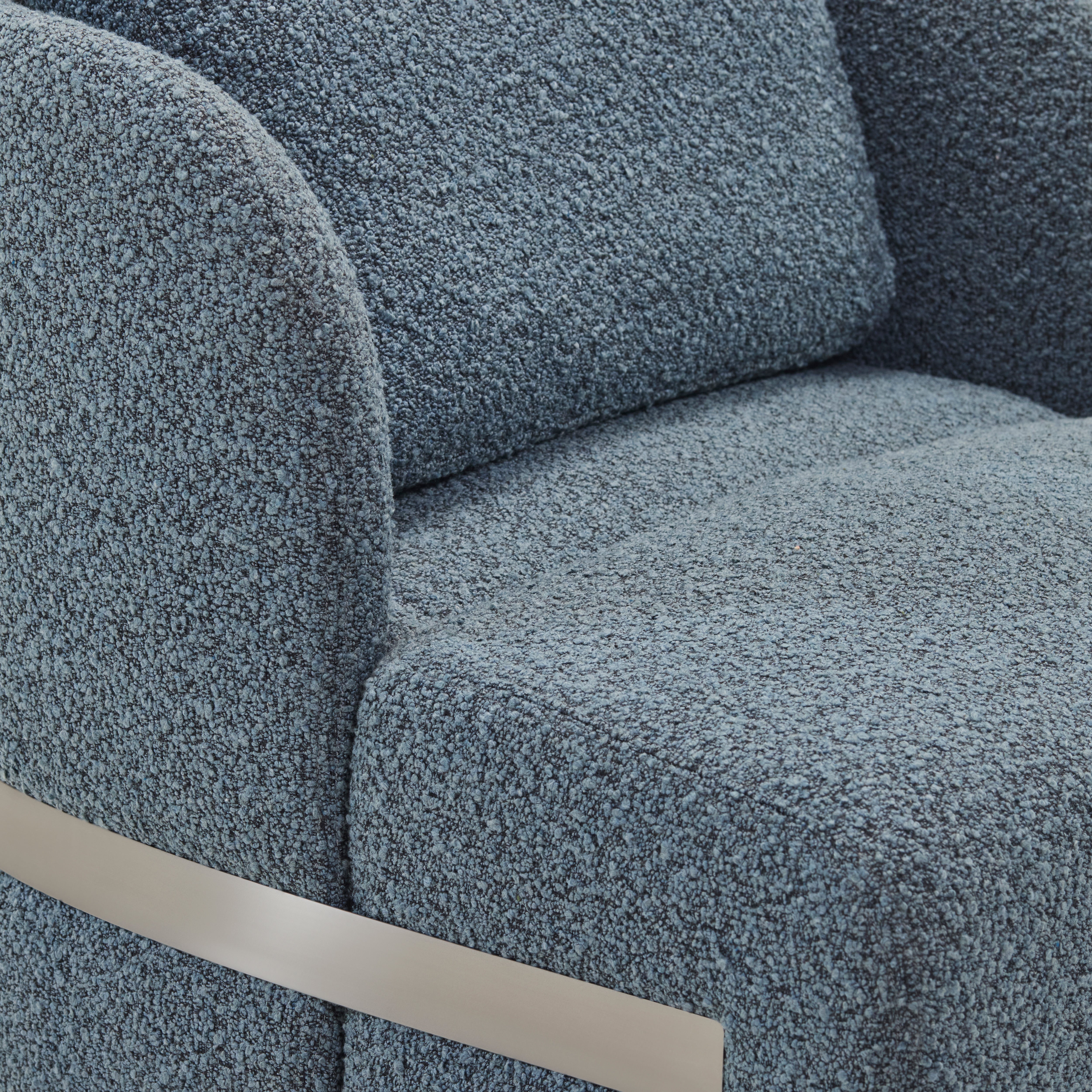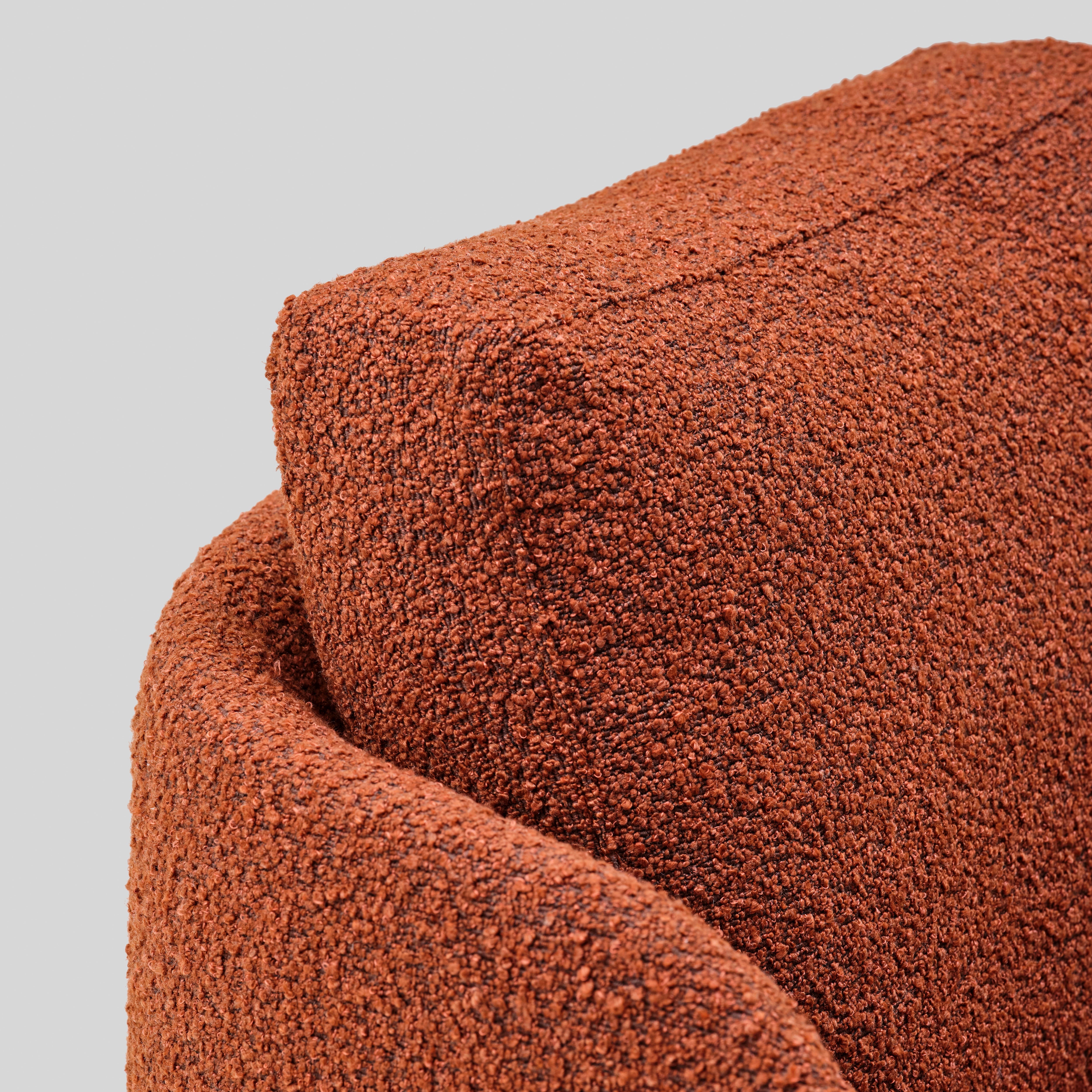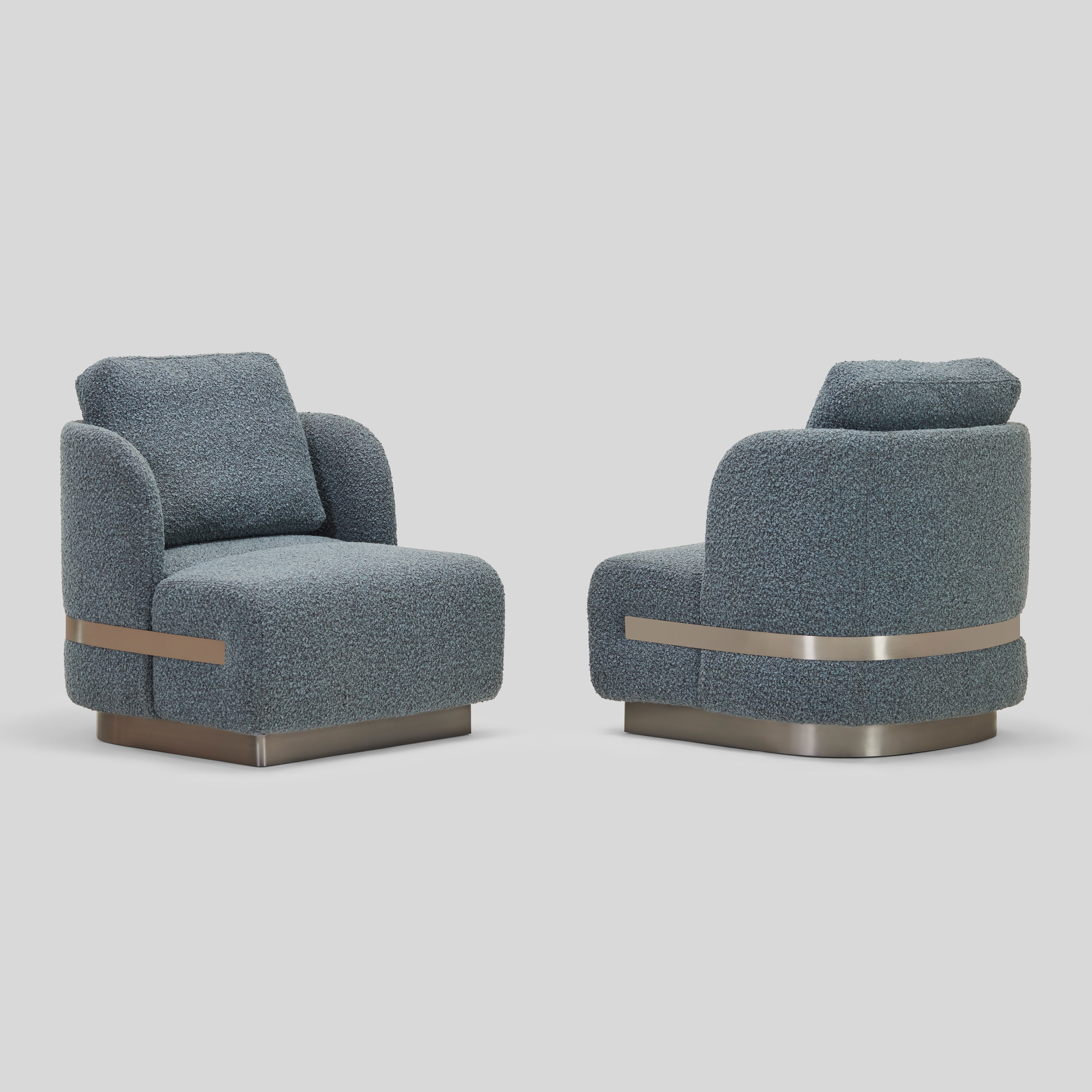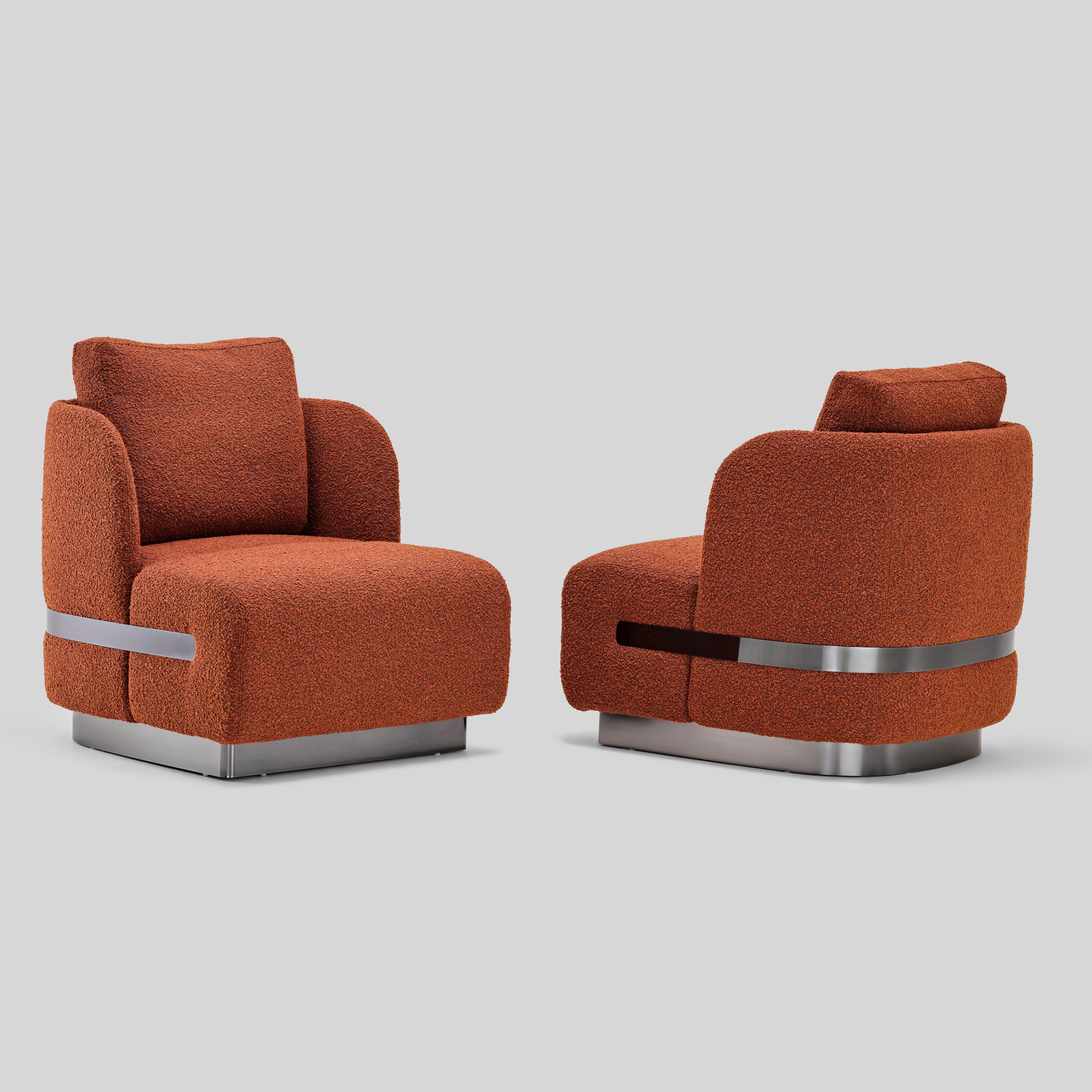 Grace and intention meet in this lounge chair, its gentle arc offering an effortless, welcoming embrace. A refined mid-band adds crisp contemporary contrast, while the fully upholstered form balances structural finesse with quiet emotional warmth, creating a presence that feels artful, composed, and assured.