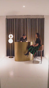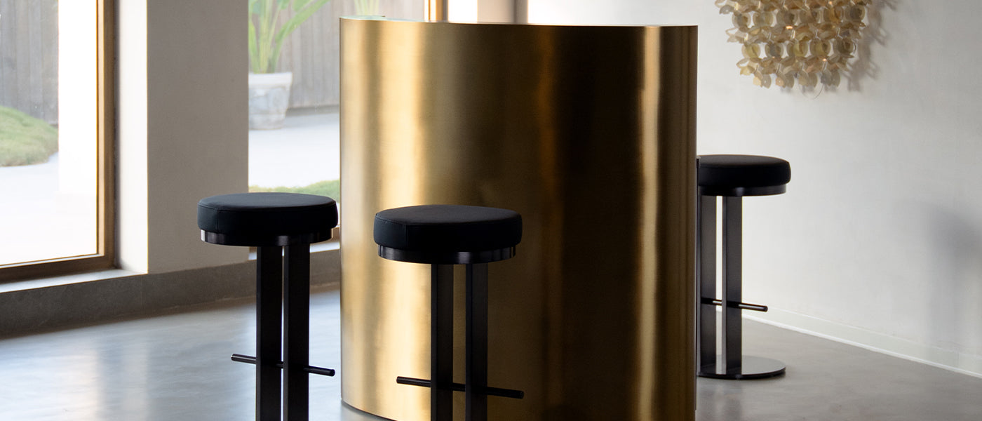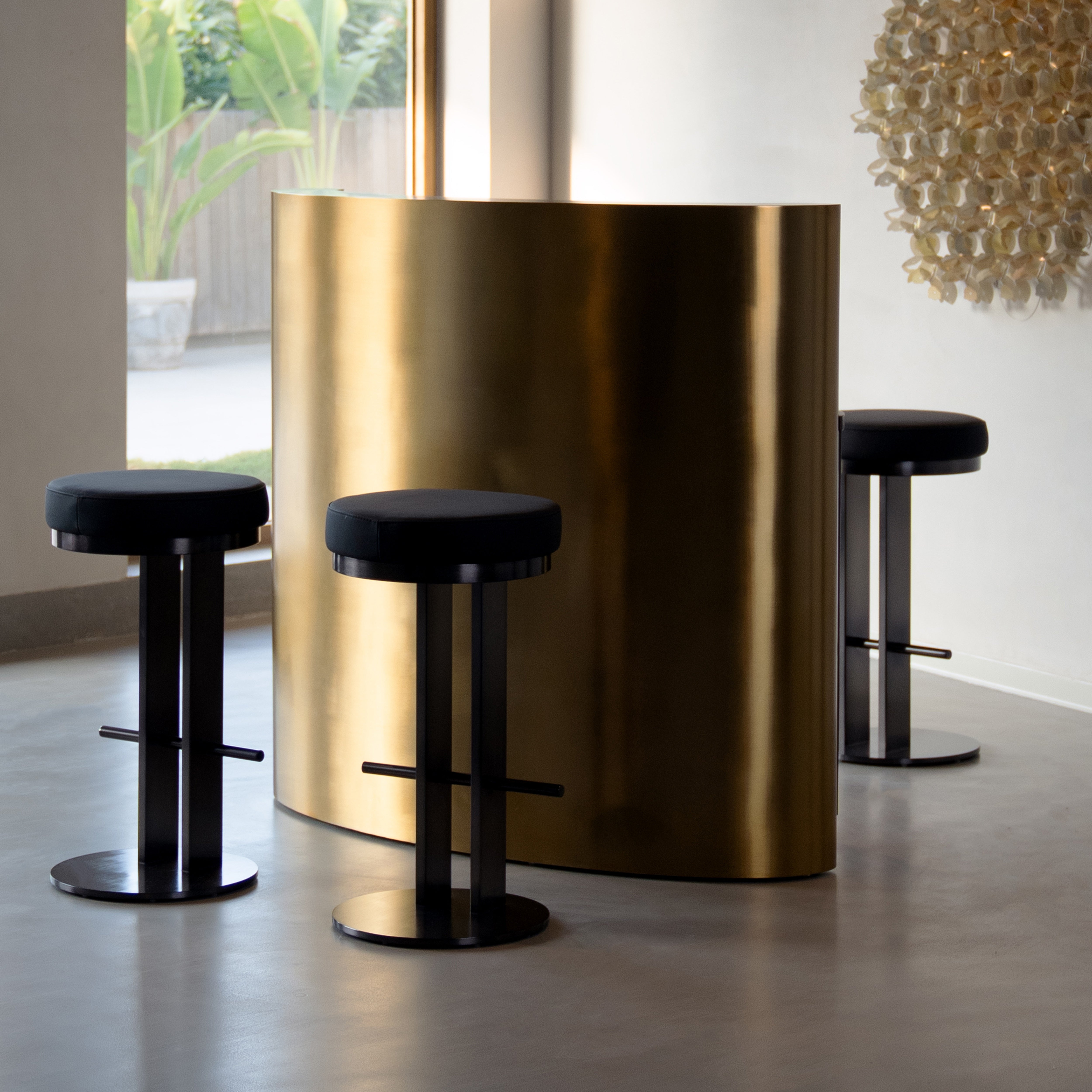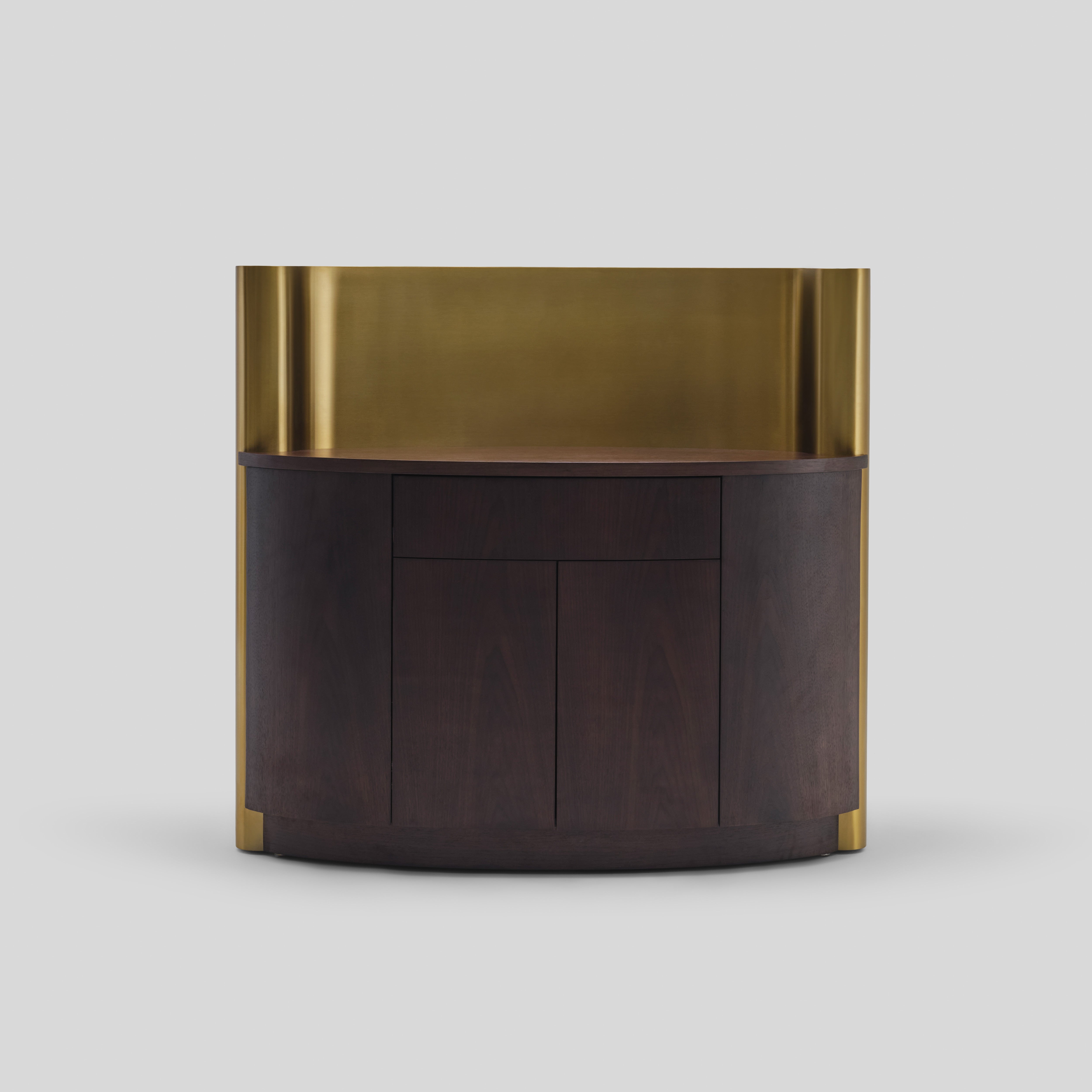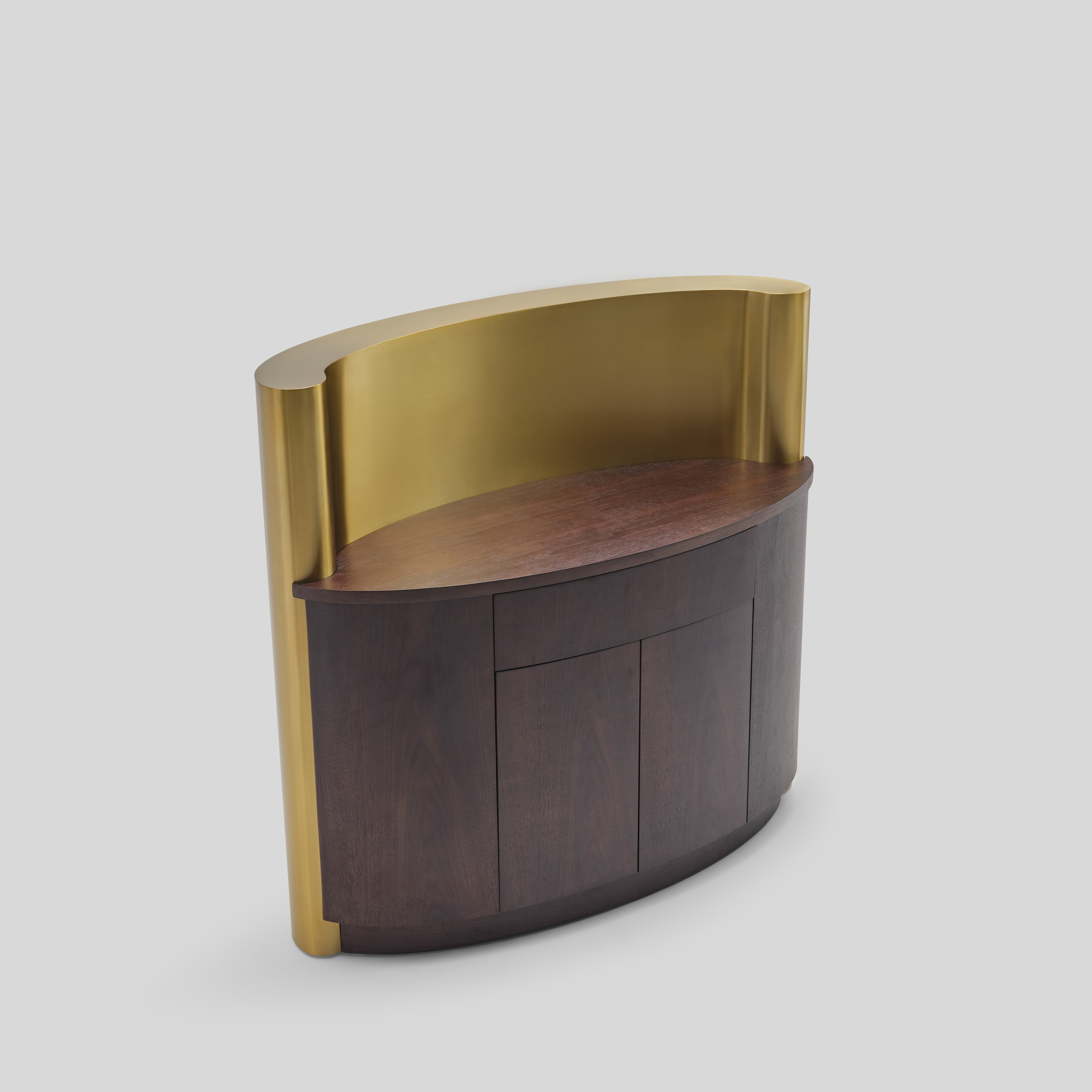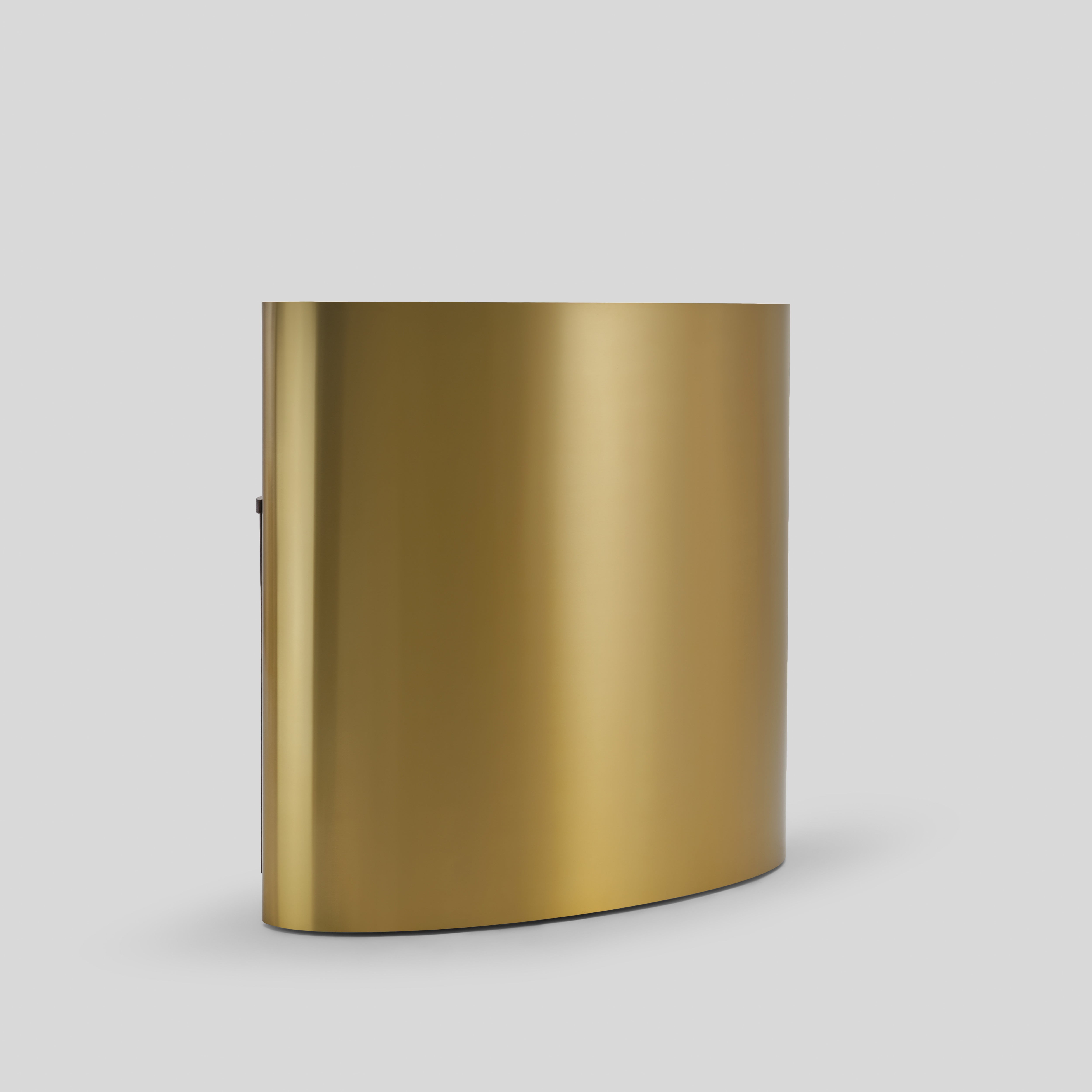 Gin bar arrives with an elegant restraint, its curved metal façade enveloping the wooden interior in a soft, golden glow. Graceful and composed, it lends contemporary spaces a poised sophistication that never needs to speak loudly, allowing its quiet confidence and impeccable finish to define the room with ease.