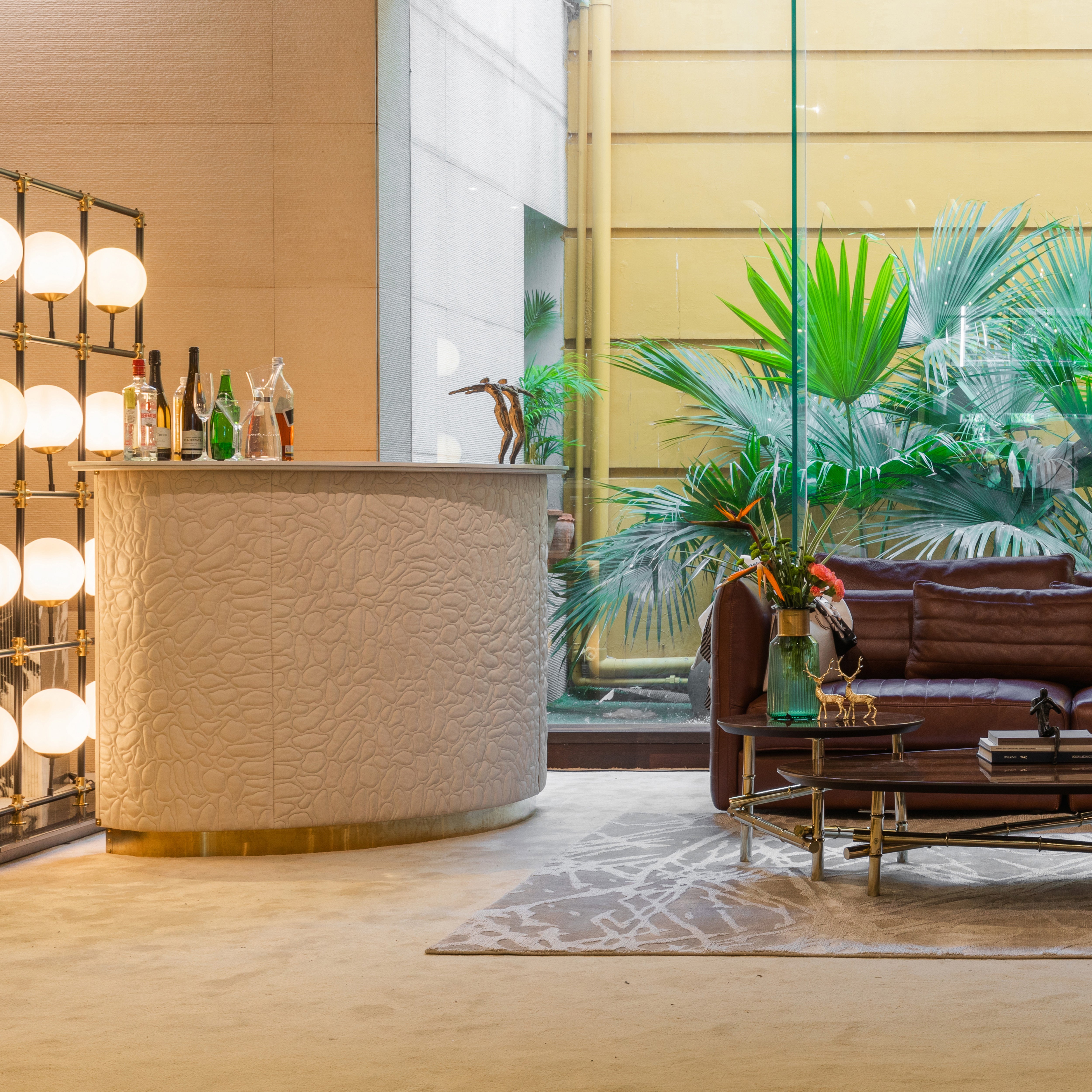 Mass's curved form, wrapped in a textured pattern that feels both modern and quietly luxurious, gives a gentle radiance. The soft top glow enhances its sculpted silhouette, adding warmth without excess. Perfect for corners and minimal home bar setups, it creates a welcoming focal point with effortless grace.