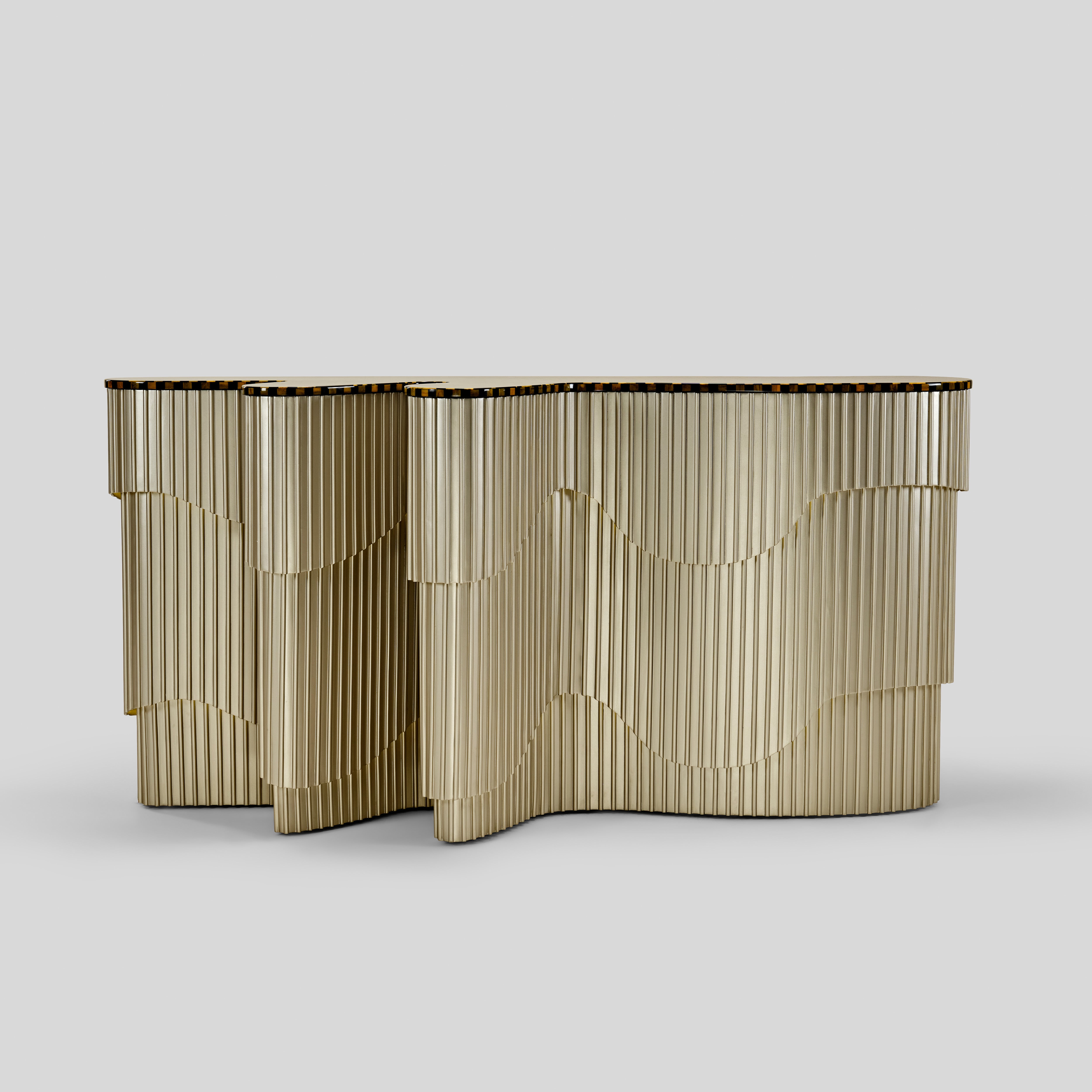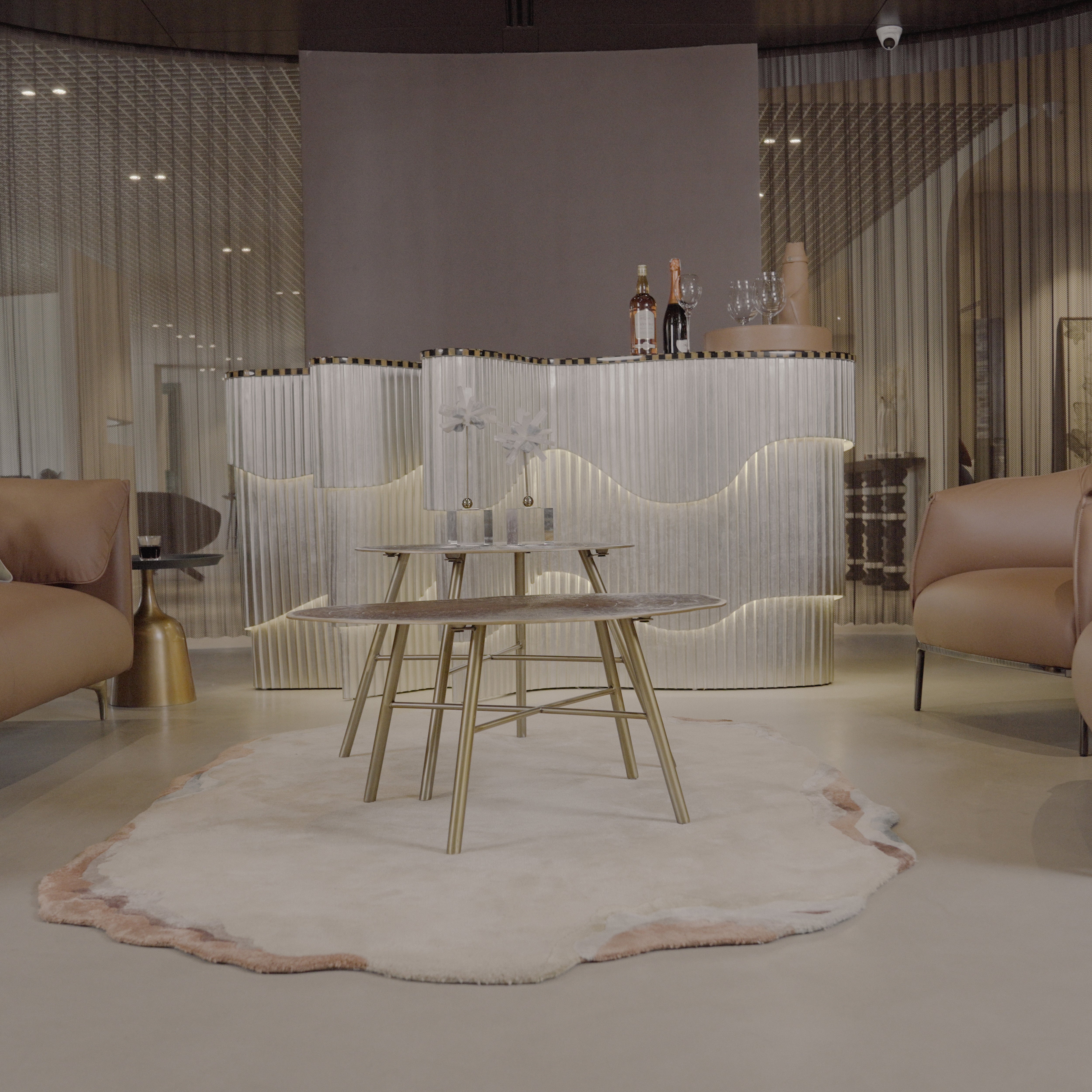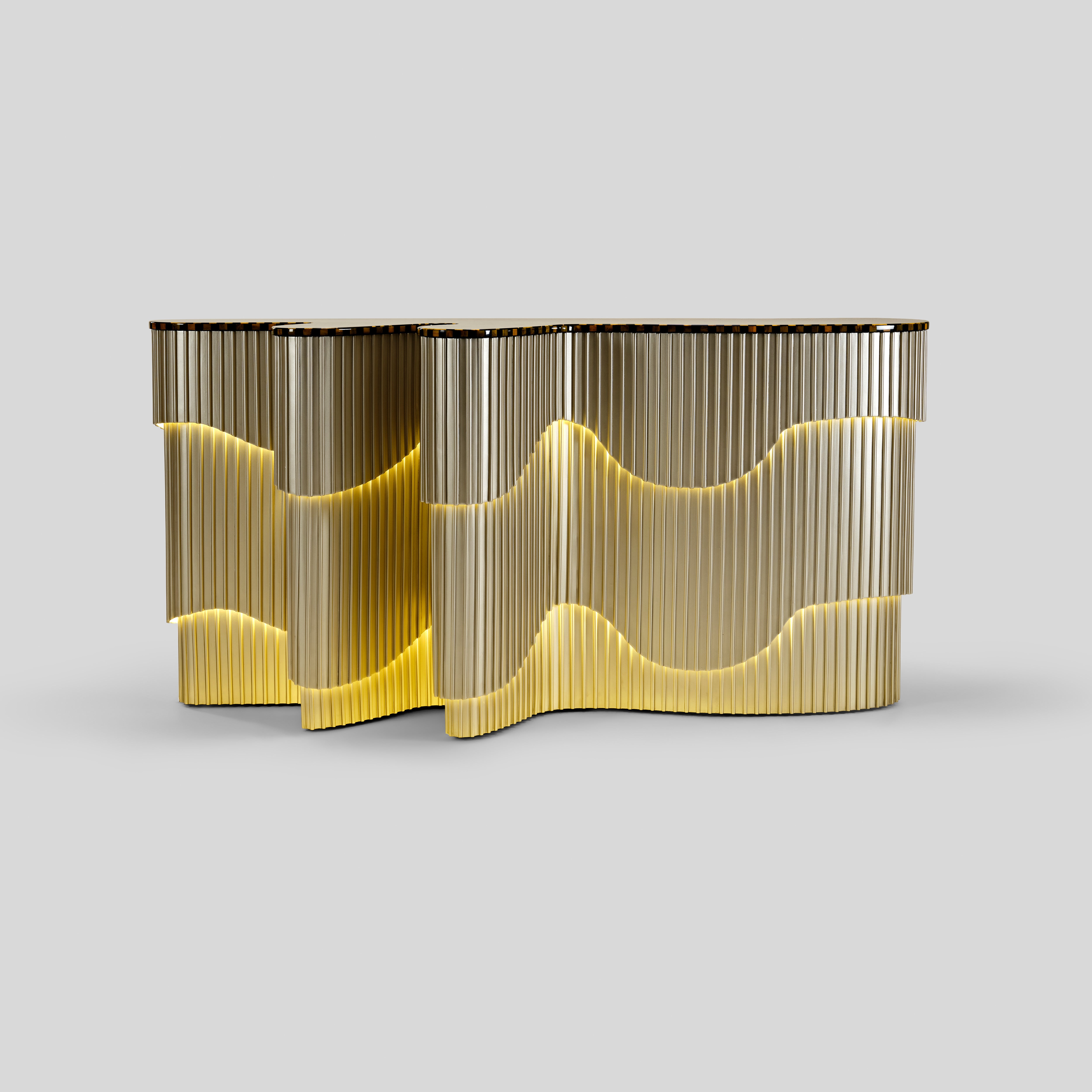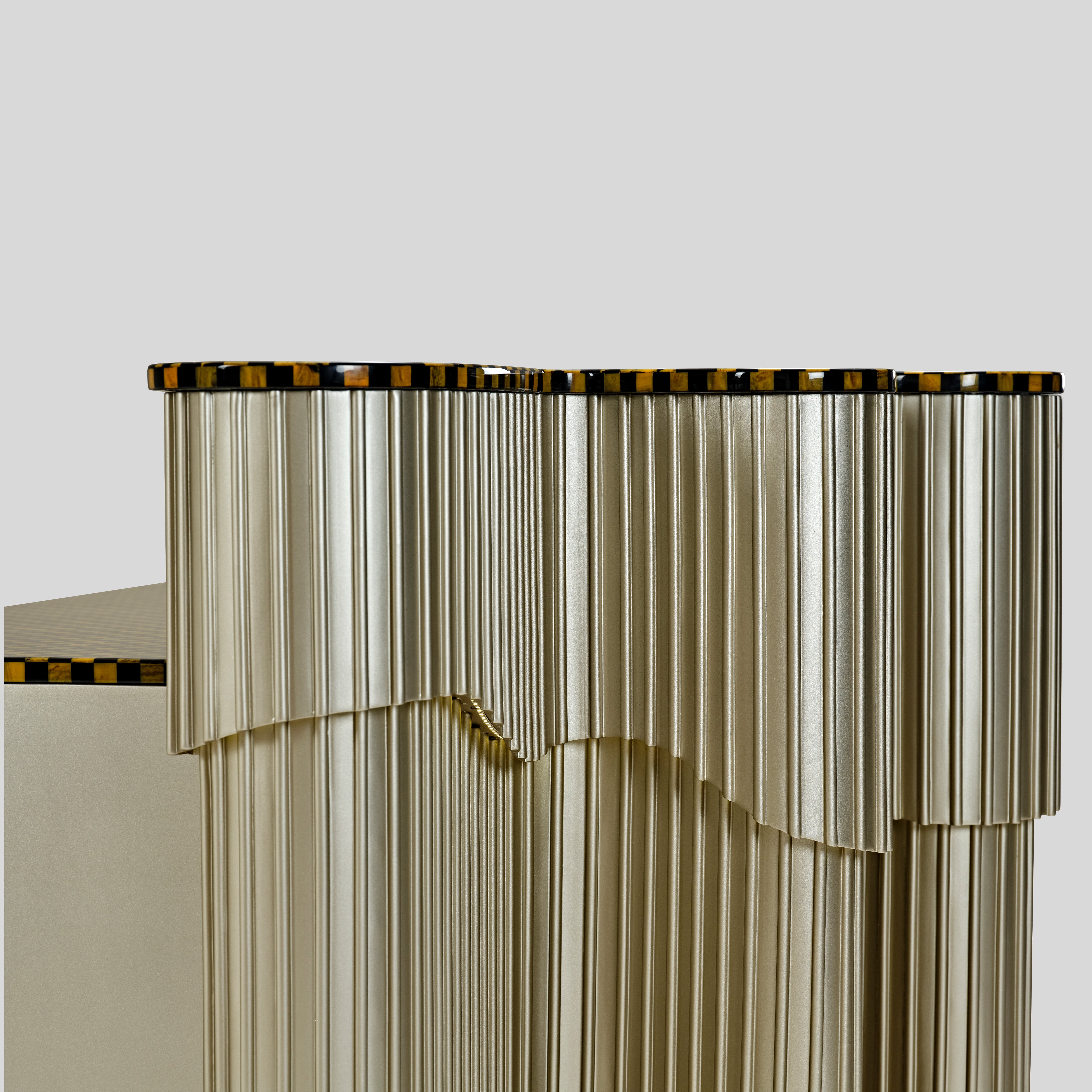 Sapphire moves like a piece of liquid architecture, its cascading fluted panels forming elegant, wave-like contours. The polished surface adds a couture sheen, giving the design a sculptural resonance. Dramatic yet refined, it thrives in contemporary, Art Deco, and luxe interiors, bringing a confident, unmistakable presence.