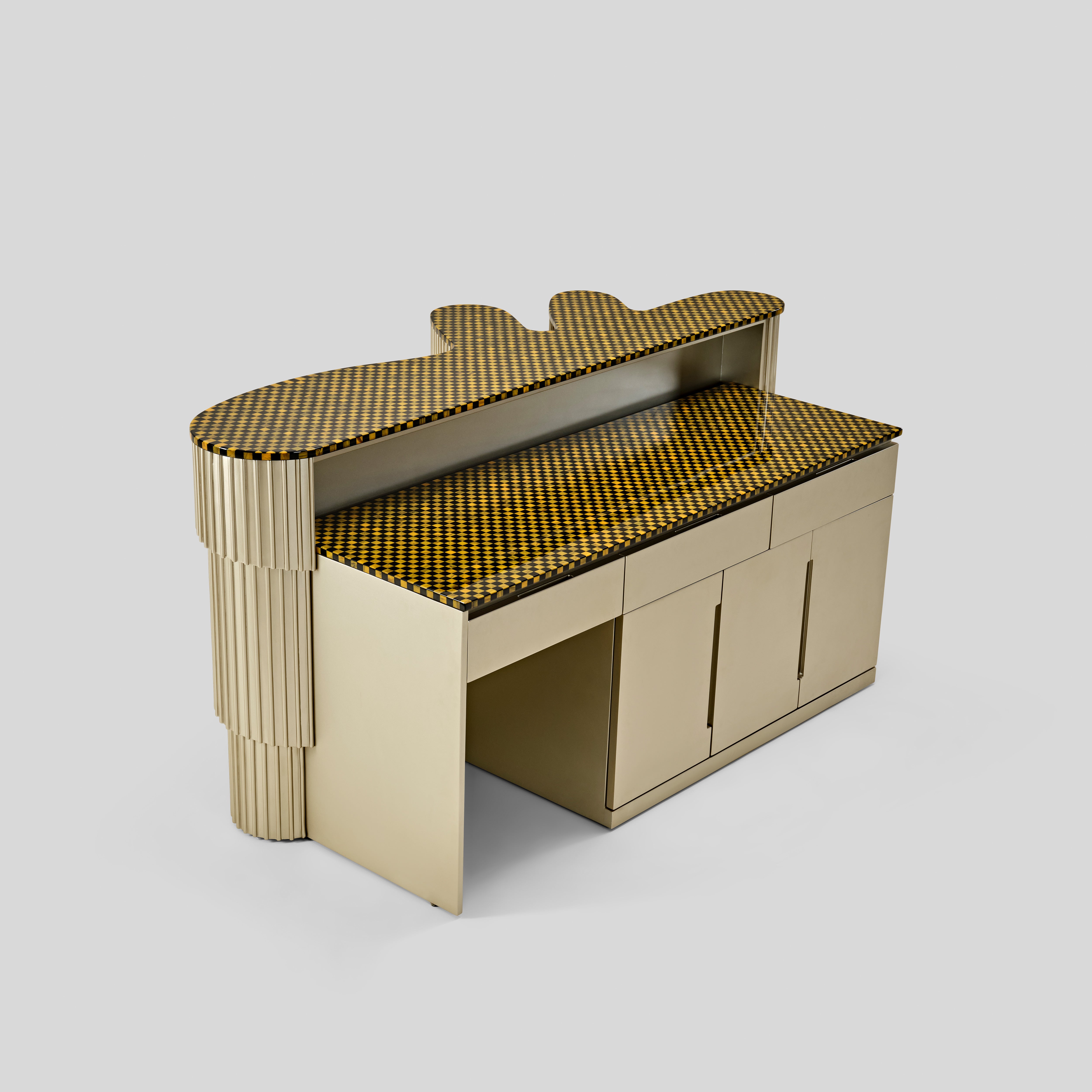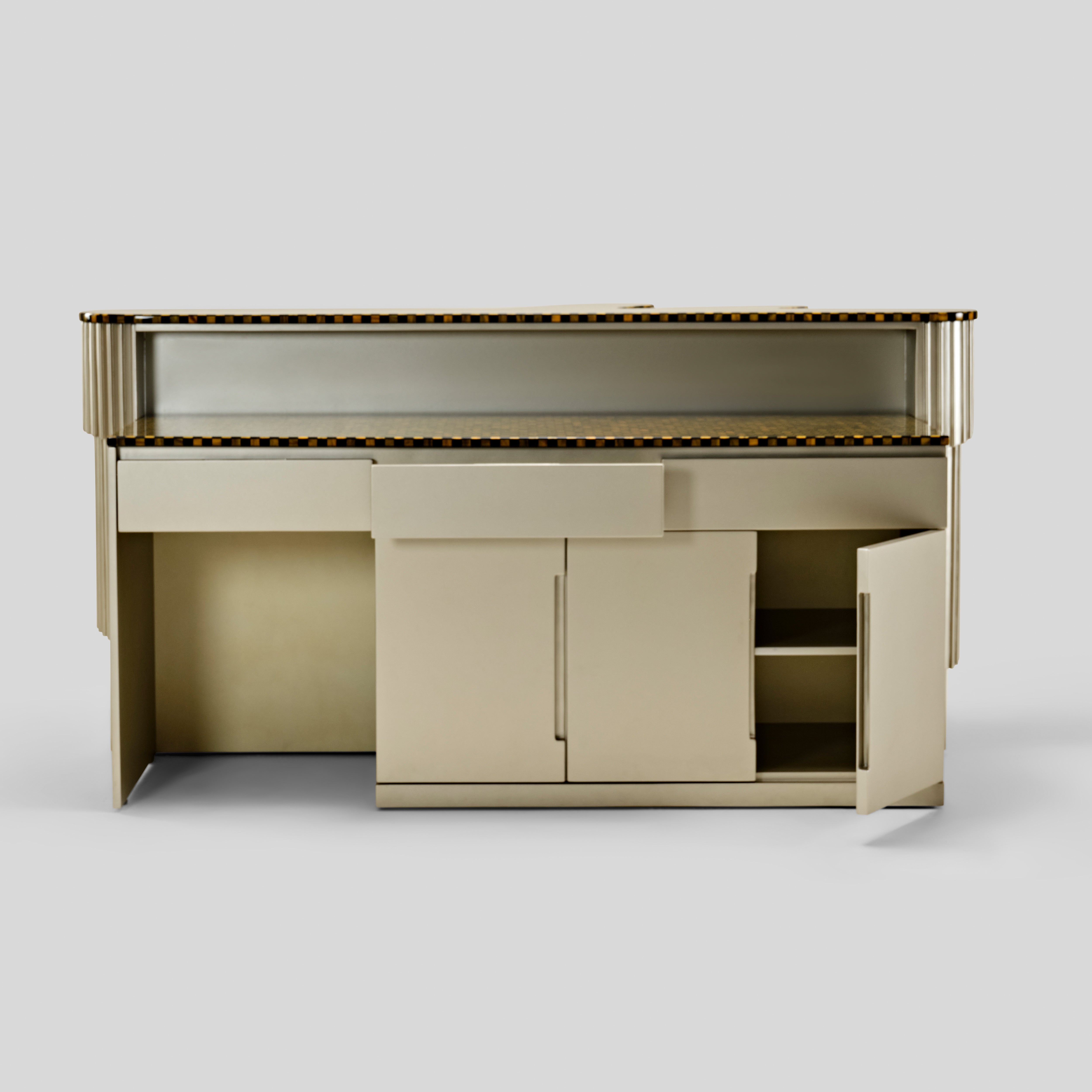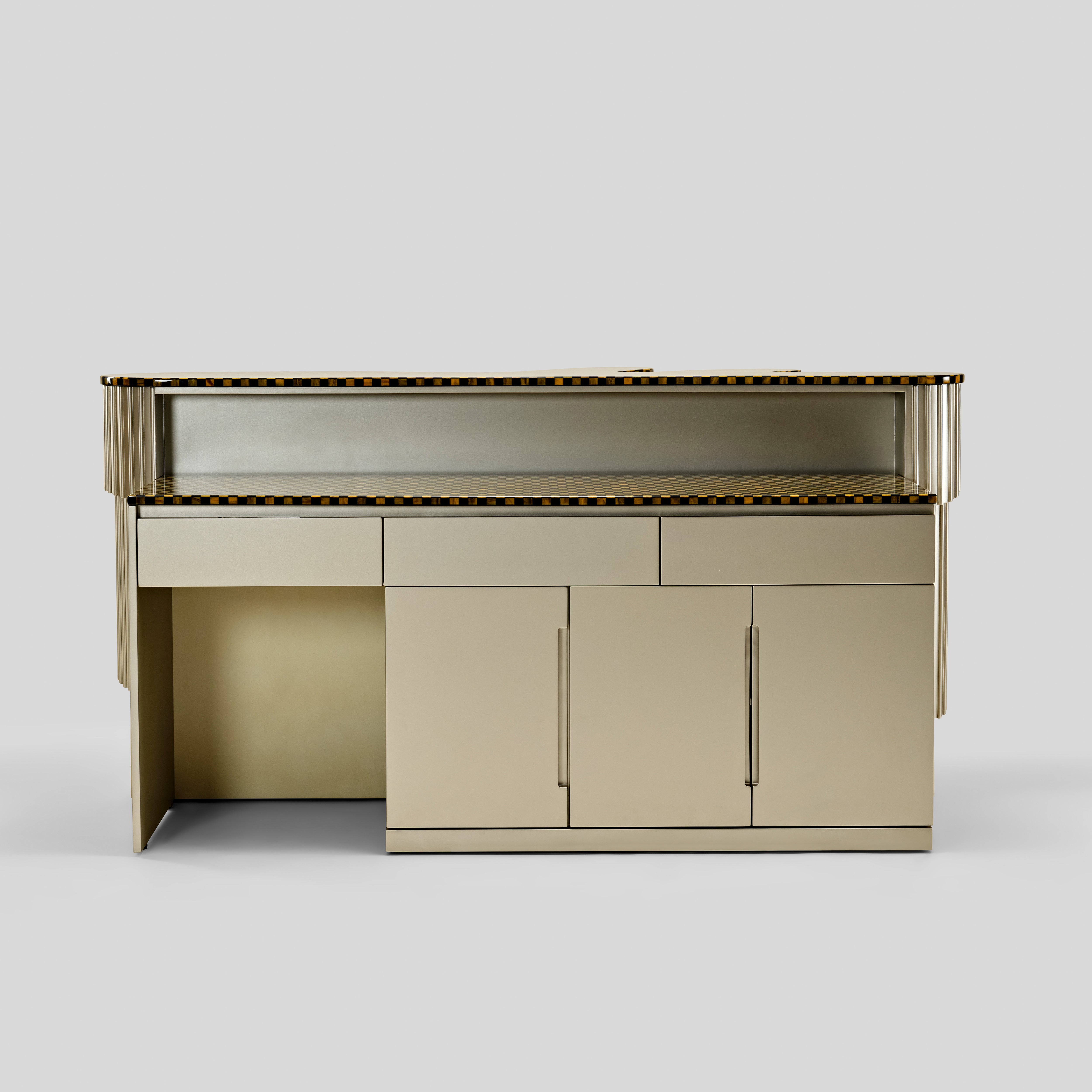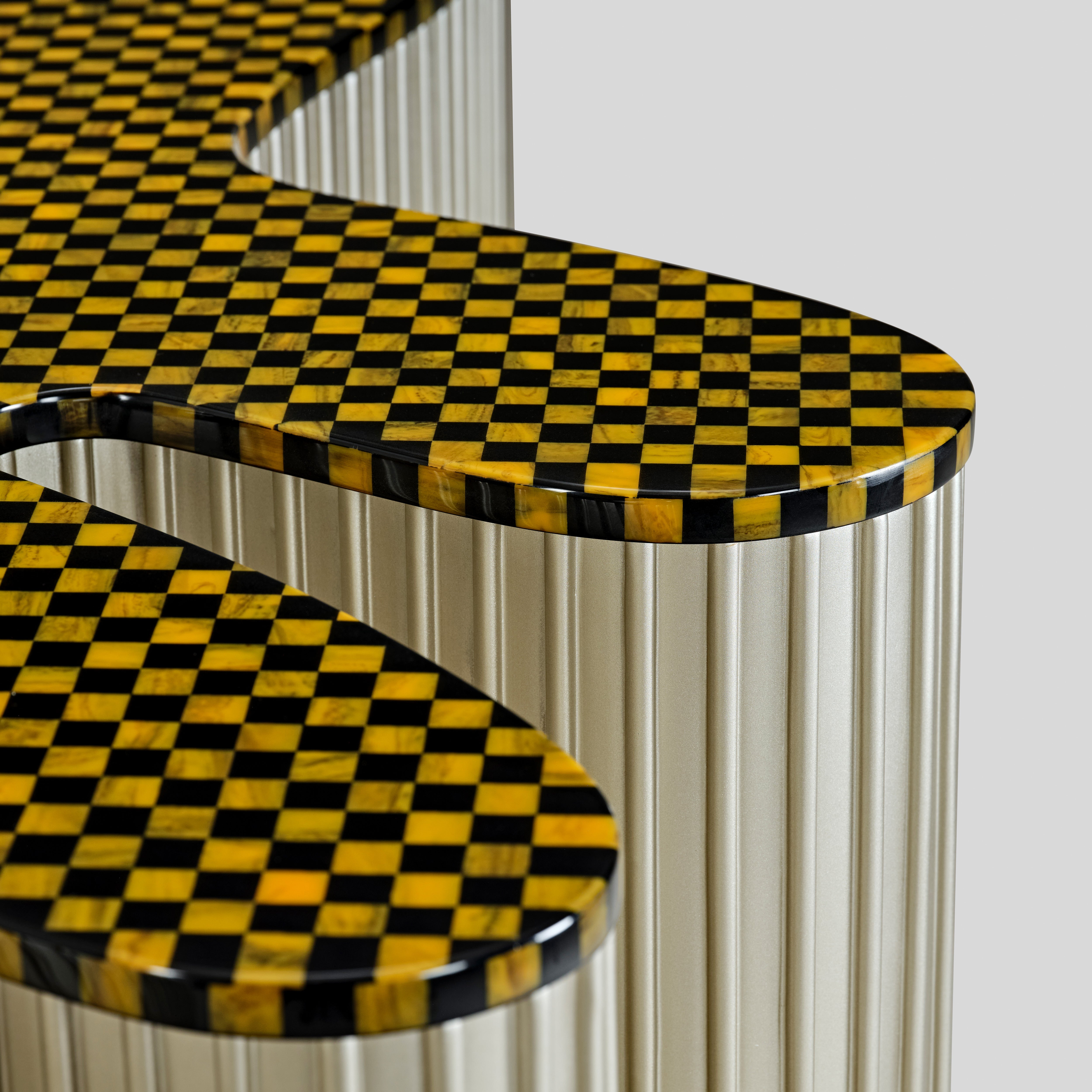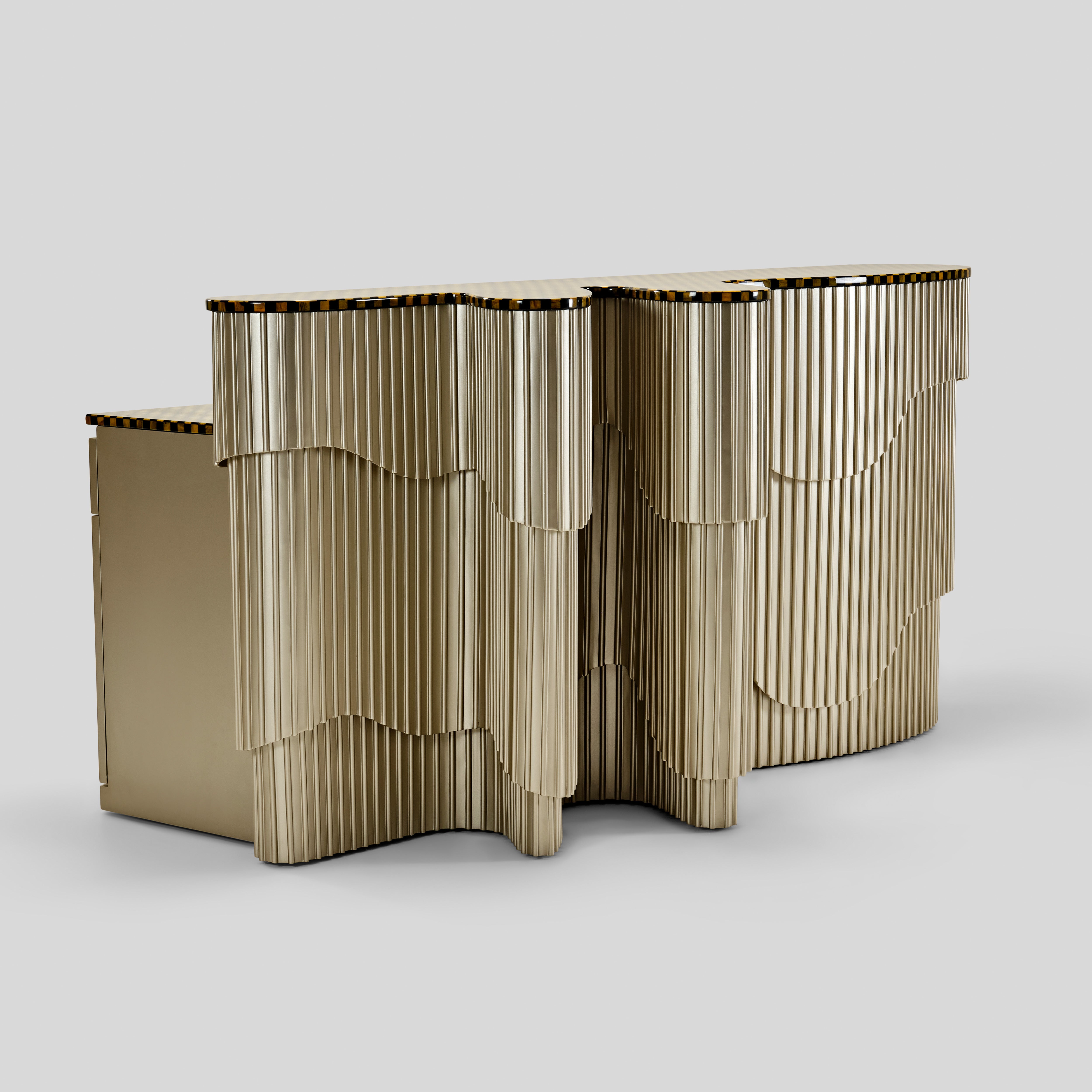 Sapphire moves like a piece of liquid architecture, its cascading fluted panels forming elegant, wave-like contours. The polished surface adds a couture sheen, giving the design a sculptural resonance. Dramatic yet refined, it thrives in contemporary, Art Deco, and luxe interiors, bringing a confident, unmistakable presence.