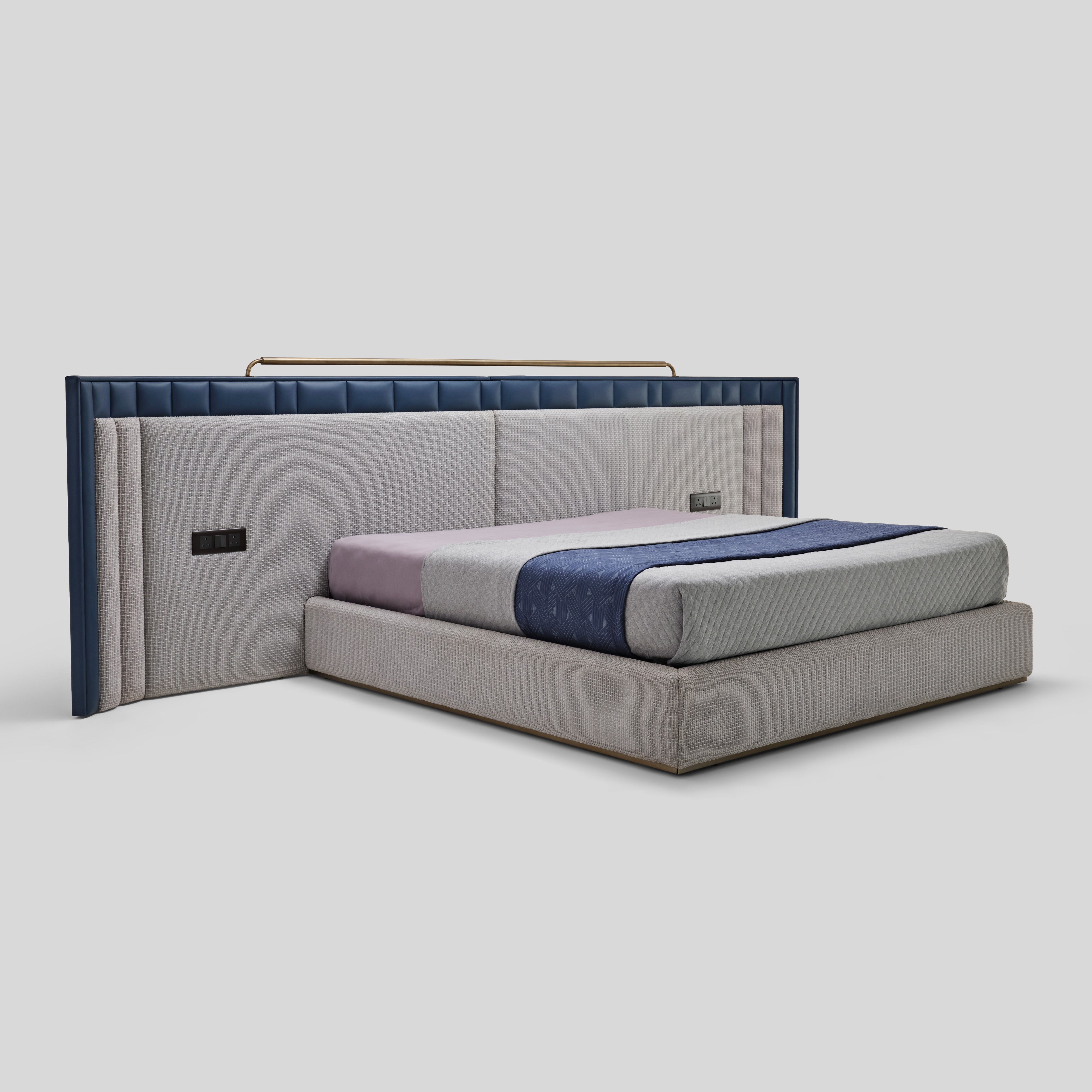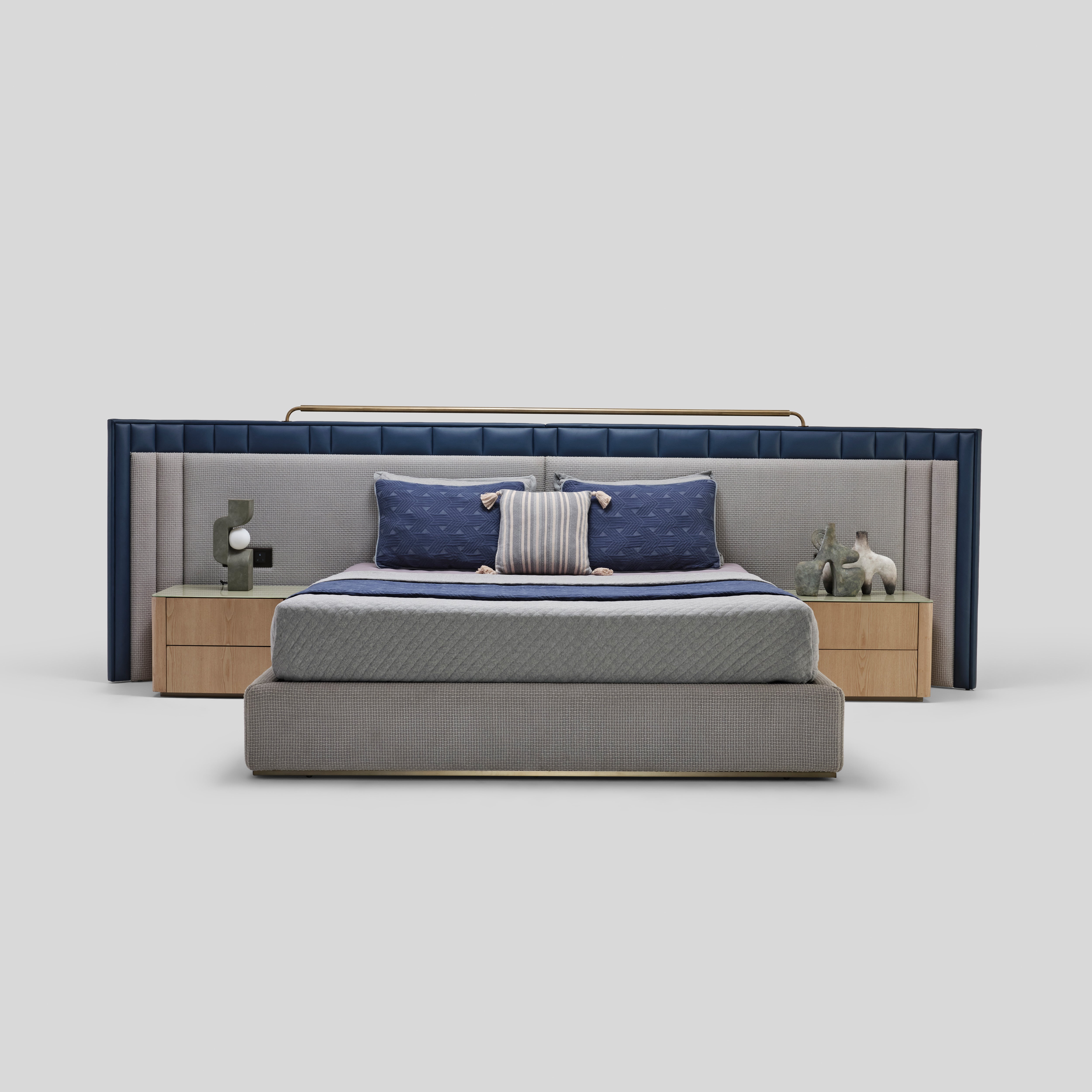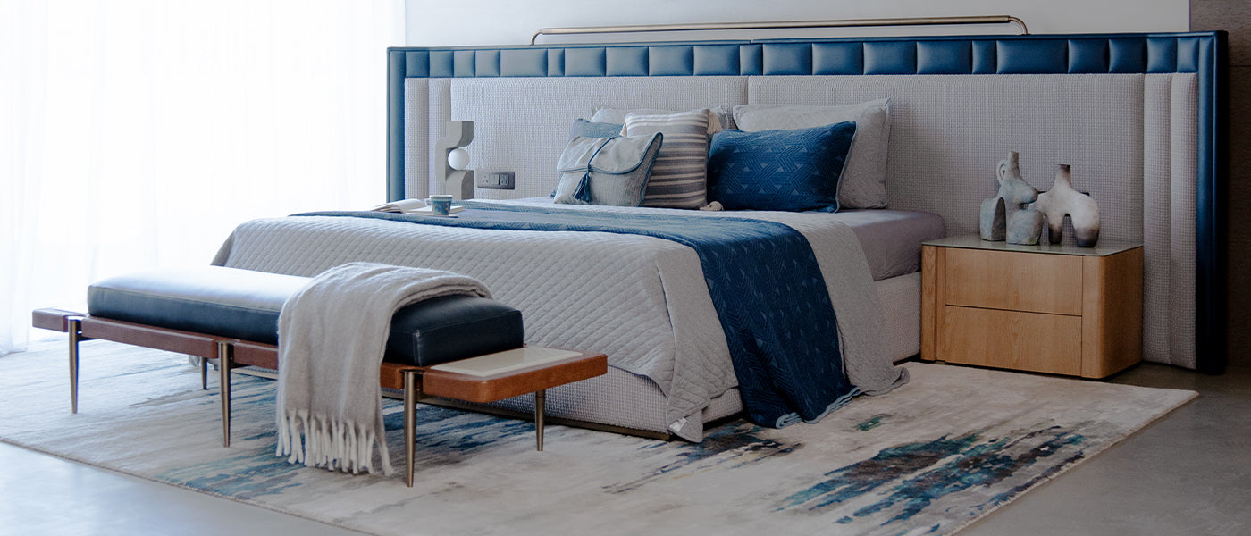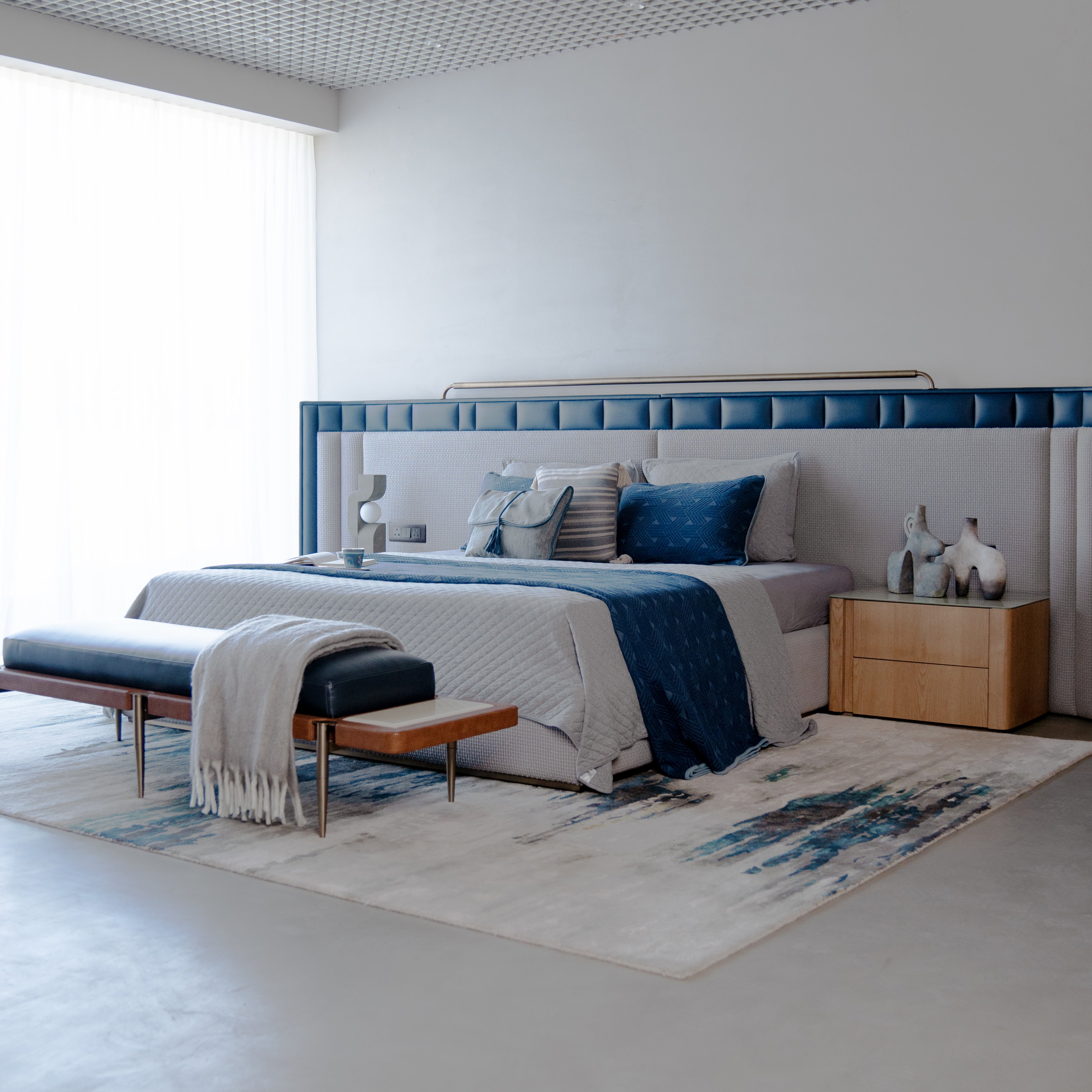Azure bed offers serene luxury through its expansive headboard and refined layering, creating a calm, cohesive presence. Every detail feels intentional and quietly elegant, shaping a master suite defined by balance, gentle confidence, and an understated sophistication that endures.