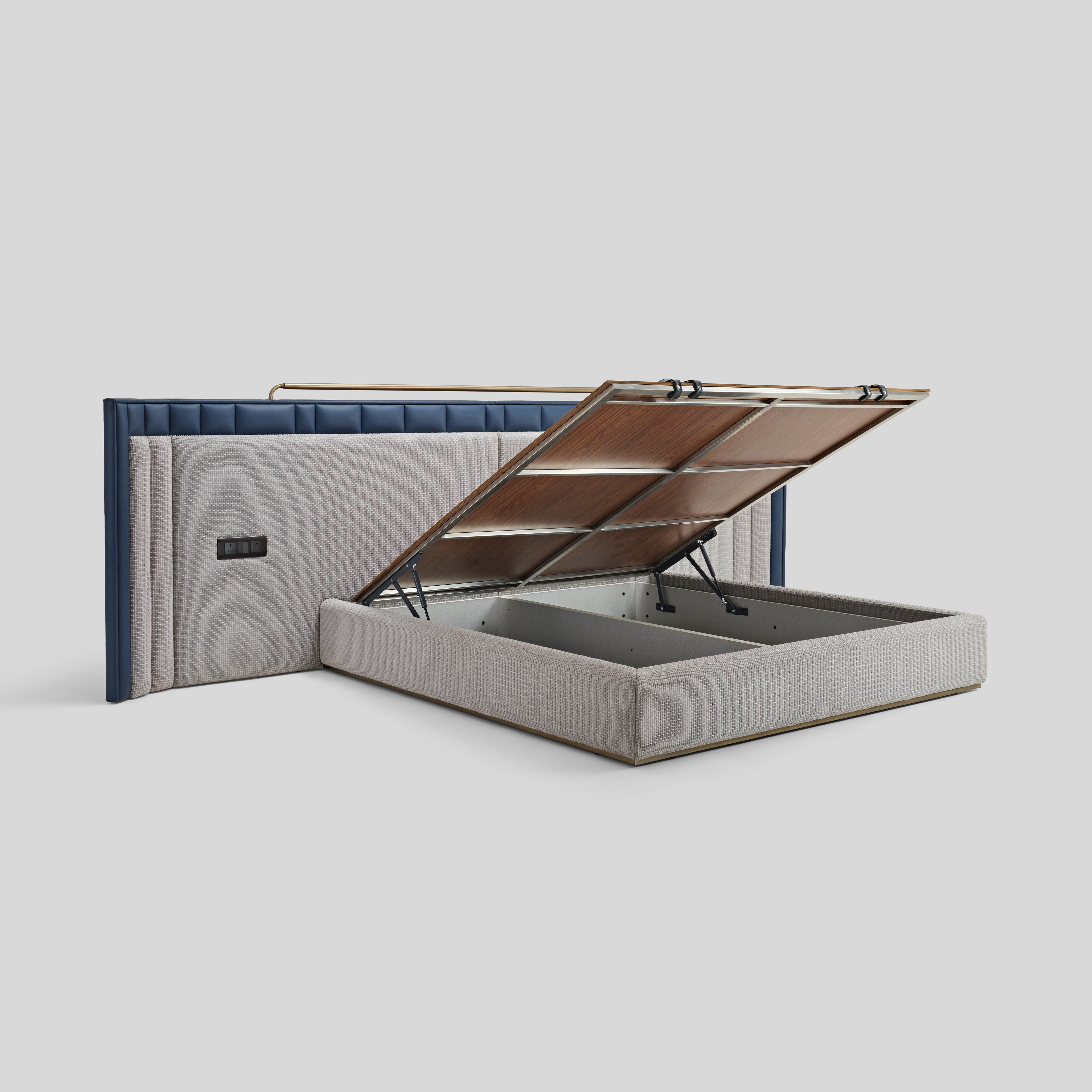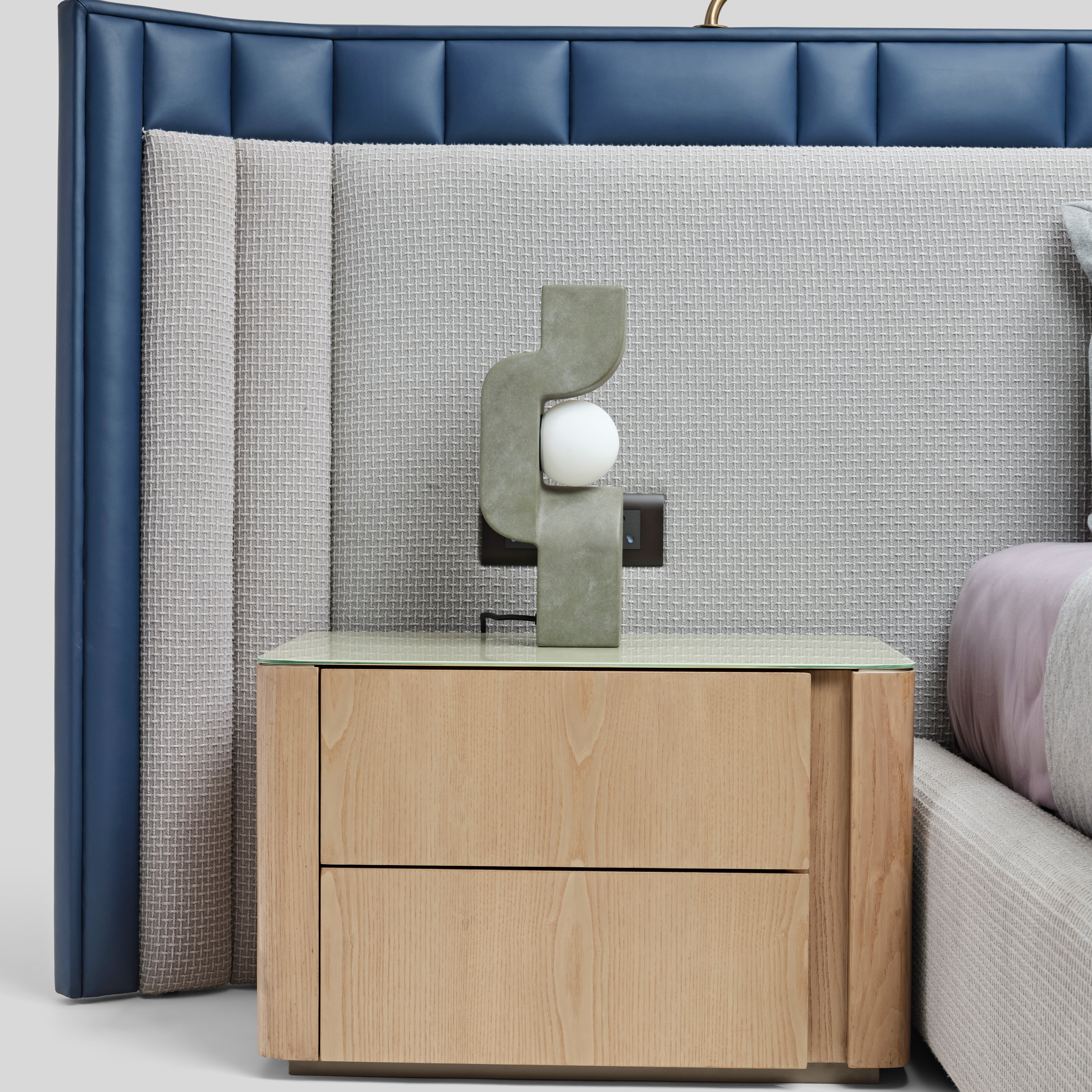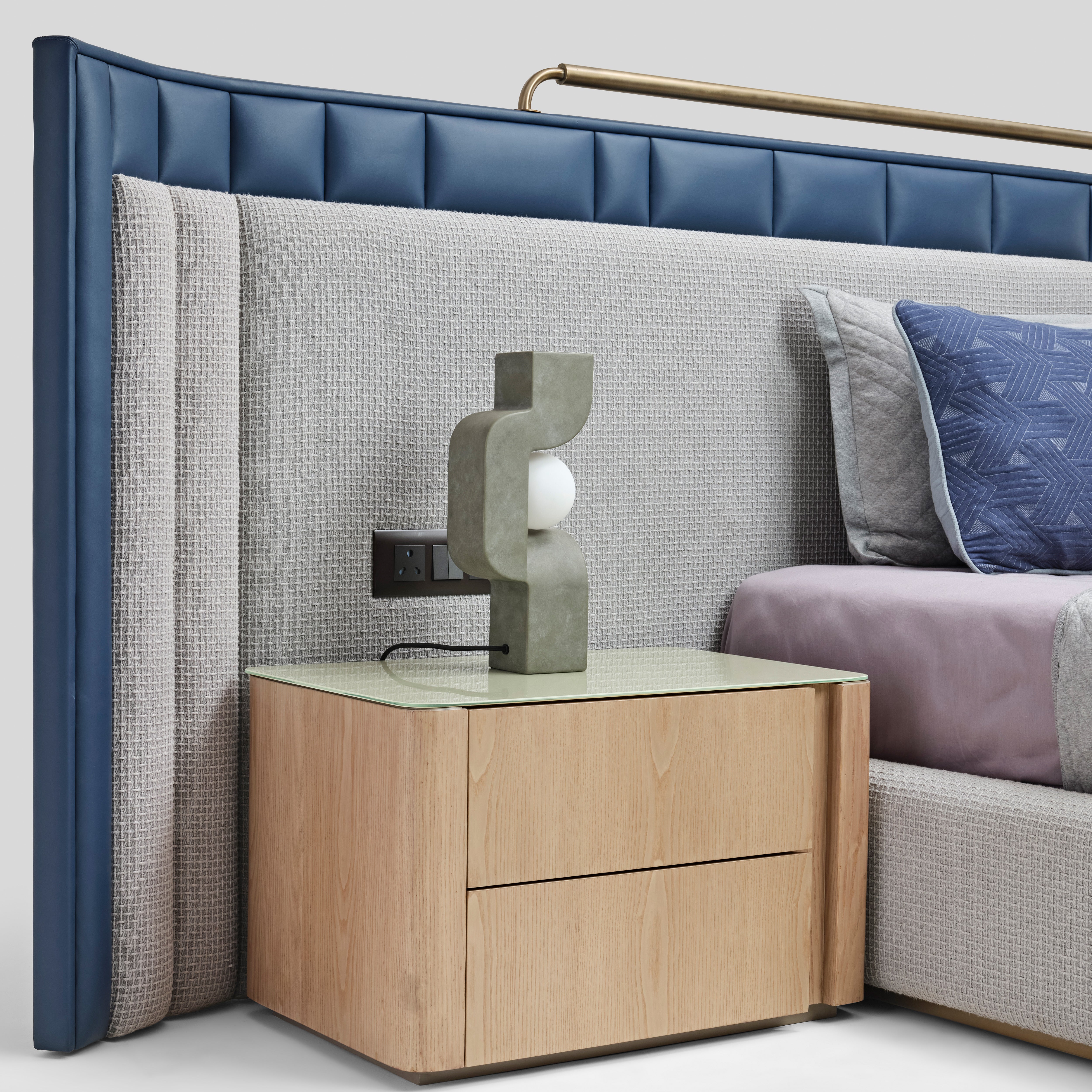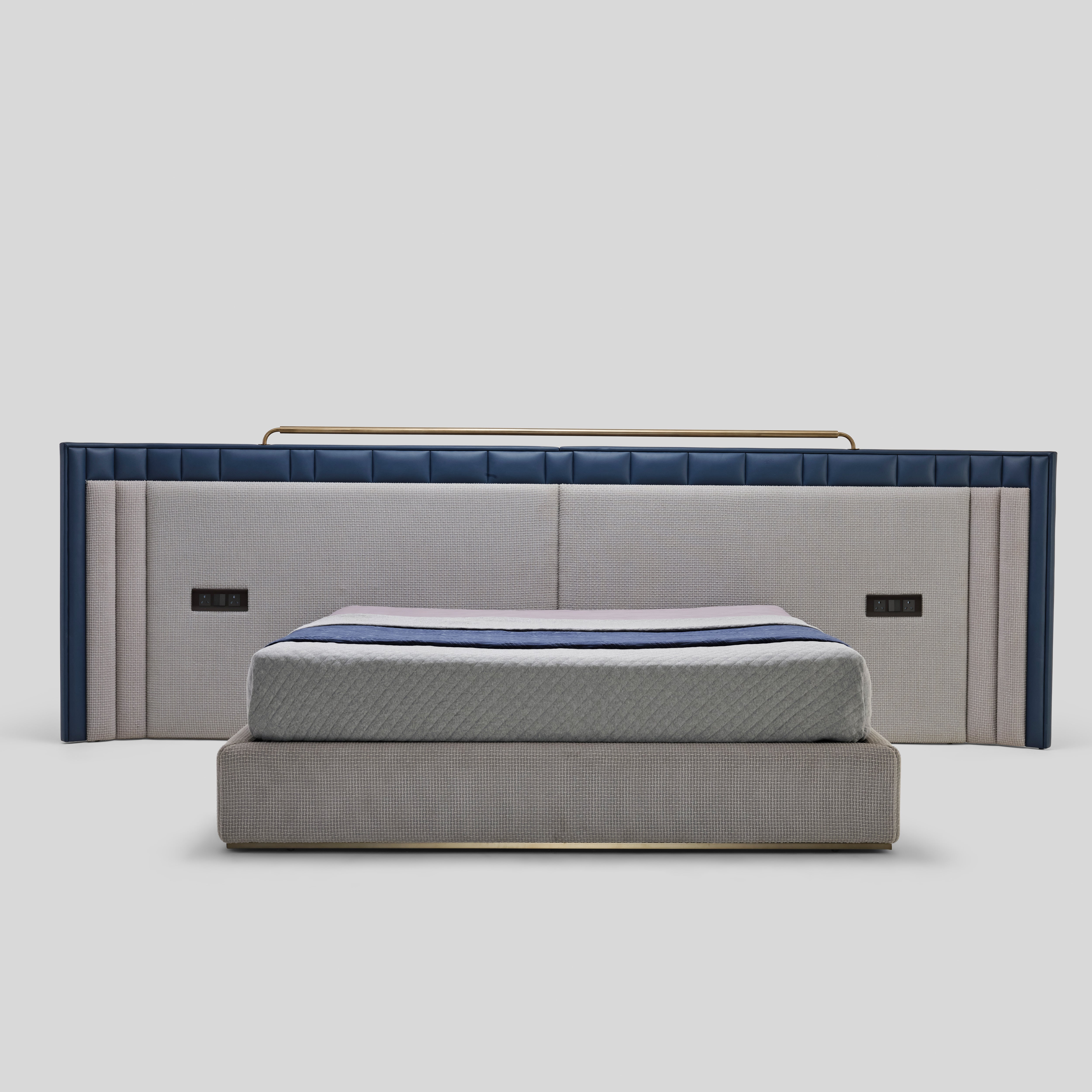 Azure bed offers serene luxury through its expansive headboard and refined layering, creating a calm, cohesive presence. Every detail feels intentional and quietly elegant, shaping a master suite defined by balance, gentle confidence, and an understated sophistication that endures.