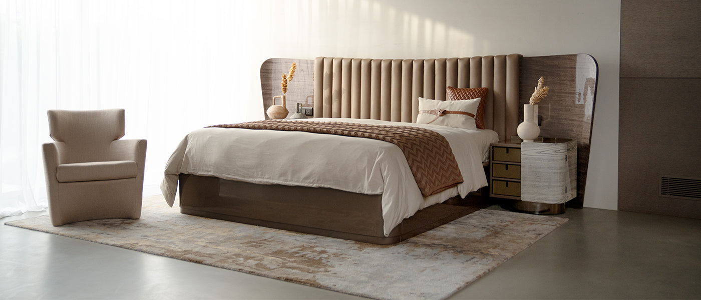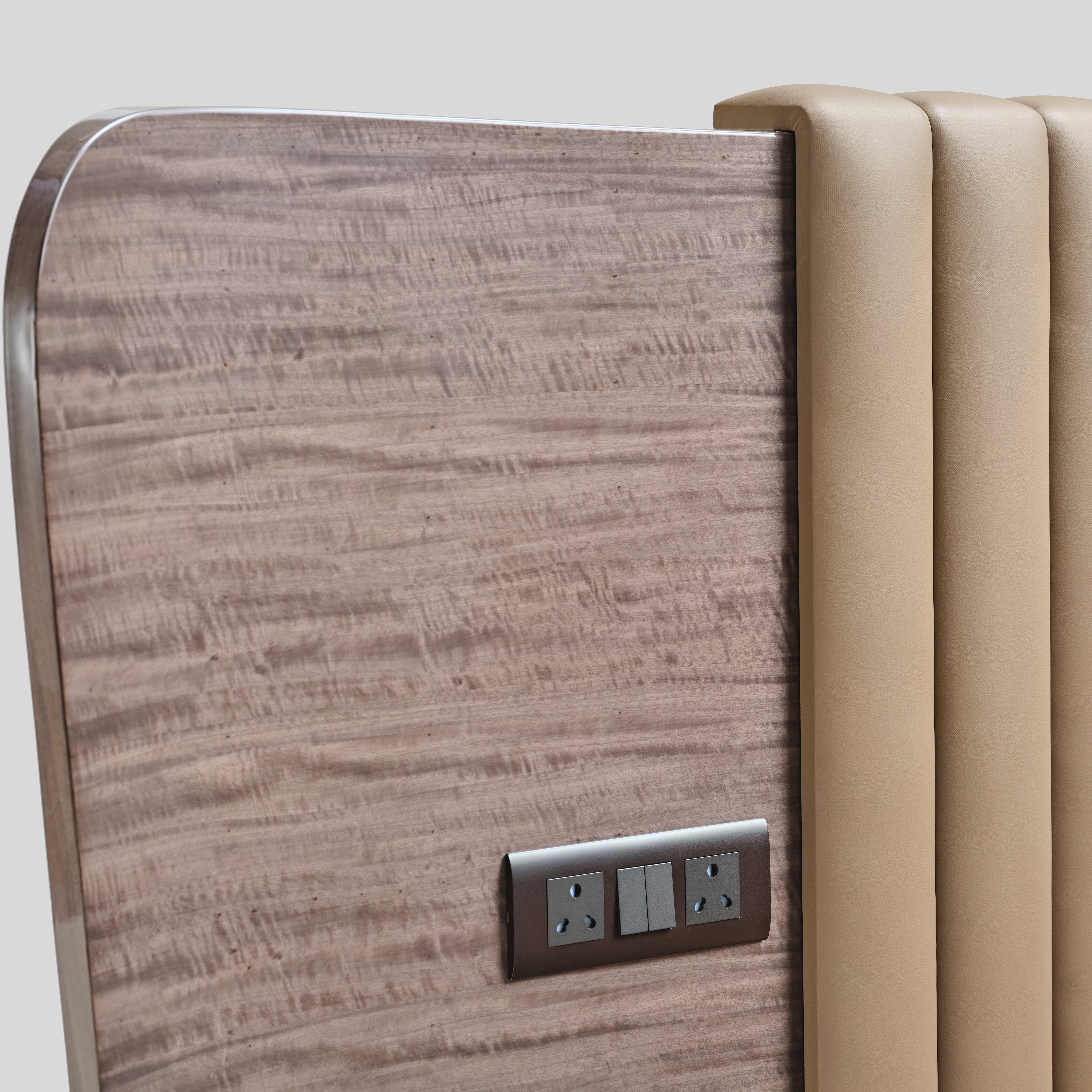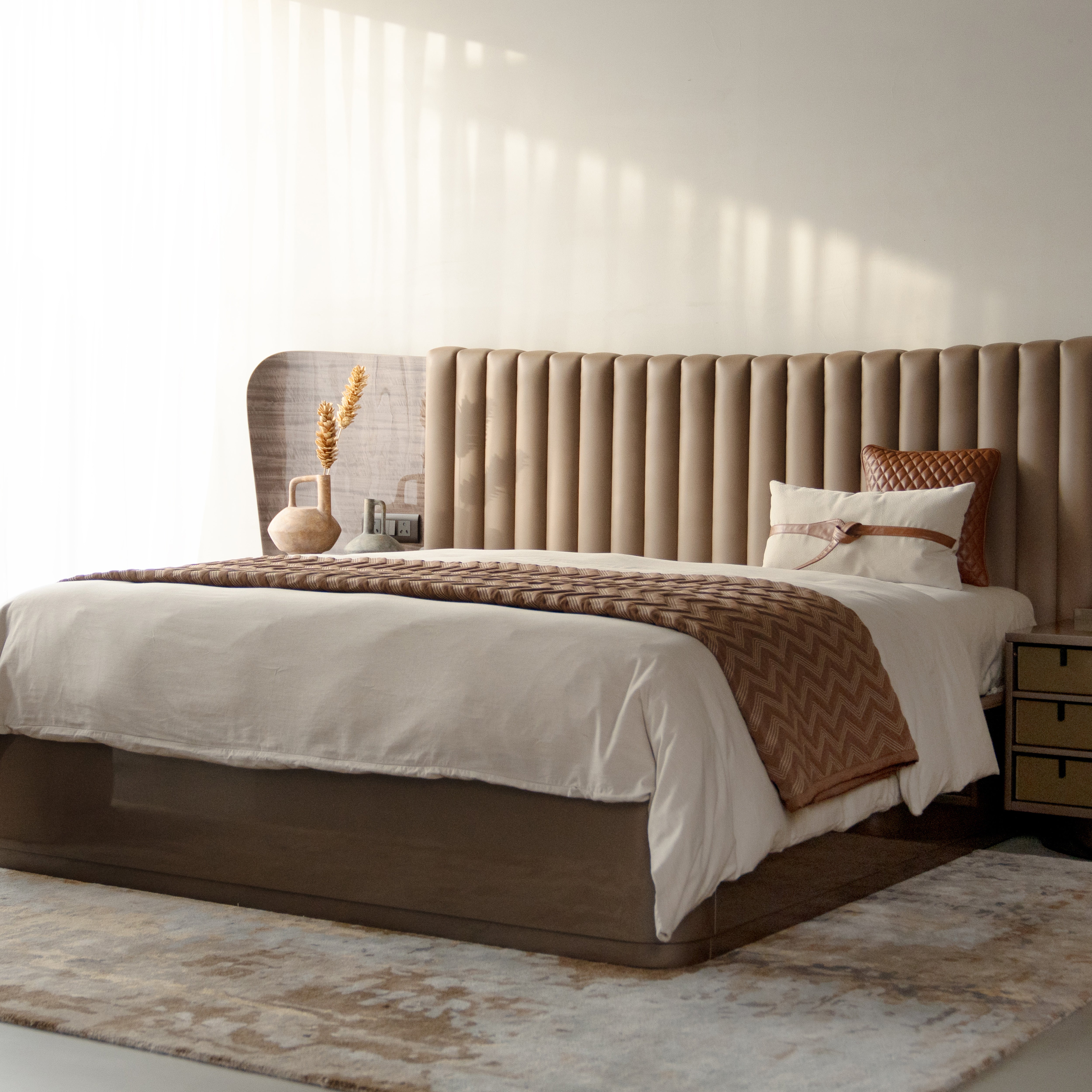 Blues bed introduces a composed grandeur, its vertical detailing giving the room a calm, architectural rhythm. Gently flared panels create an enveloping sense of comfort. Ideal for a master bedroom, it finishes with a quiet charm and a lingering, graceful warmth.