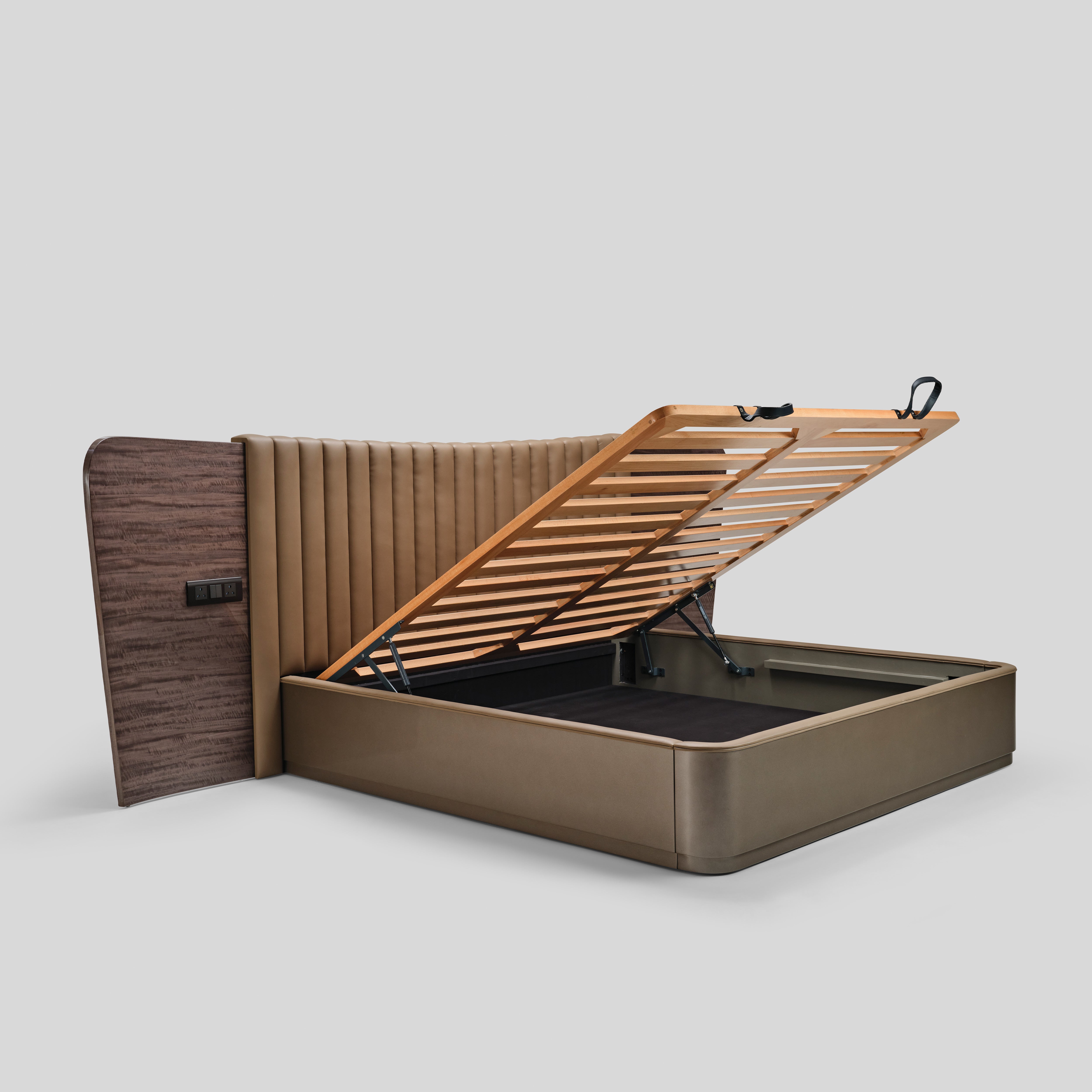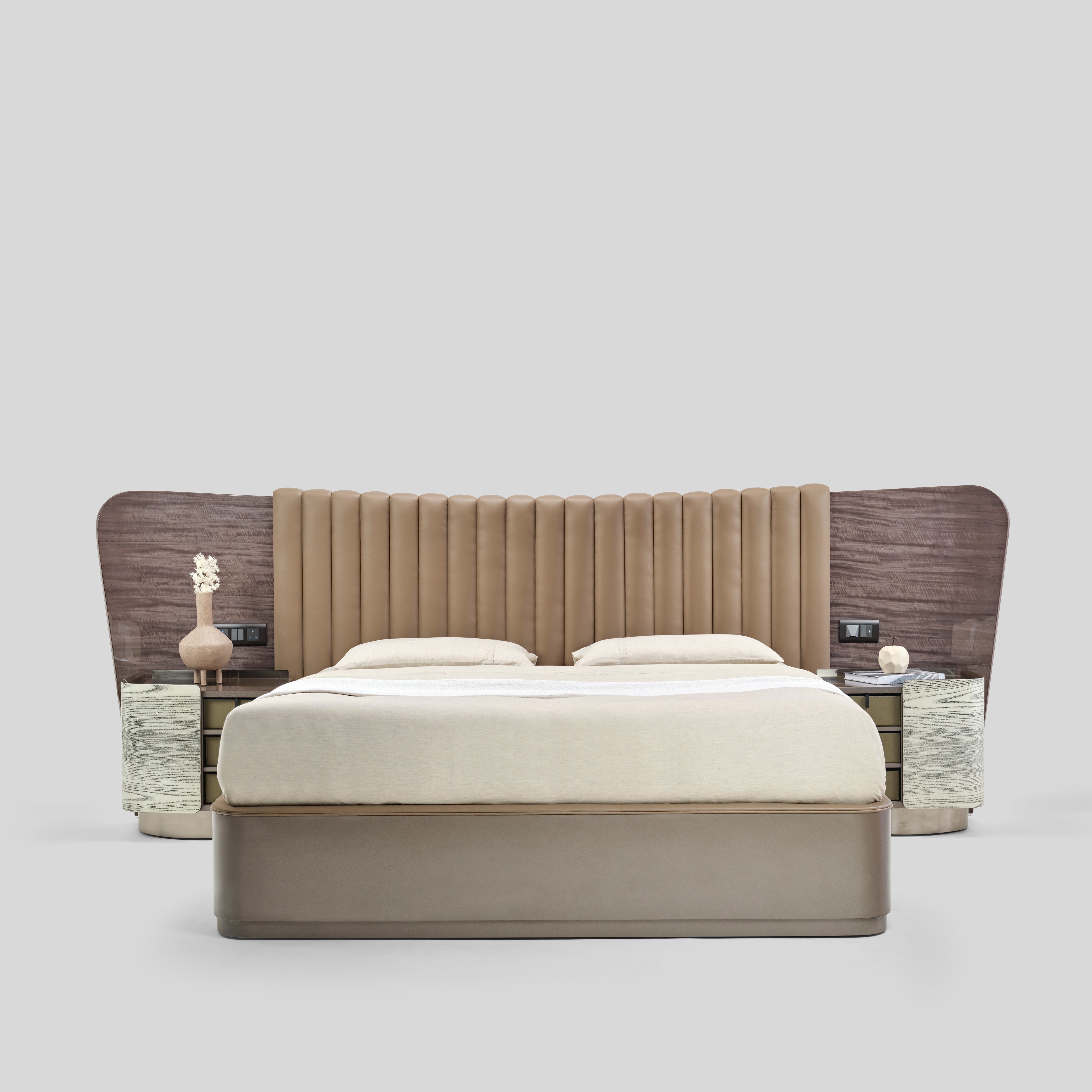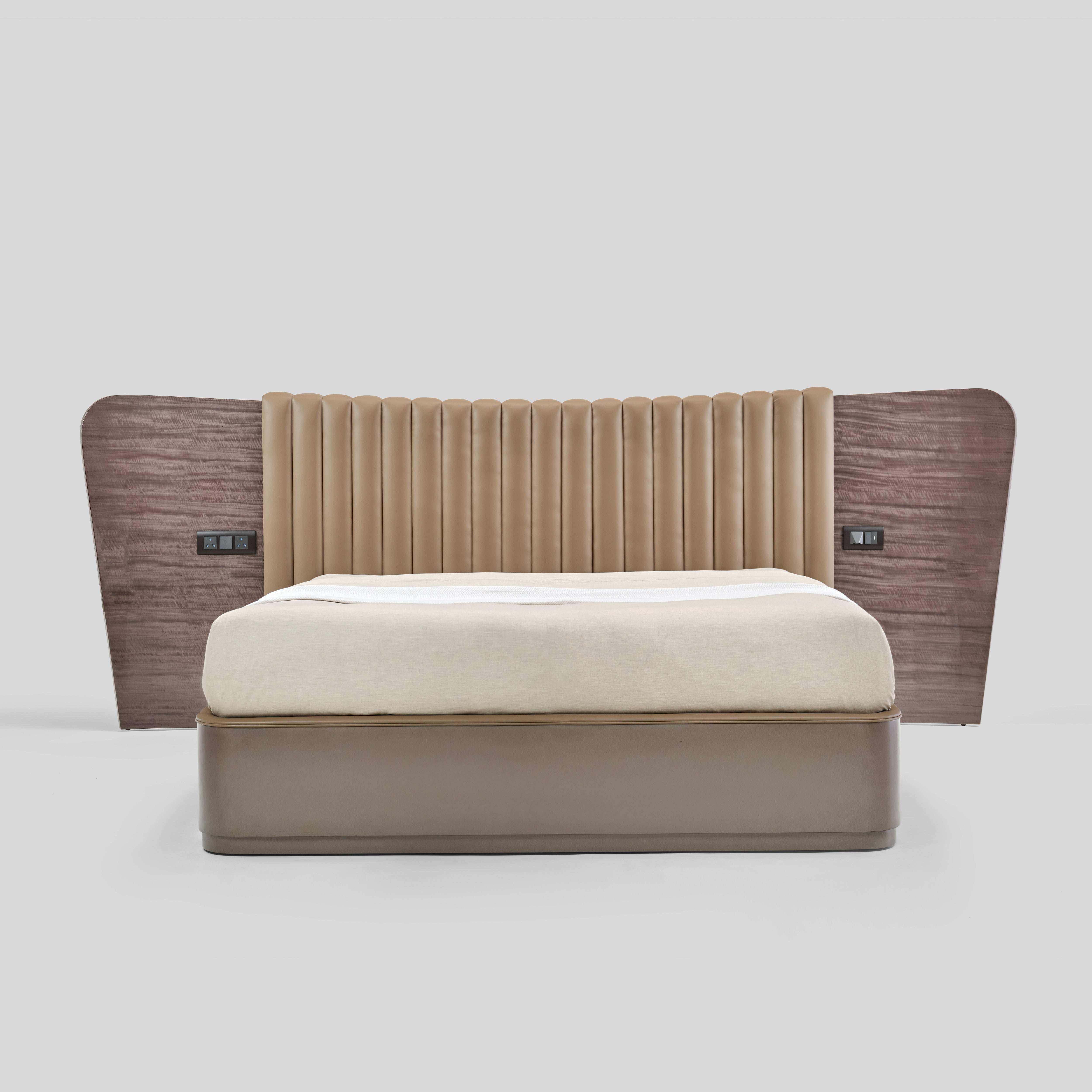 Blues bed introduces a composed grandeur, its vertical detailing giving the room a calm, architectural rhythm. Gently flared panels create an enveloping sense of comfort. Ideal for a master bedroom, it finishes with a quiet charm and a lingering, graceful warmth.
