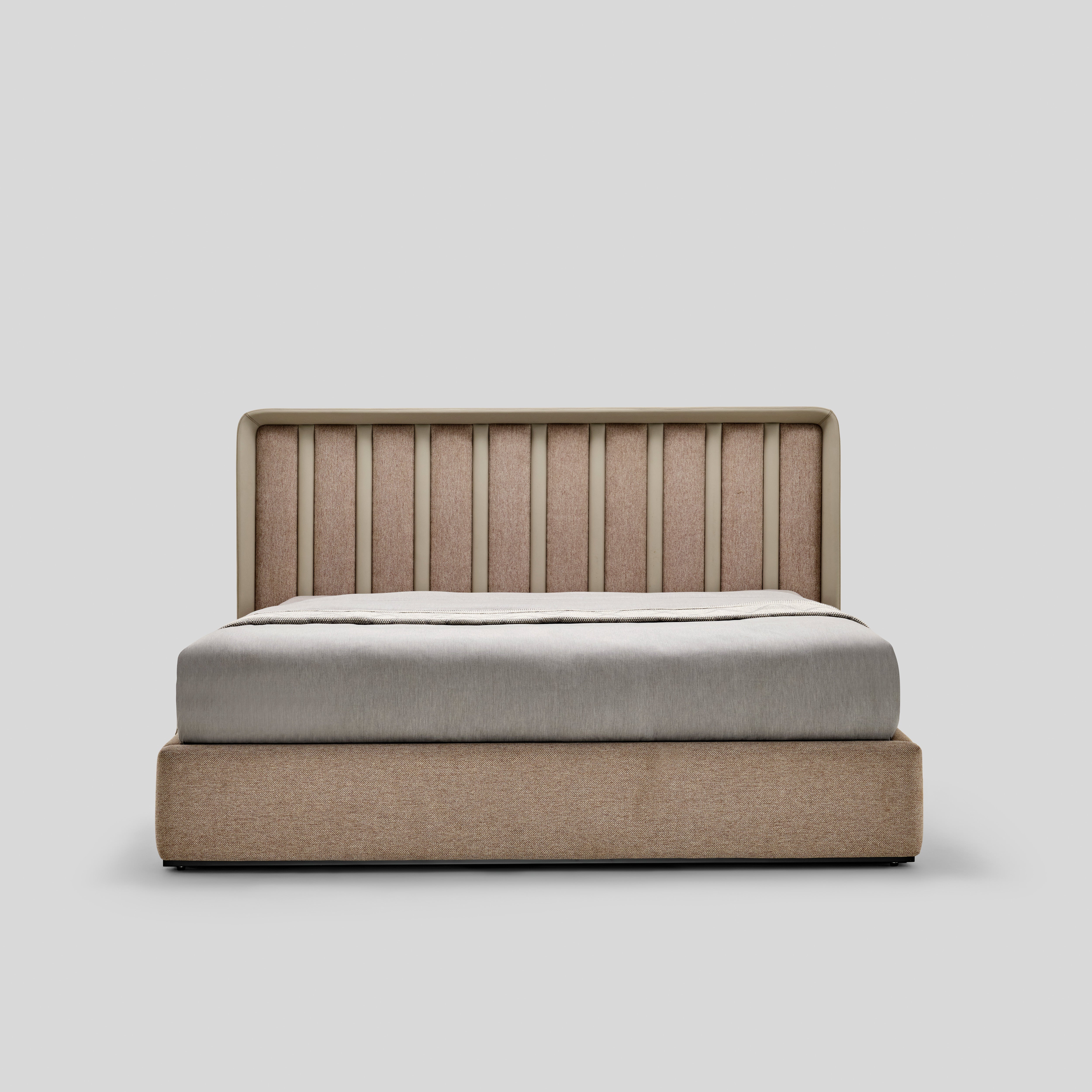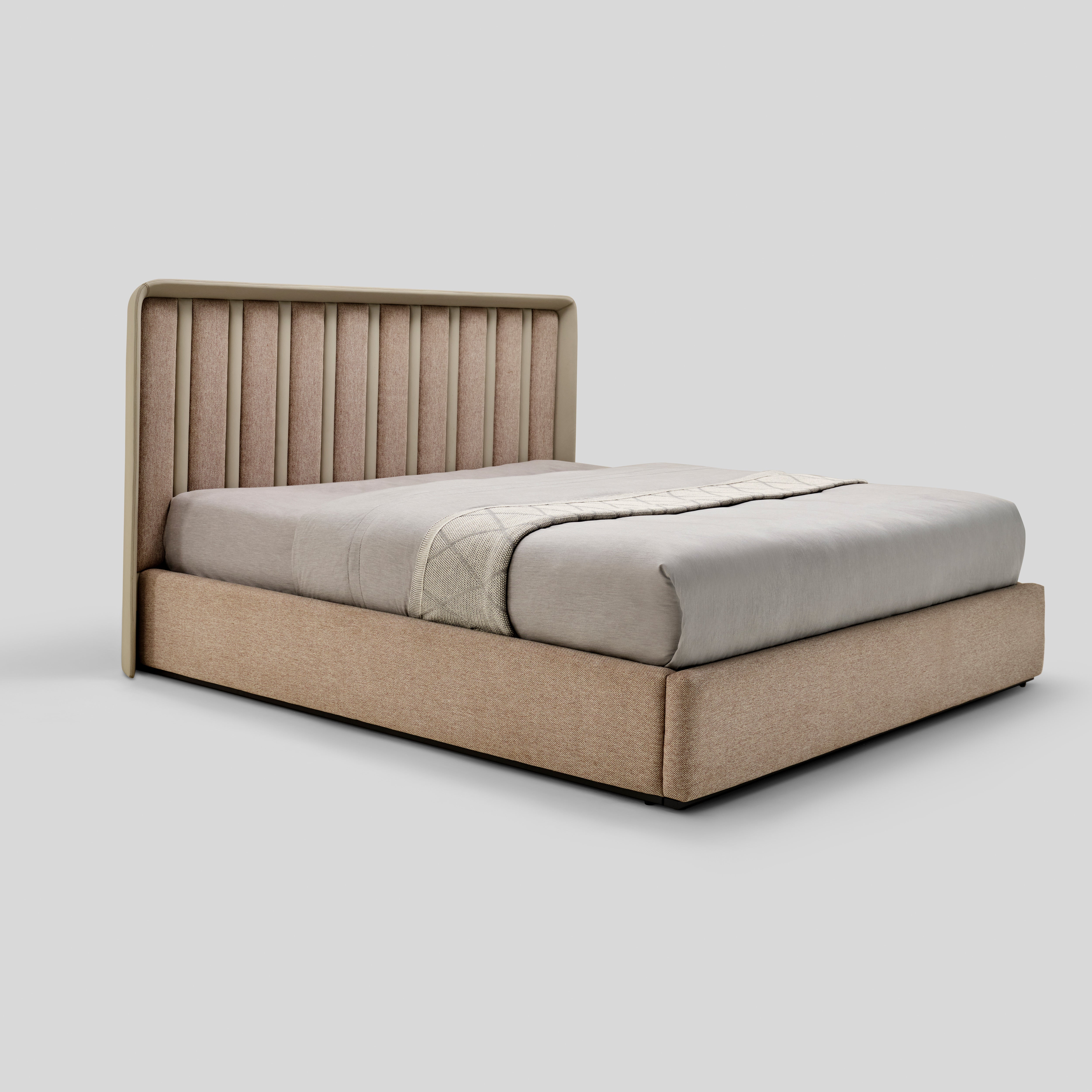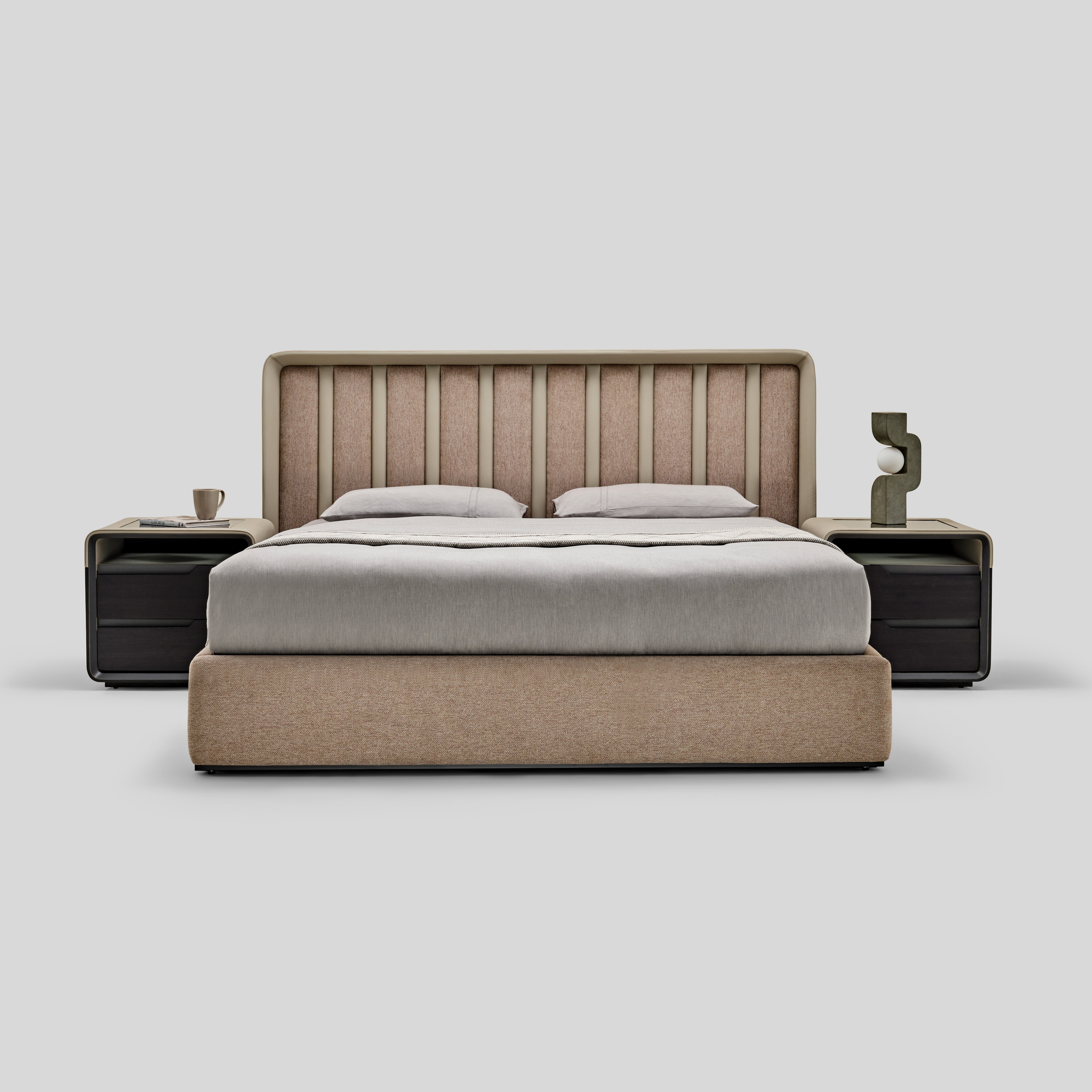 Diago bed leans into a tailored elegance, its vertical channels creating a refined architectural rhythm. The rounded frame softens the composition, lending a sense of polished ease. Together they form a centerpiece that brings quiet sophistication and a beautifully edited presence to the room.