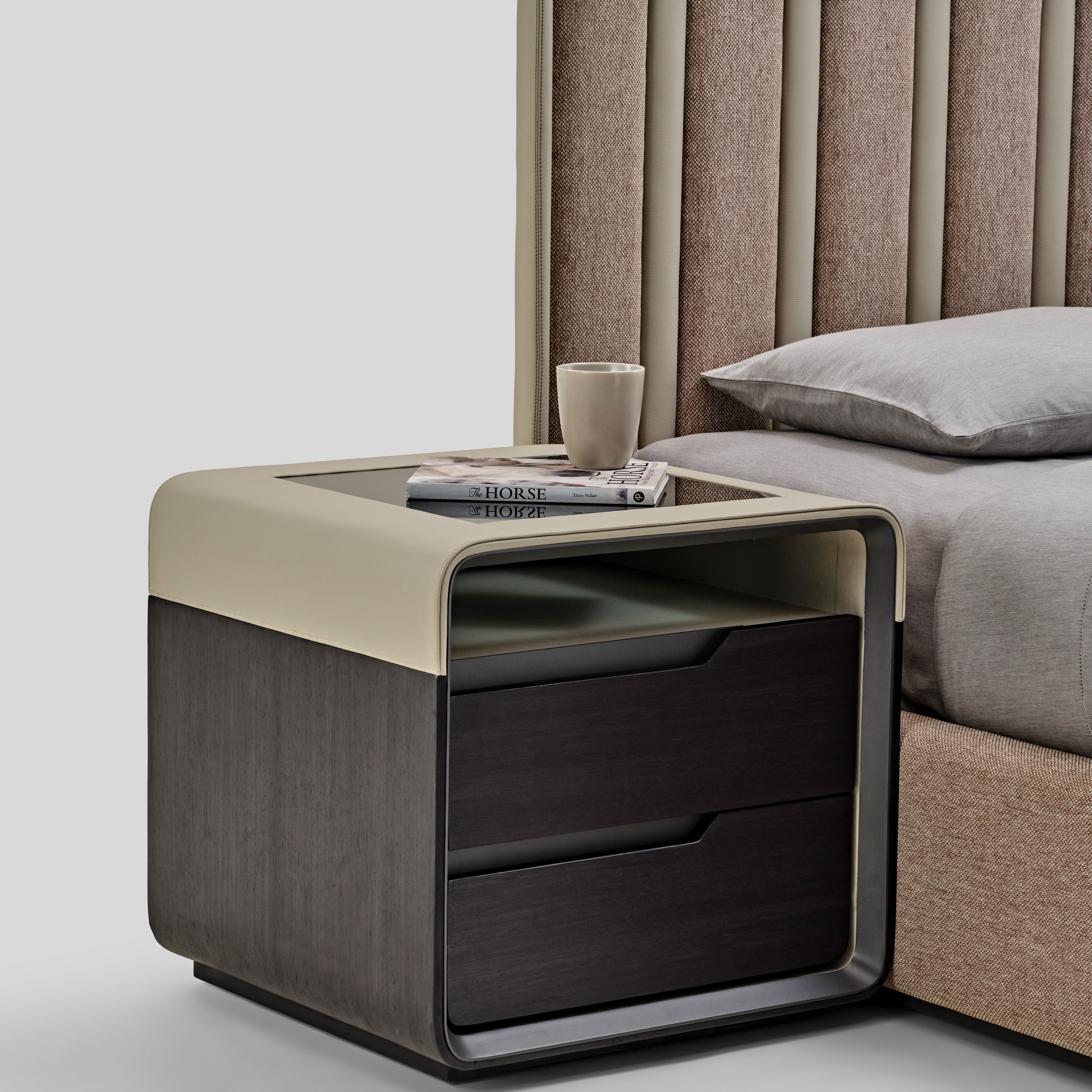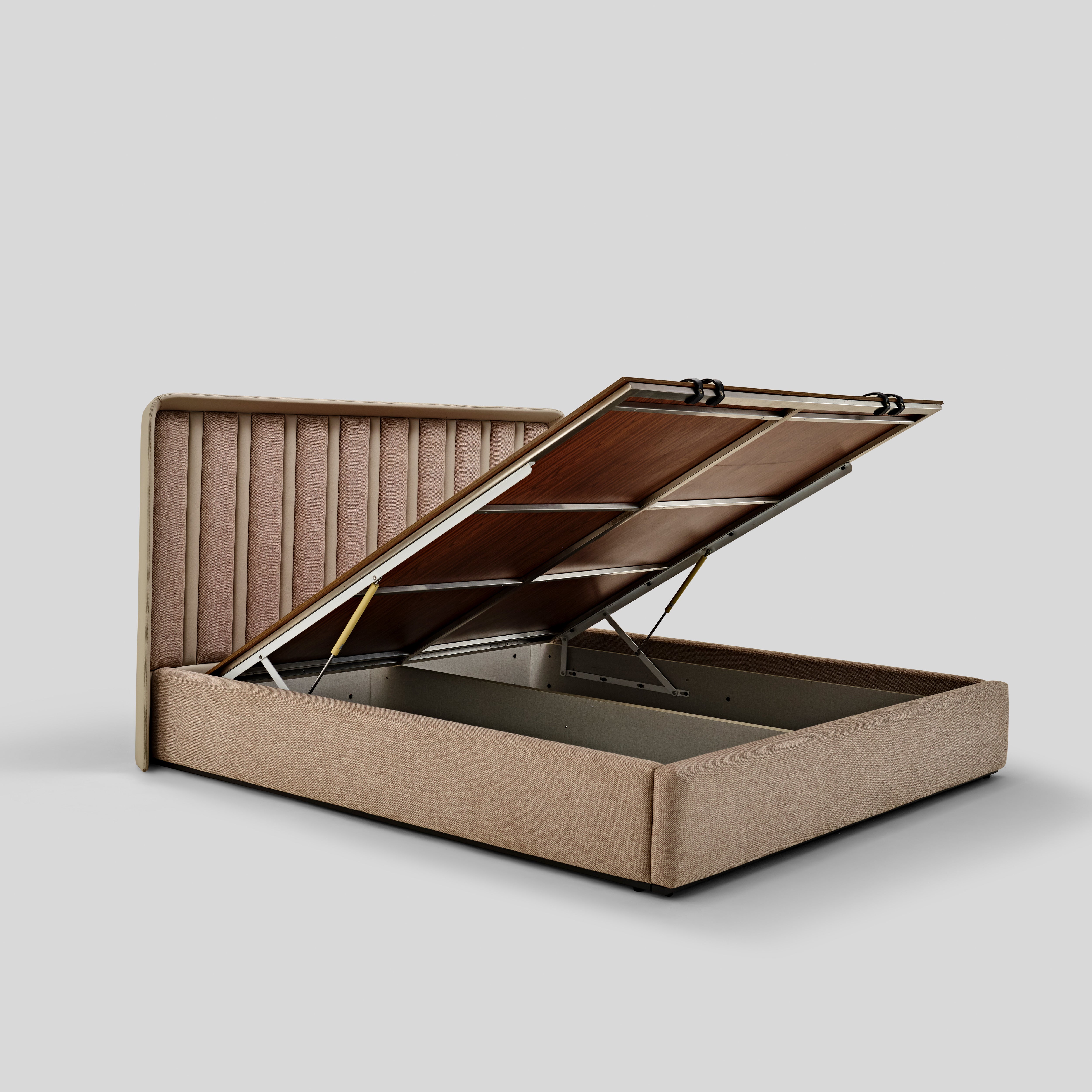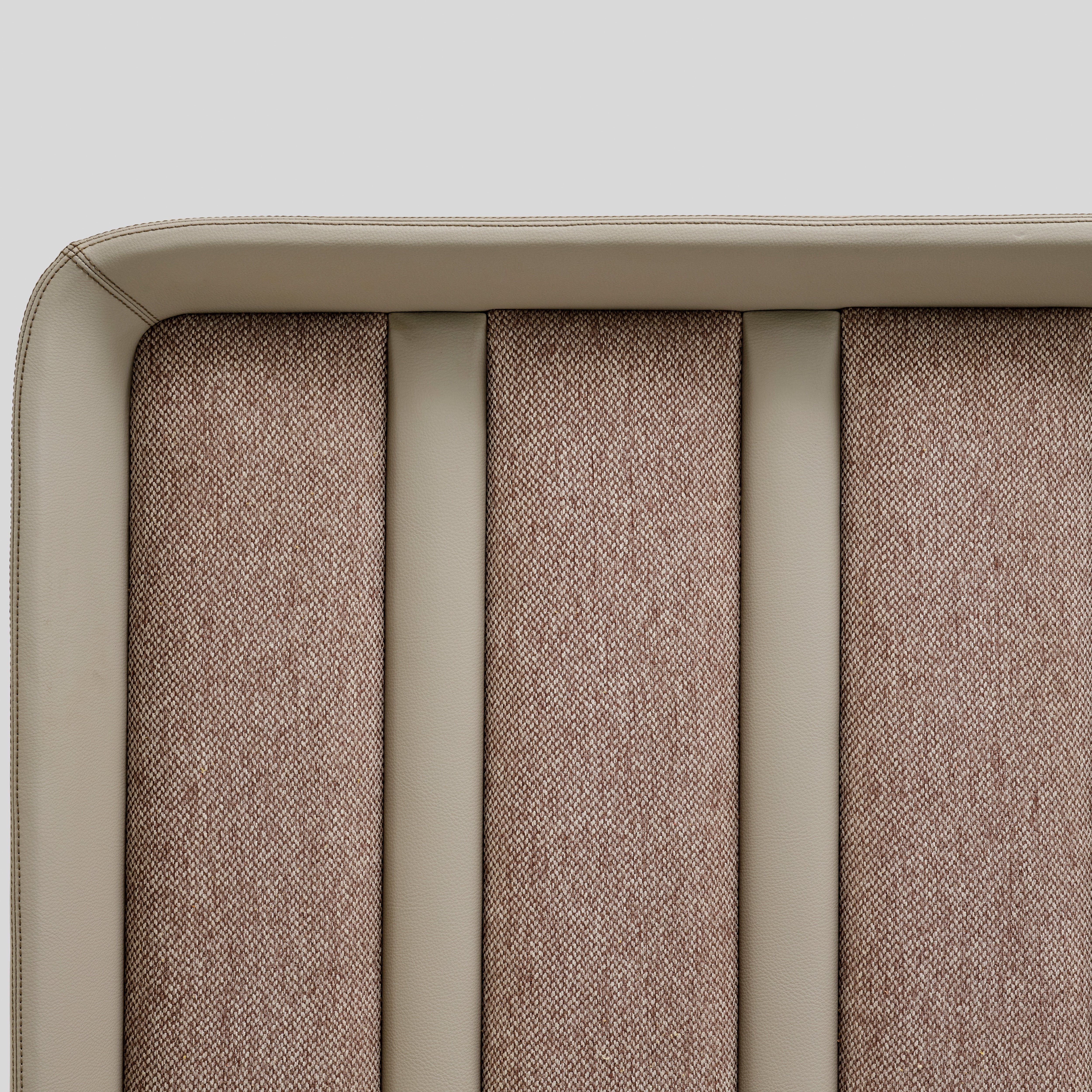 Diago bed leans into a tailored elegance, its vertical channels creating a refined architectural rhythm. The rounded frame softens the composition, lending a sense of polished ease. Together they form a centerpiece that brings quiet sophistication and a beautifully edited presence to the room.