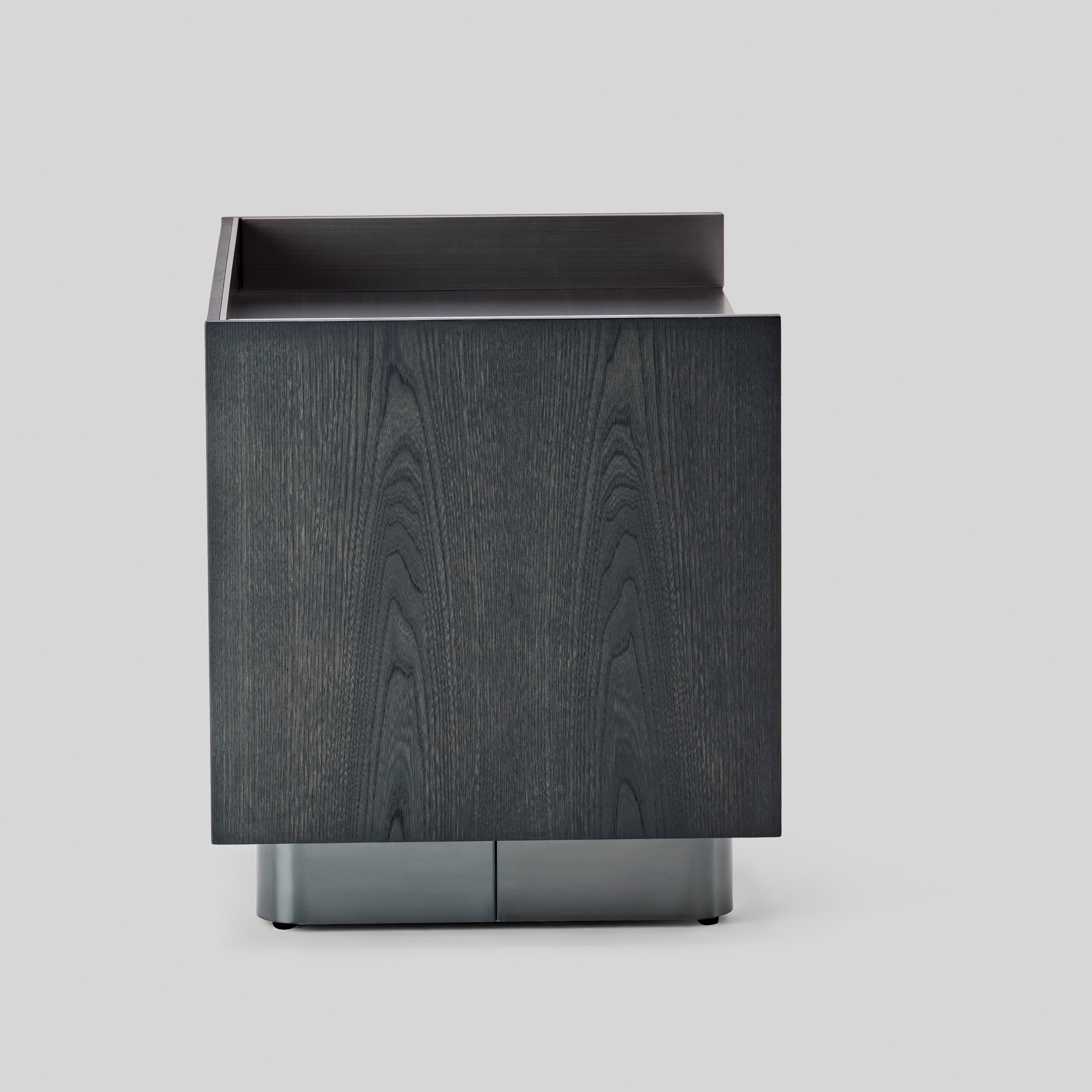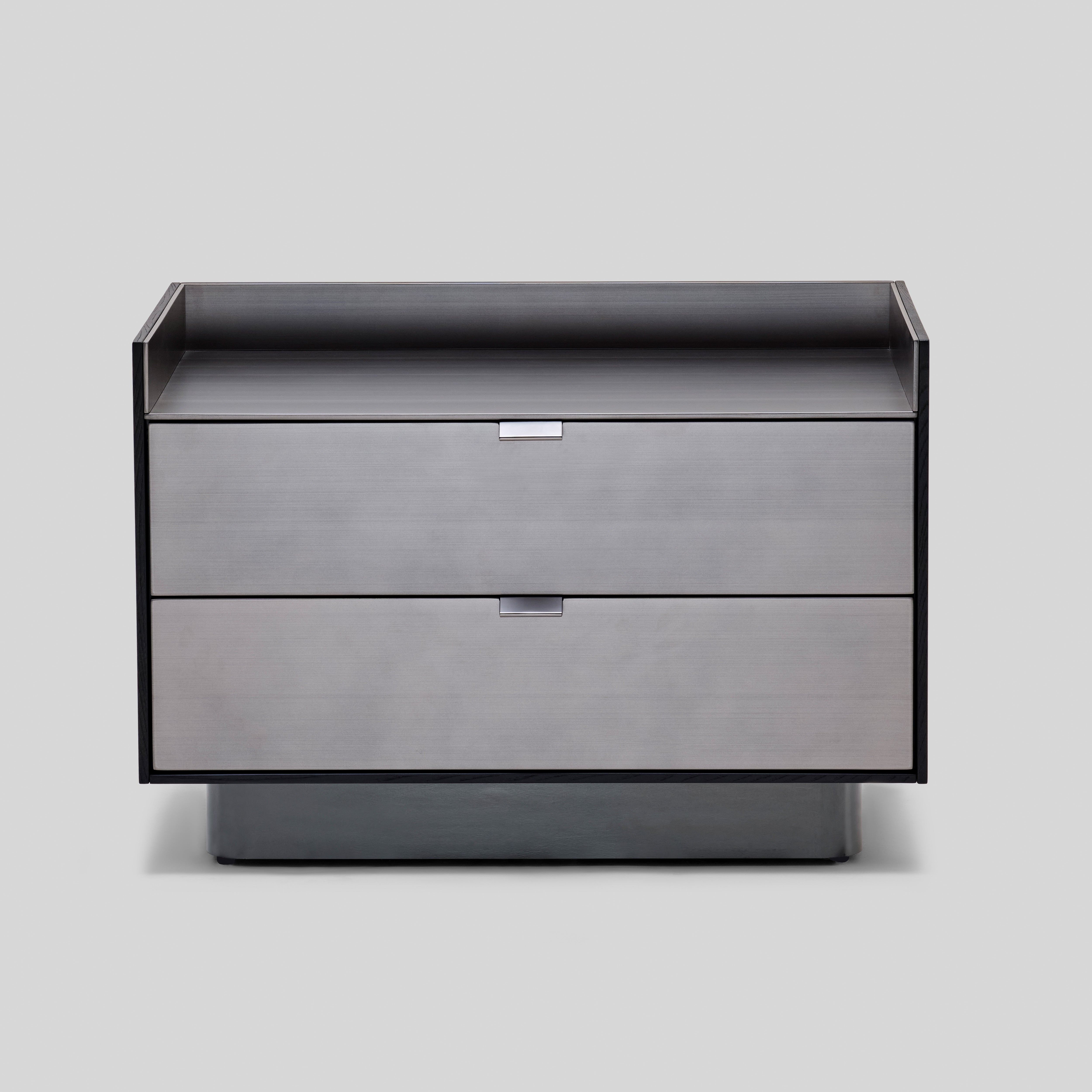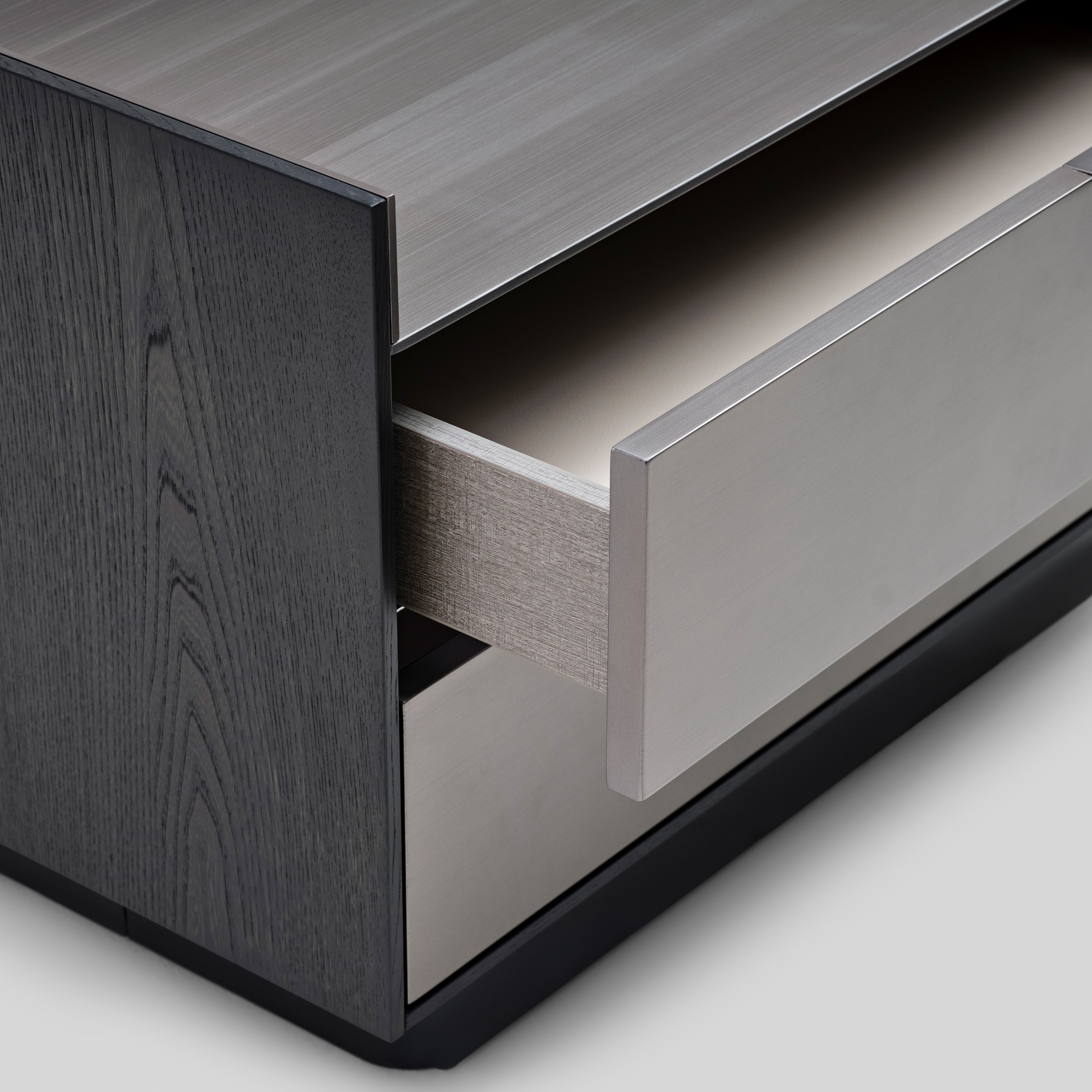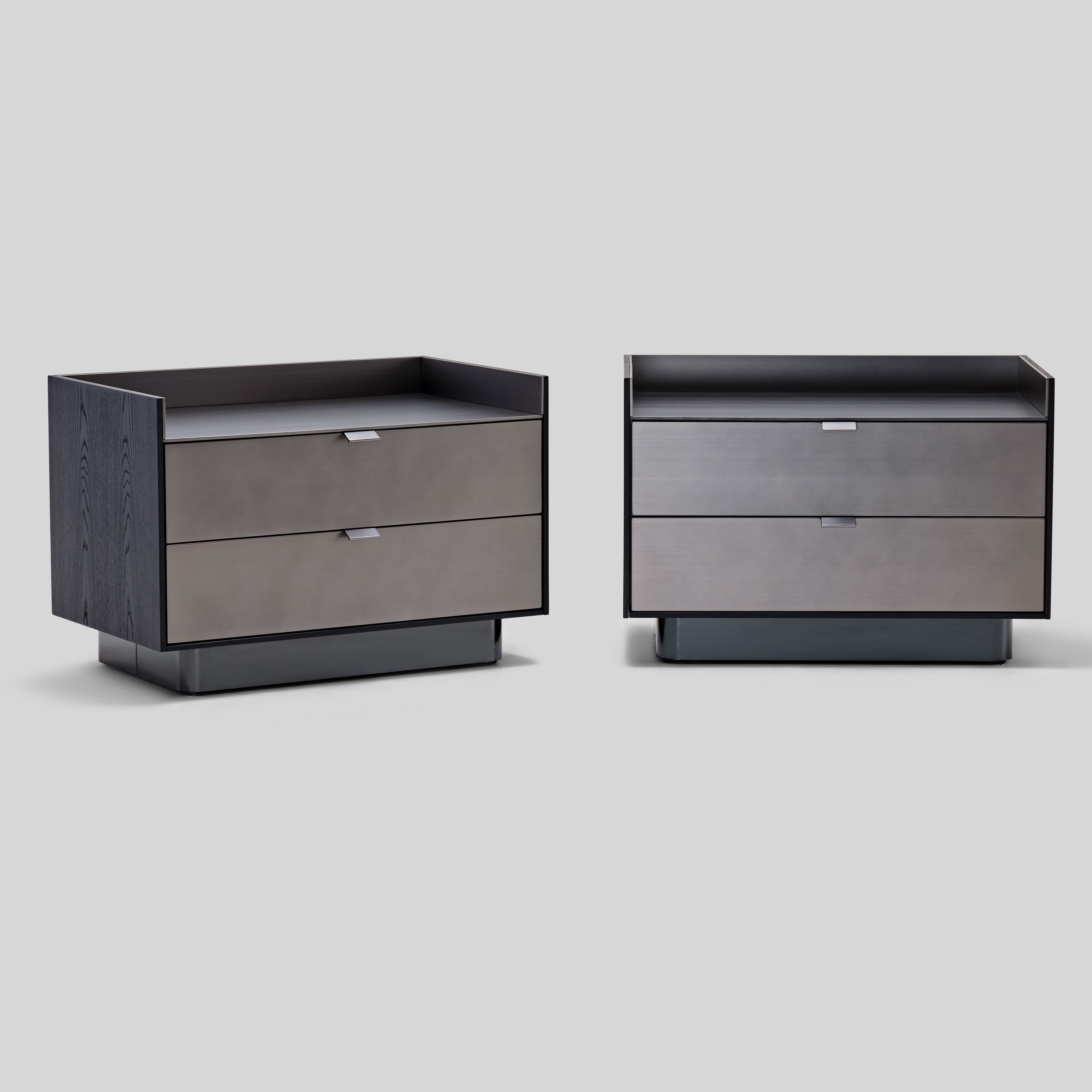 Opus nightstand carries a composed, contemporary attitude, defined by its crisp framing and smooth, understated fronts. The two drawers open with subtle, refined pulls, keeping the design quiet yet purposeful. Elevated on a sleek base, it lends a polished finishing touch to the bedside.