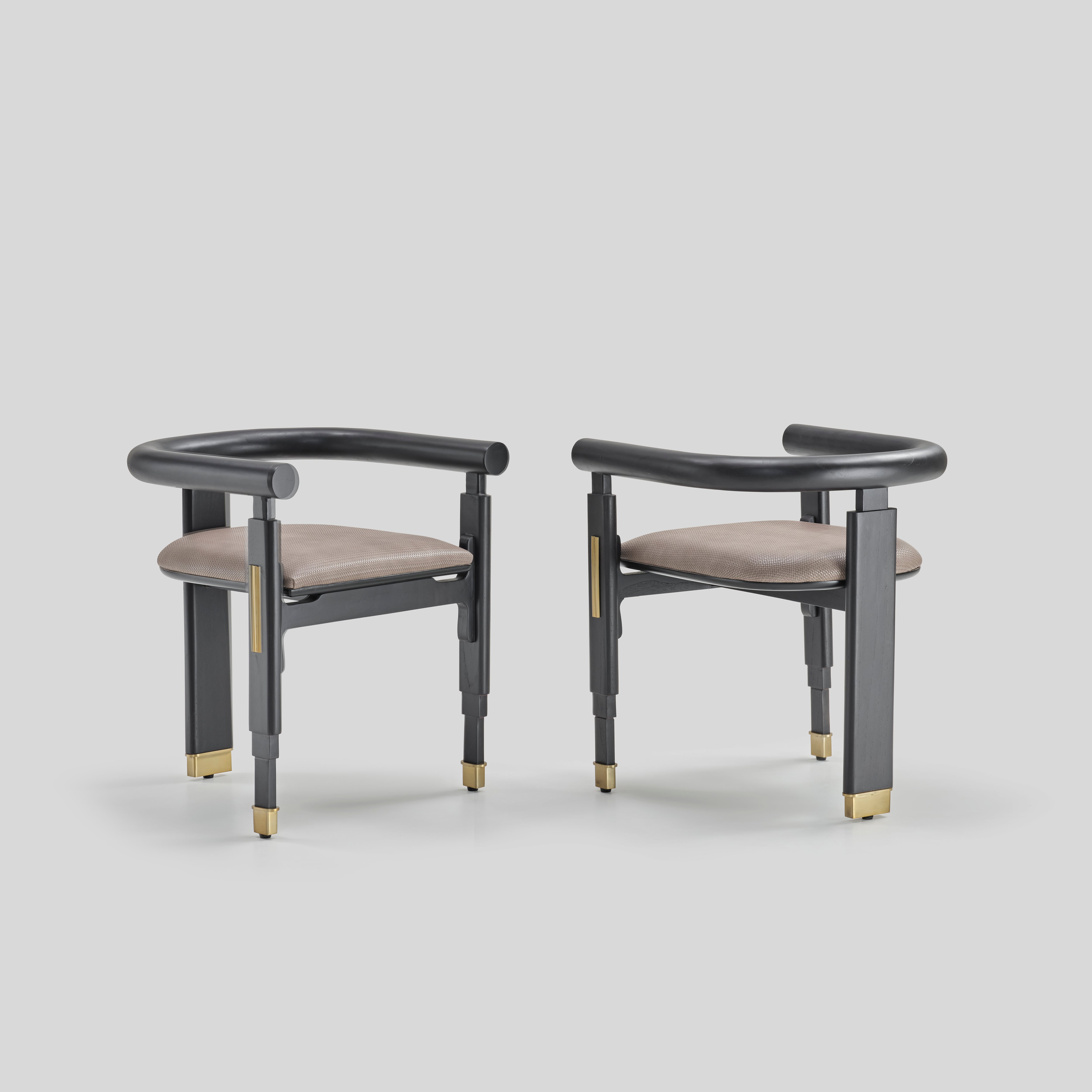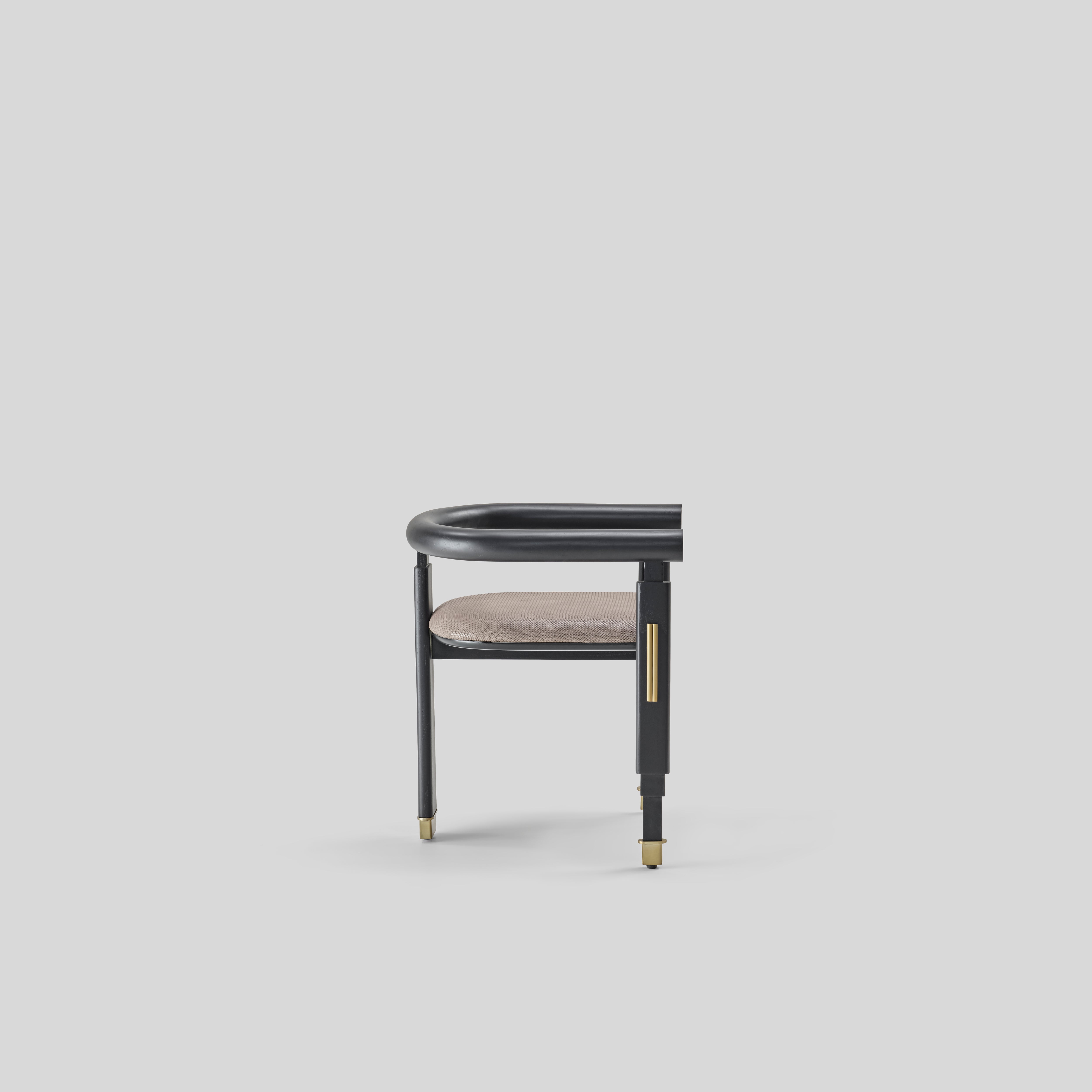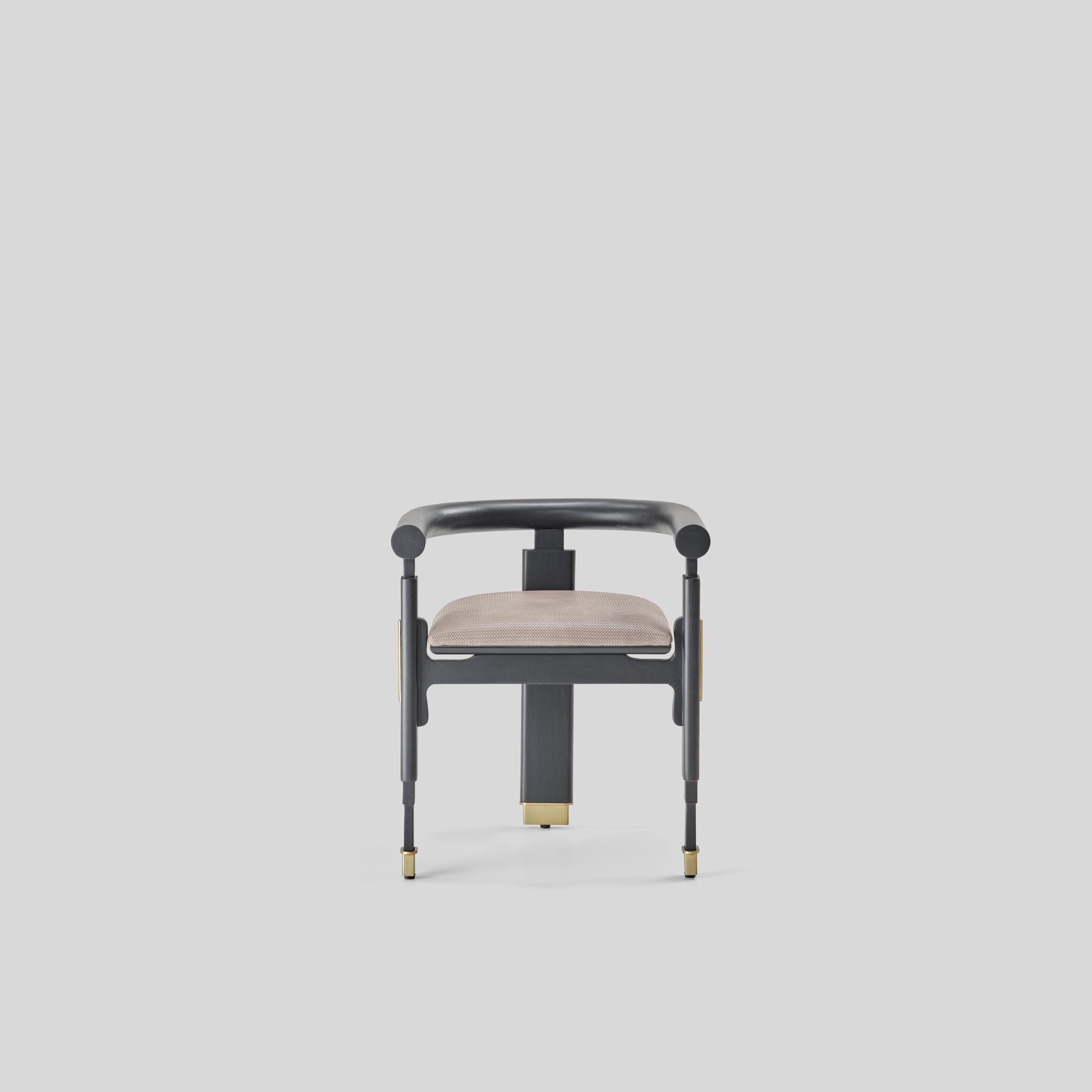 Its bold geometry nods to modern sculpture, while the ascending lines of the legs subtly echo the vertical rhythm of Burj Khalifa’s architecture. A curved upper rail introduces calm balance, giving the chair an intentional, grounded presence with a quiet, contemporary warmth.