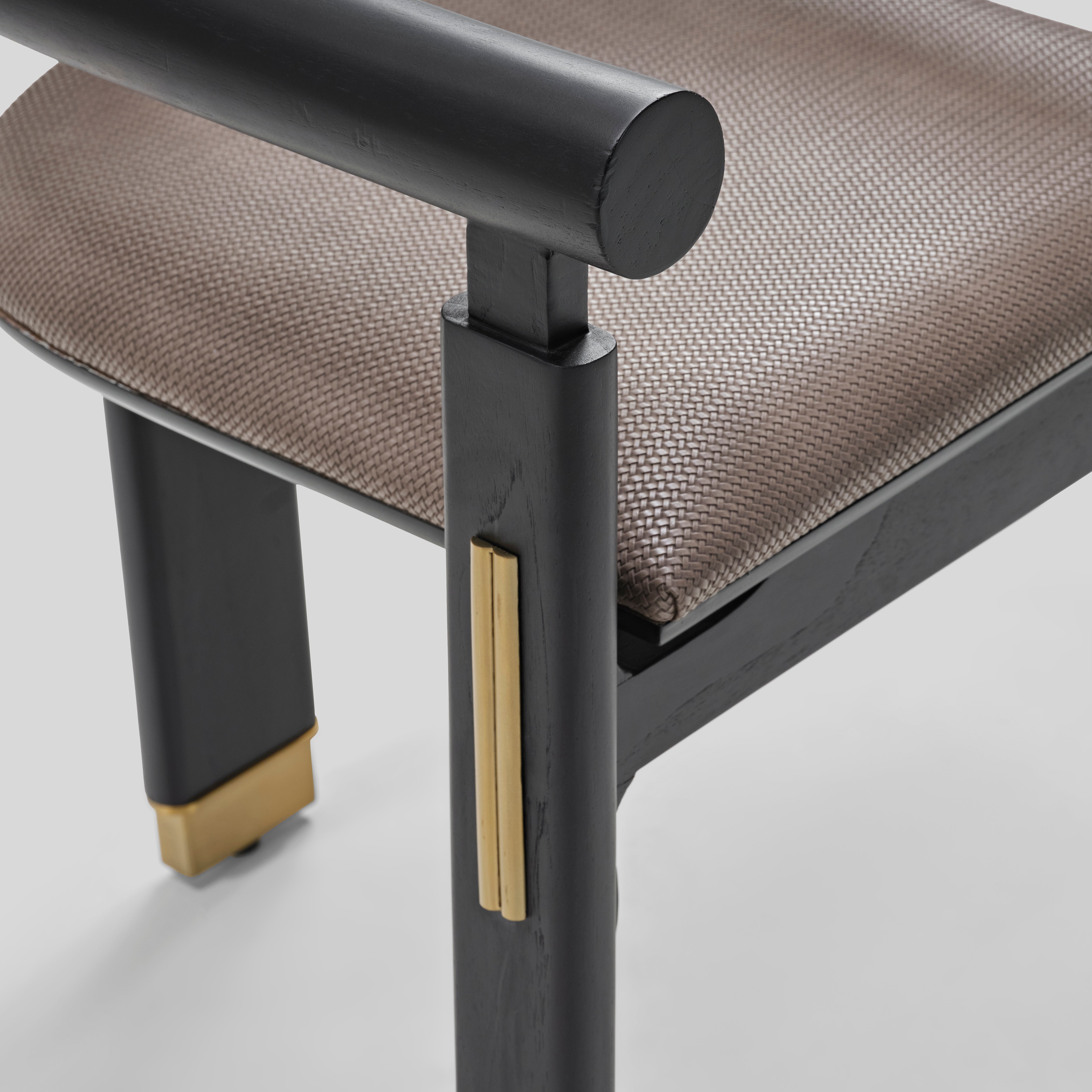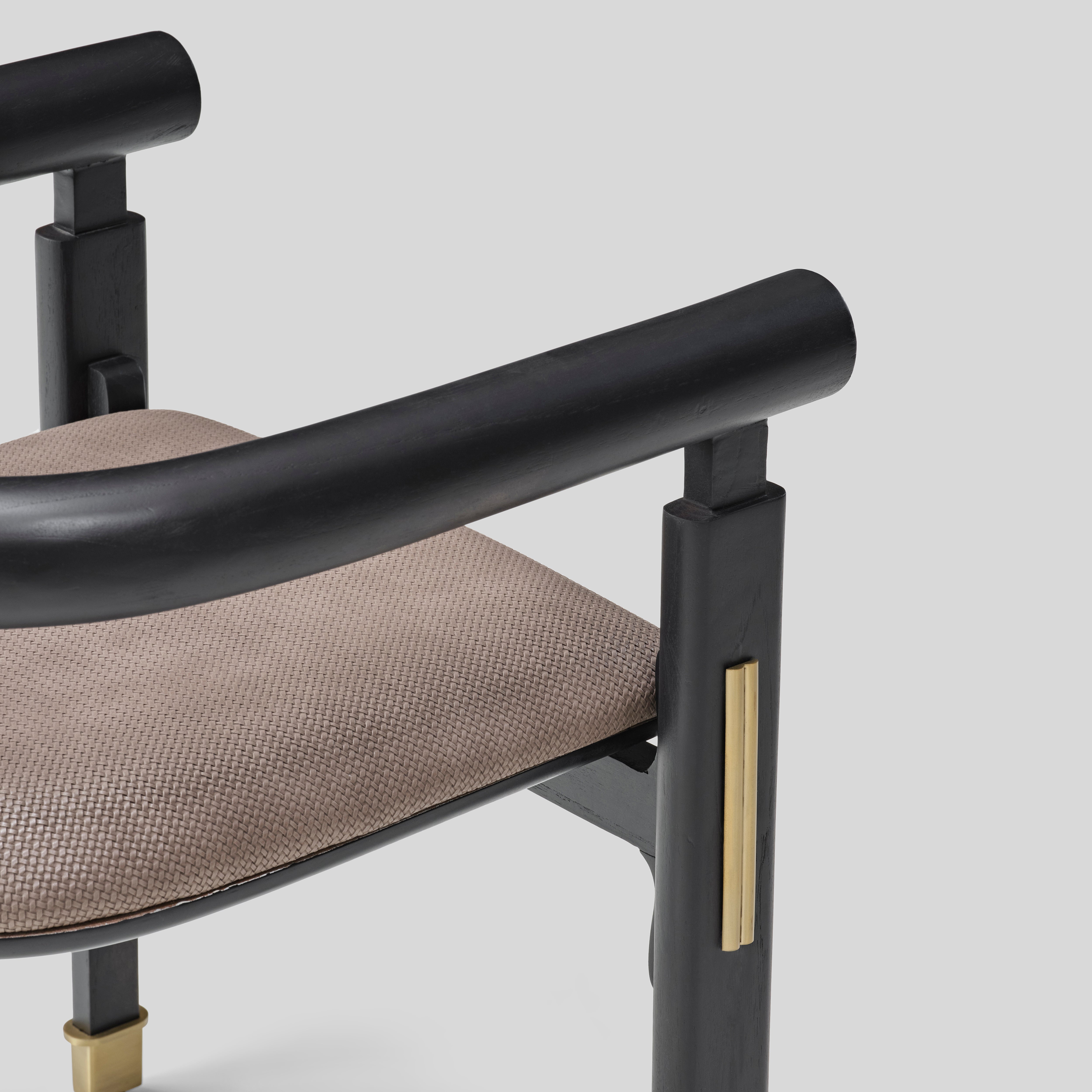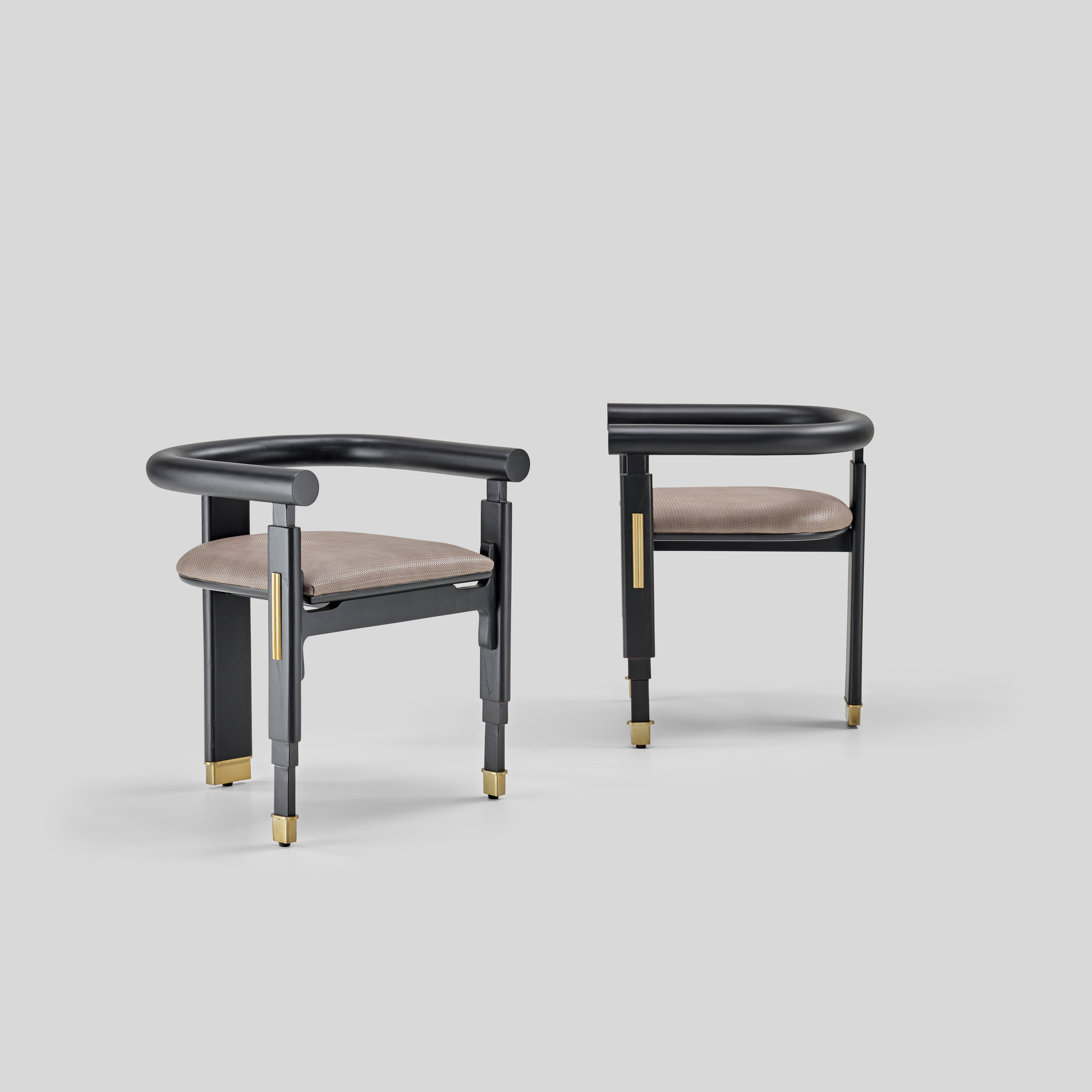 Its bold geometry nods to modern sculpture, while the ascending lines of the legs subtly echo the vertical rhythm of Burj Khalifa’s architecture. A curved upper rail introduces calm balance, giving the chair an intentional, grounded presence with a quiet, contemporary warmth.