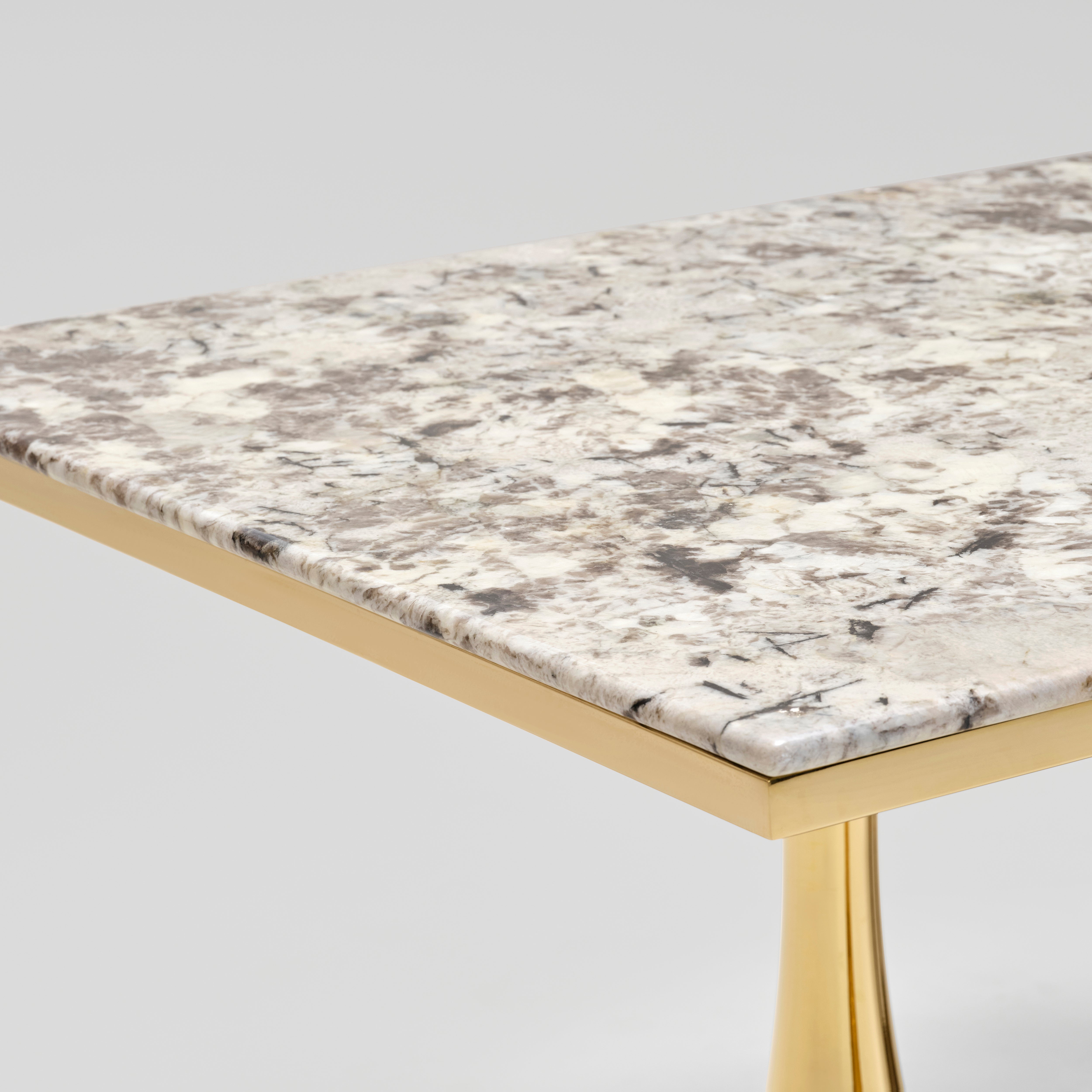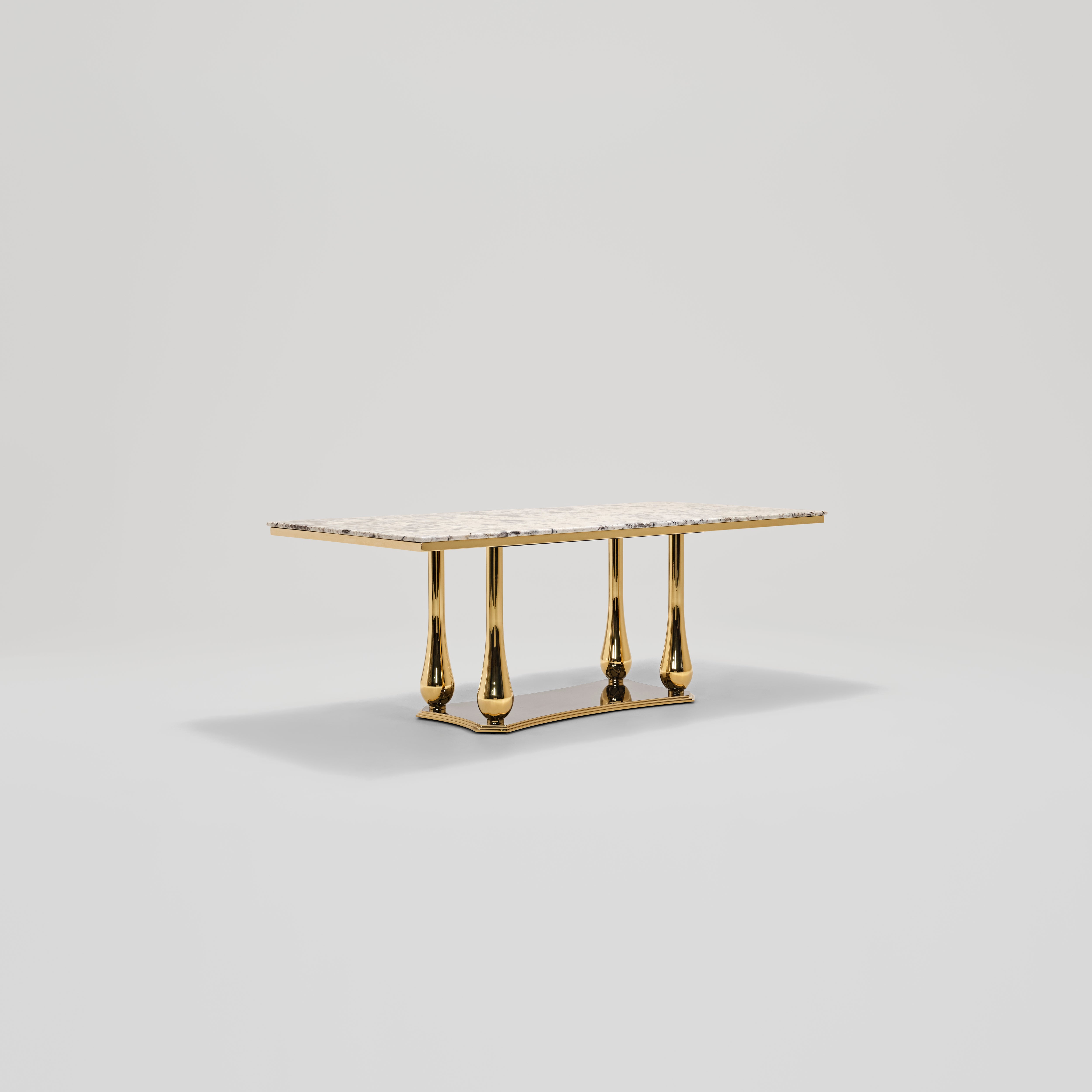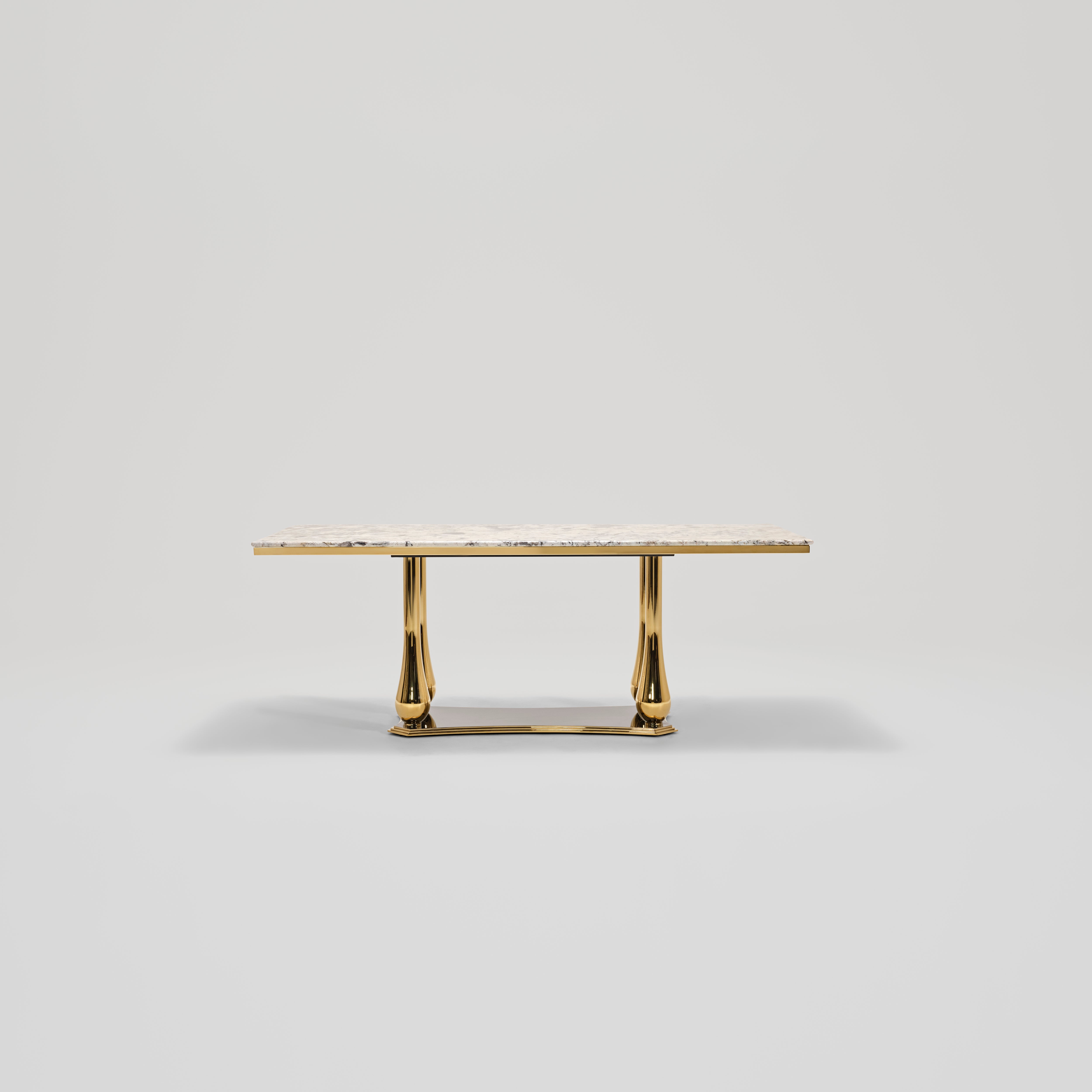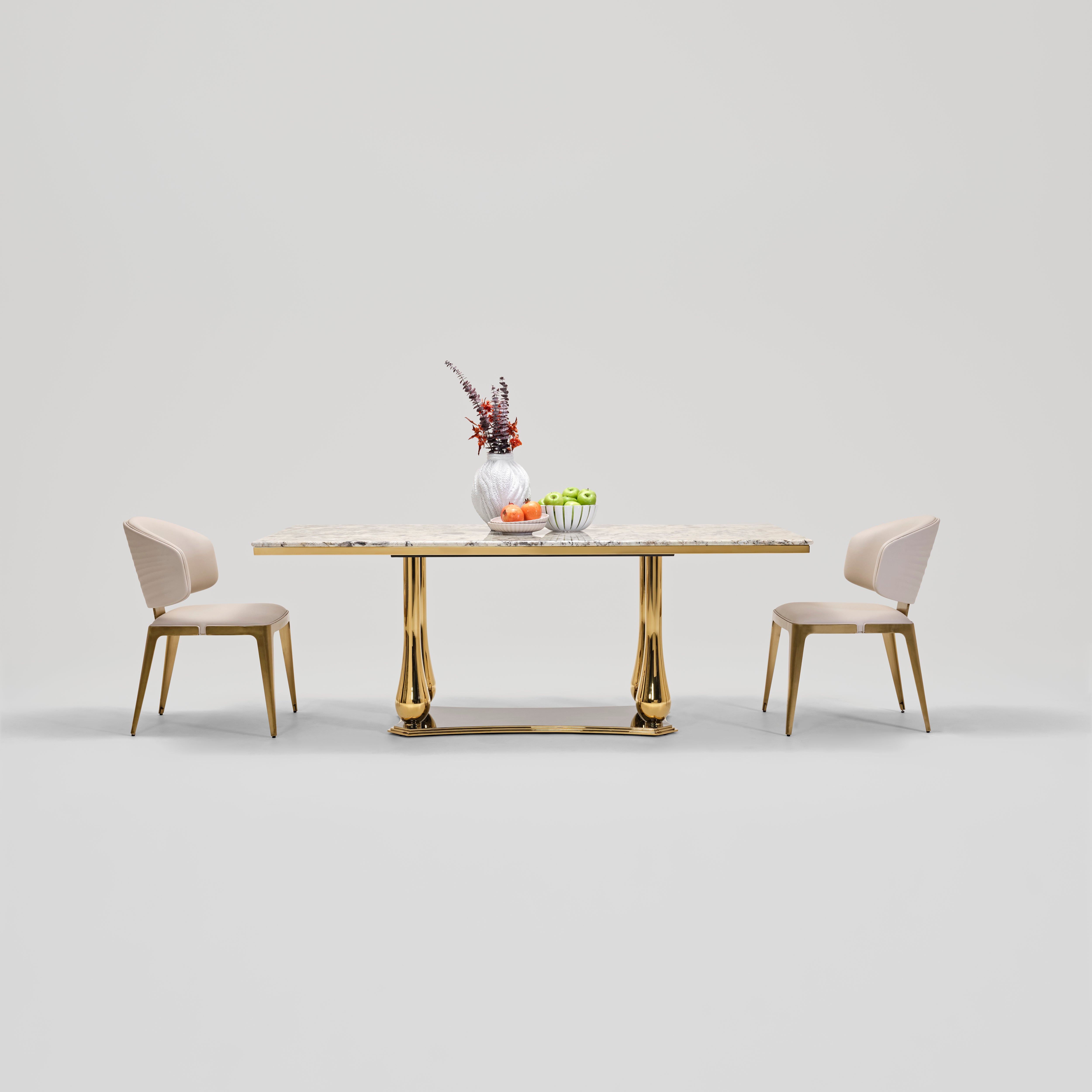 A confident nod to Art Deco revival, the table blends sweeping glamour with contemporary polish. The gleaming supports rise like elegant ornaments, lifting the top with theatrical poise and refined symmetry, creating a centerpiece that feels opulent, modern, and unmistakably statement-worthy.