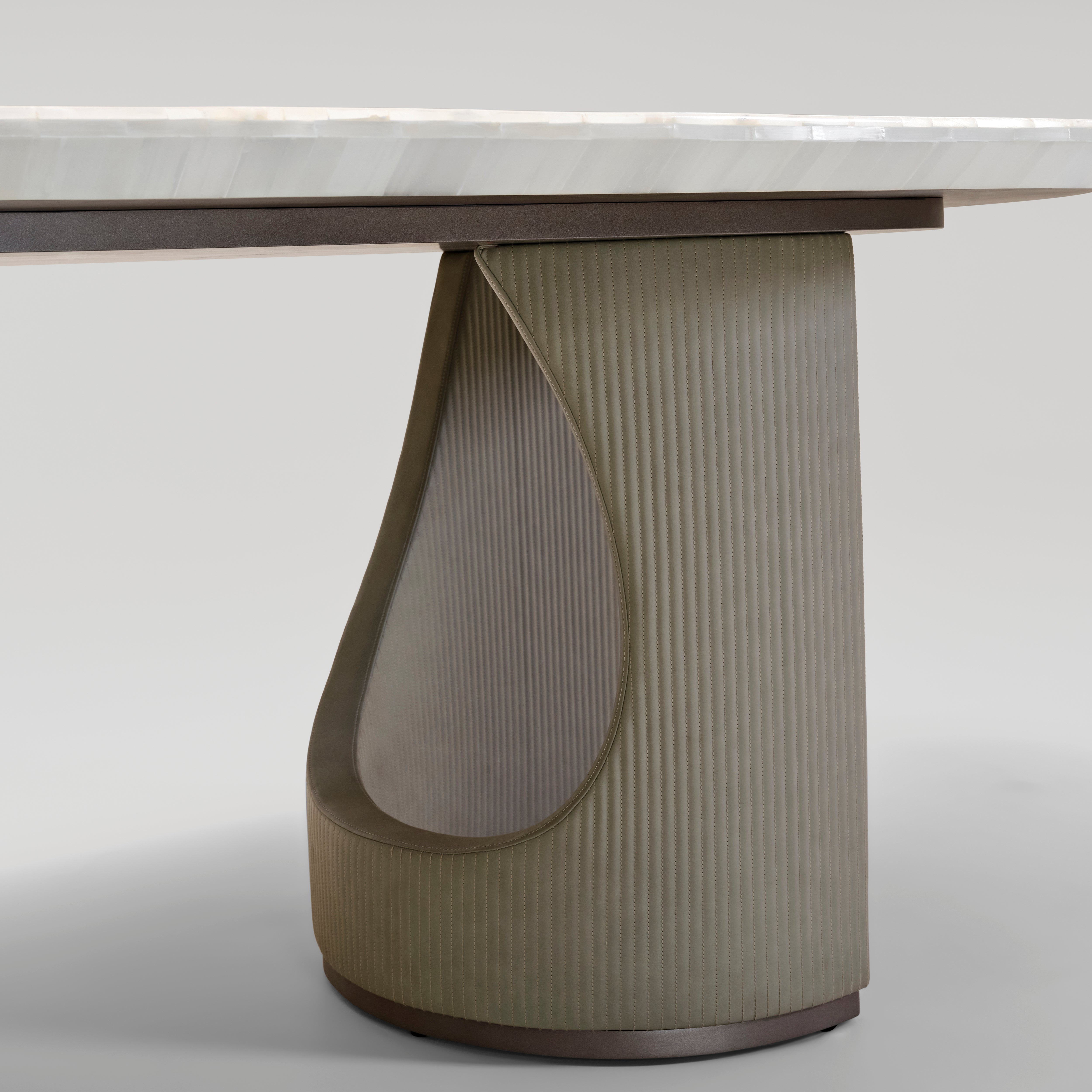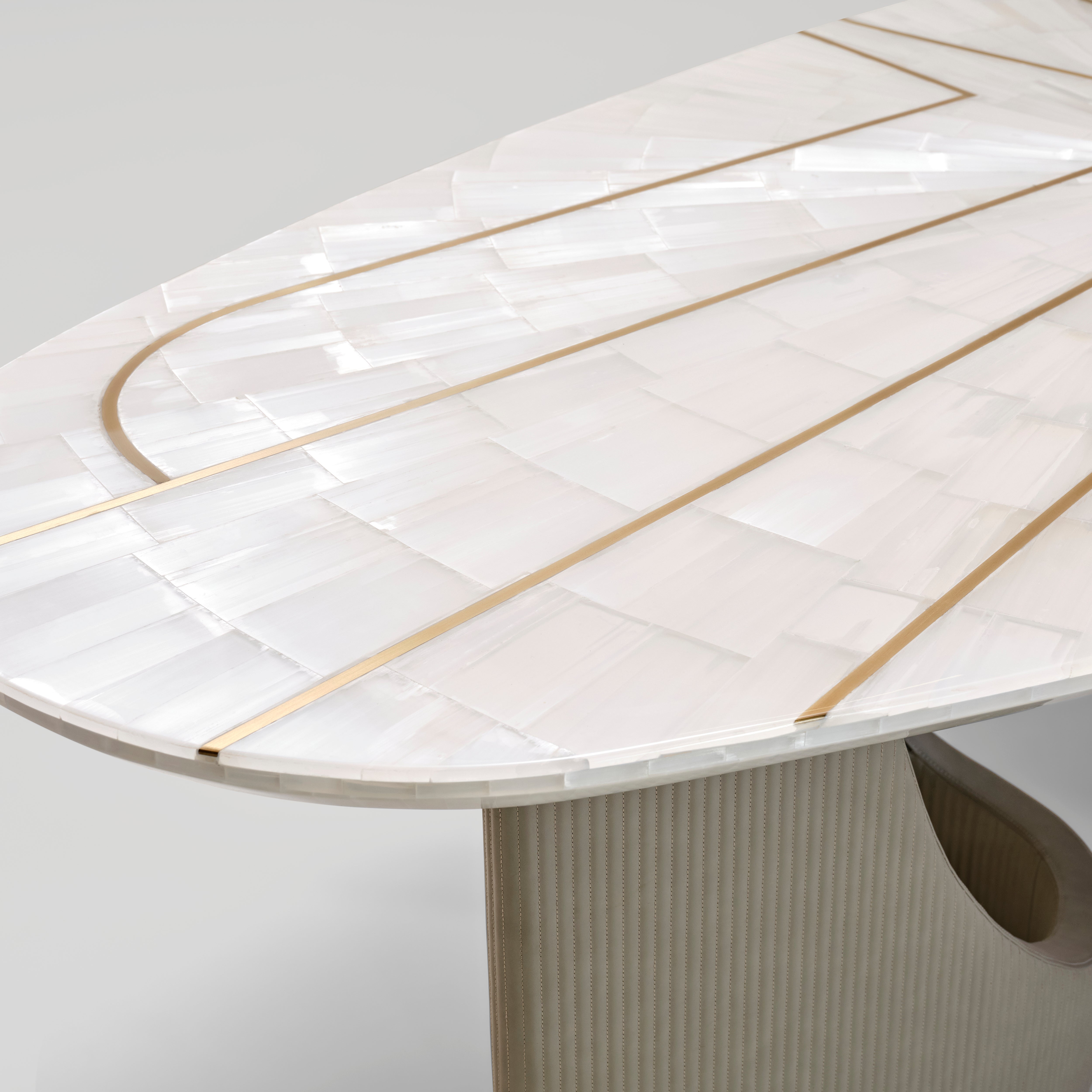 - Table Top in Semi precious stone (Selenite) with radial brass inlay, Curve base structure cladded in leatherette with linear stitch detail accented with metal trims