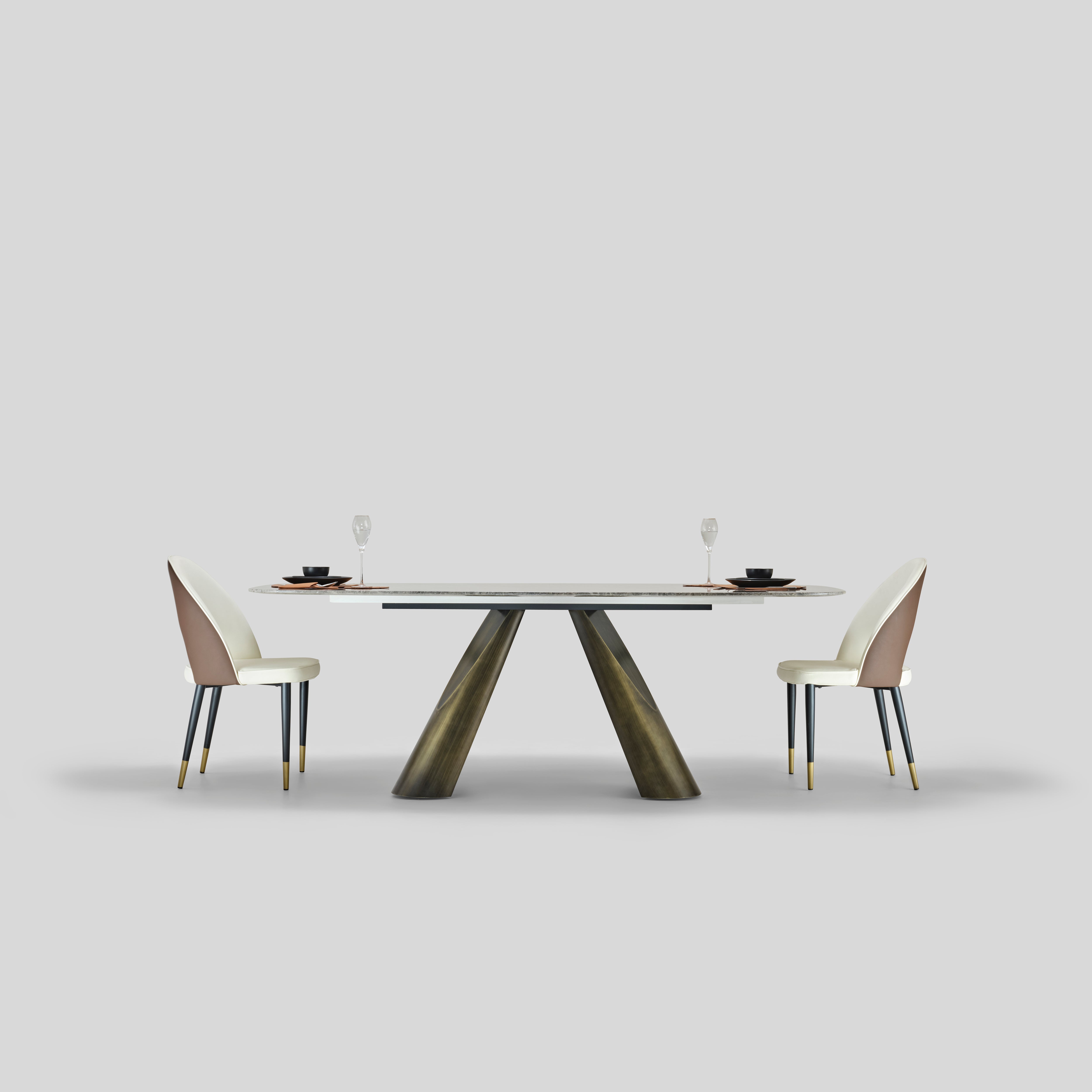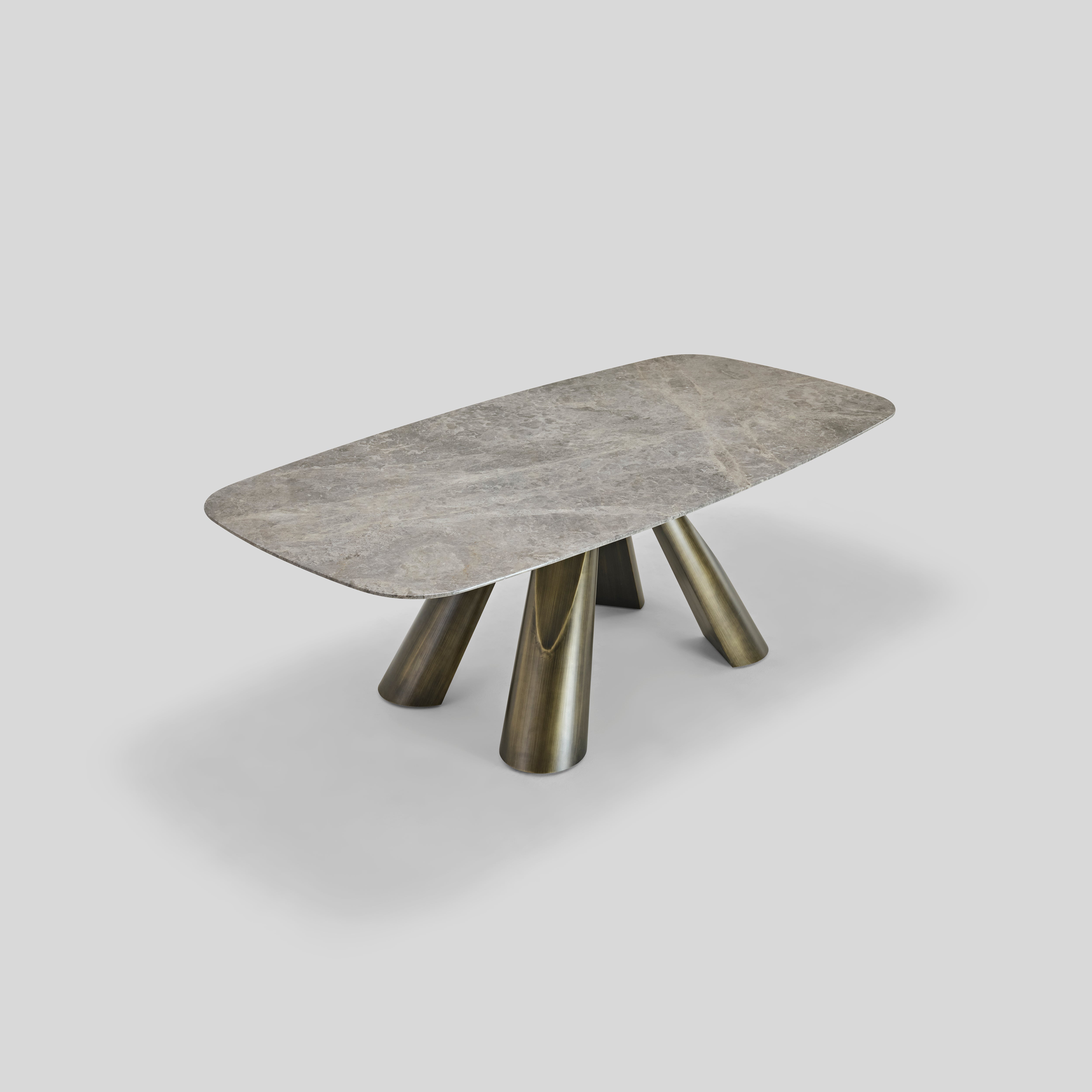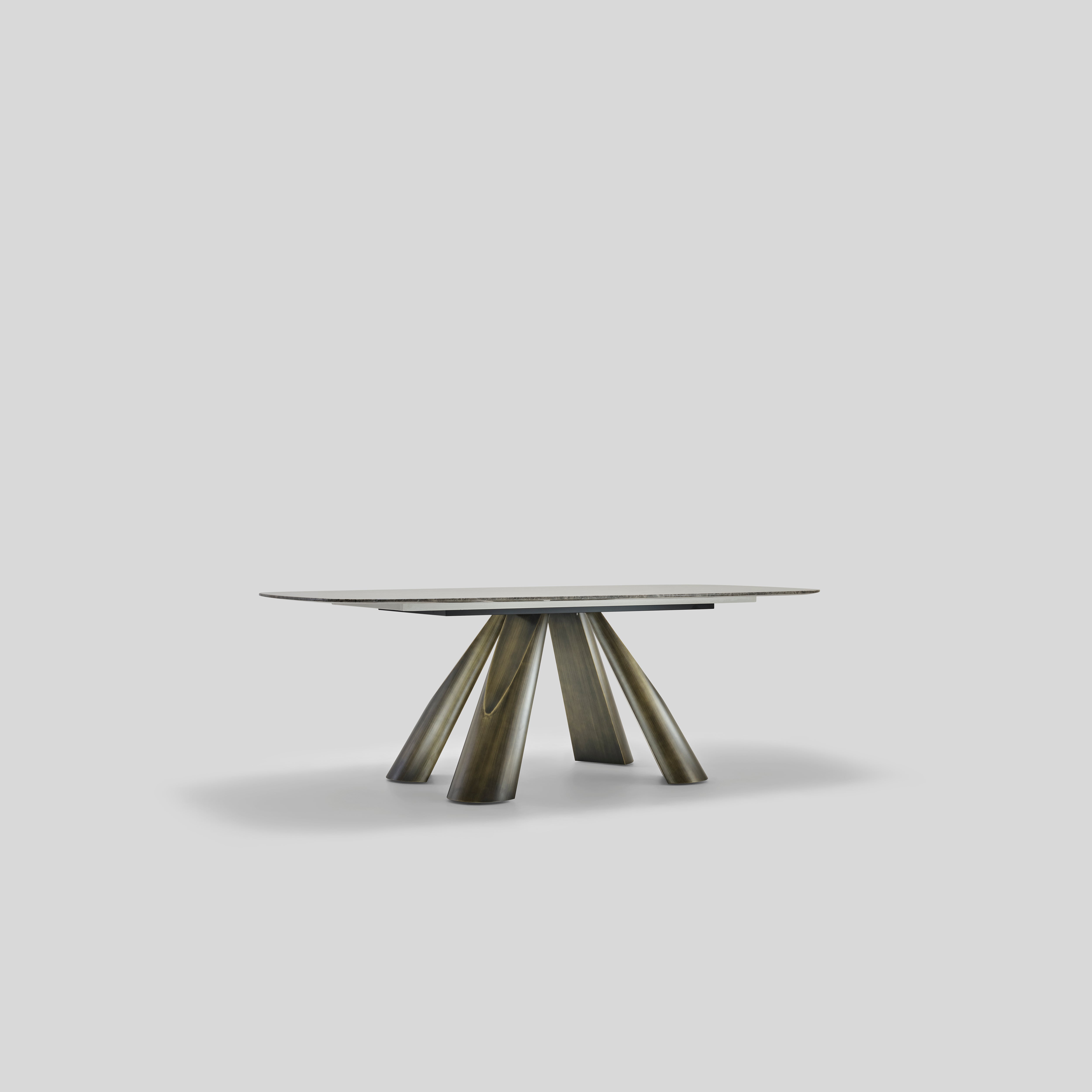 A cluster of angled supports gives the table a poised, almost kinetic stance, lifting the broad top with sculptural ease. Its form feels contemporary and assured, offering a refined balance of stability and movement that complements both spacious interiors and intimate dining settings.
