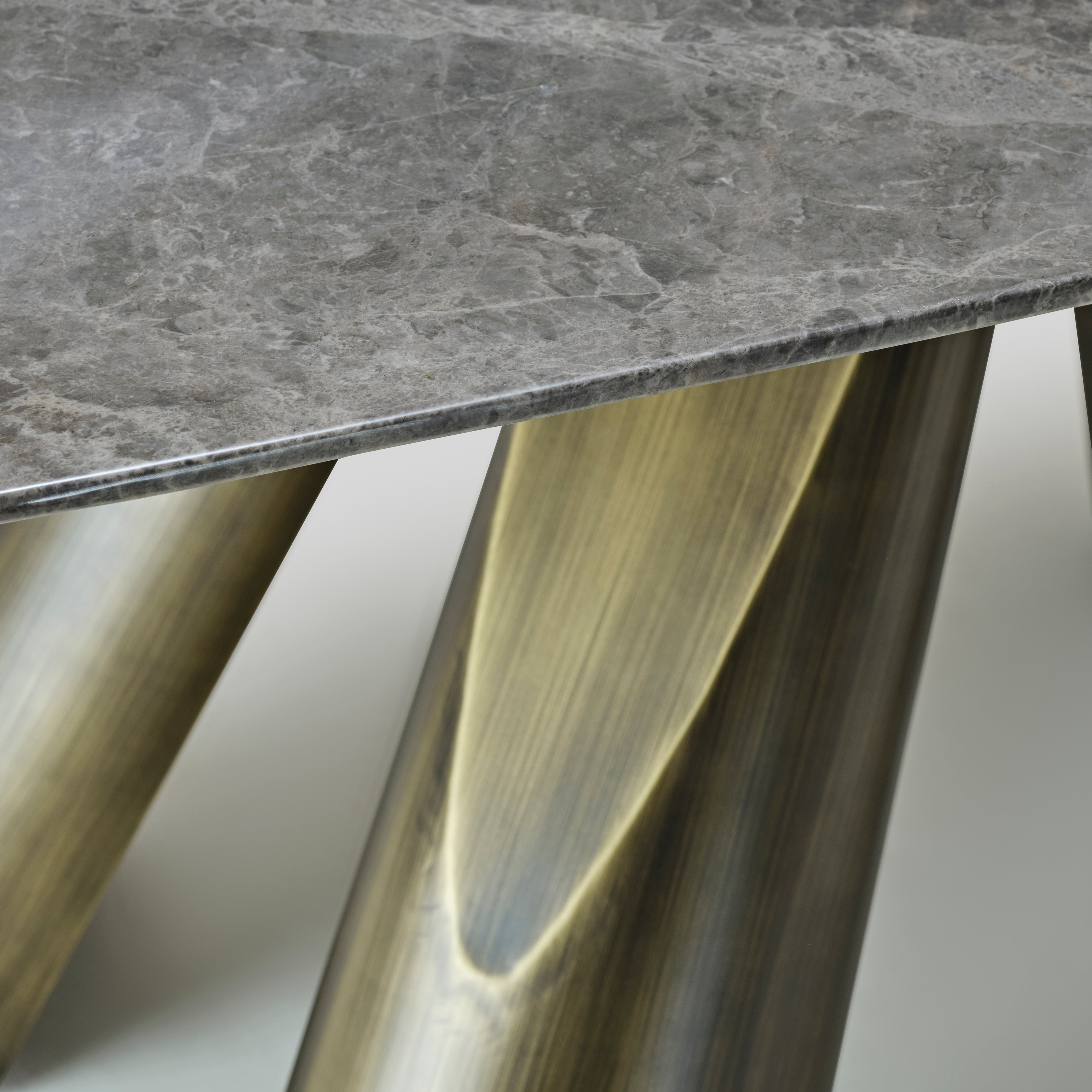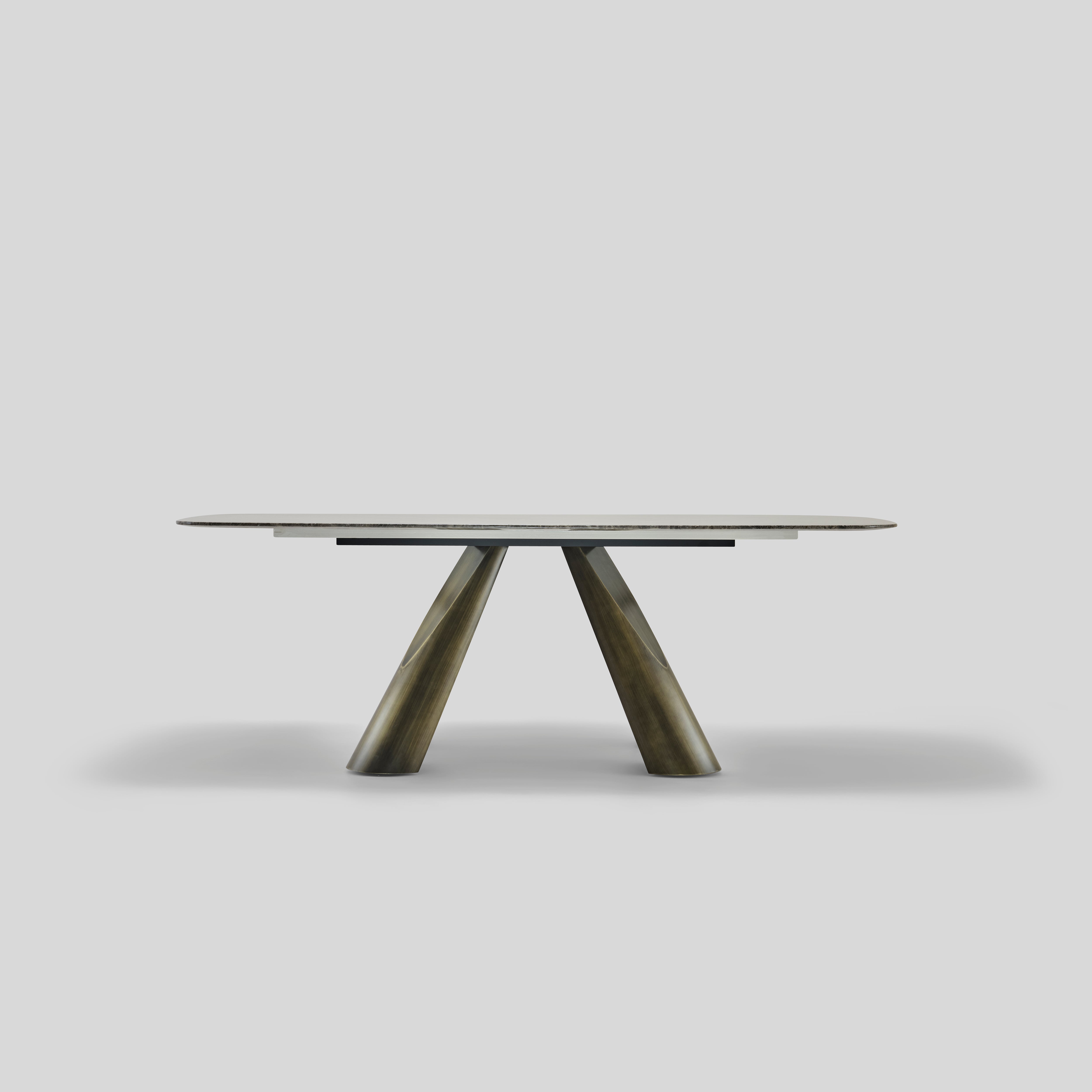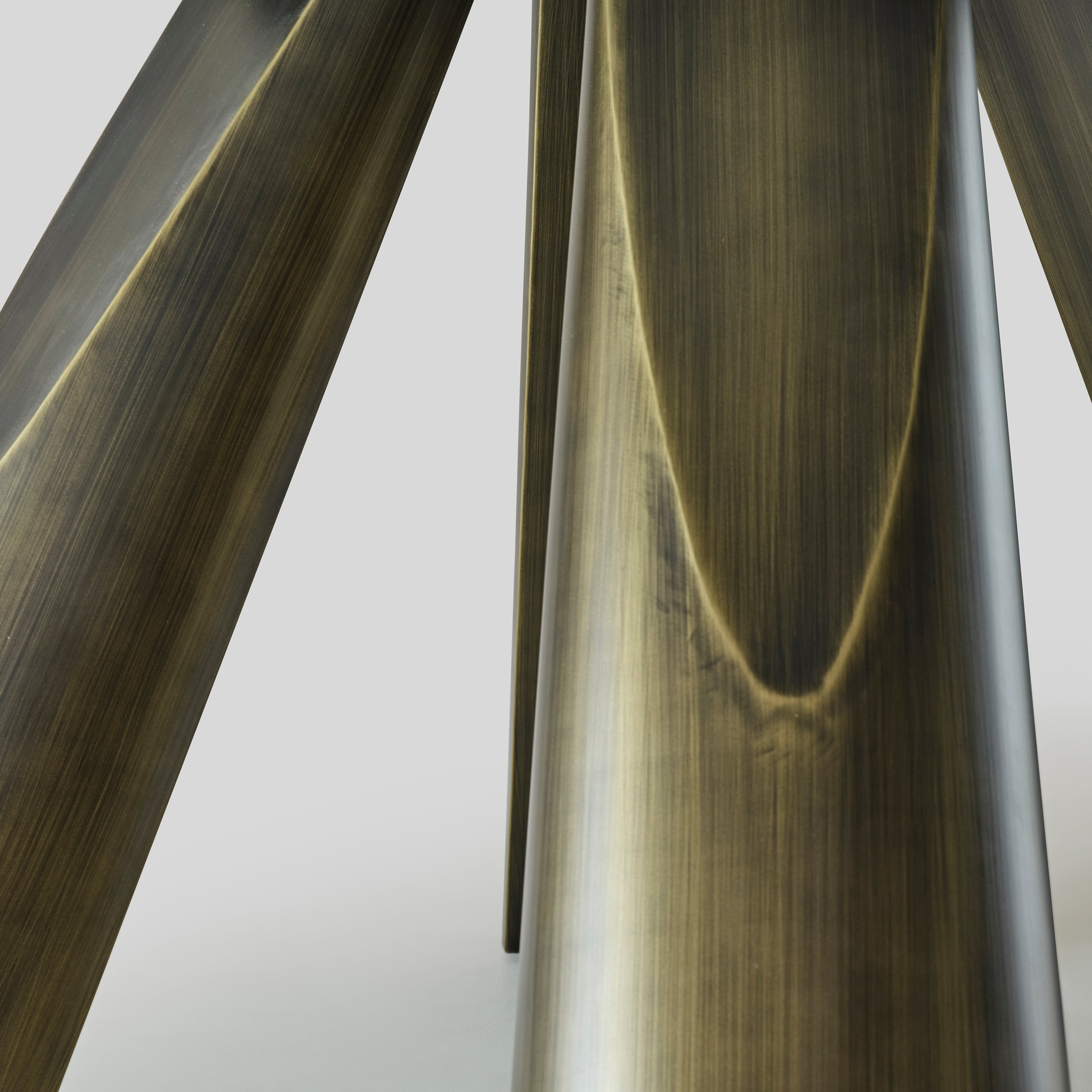 A cluster of angled supports gives the table a poised, almost kinetic stance, lifting the broad top with sculptural ease. Its form feels contemporary and assured, offering a refined balance of stability and movement that complements both spacious interiors and intimate dining settings.