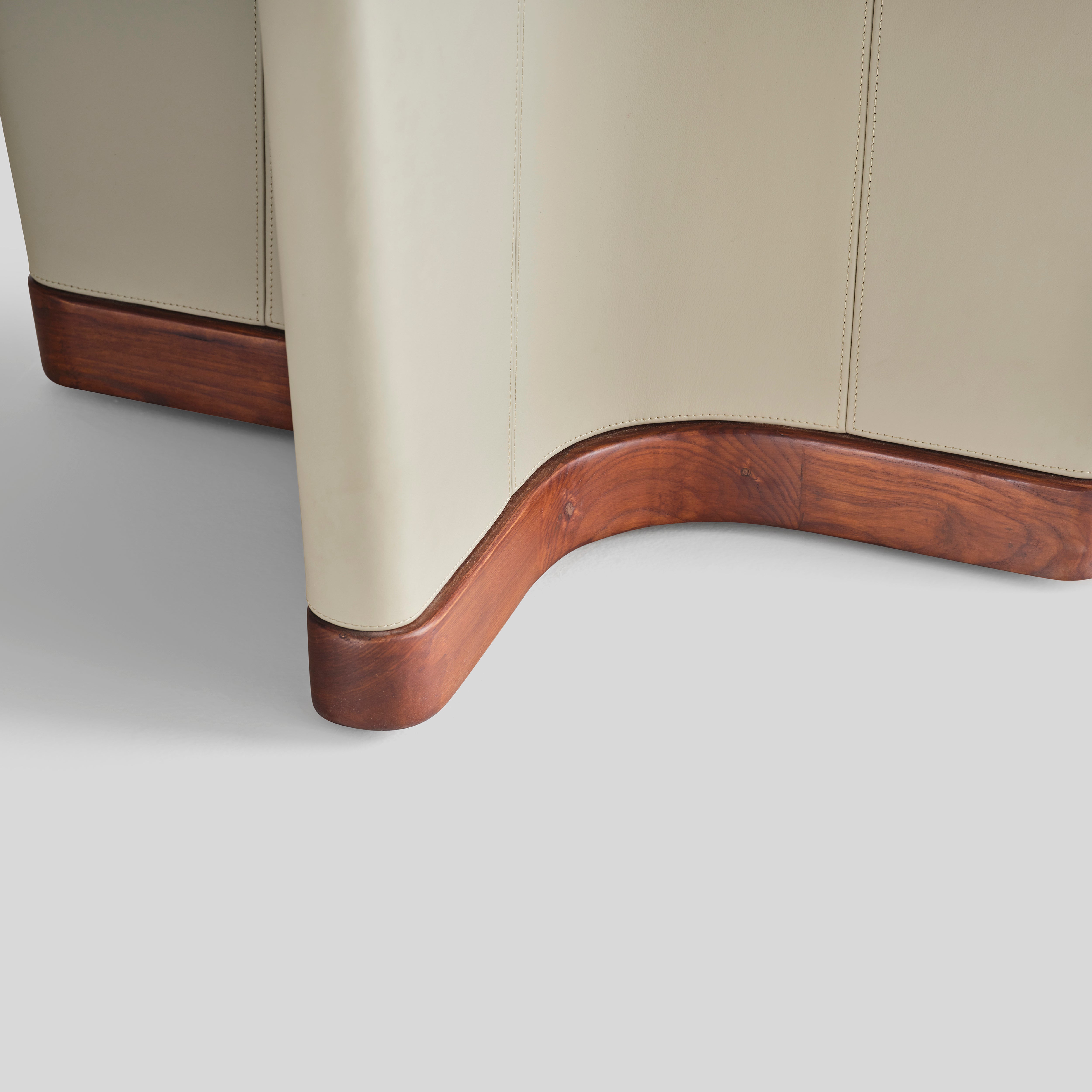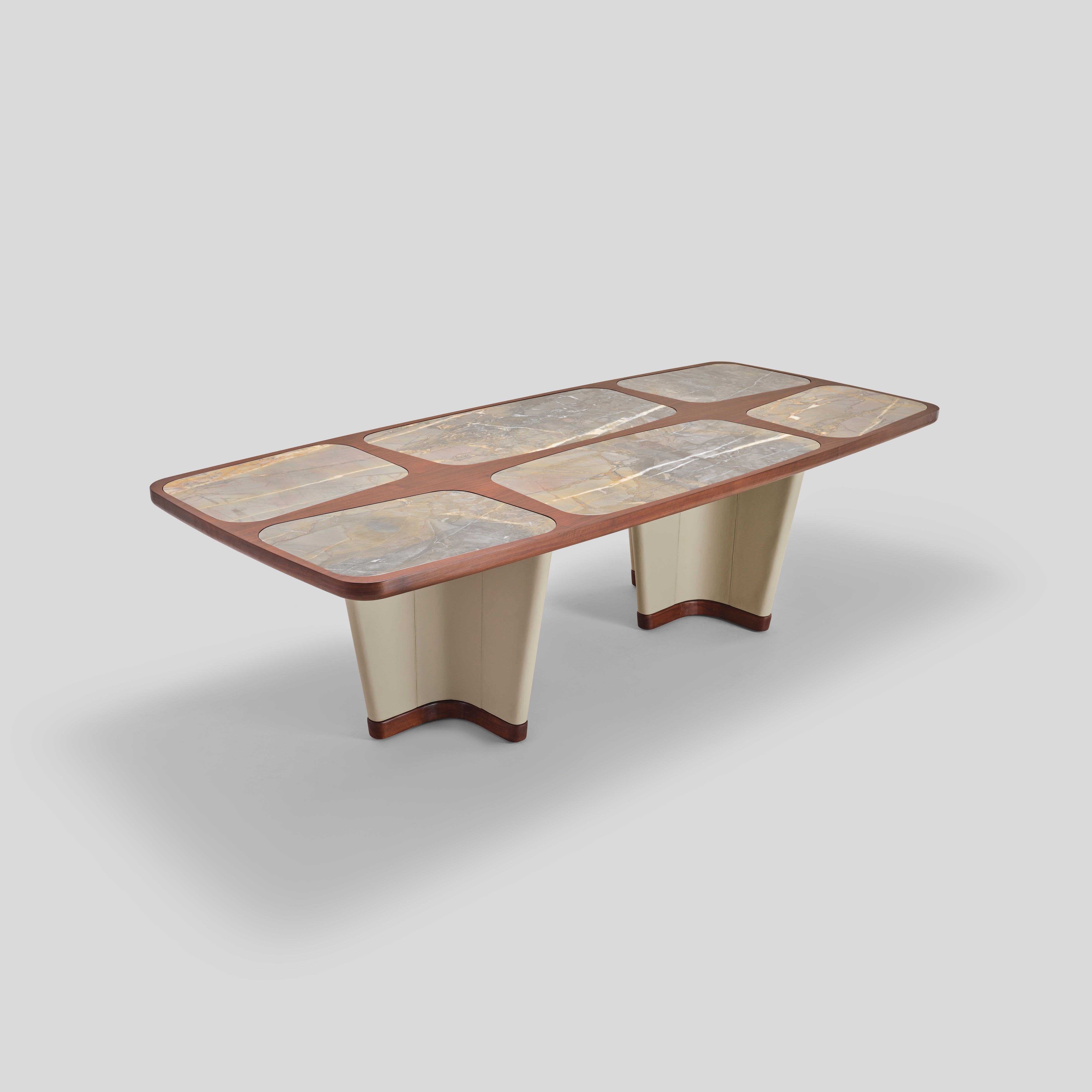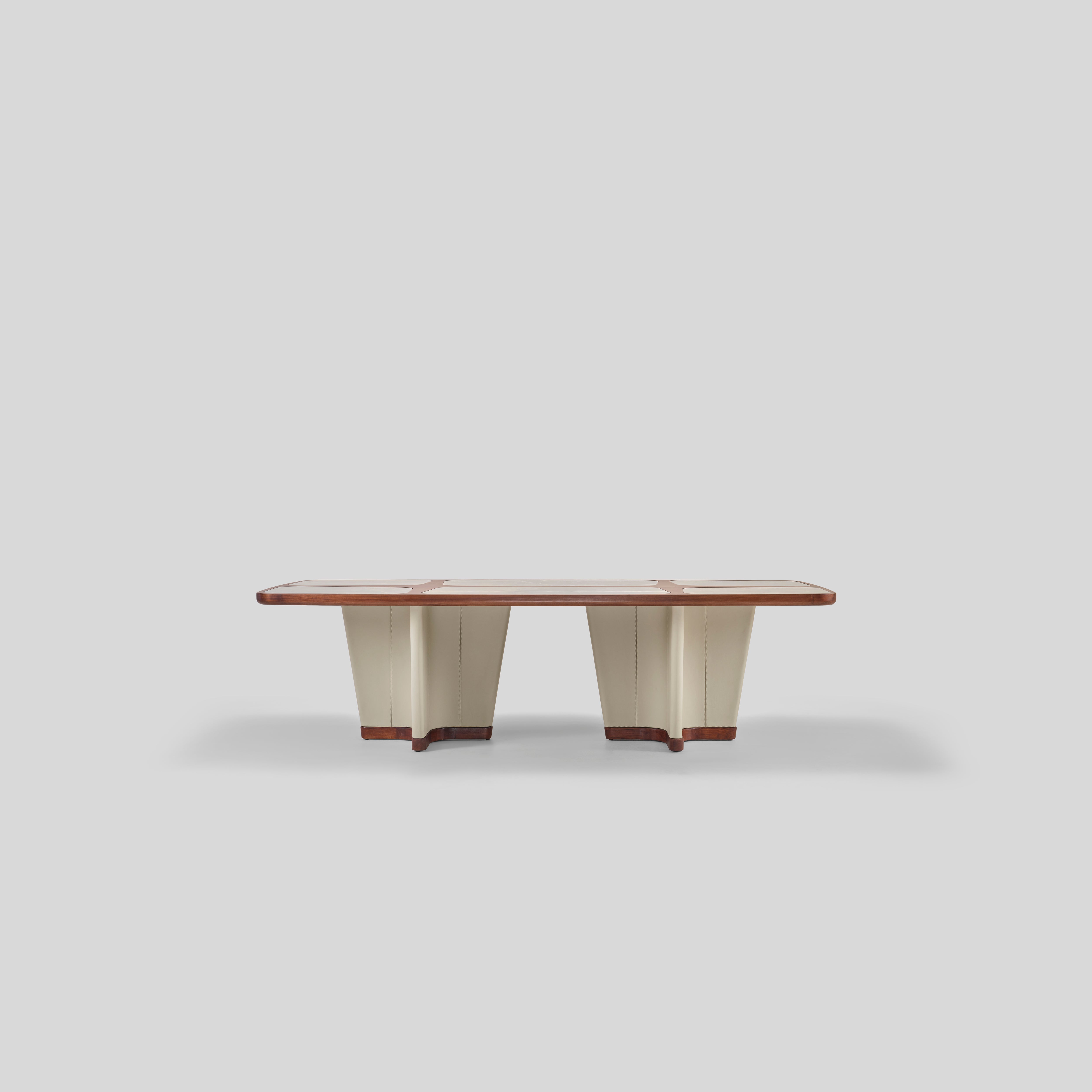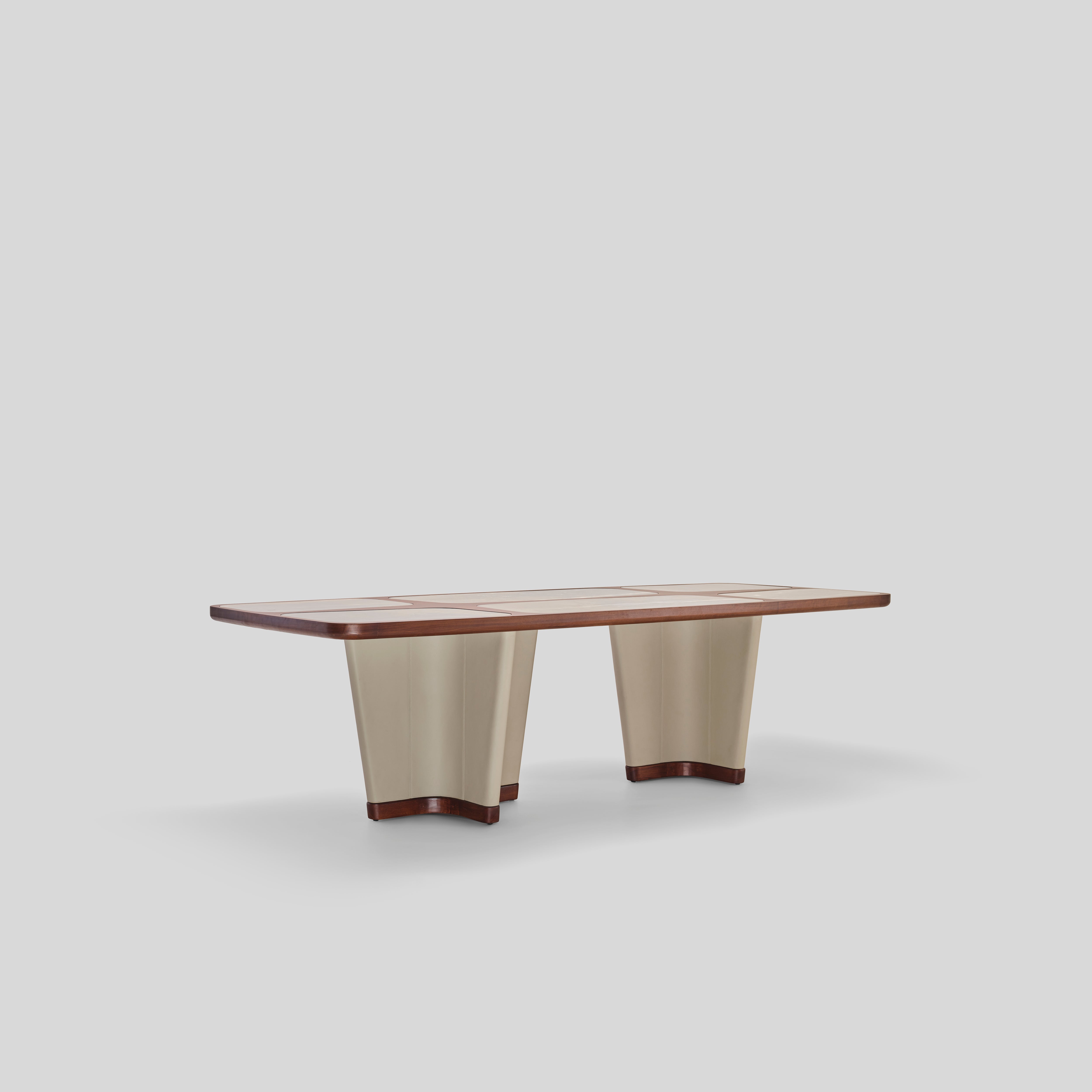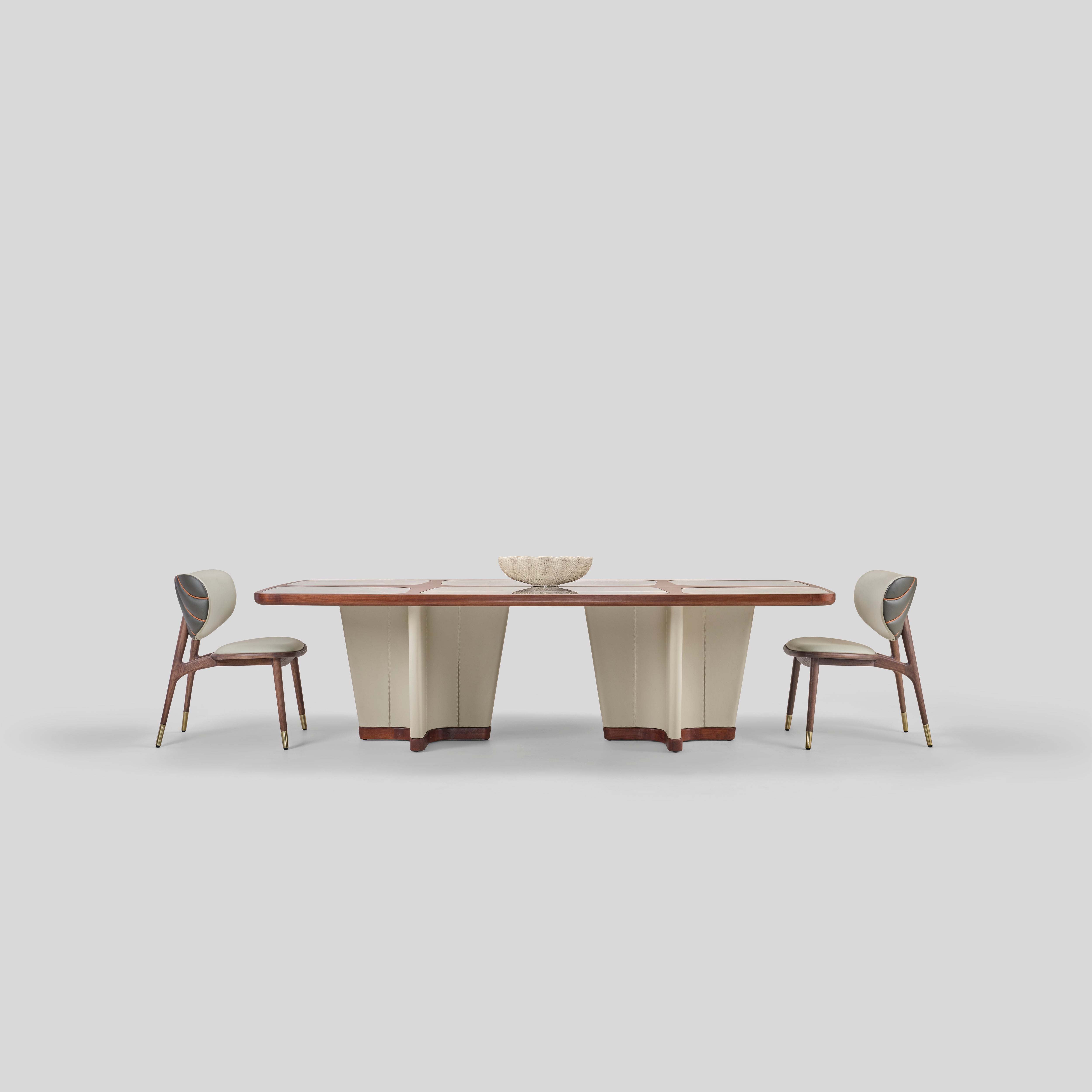 Elegant in proportion and quietly architectural, the table introduces a grounded sophistication to any dining space. Its dual pedestal form feels curated and composed, while the warm wood accents lend a tailored richness that elevates the room with understated, contemporary luxury.