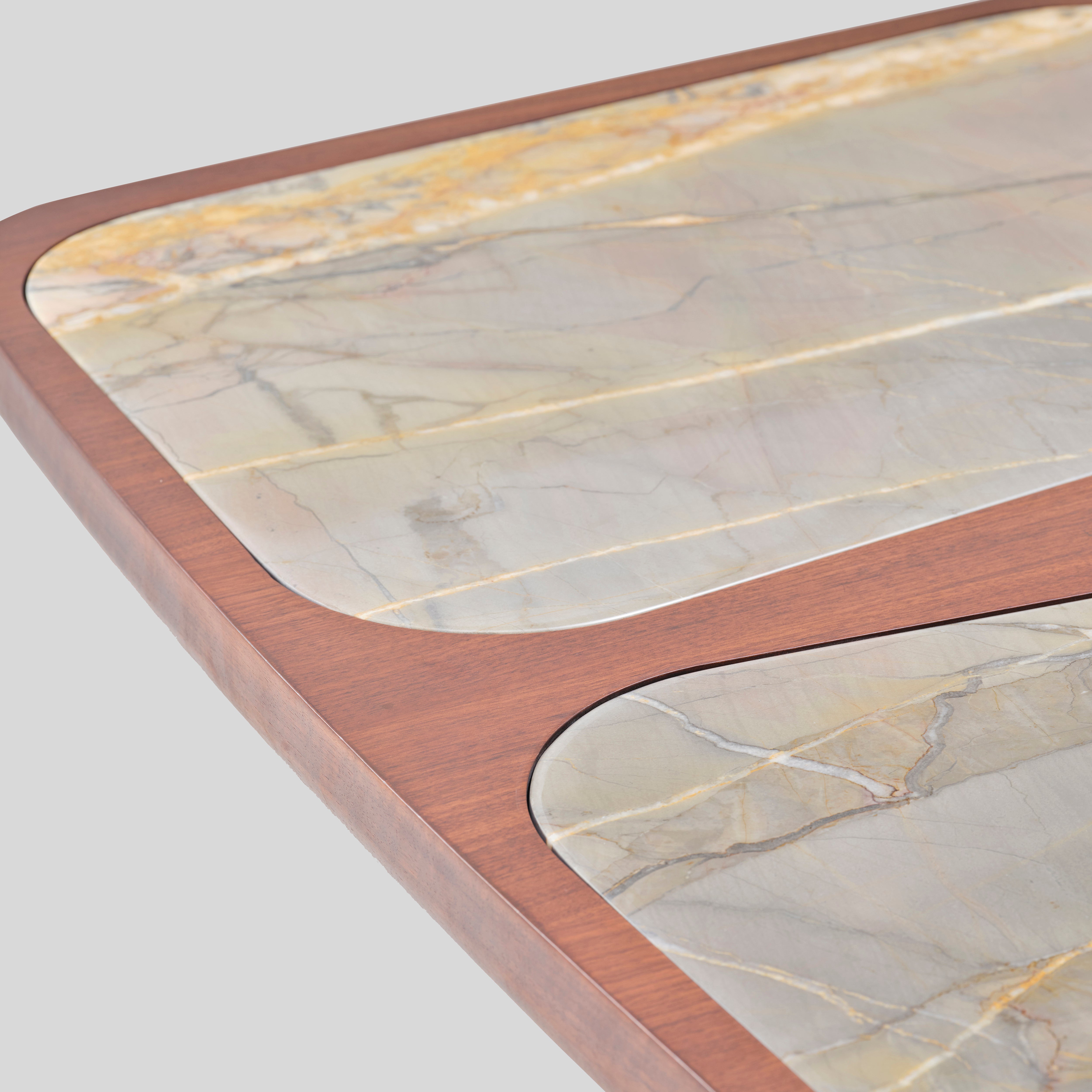 - Table Top in wooden frame with inset stone panels, Twin pedestal bases in leather accented with thread and wood trim details