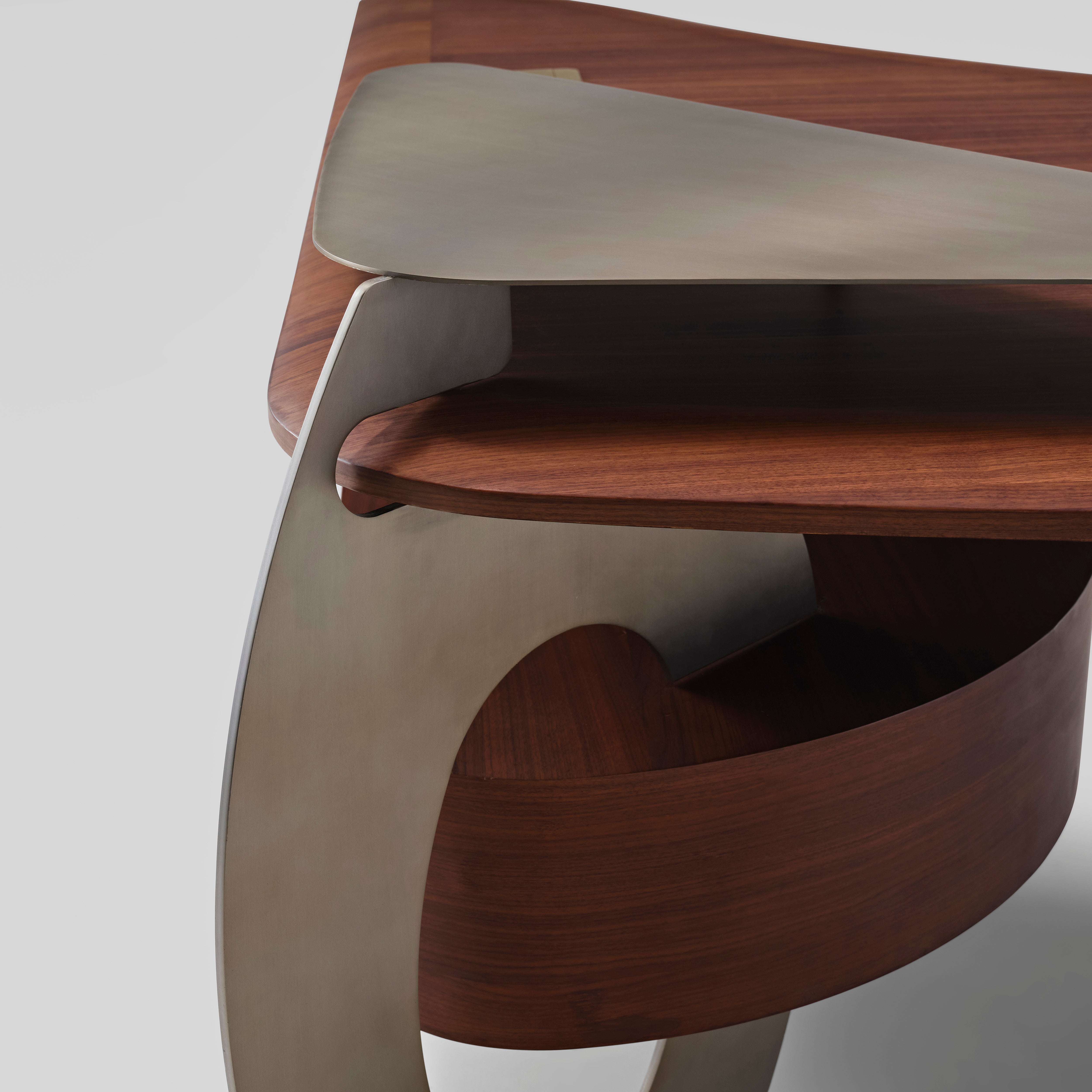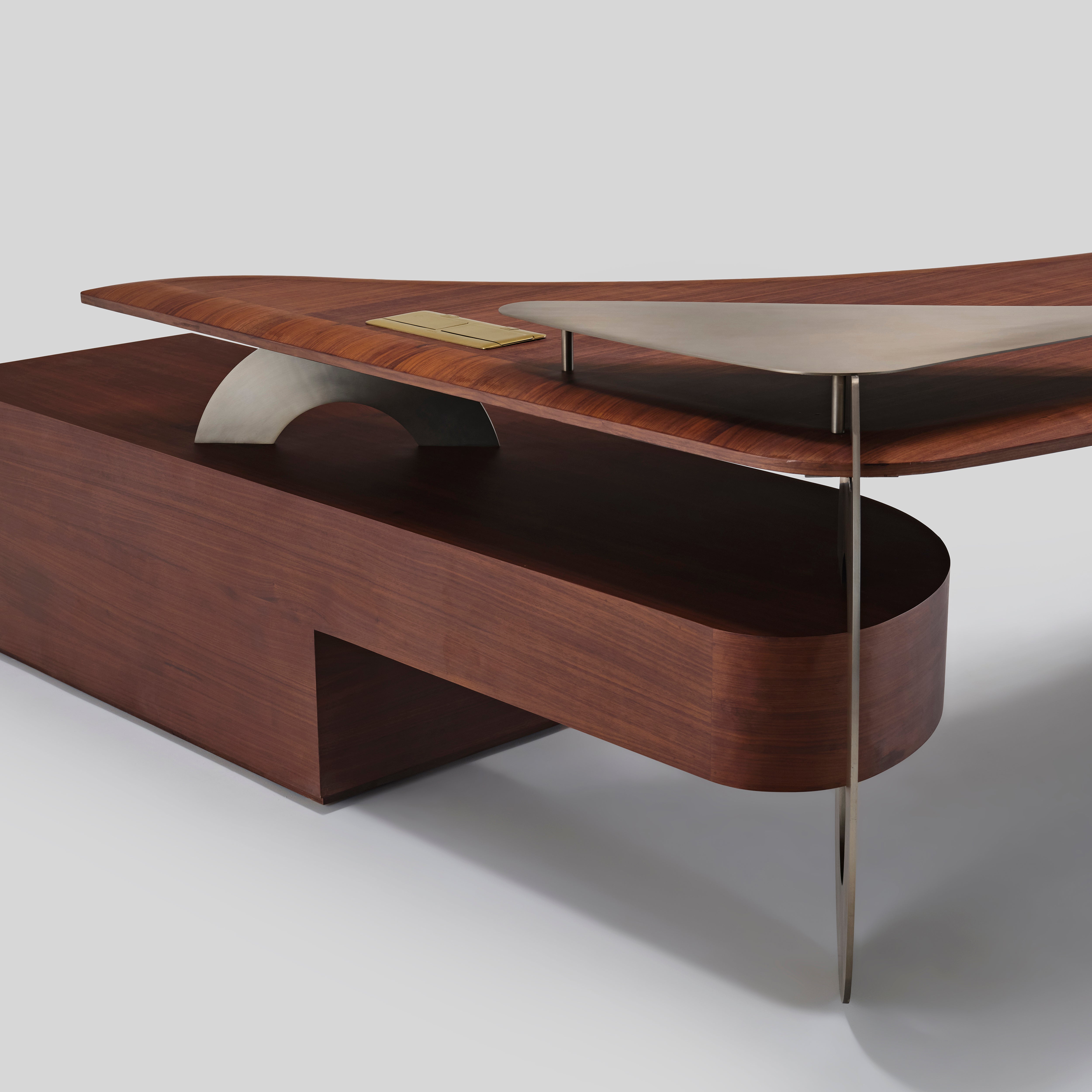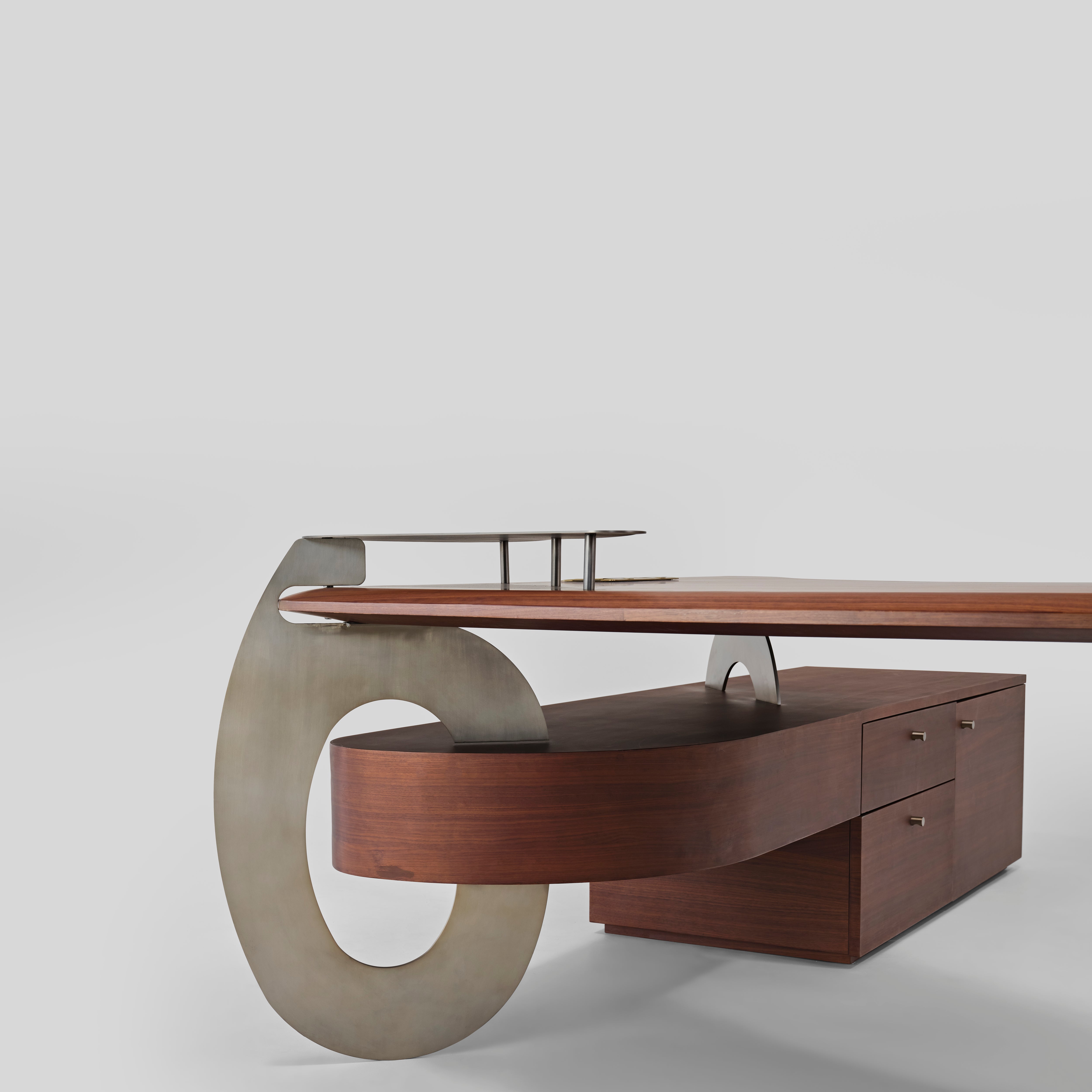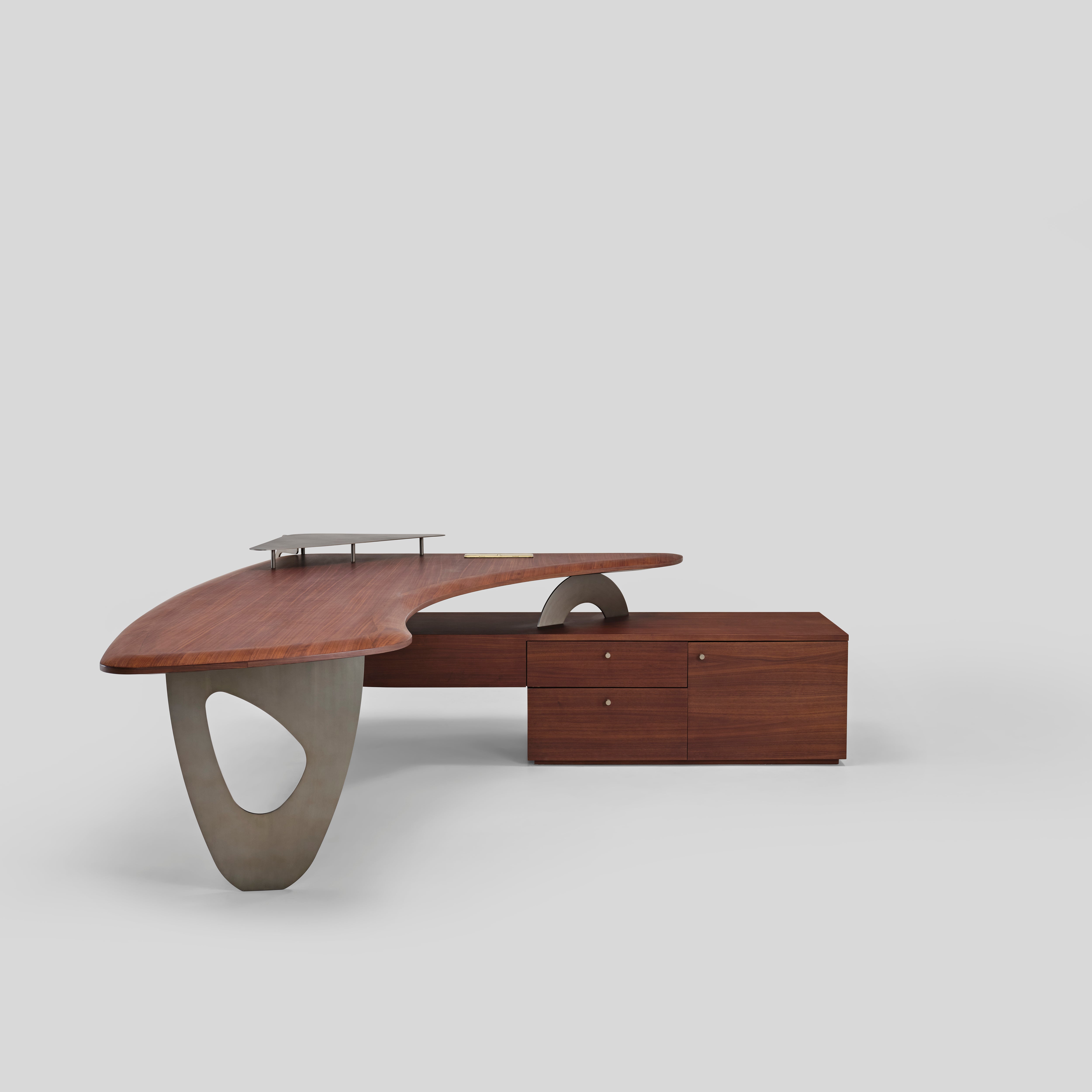 • Organic shaped top in wood/veneer with metal accents , side credenza in wood/veneer, sculpted leg in metal