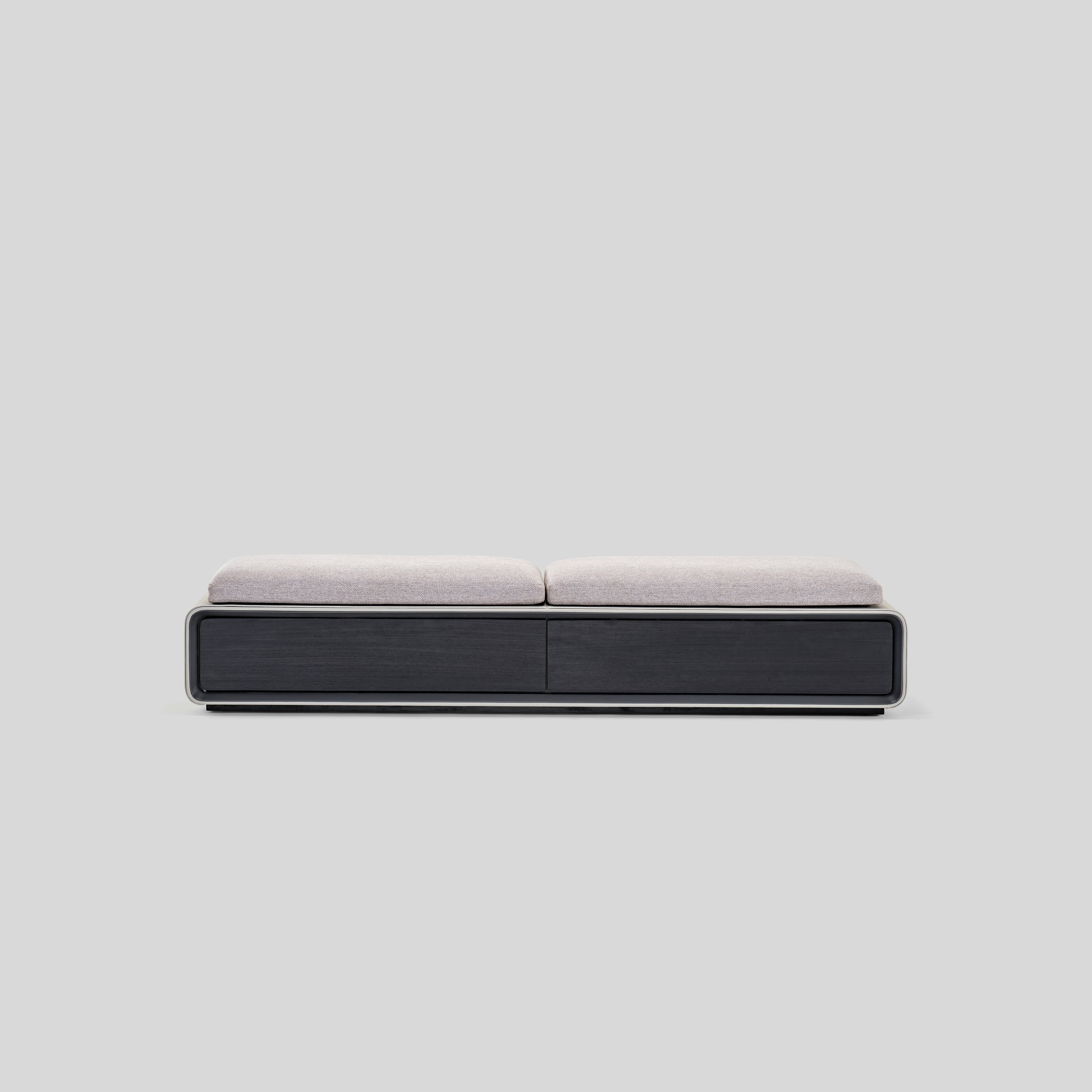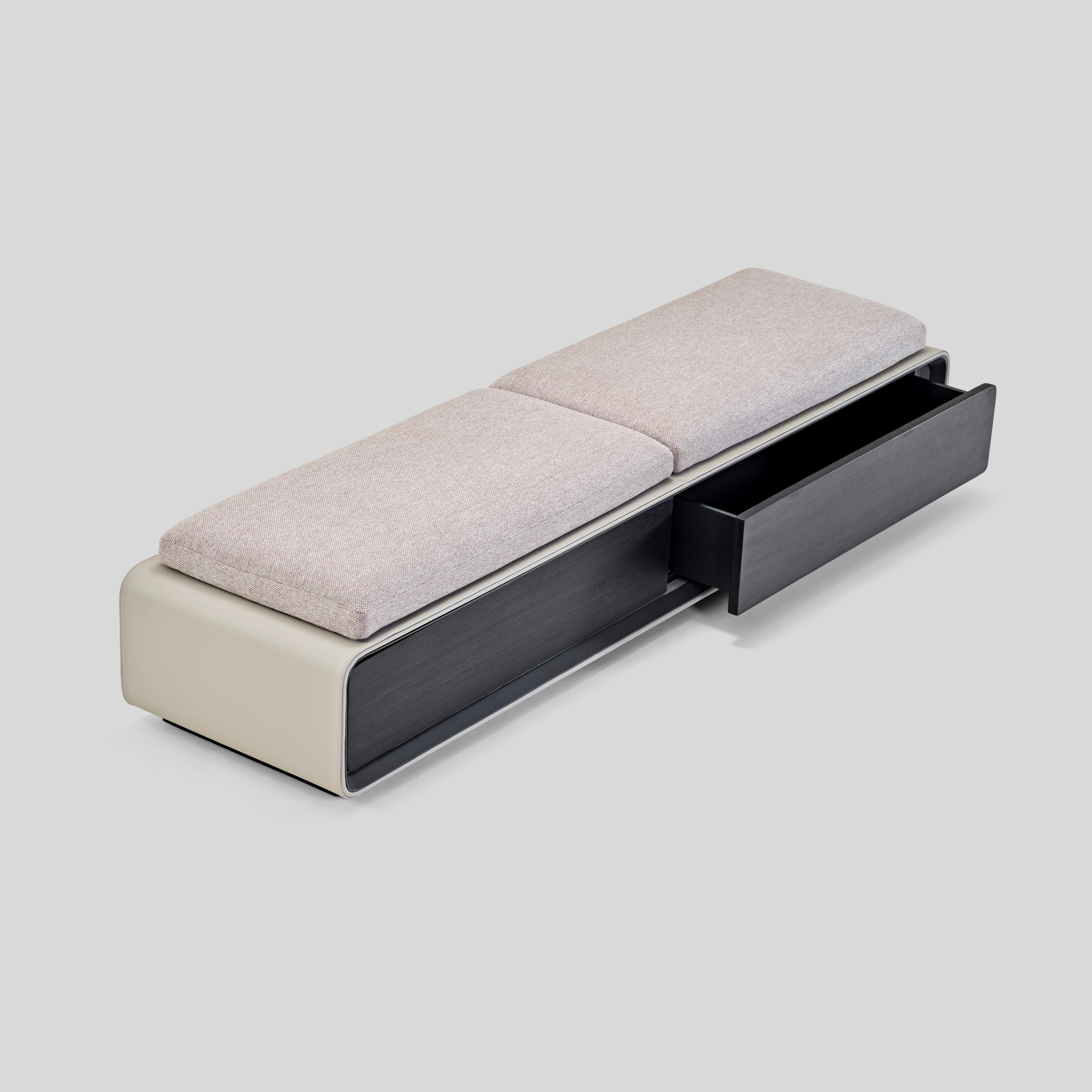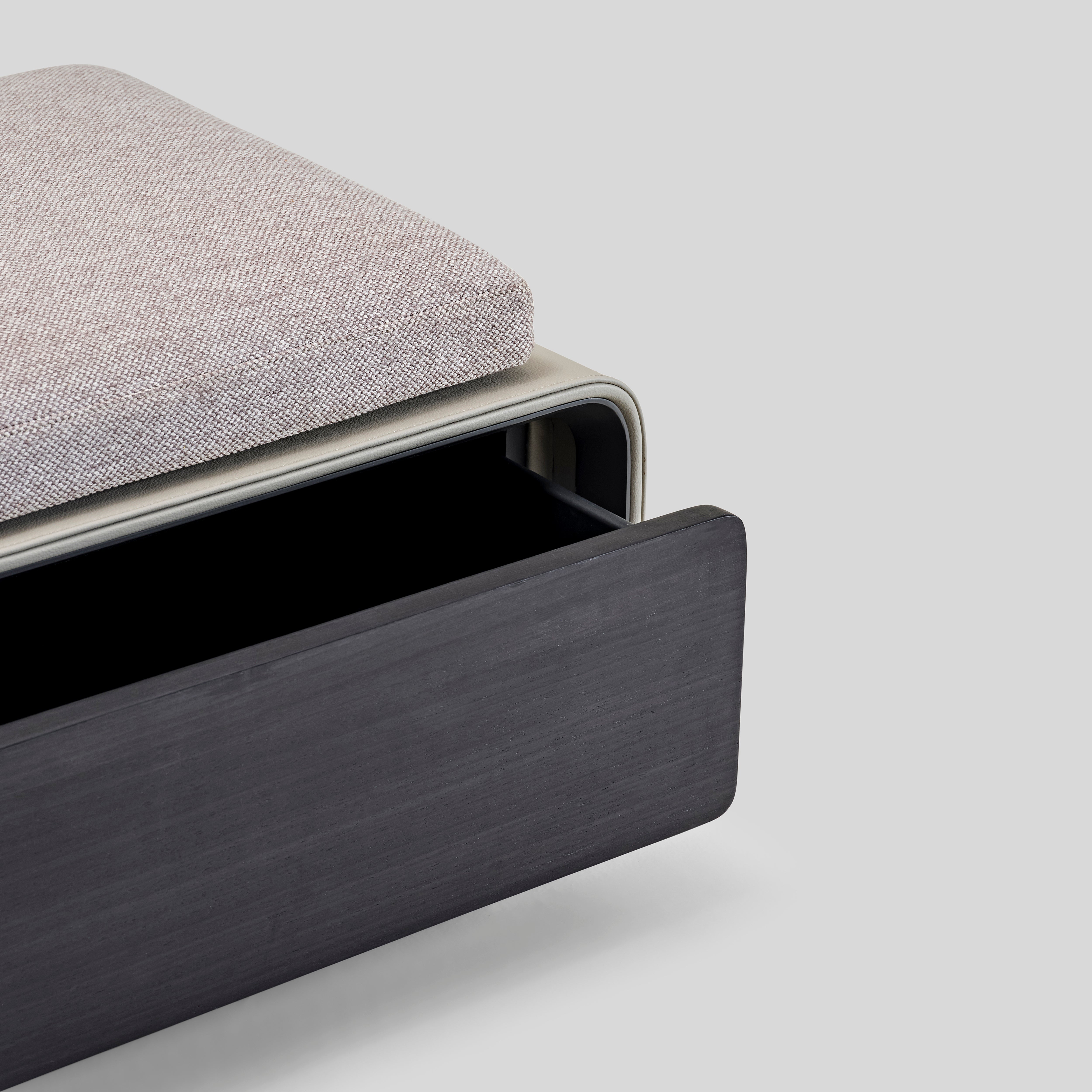 Nicola blends refined form with thoughtful utility, pairing its dual cushions with a smoothly integrated drawer for everyday essentials. The rounded frame keeps the piece visually light, while its practical ease adds a quiet charm that suits bedrooms, dressing areas or relaxed lounge.
