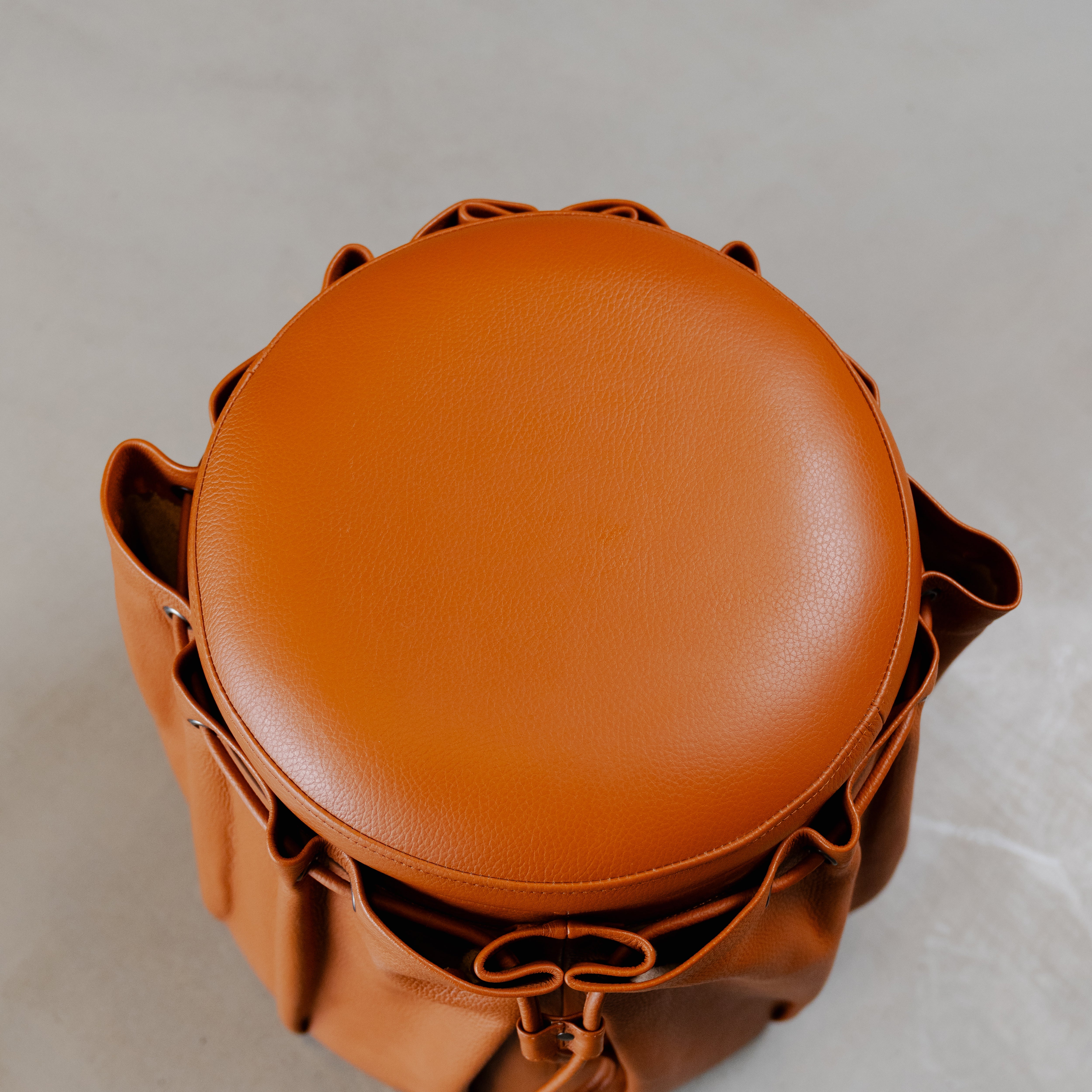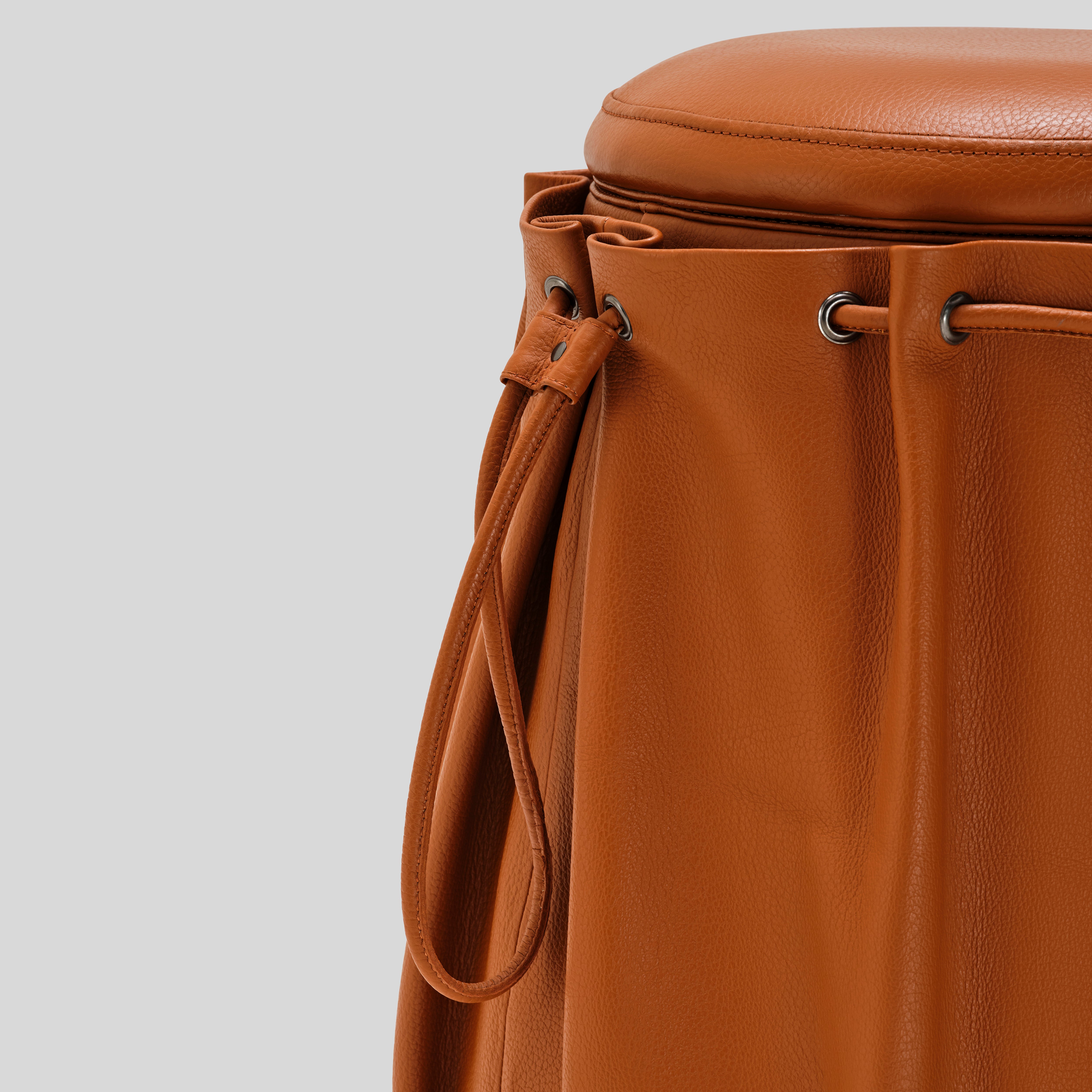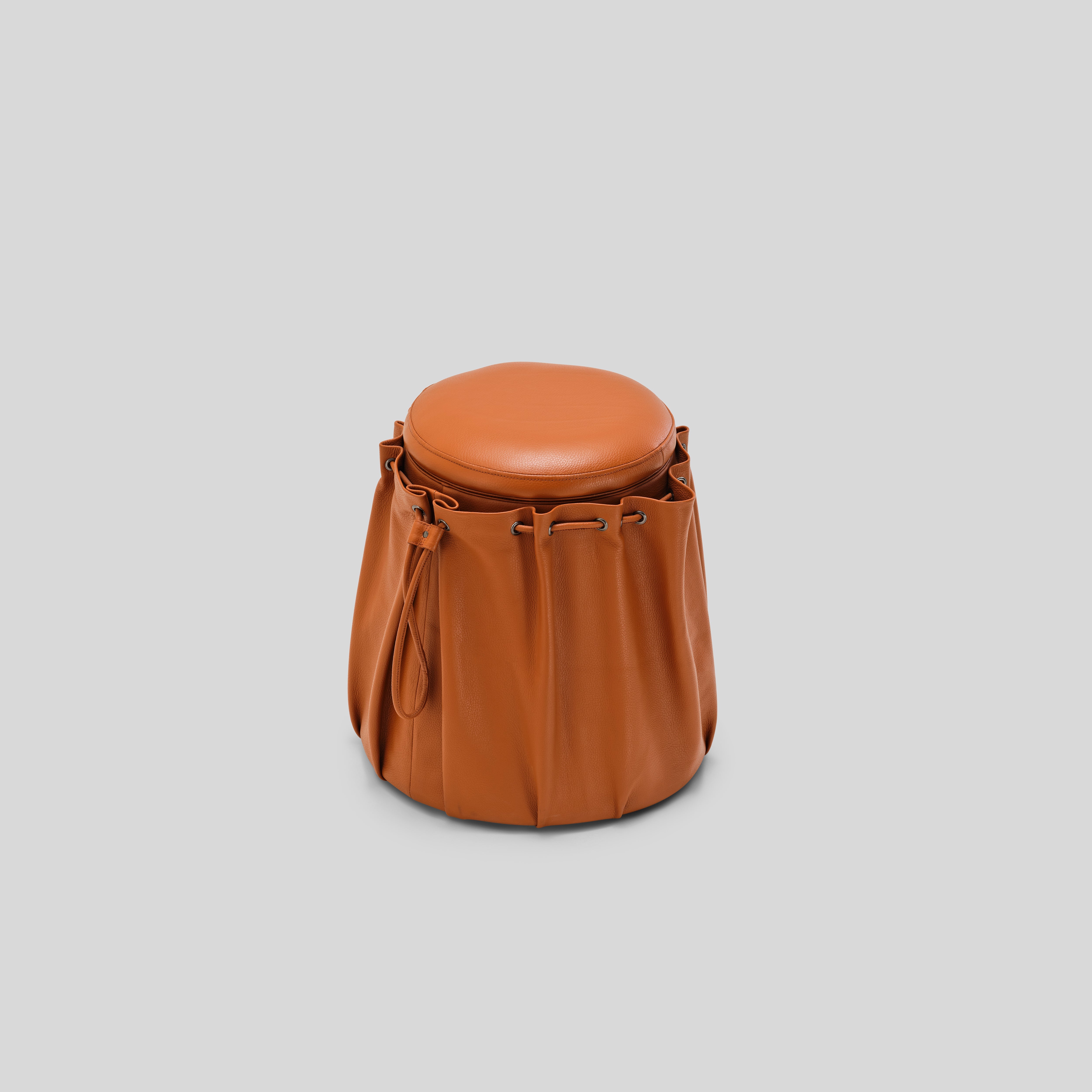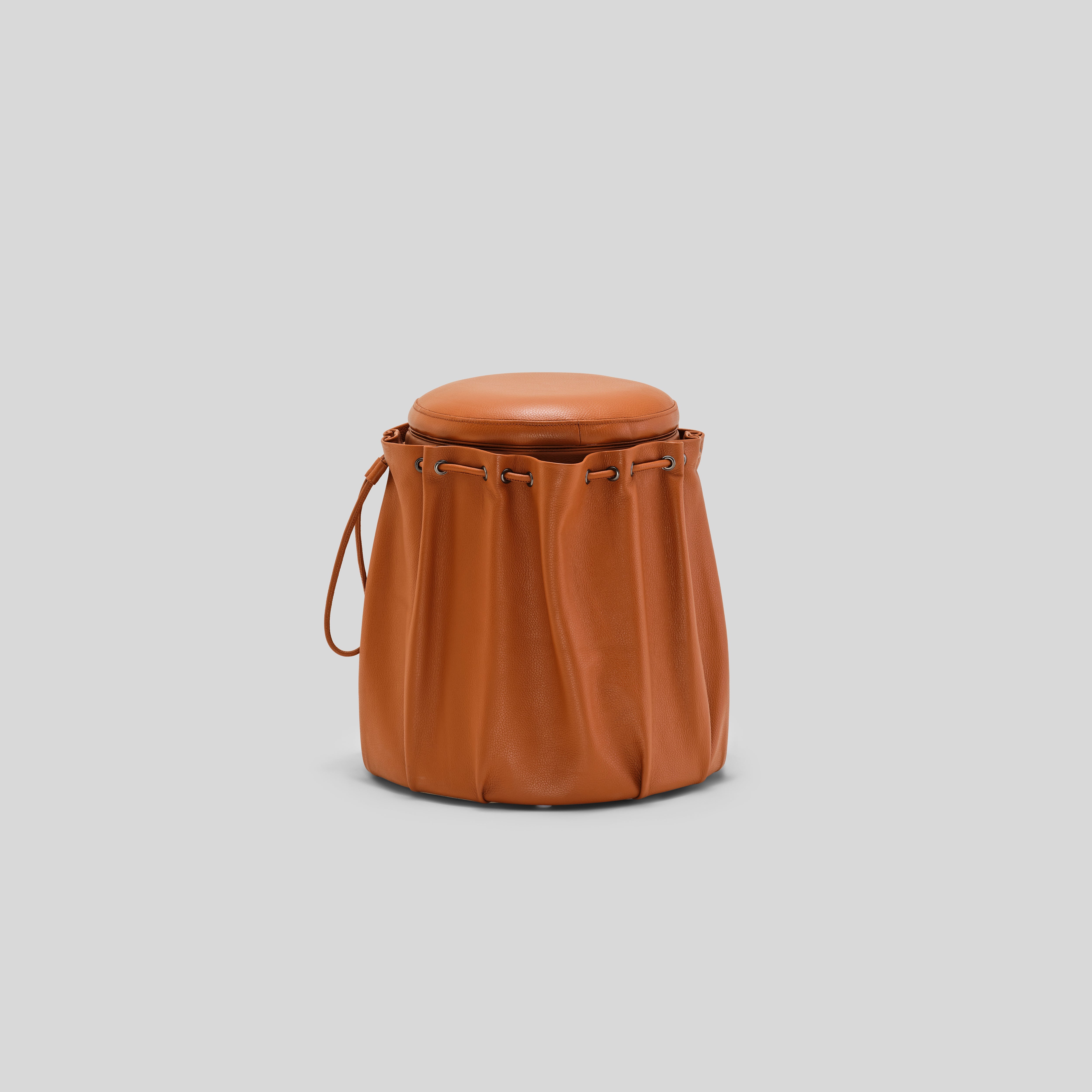 - full body in genuine leather, cinched around the sides with a subtle drawstring detail