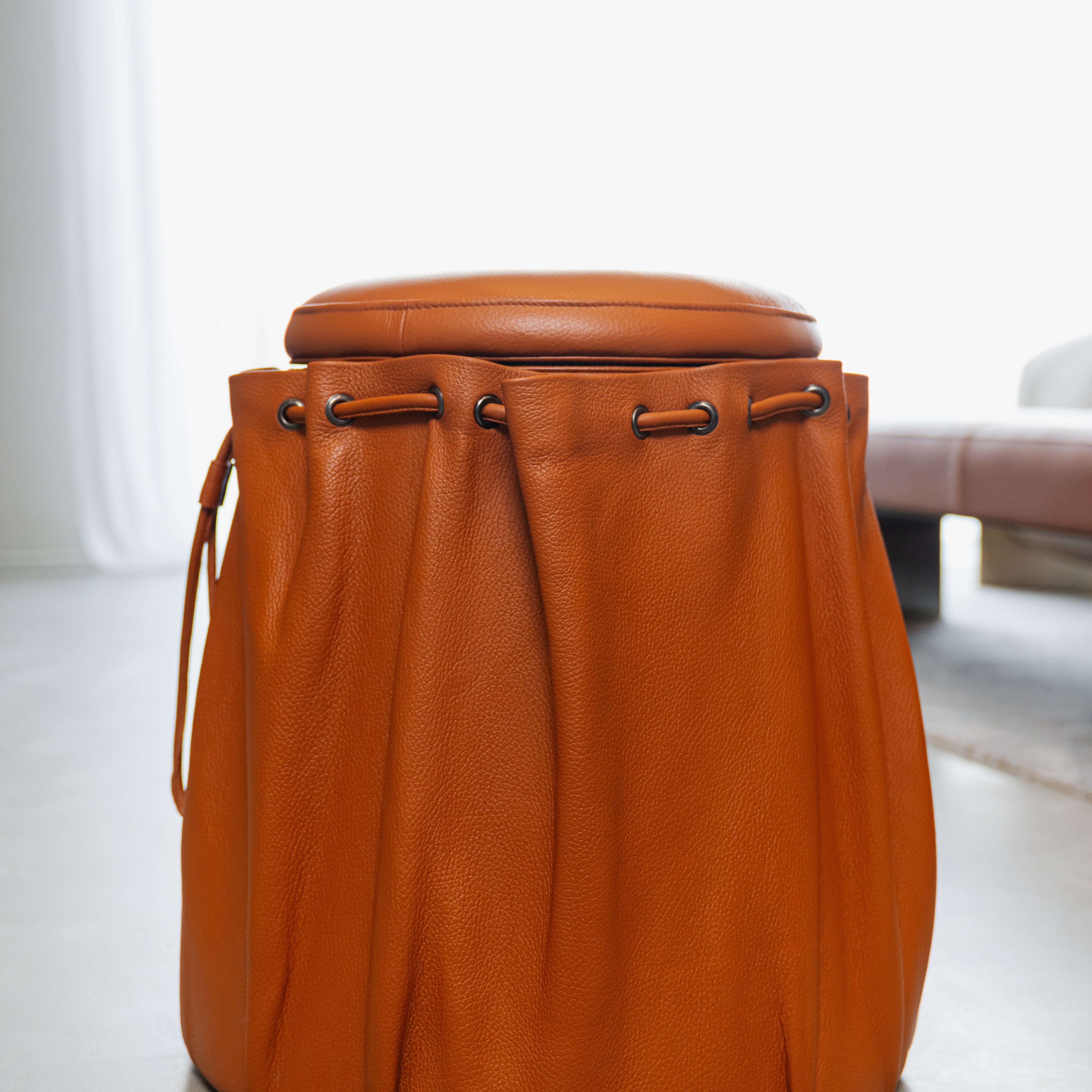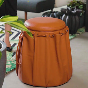 A contemporary casual attitude meets couture flair, giving the pouf a fashion-forward ease. It channels the spirit of an oversized bucket bag reimagined as seating, blending home comfort with handbag chic for a look that feels playful, polished, and effortlessly stylish.