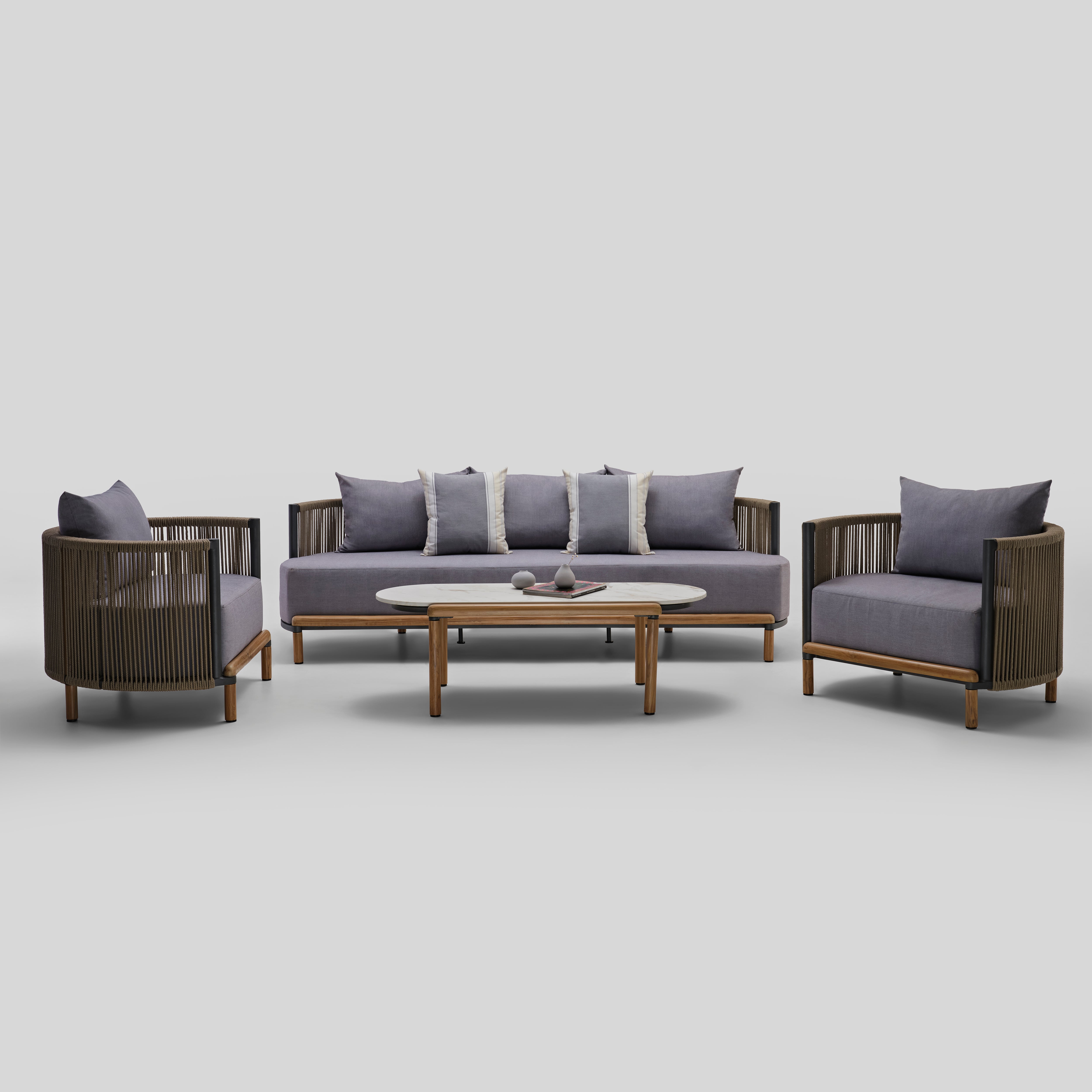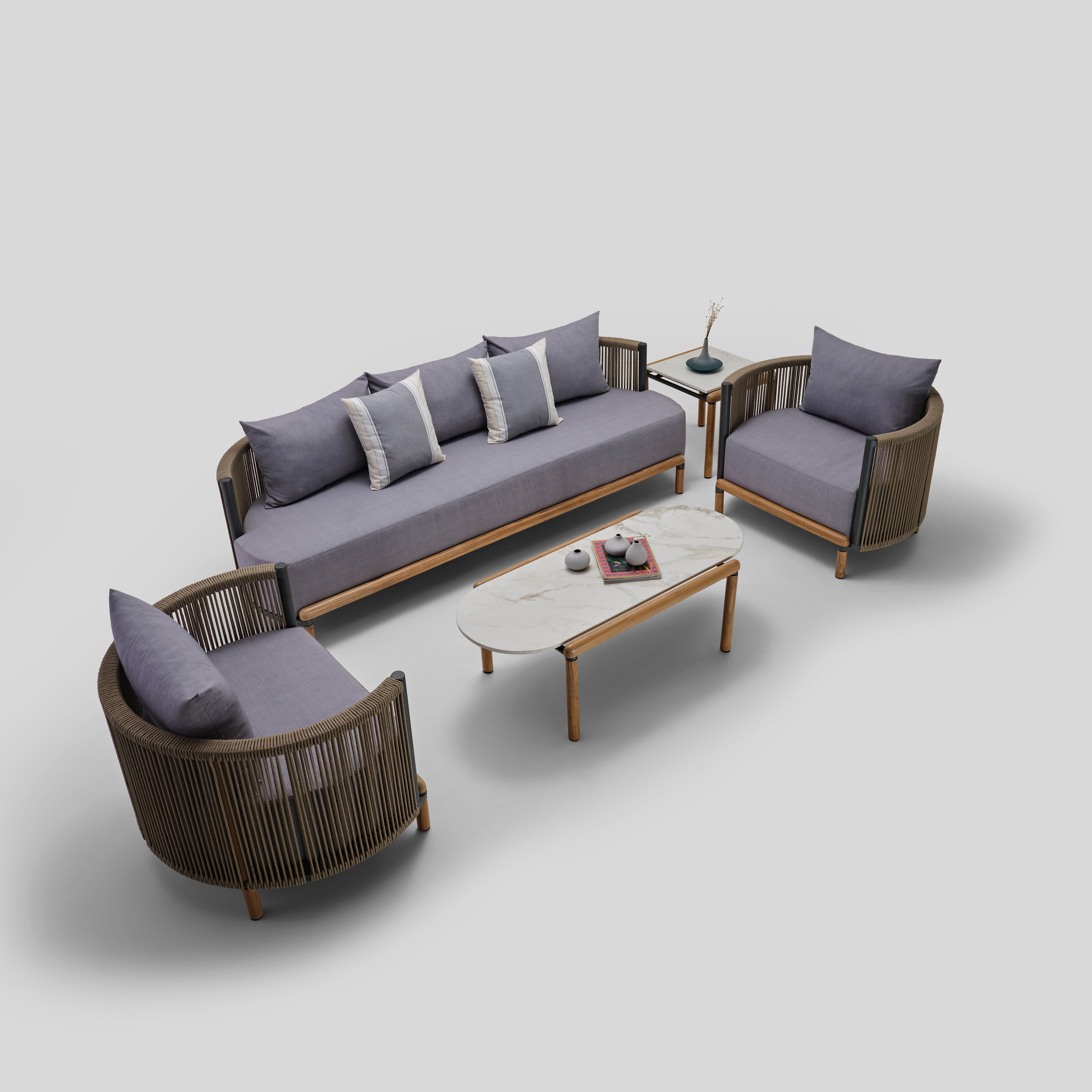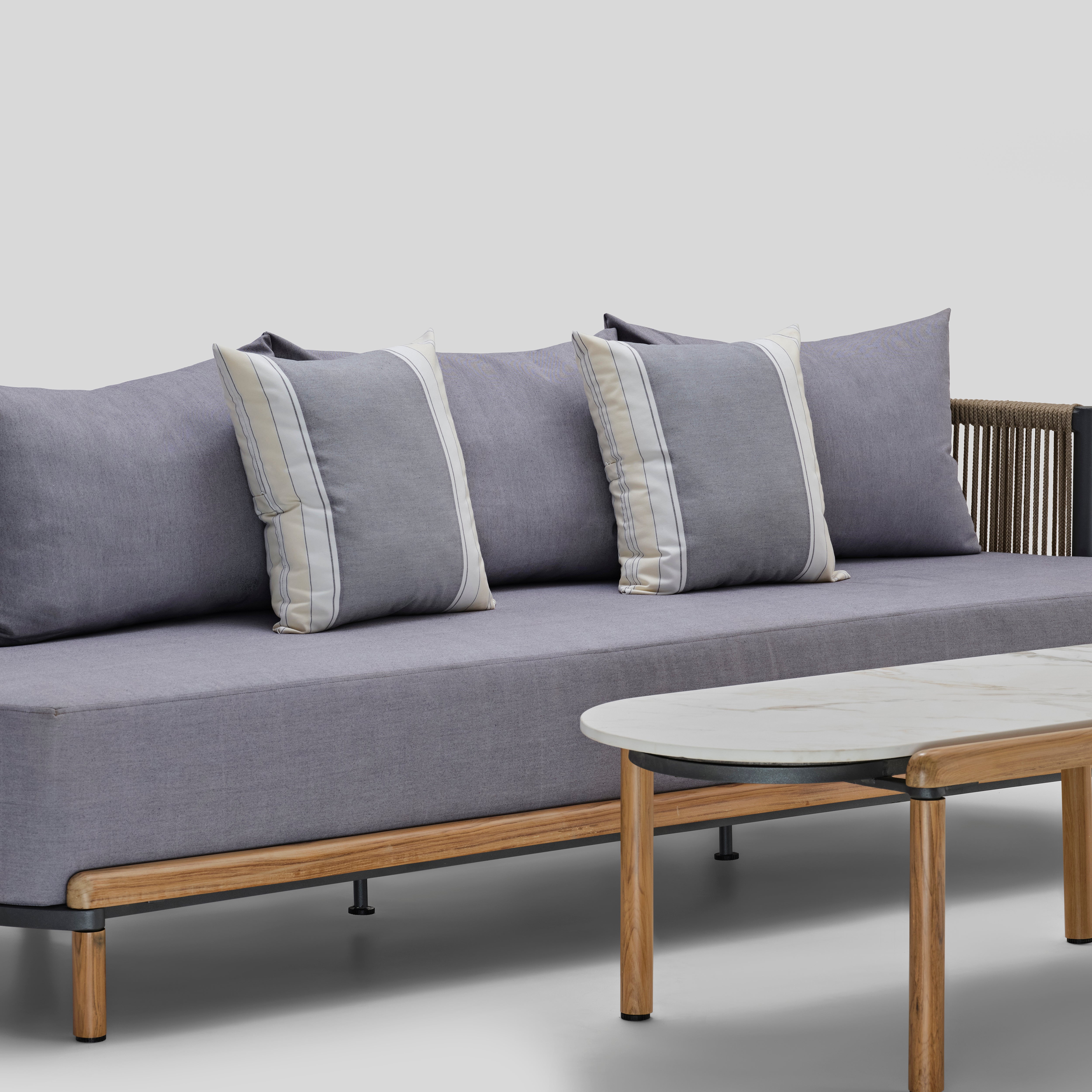 Level outdoor ensemble brings a serene, contemporary ease, its clean lines and wrapped detailing offering an inviting rhythm. The generous seating feels composed yet relaxed, perfect for slow conversations and unhurried afternoons. A setting that understands good company and quietly elevates it.