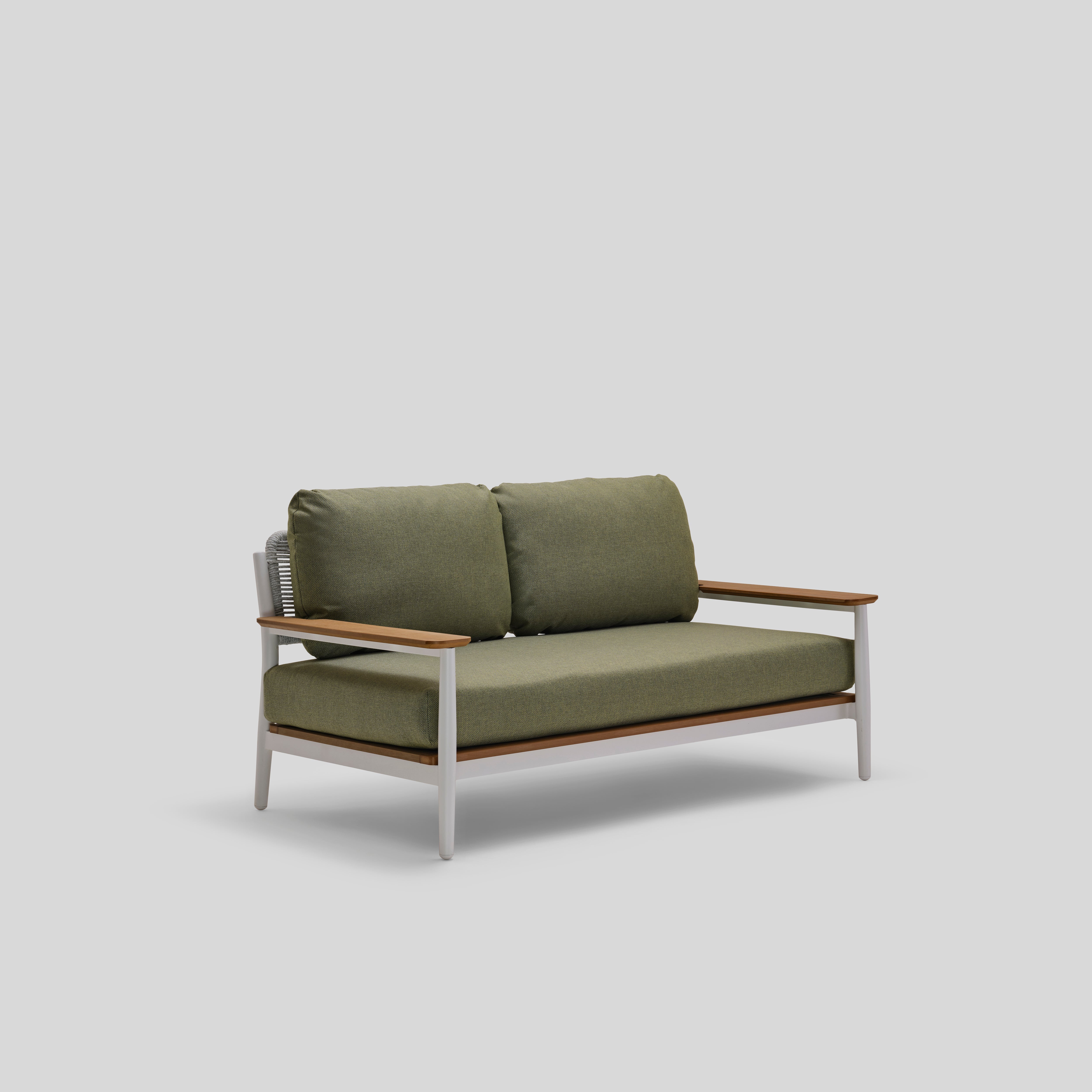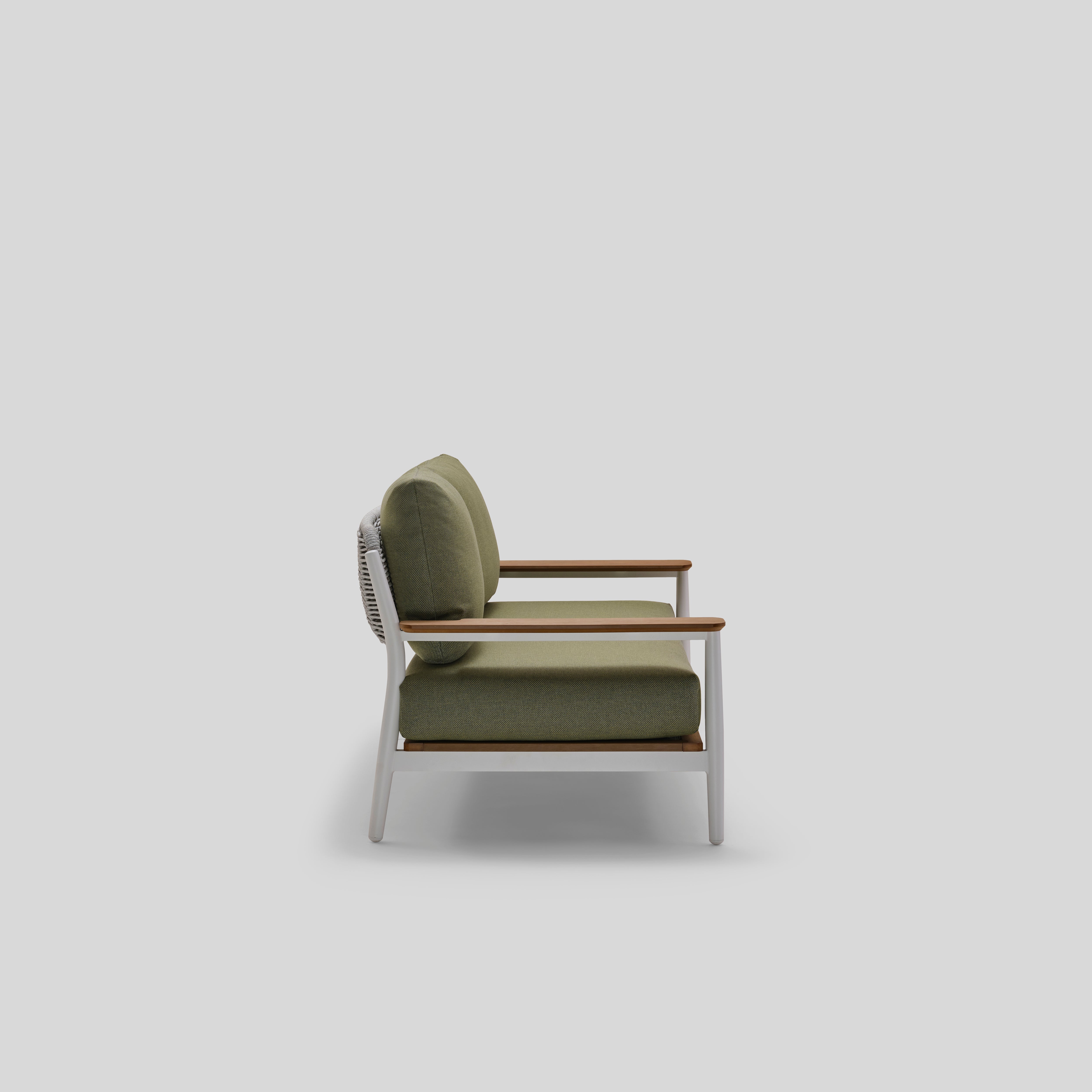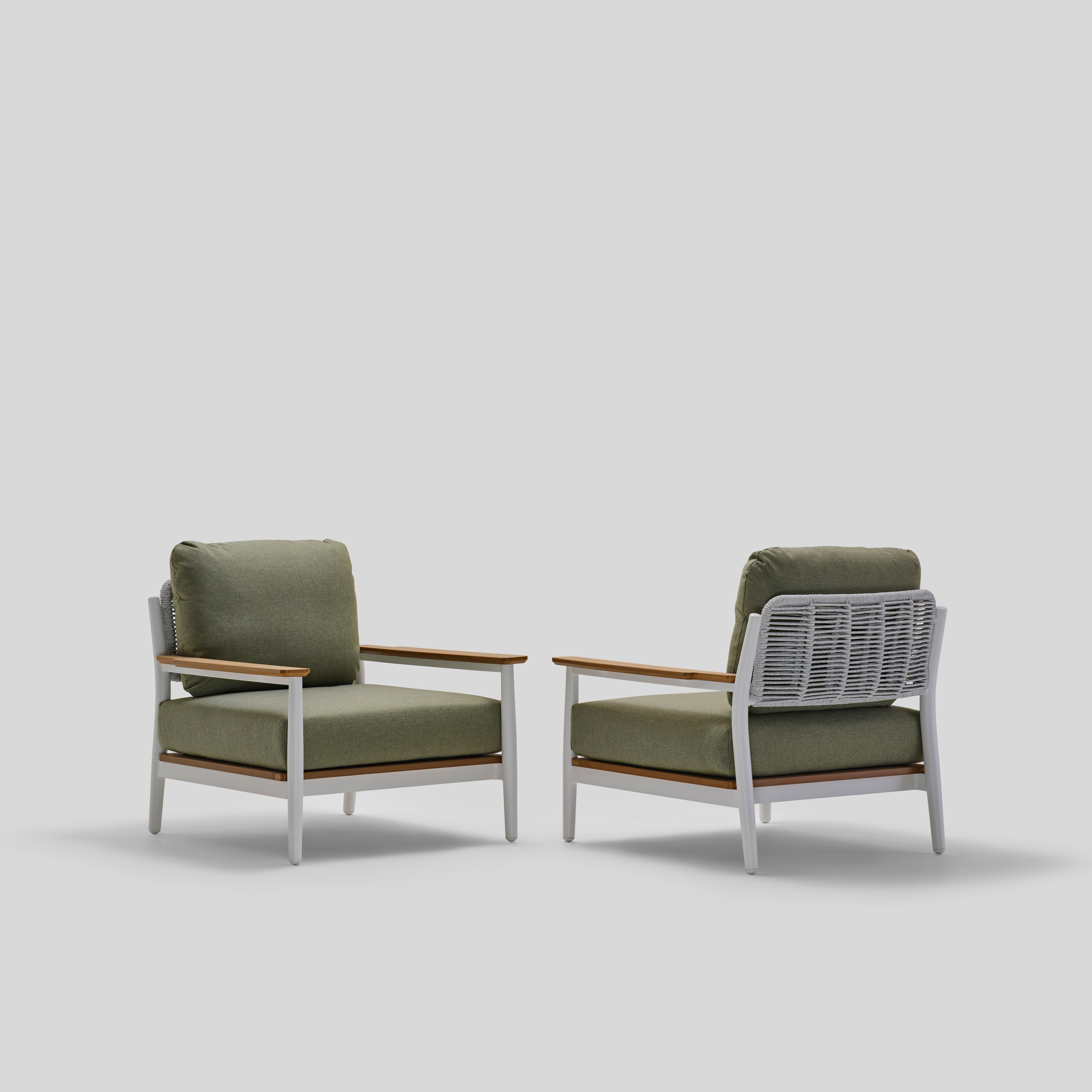 An inviting outdoor setting with a calm, tailored presence. The crisp frame, subtle rope detailing, and warm wooden accents create an easy sophistication. Comfortable, structured cushions make it ideal for slow mornings, open-air conversations, and everyday moments that deserve a little quiet refinement.