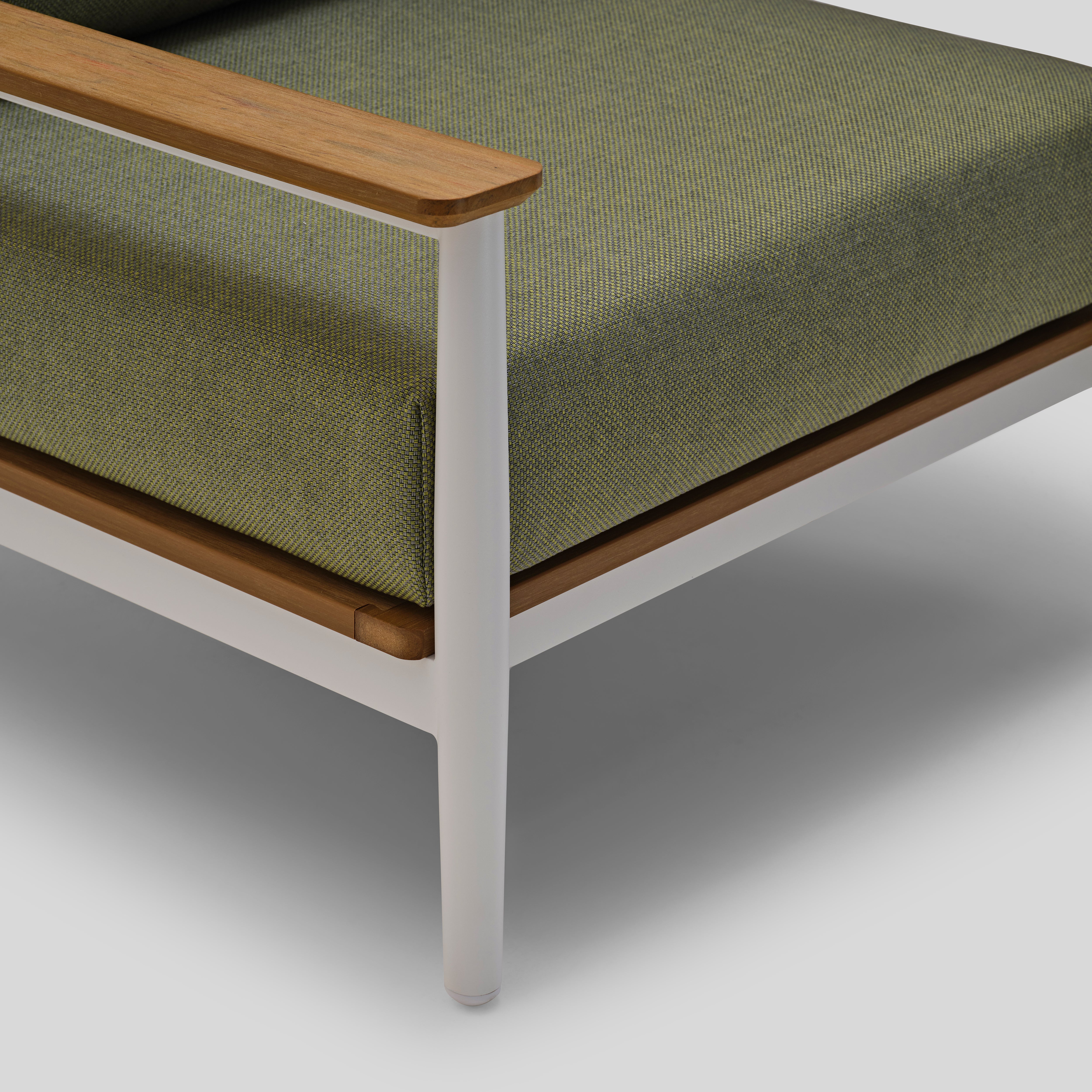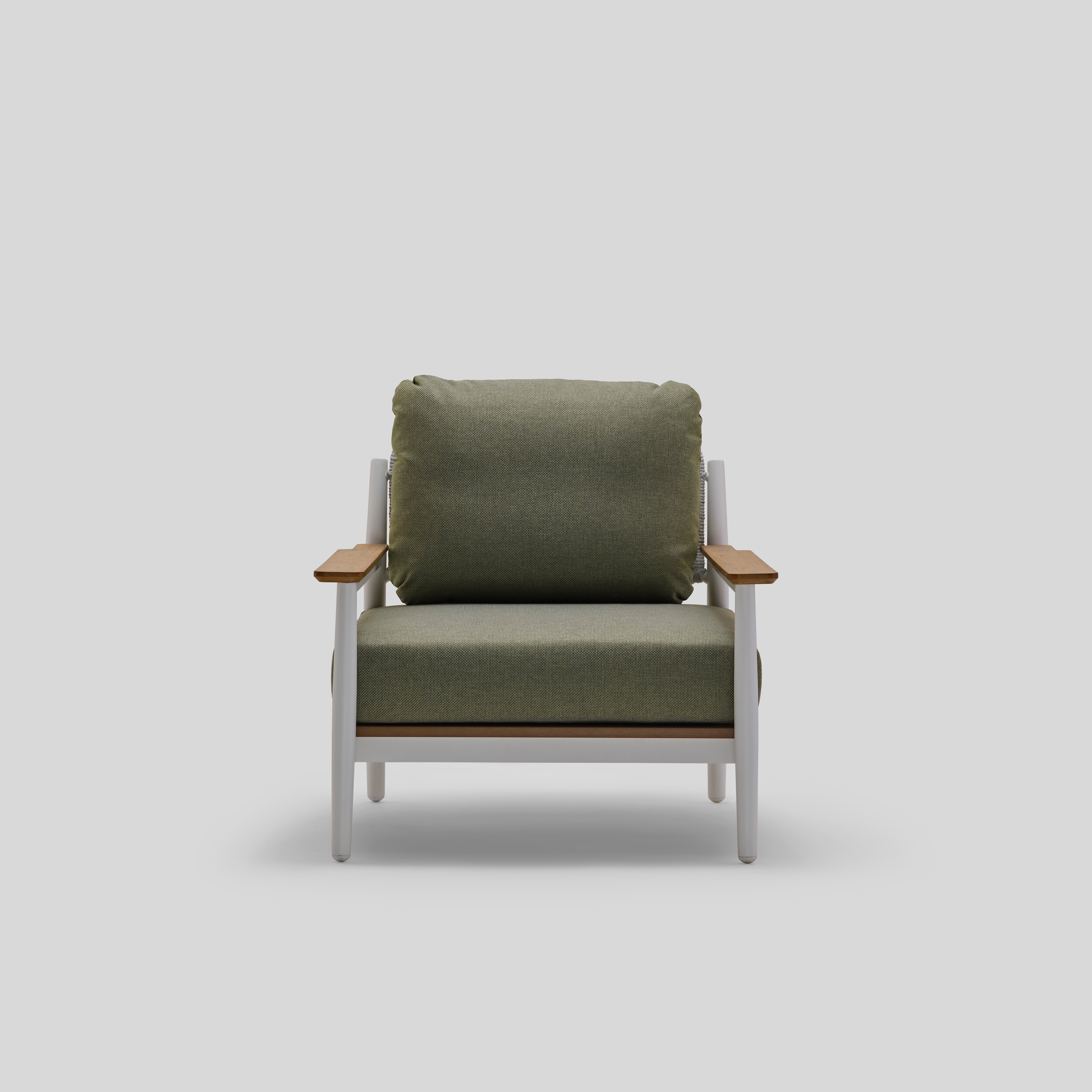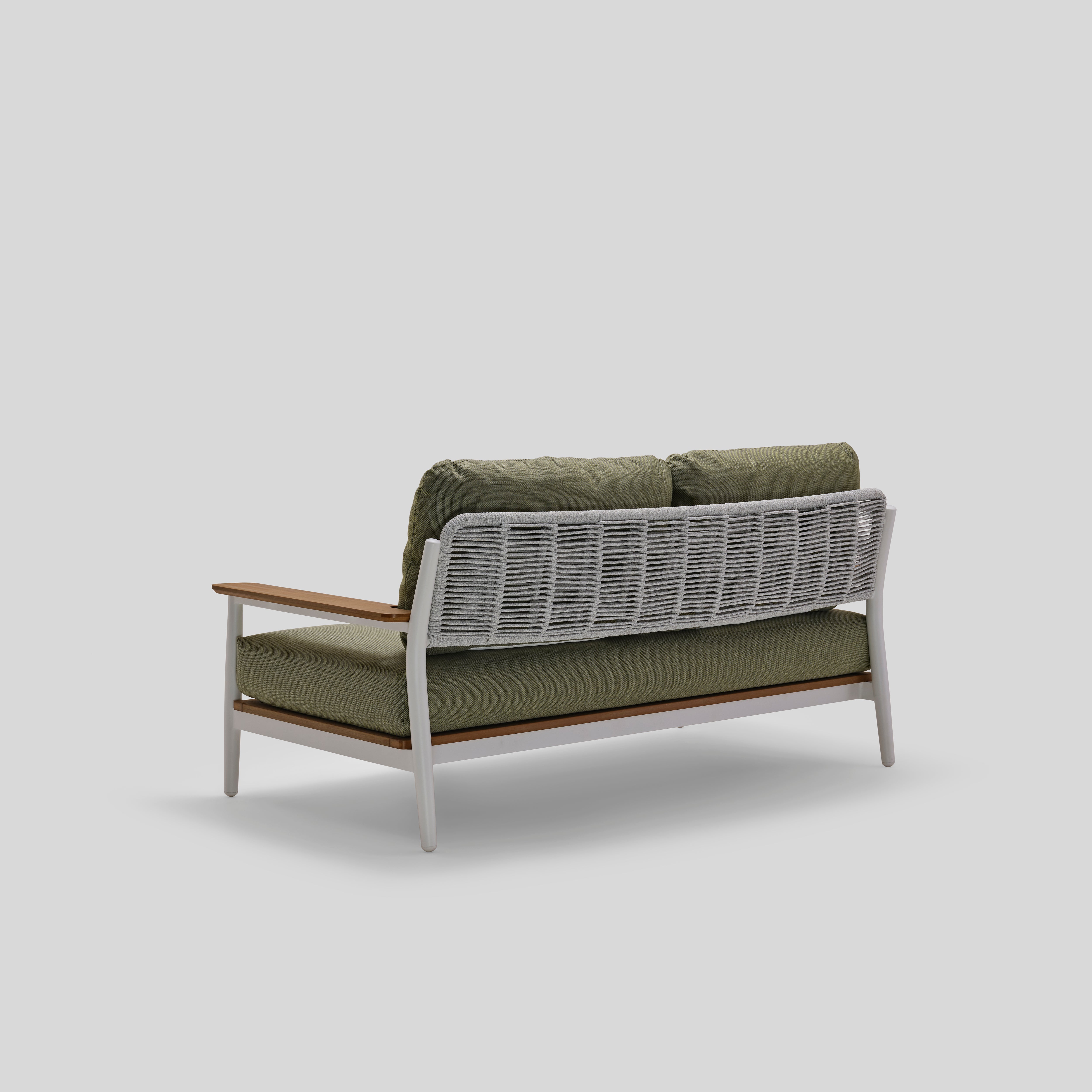 An inviting outdoor setting with a calm, tailored presence. The crisp frame, subtle rope detailing, and warm wooden accents create an easy sophistication. Comfortable, structured cushions make it ideal for slow mornings, open-air conversations, and everyday moments that deserve a little quiet refinement.
