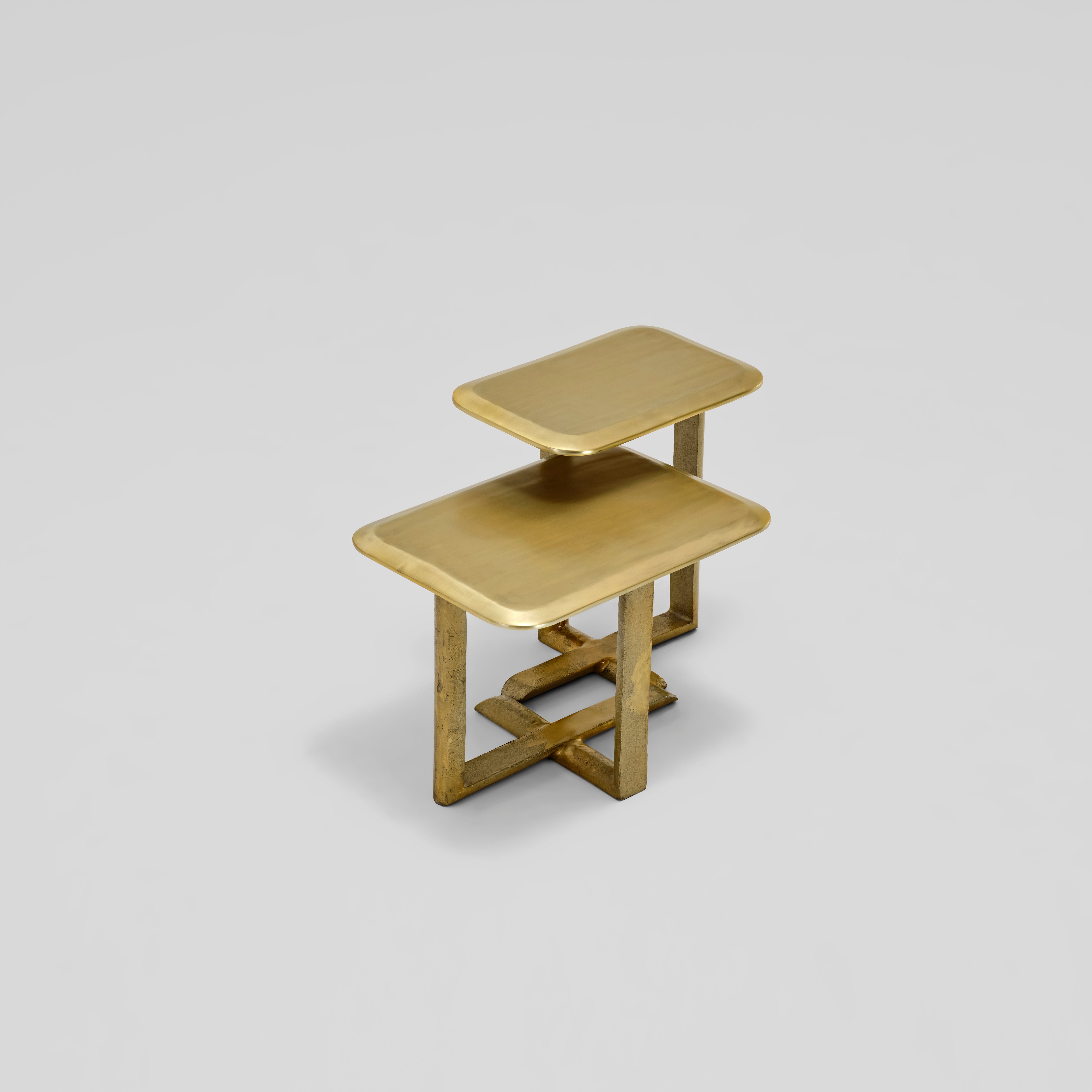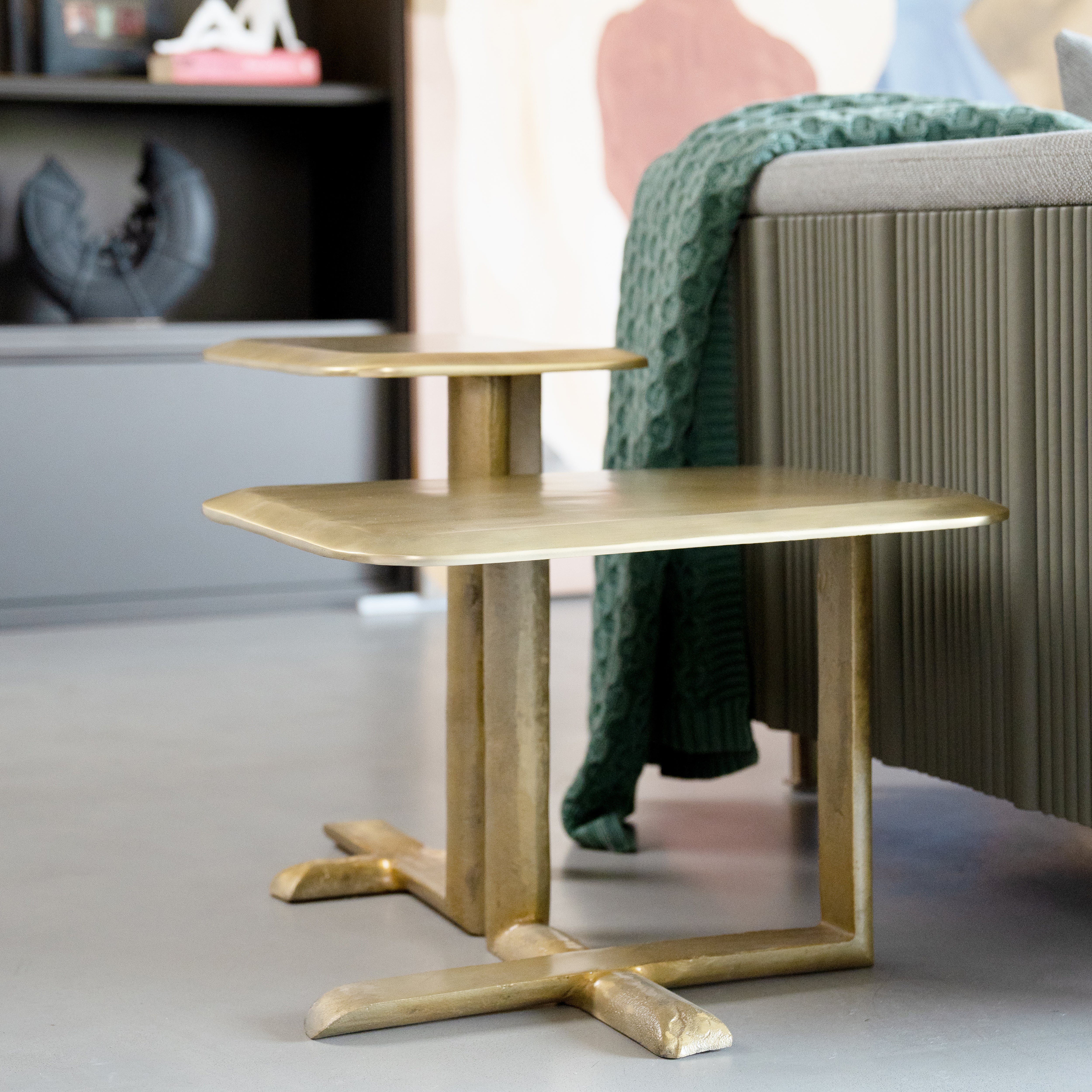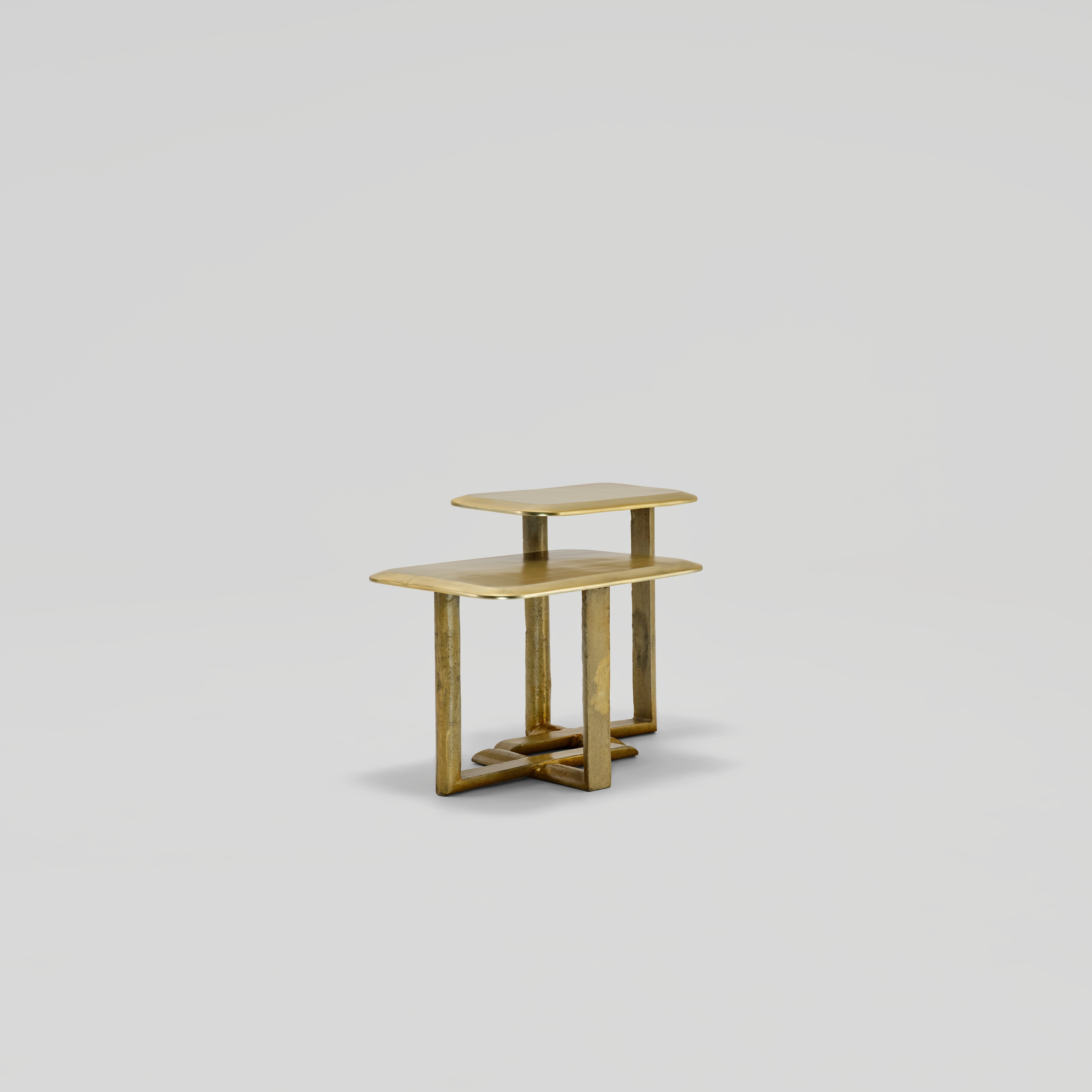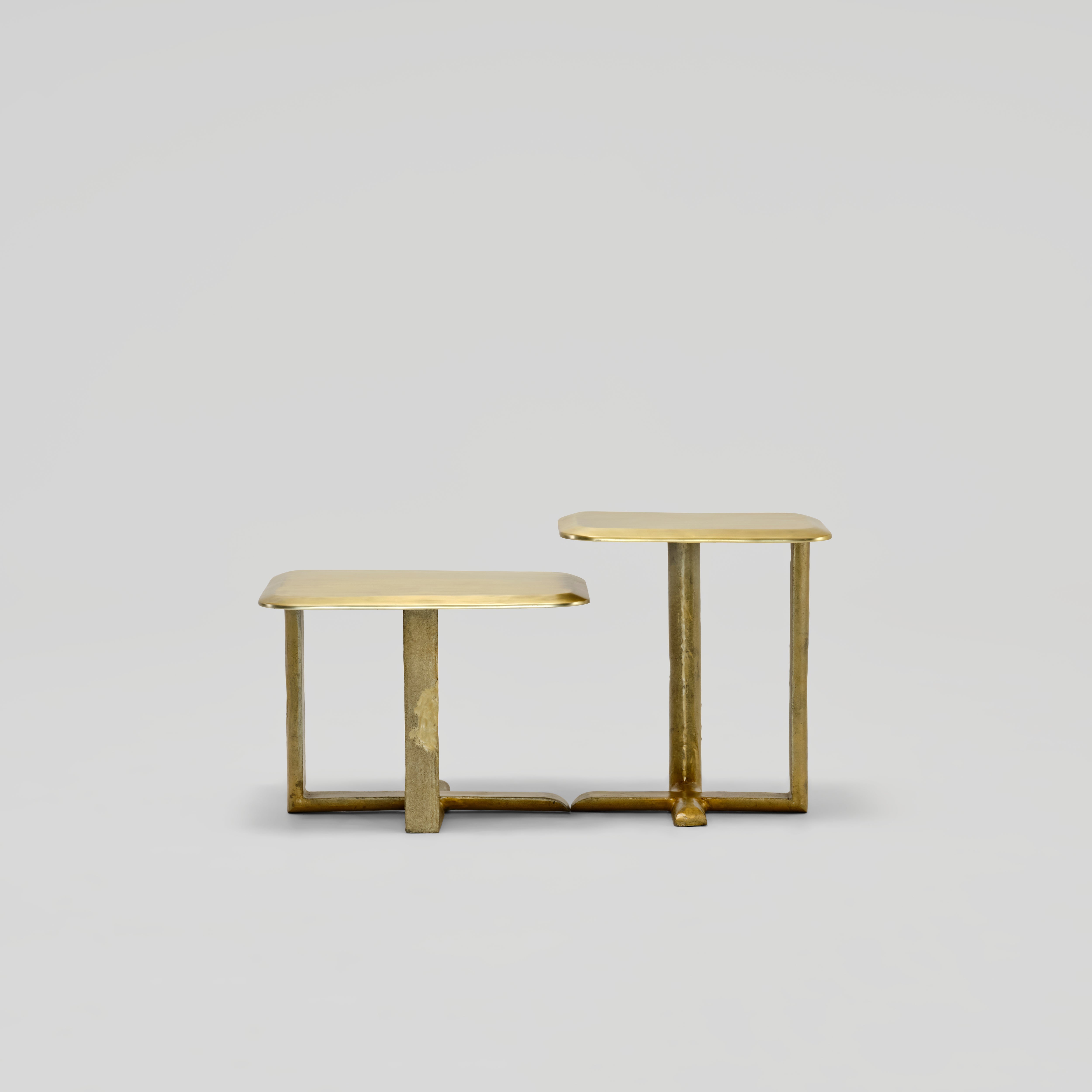 Template brings a refined interplay of levels, with crisp metal planes resting on hand-textured legs. The stepped form adds a gentle sense of movement, making it an elegant companion to seating areas that appreciate subtle artistry and a quietly confident presence.