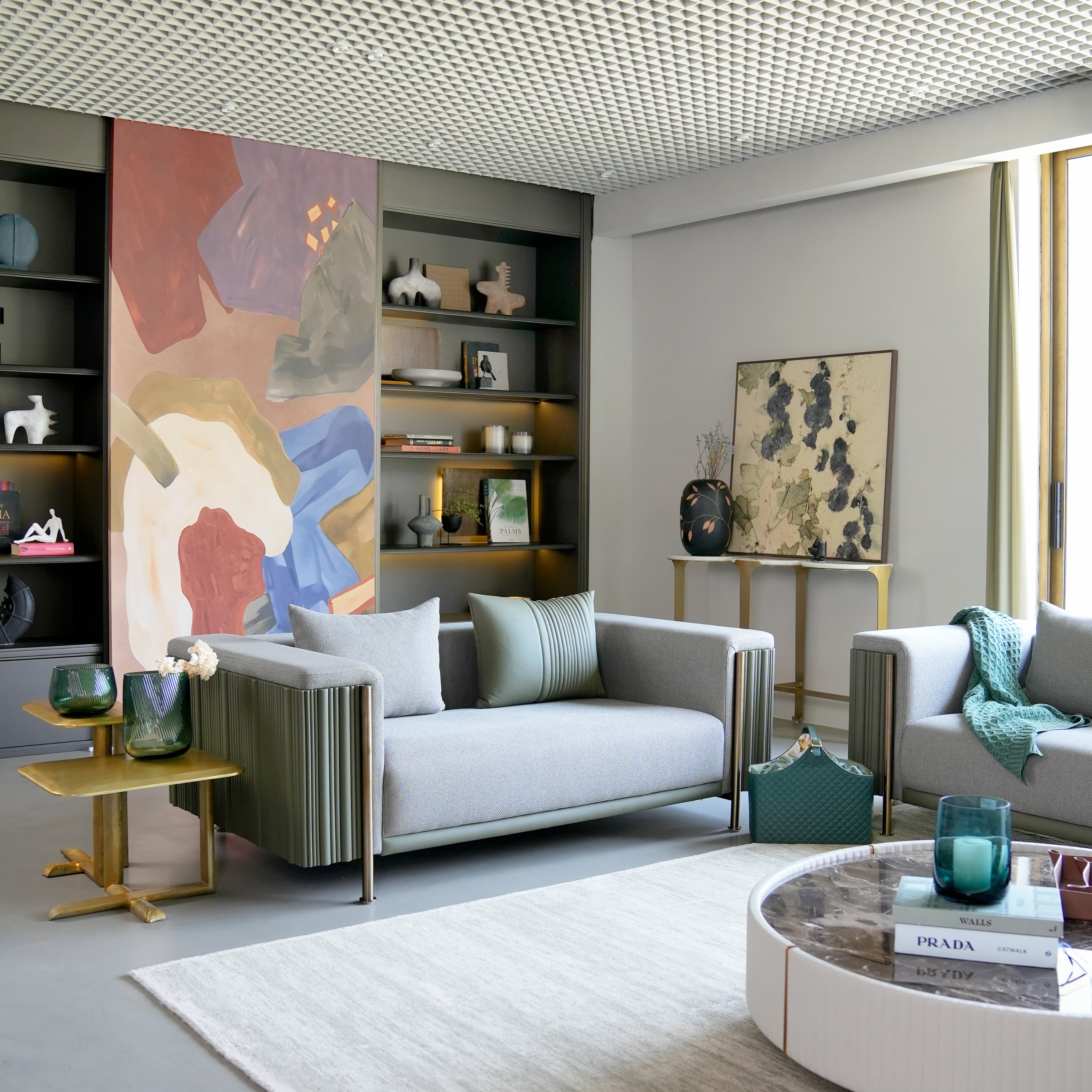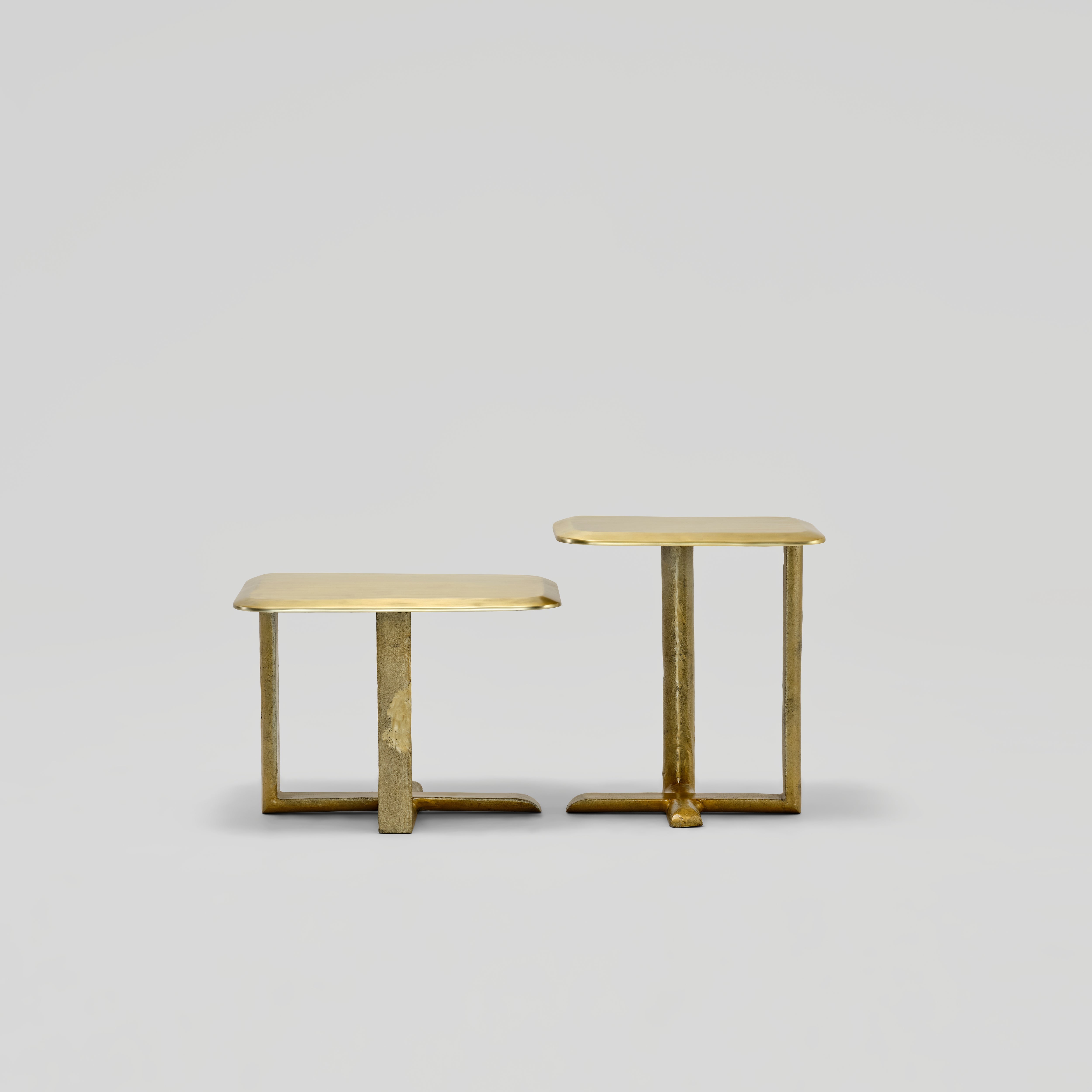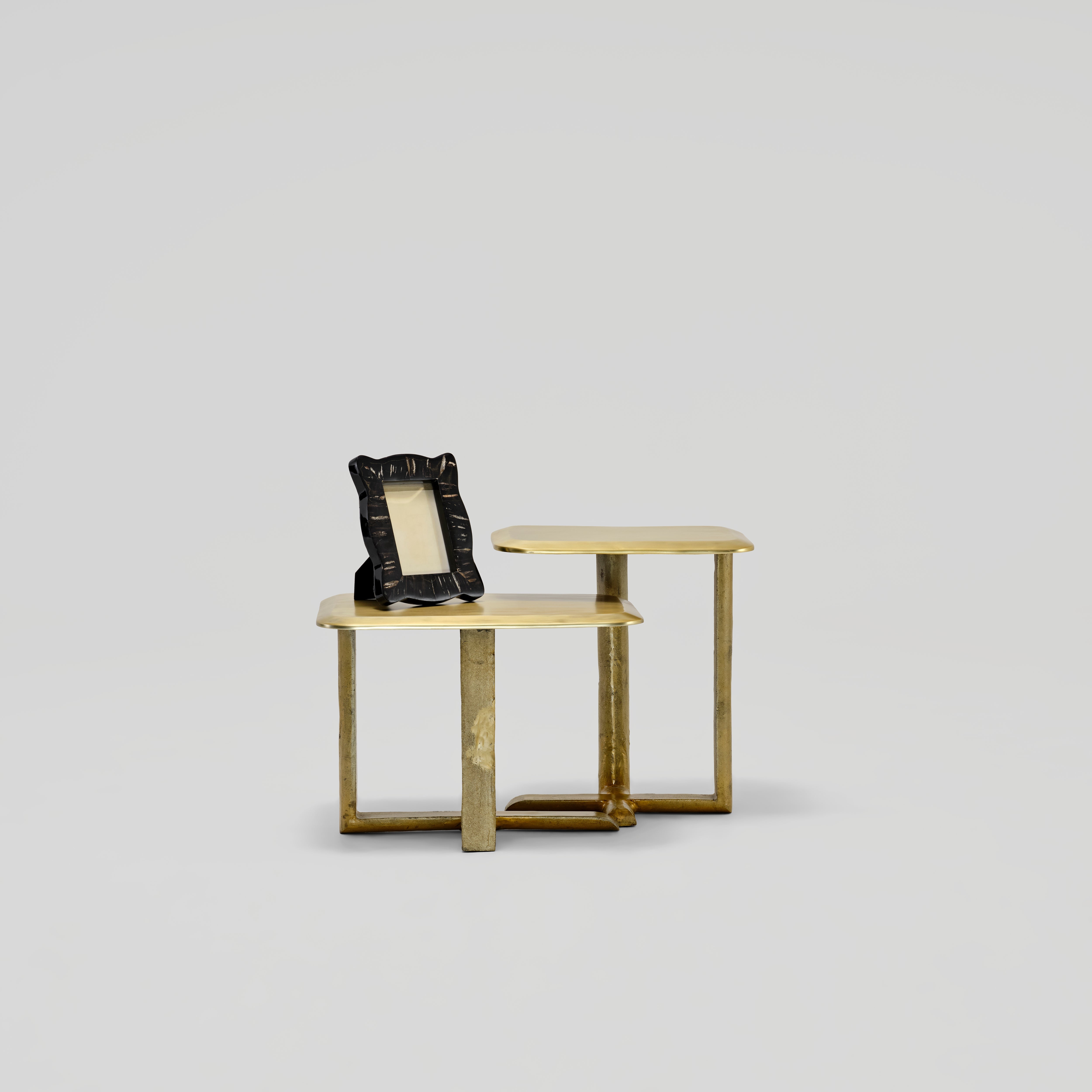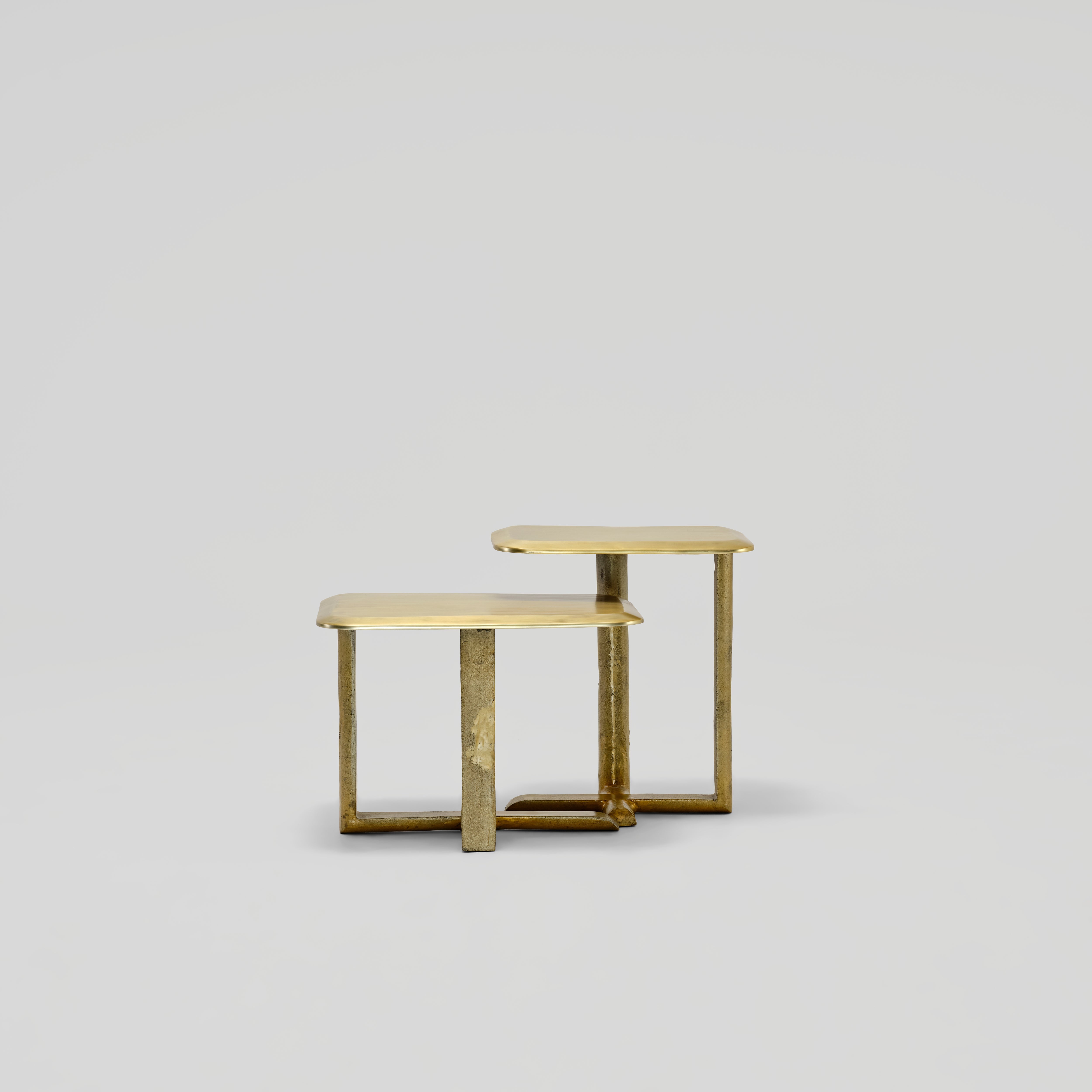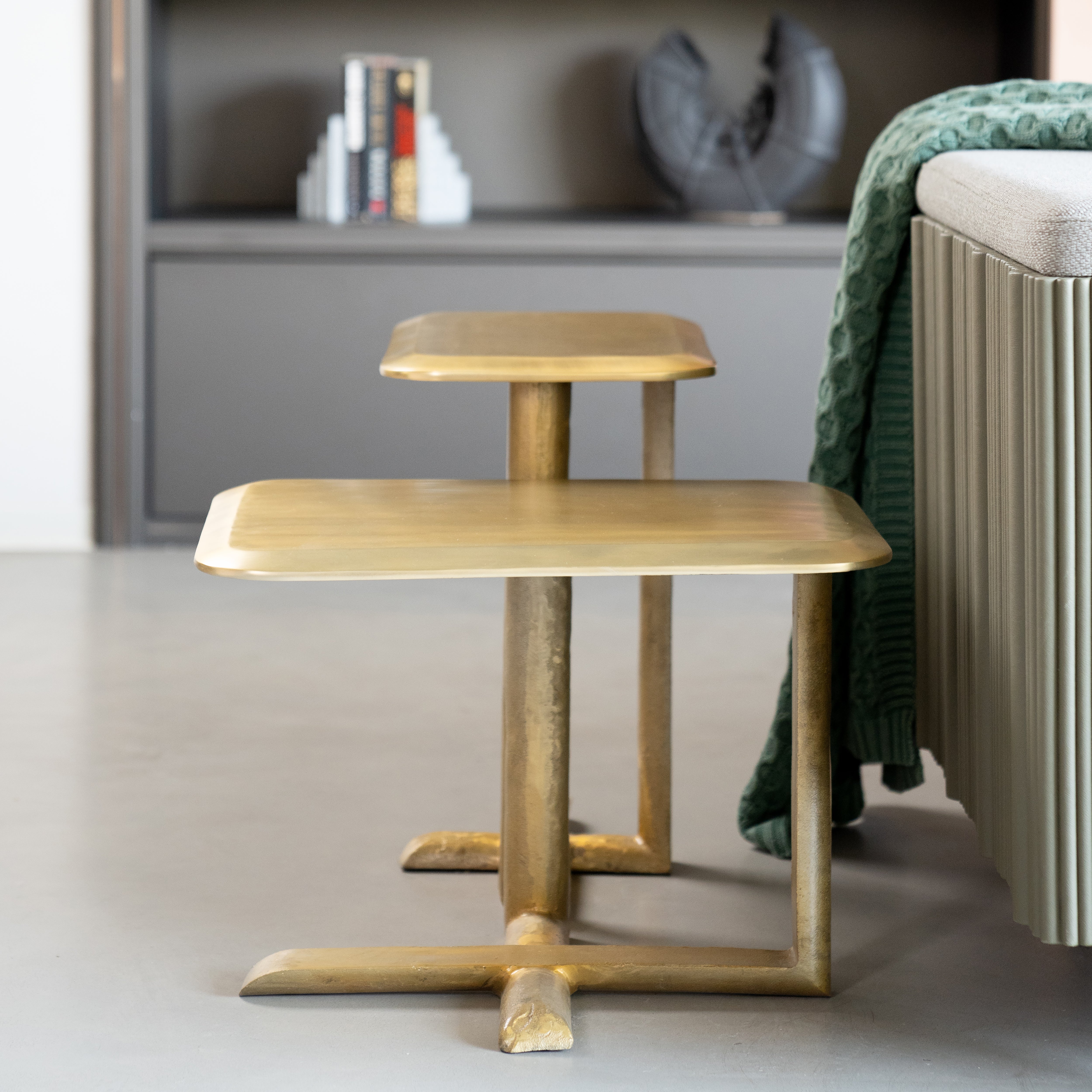 Template brings a refined interplay of levels, with crisp metal planes resting on hand-textured legs. The stepped form adds a gentle sense of movement, making it an elegant companion to seating areas that appreciate subtle artistry and a quietly confident presence.