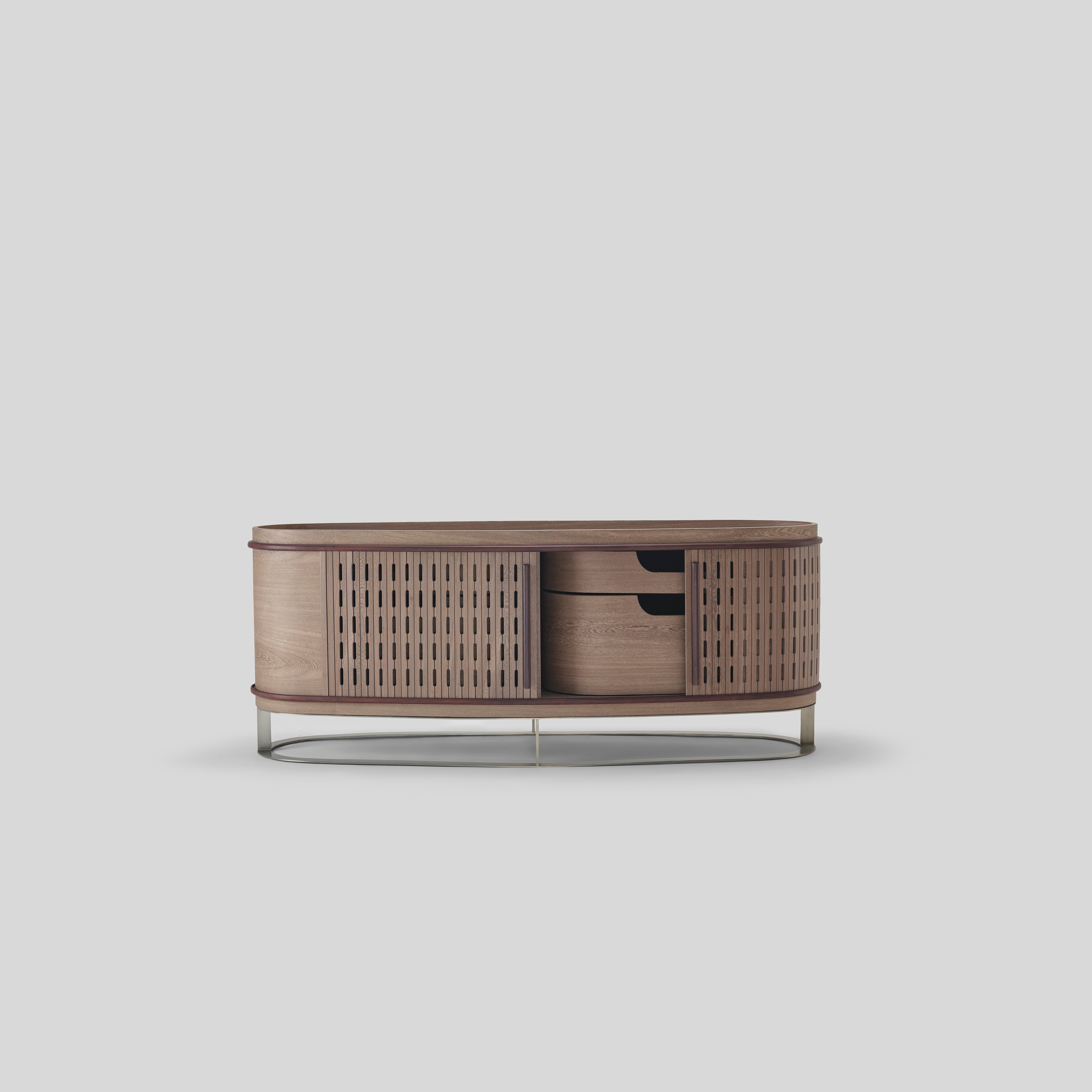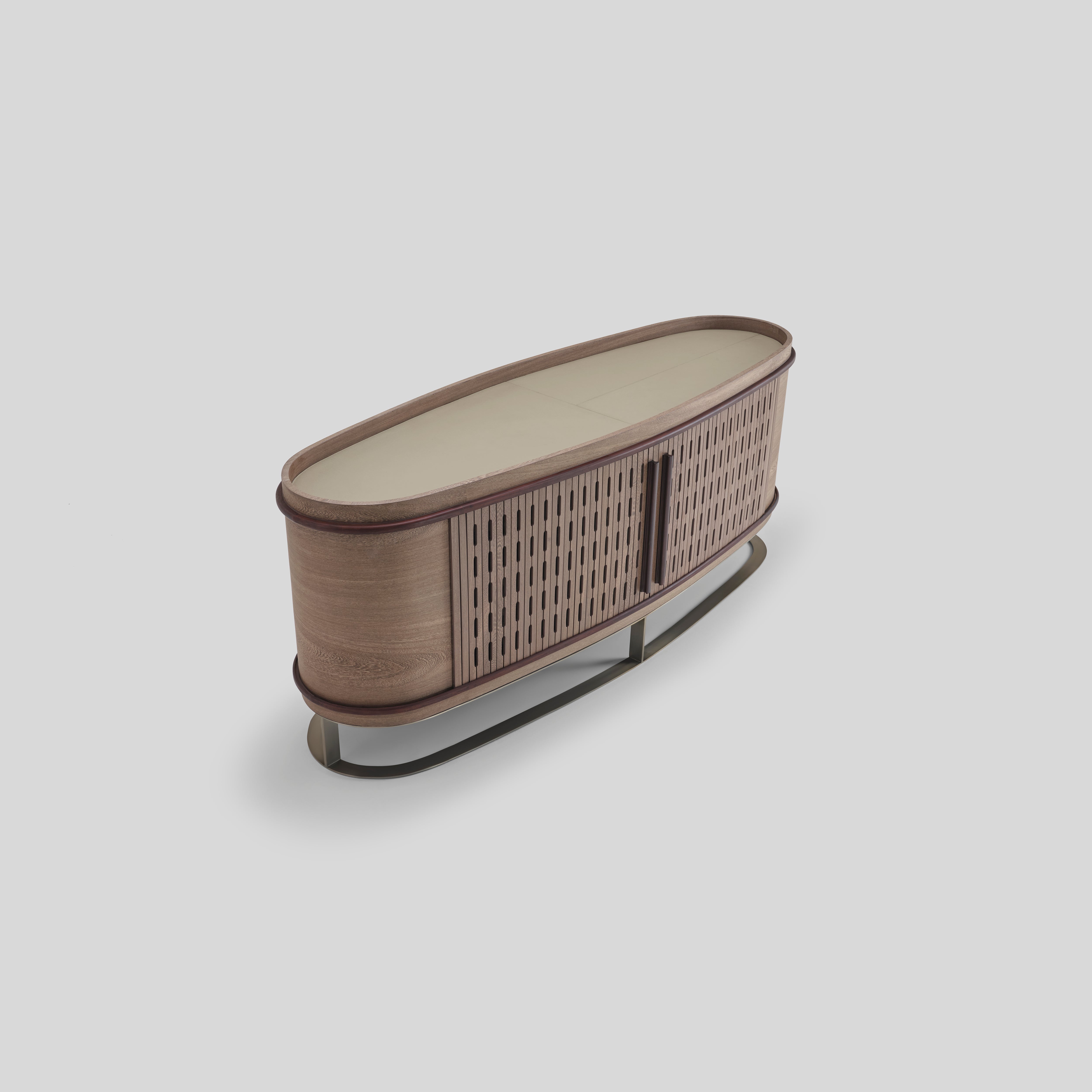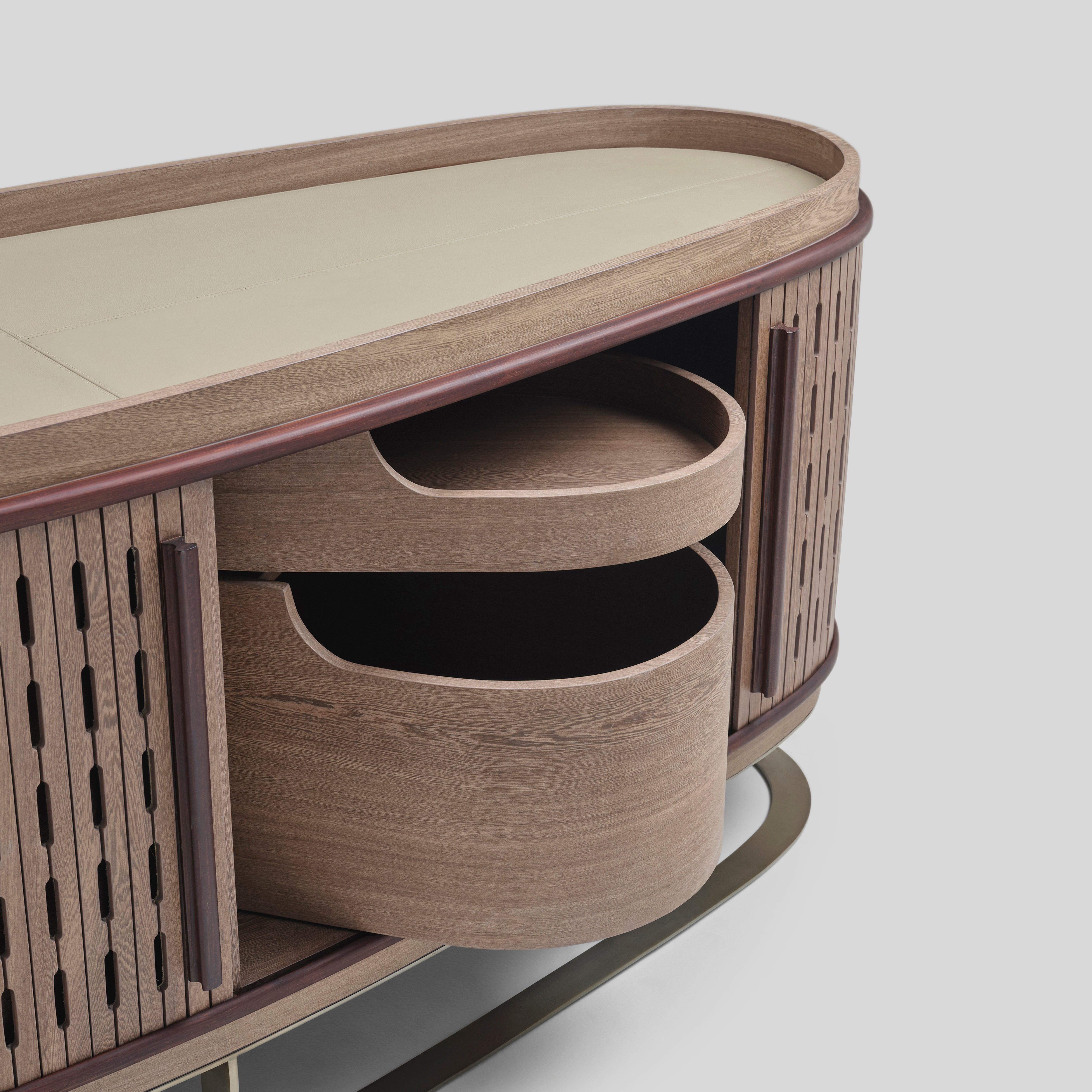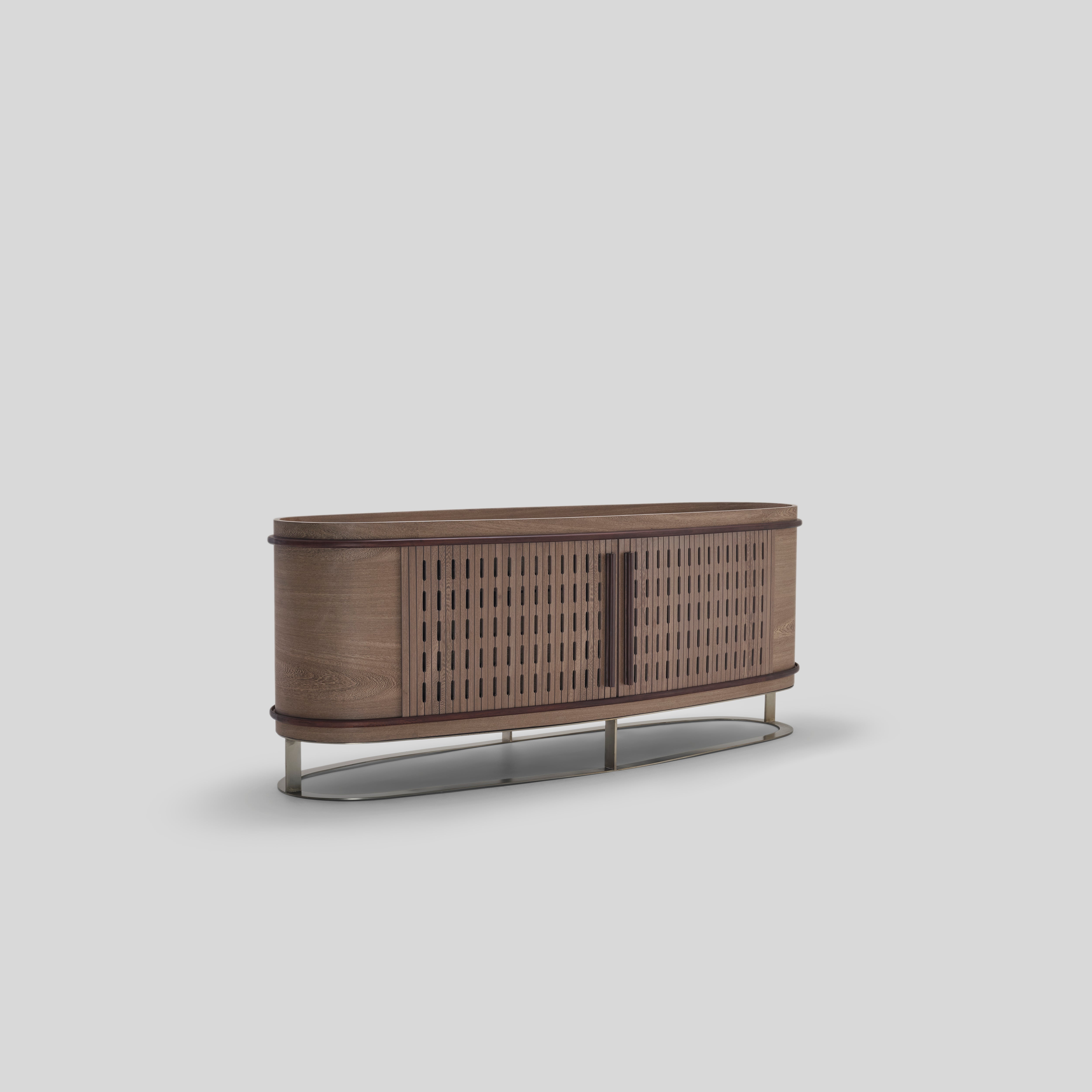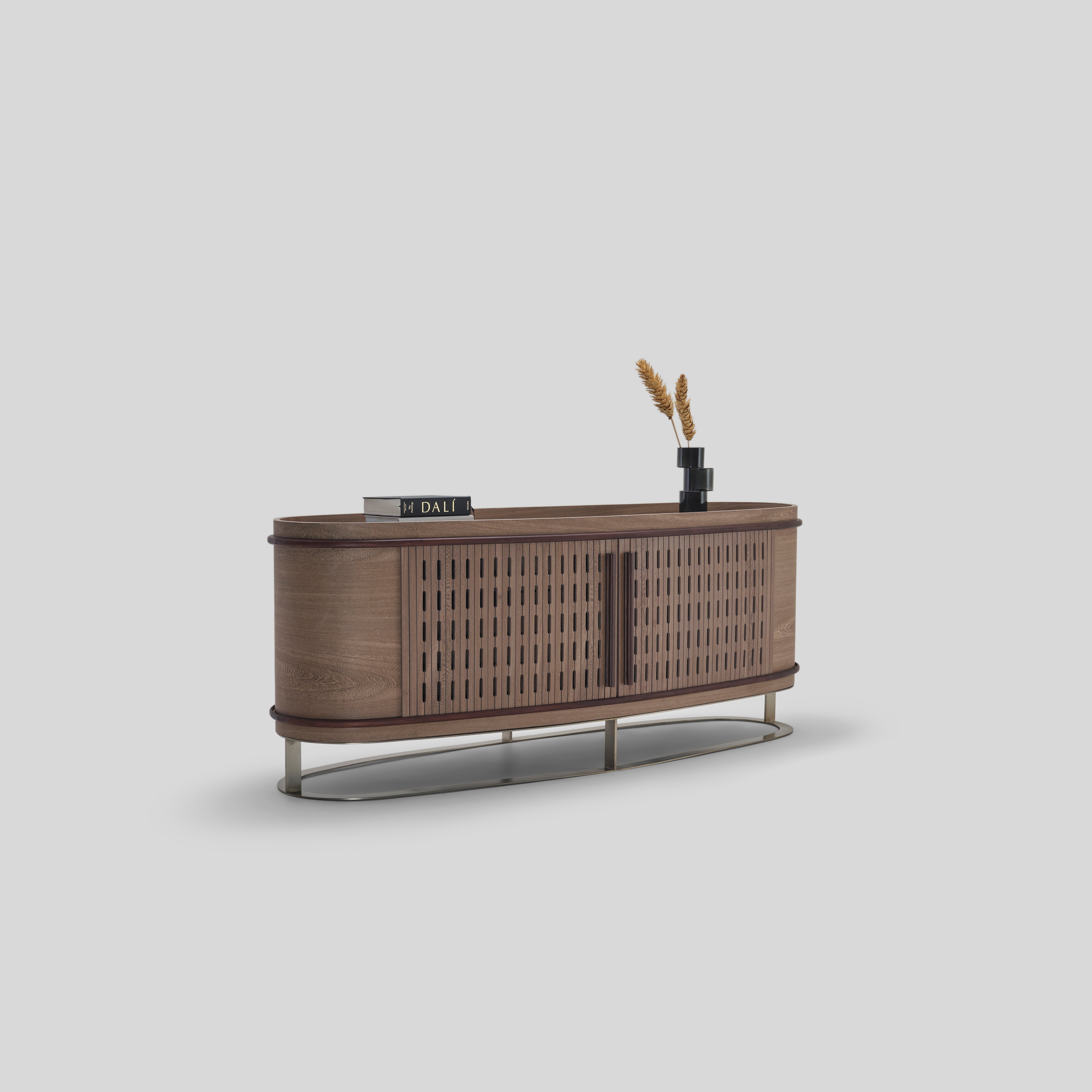 This sideboard blends modern organic warmth with a mid-century undertone, its rounded form and screen-cut sliding shutters giving it a refined, textured cadence. The spacious interior can even function as a hidden bar, pairing beautifully with neutral or earthy palettes across living, dining, and hallway settings.