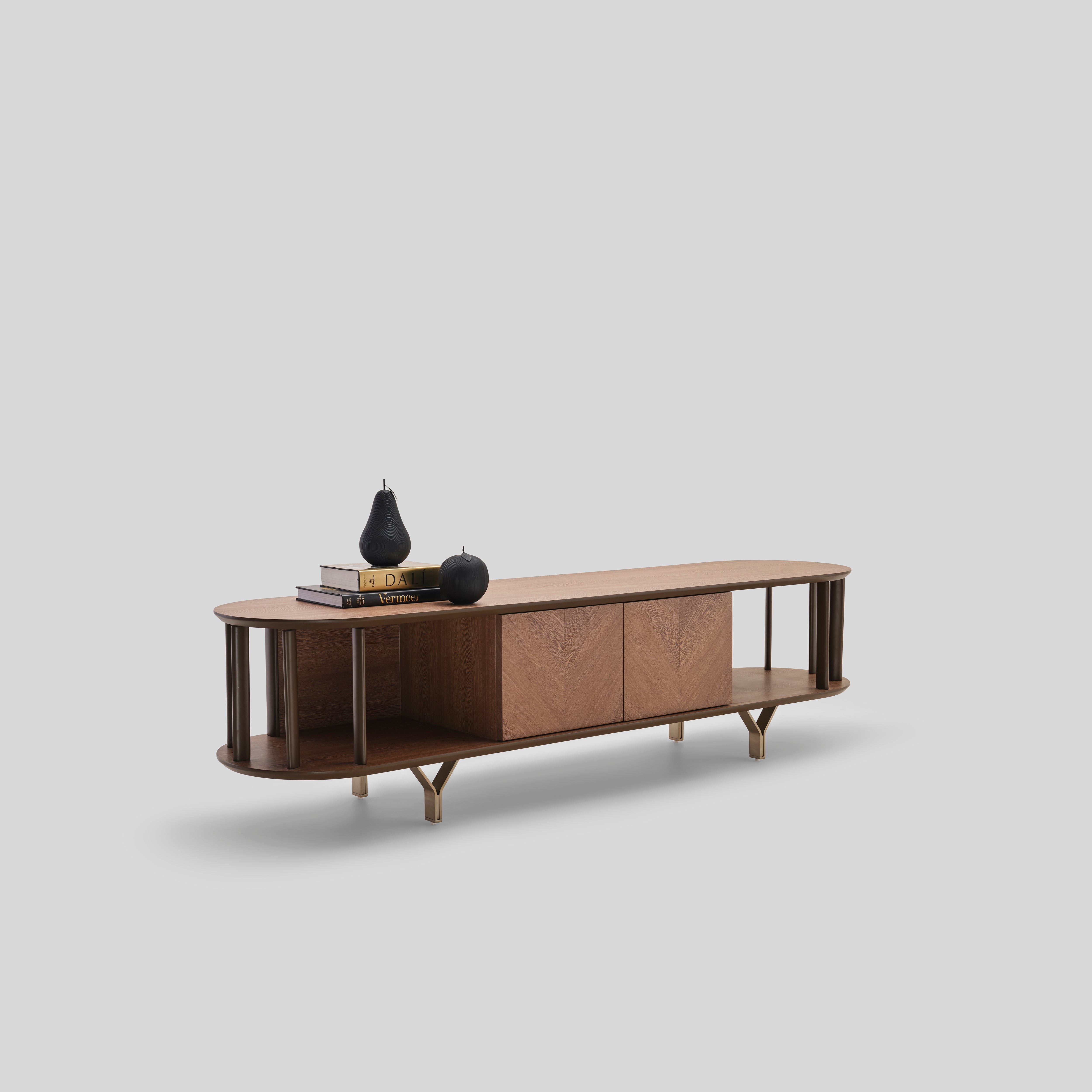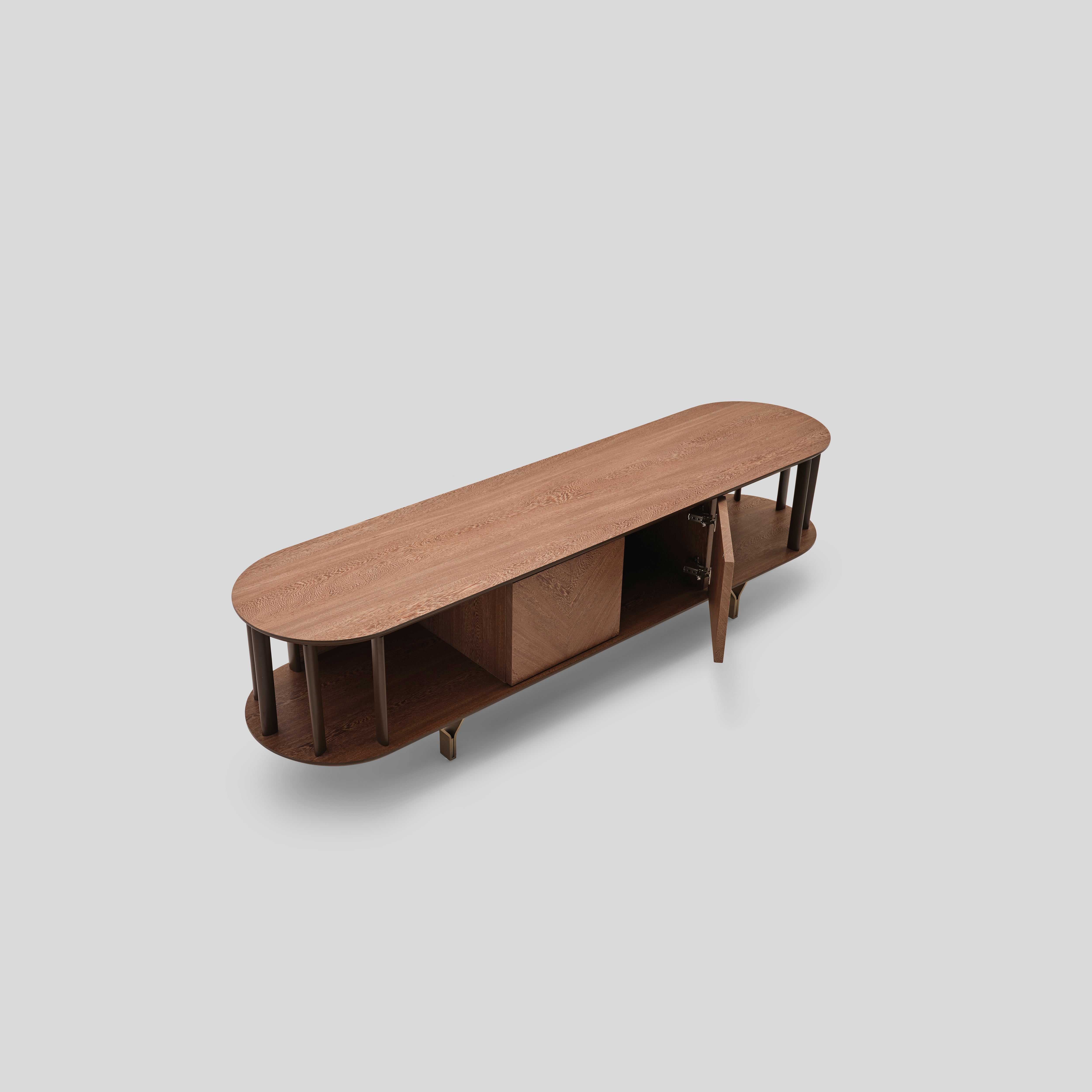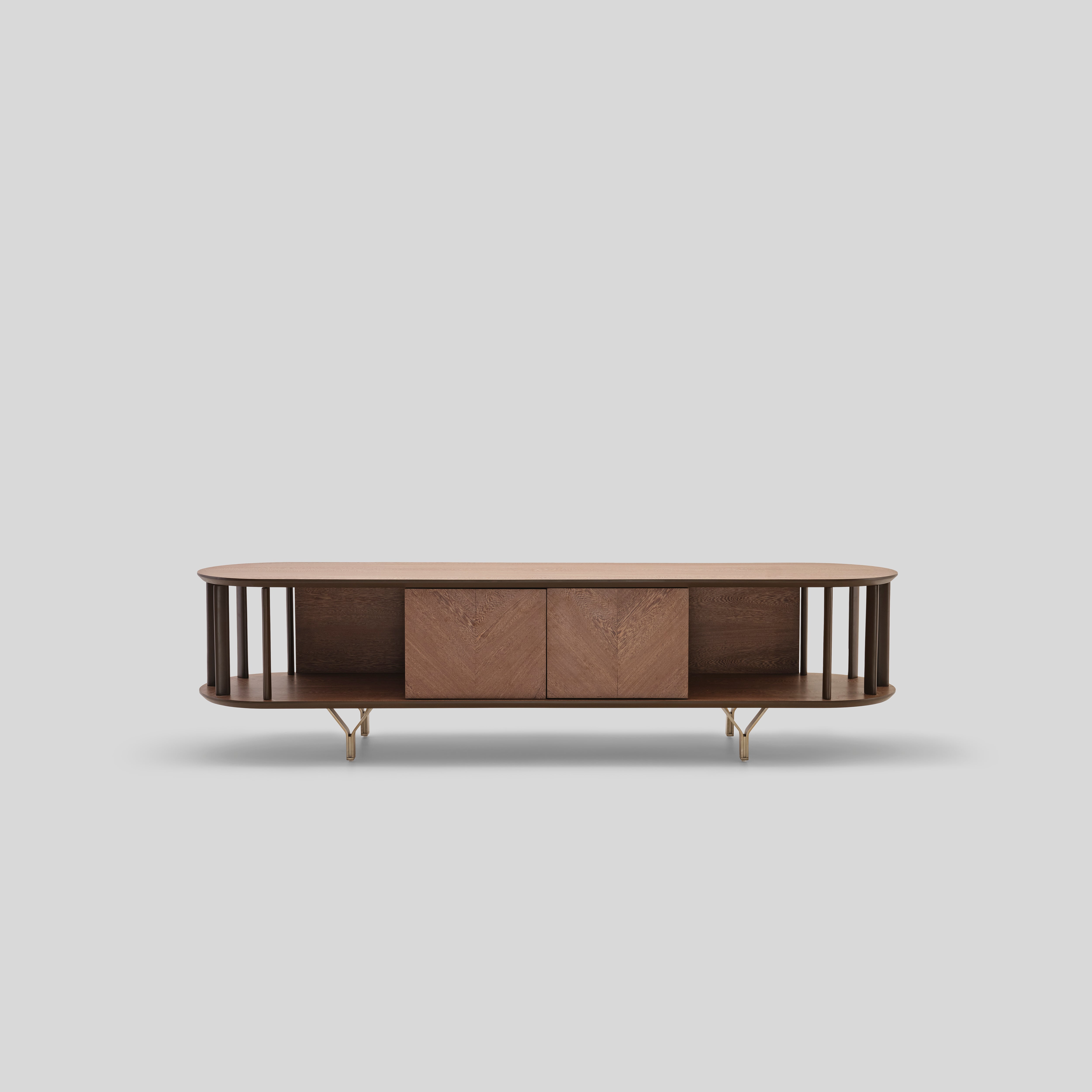 Essenza sideboard pairs warmth with thoughtful clarity, its central storage keeping essentials tucked away while the surrounding shelves invite curated display. The open–closed balance feels adaptable and visually light, giving interiors a contemporary anchor with a quietly refined, design-minded presence.