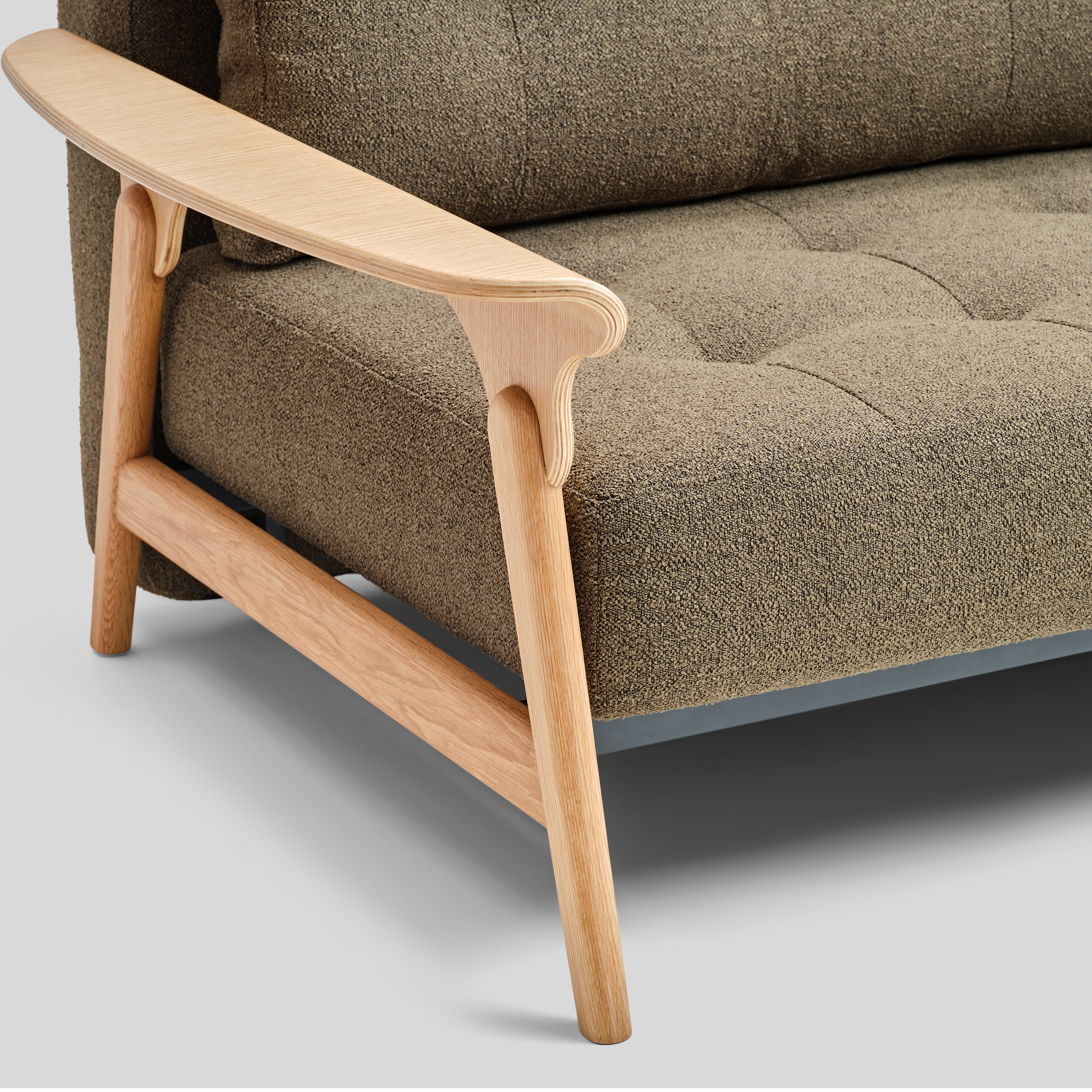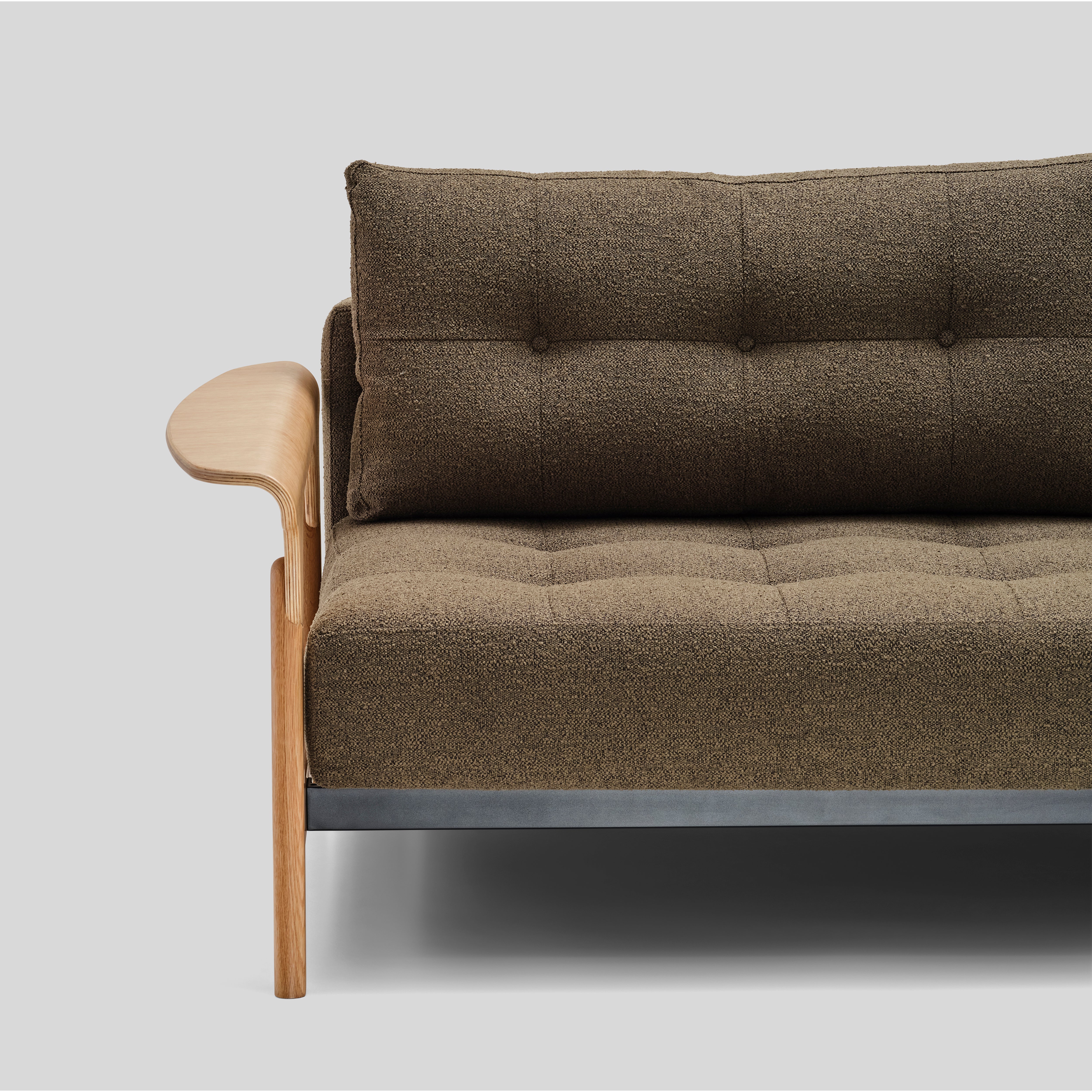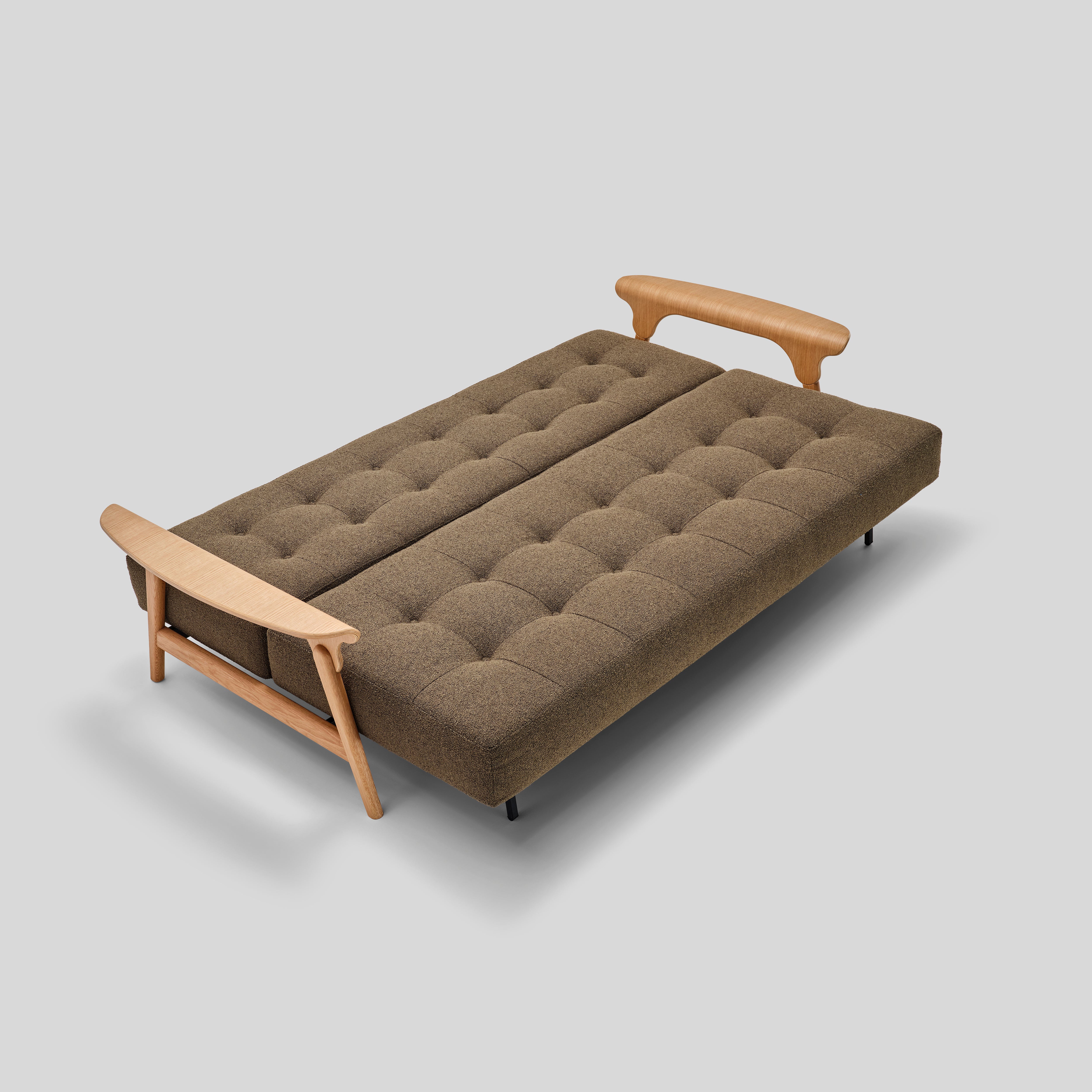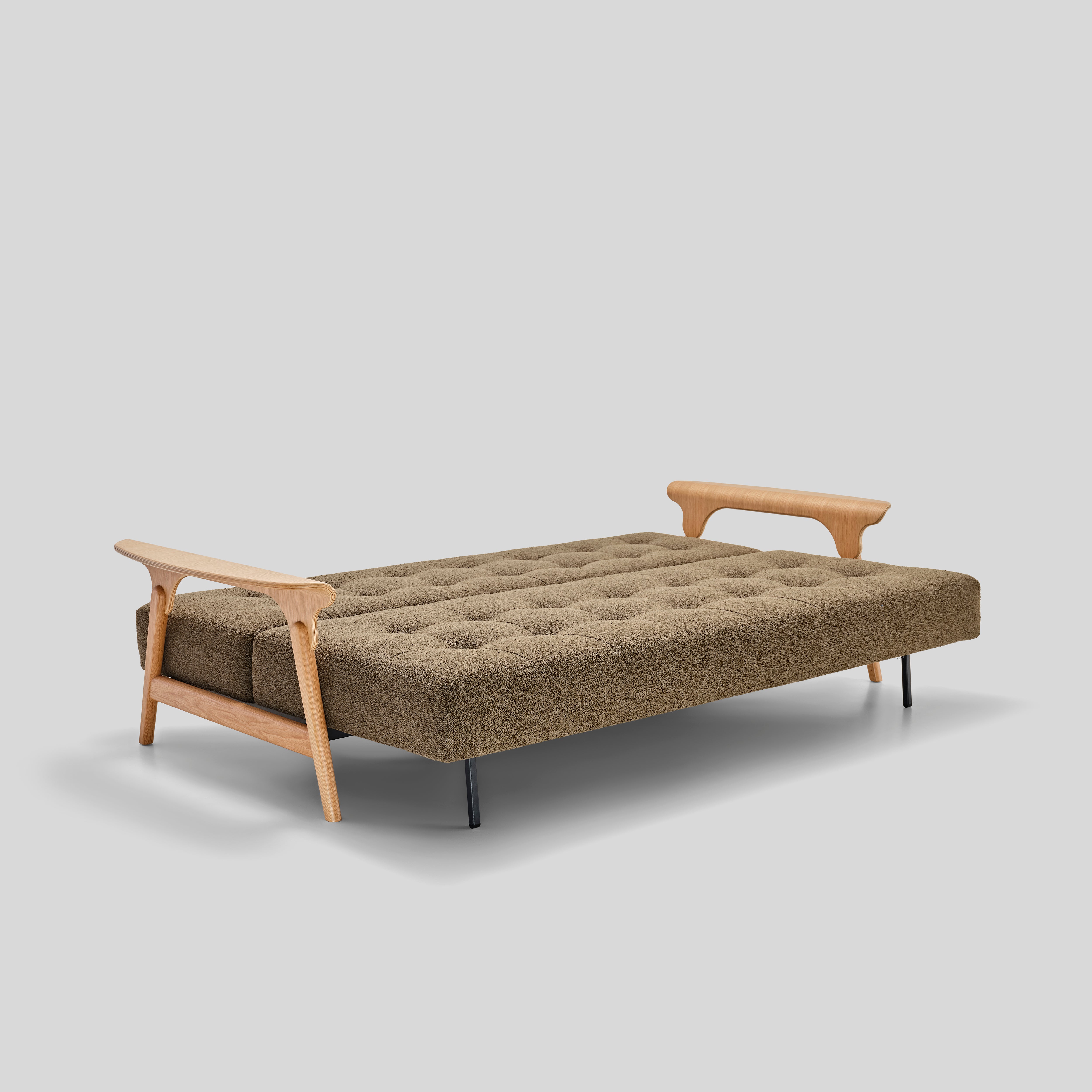 Kira blends mid-century poise with an easy modern temperament. Its sculpted wooden arms frame a generous seat that opens effortlessly into a daybed. Practical in function and graceful in attitude, it carries that quiet confidence of a piece designed to look good doing everything.