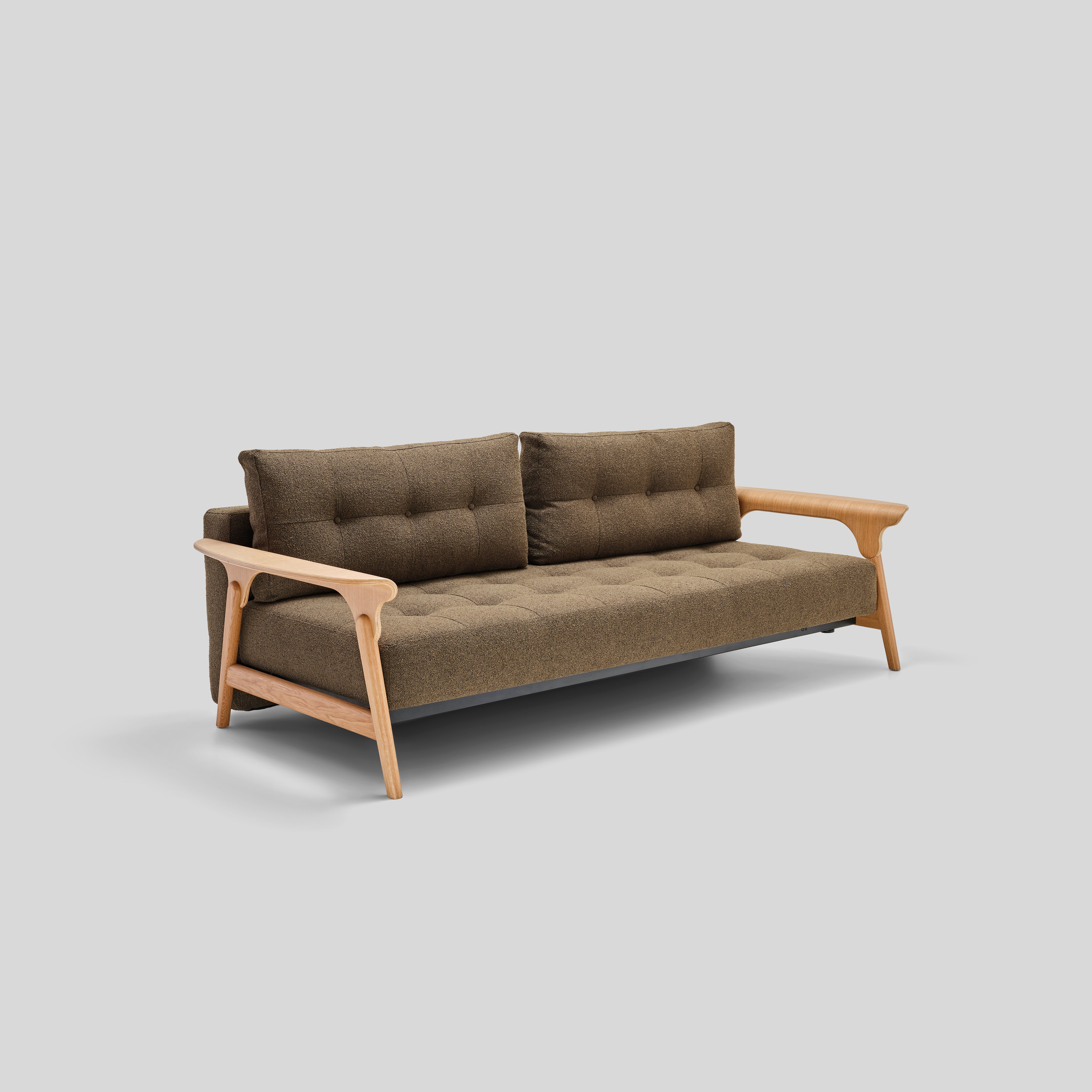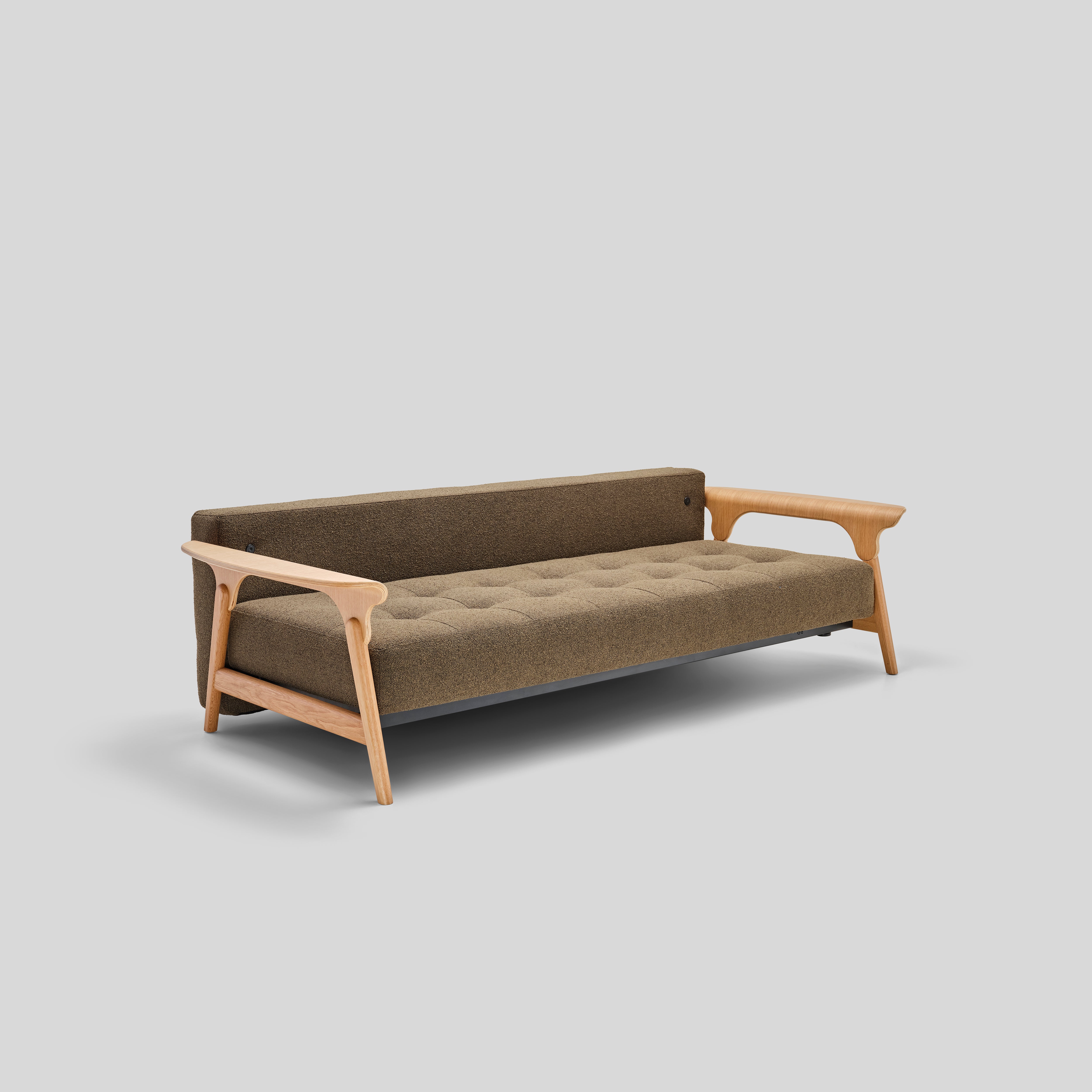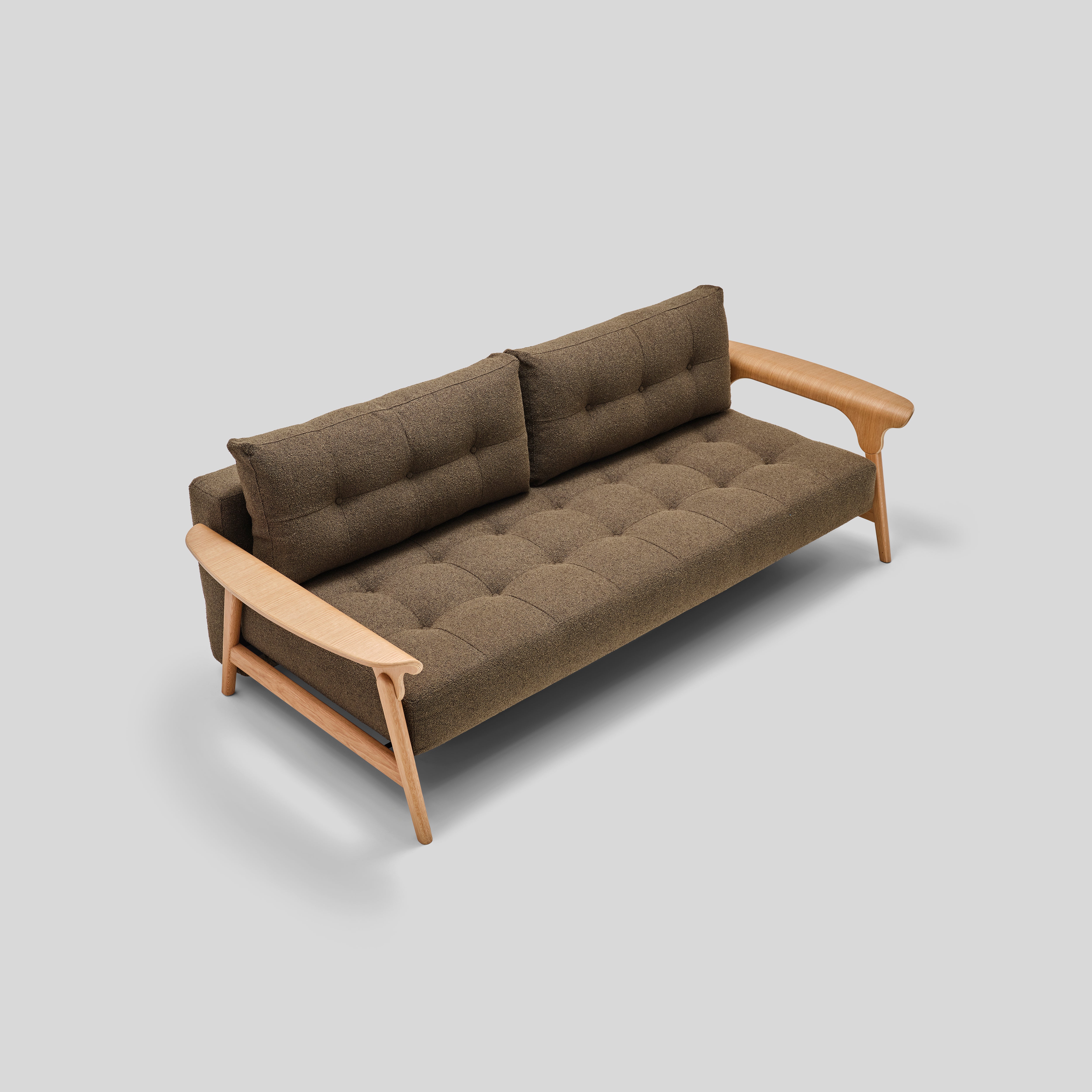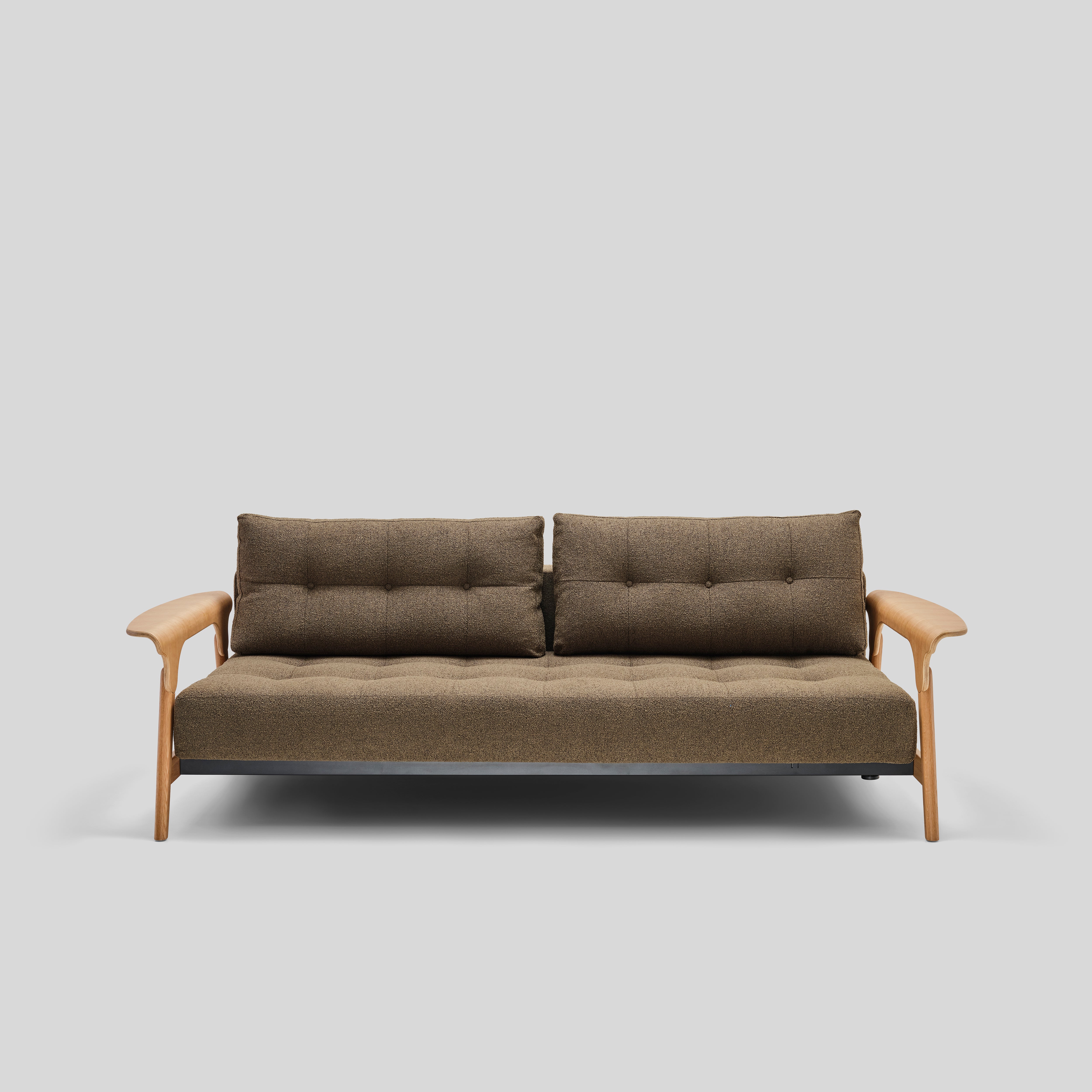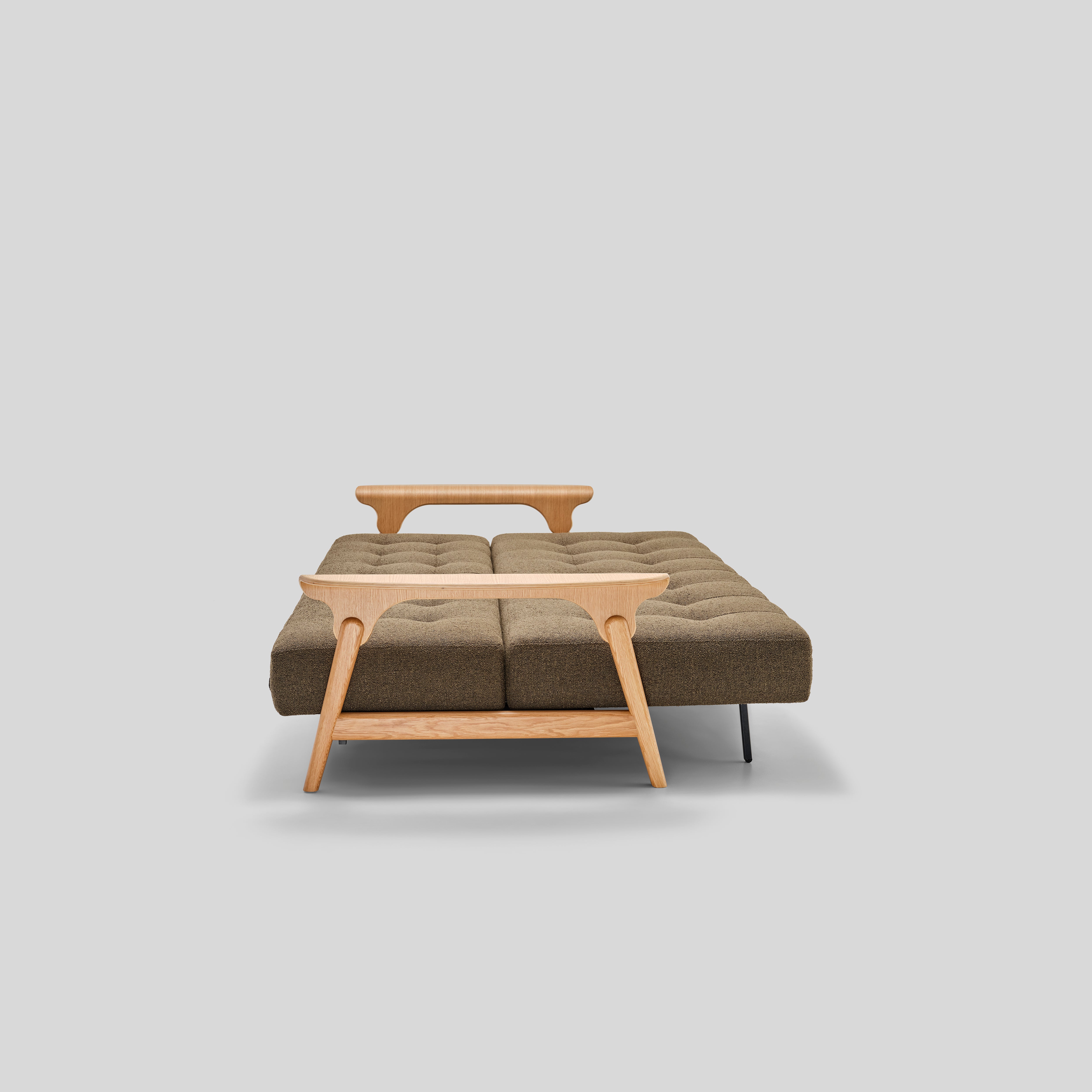 Kira blends mid-century poise with an easy modern temperament. Its sculpted wooden arms frame a generous seat that opens effortlessly into a daybed. Practical in function and graceful in attitude, it carries that quiet confidence of a piece designed to look good doing everything.
