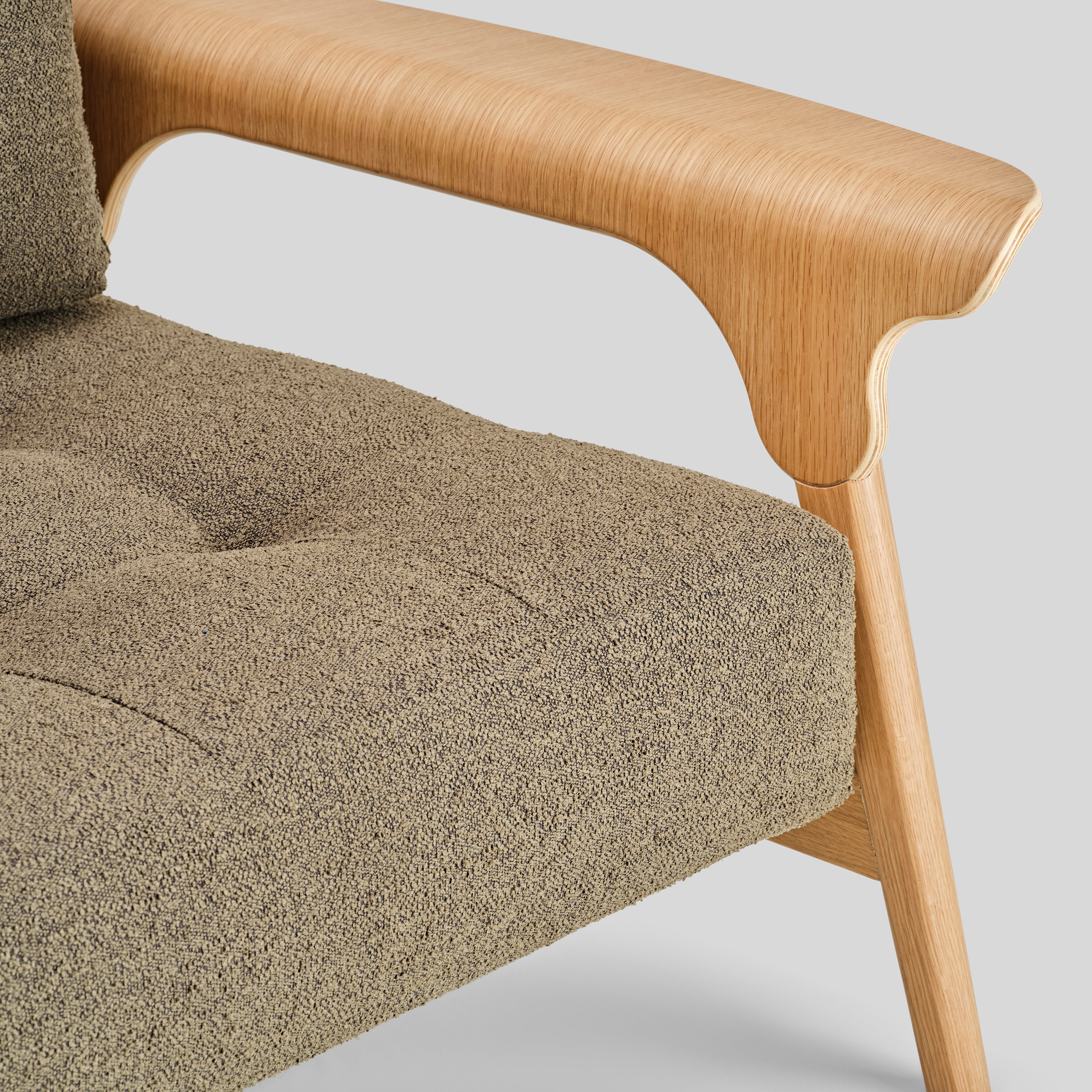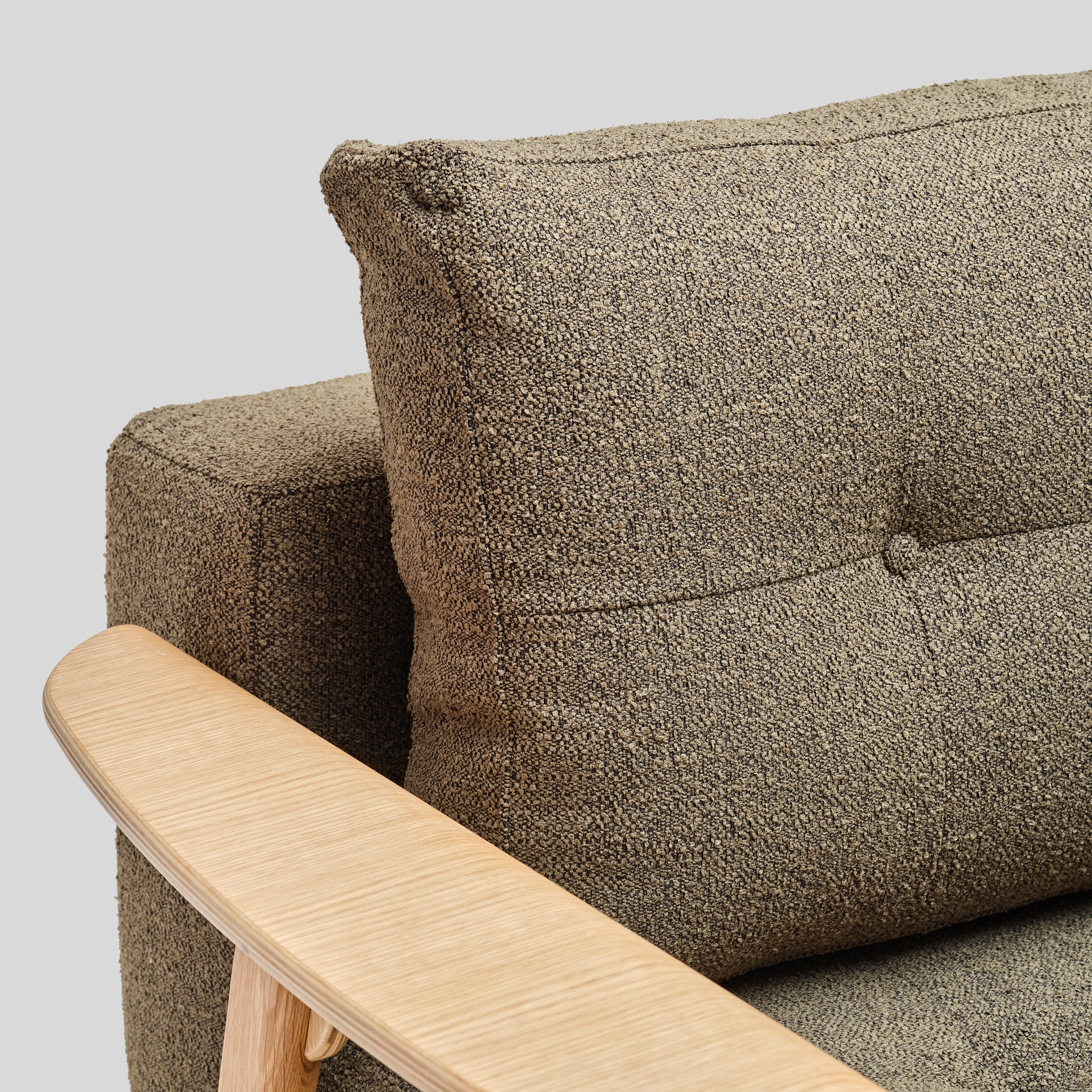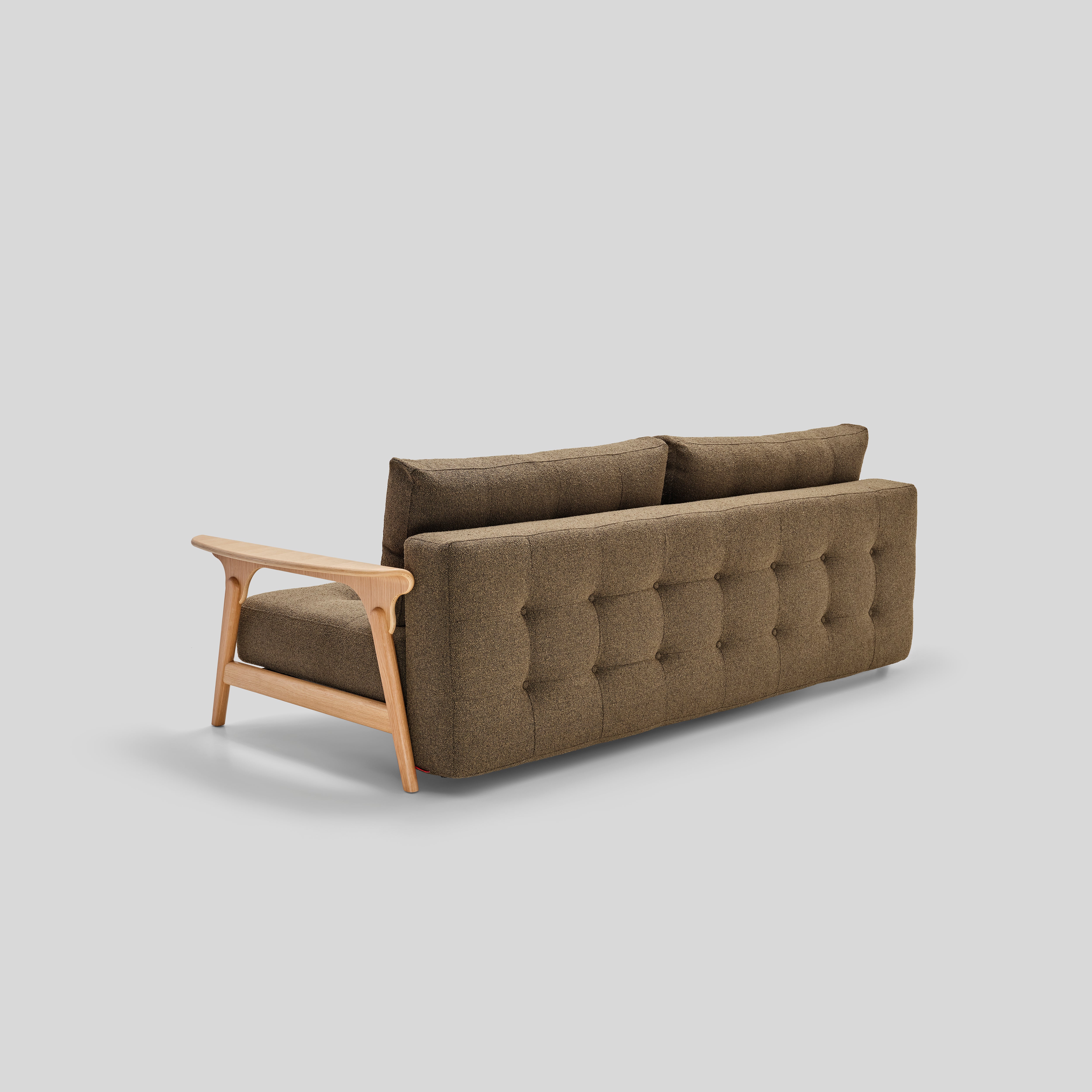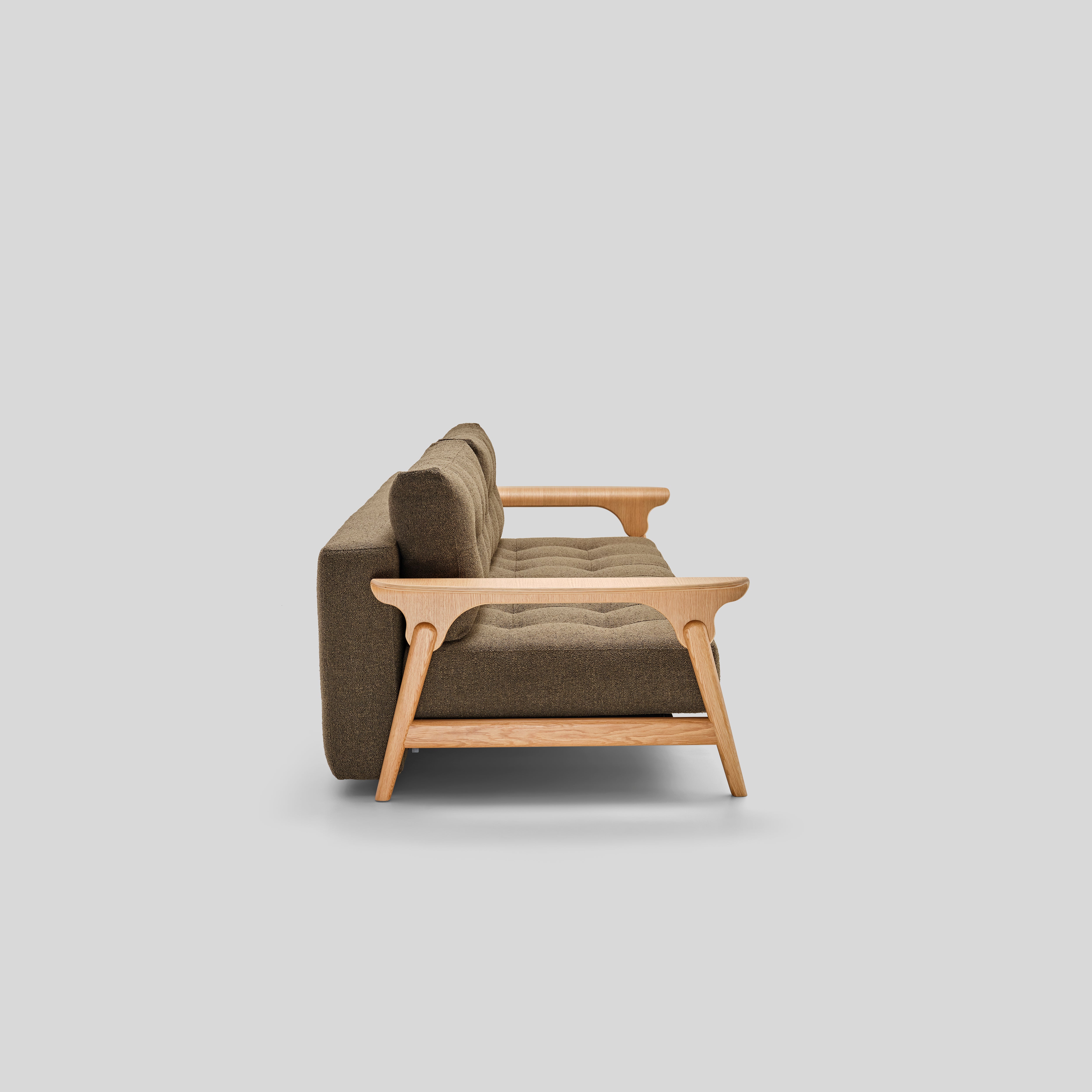 Kira blends mid-century poise with an easy modern temperament. Its sculpted wooden arms frame a generous seat that opens effortlessly into a daybed. Practical in function and graceful in attitude, it carries that quiet confidence of a piece designed to look good doing everything.