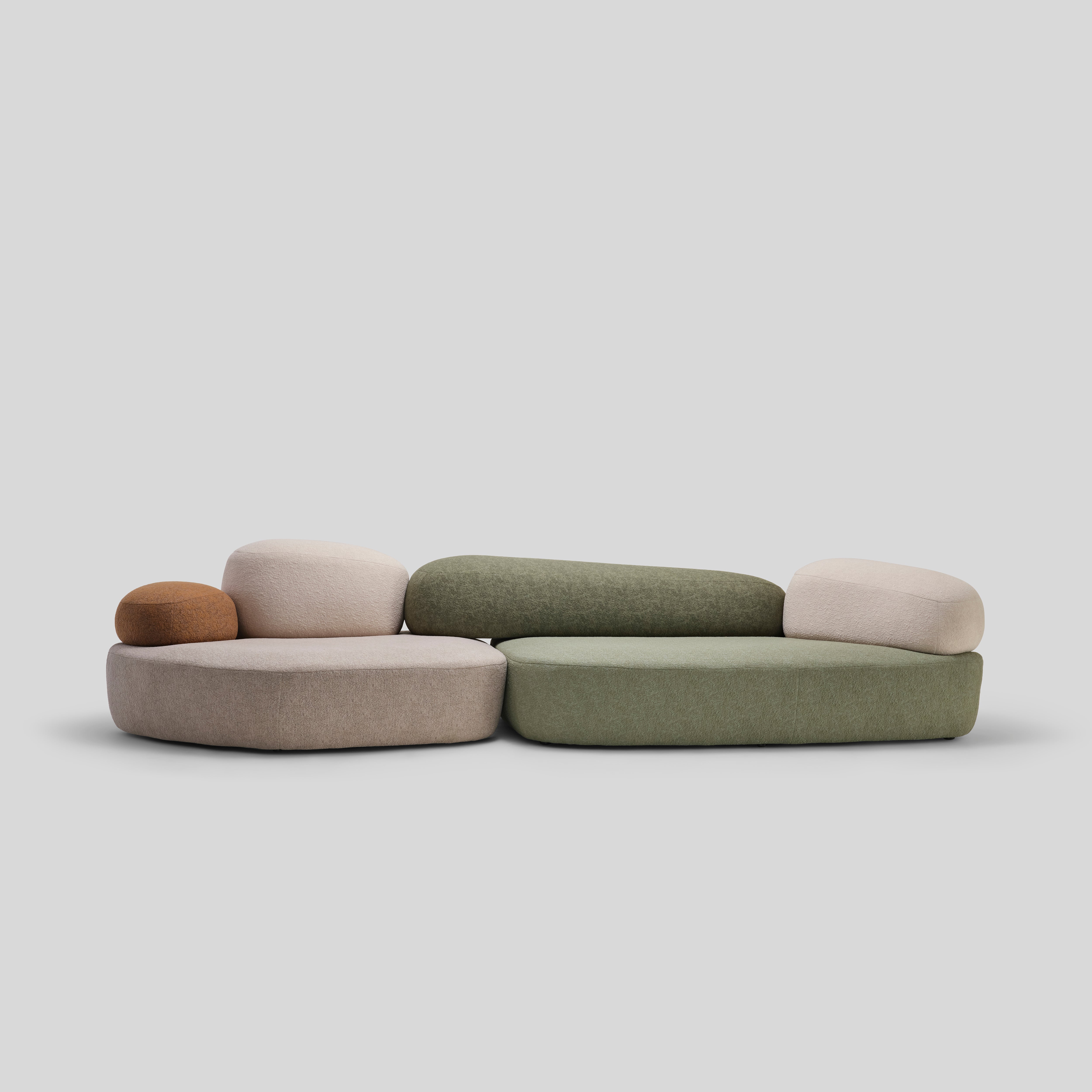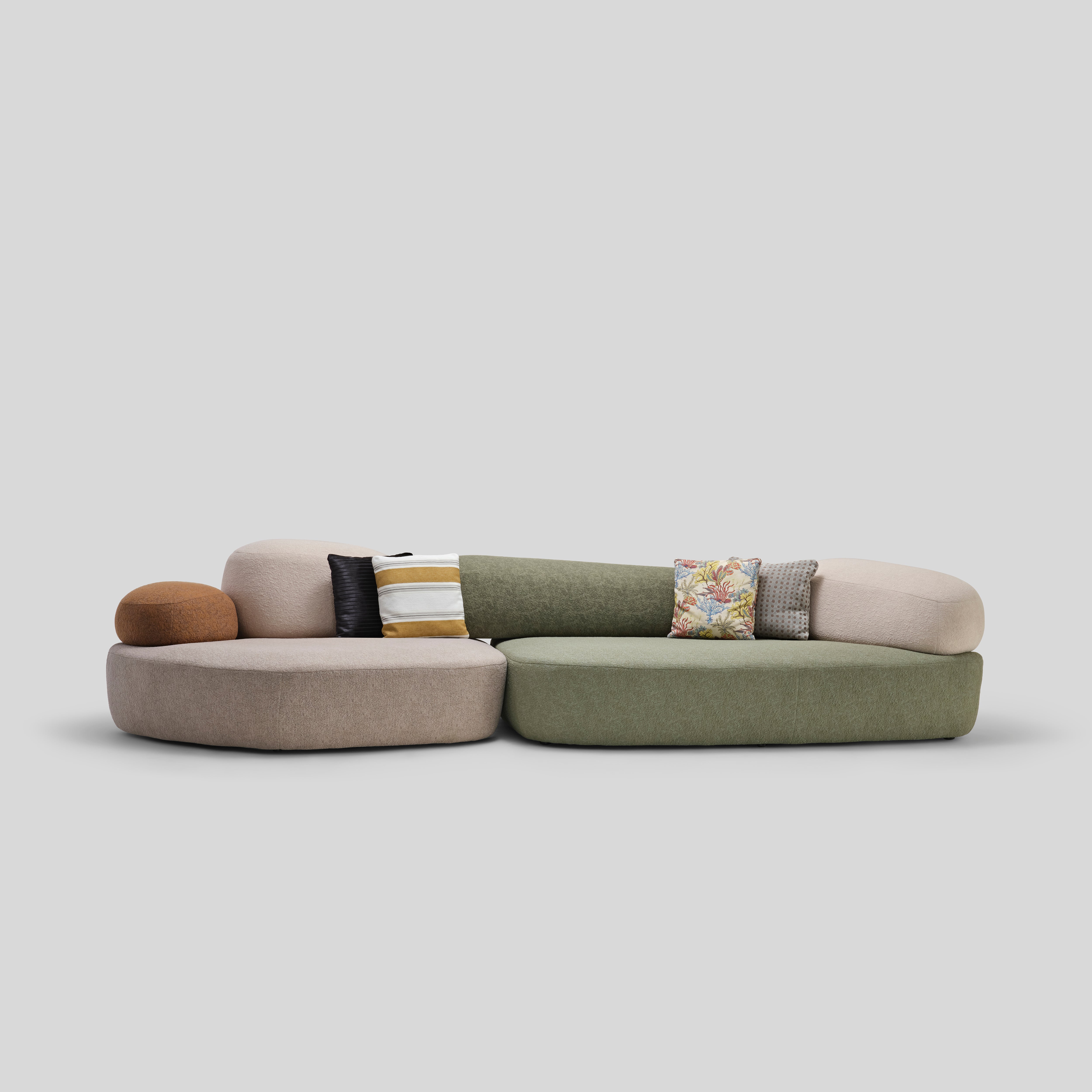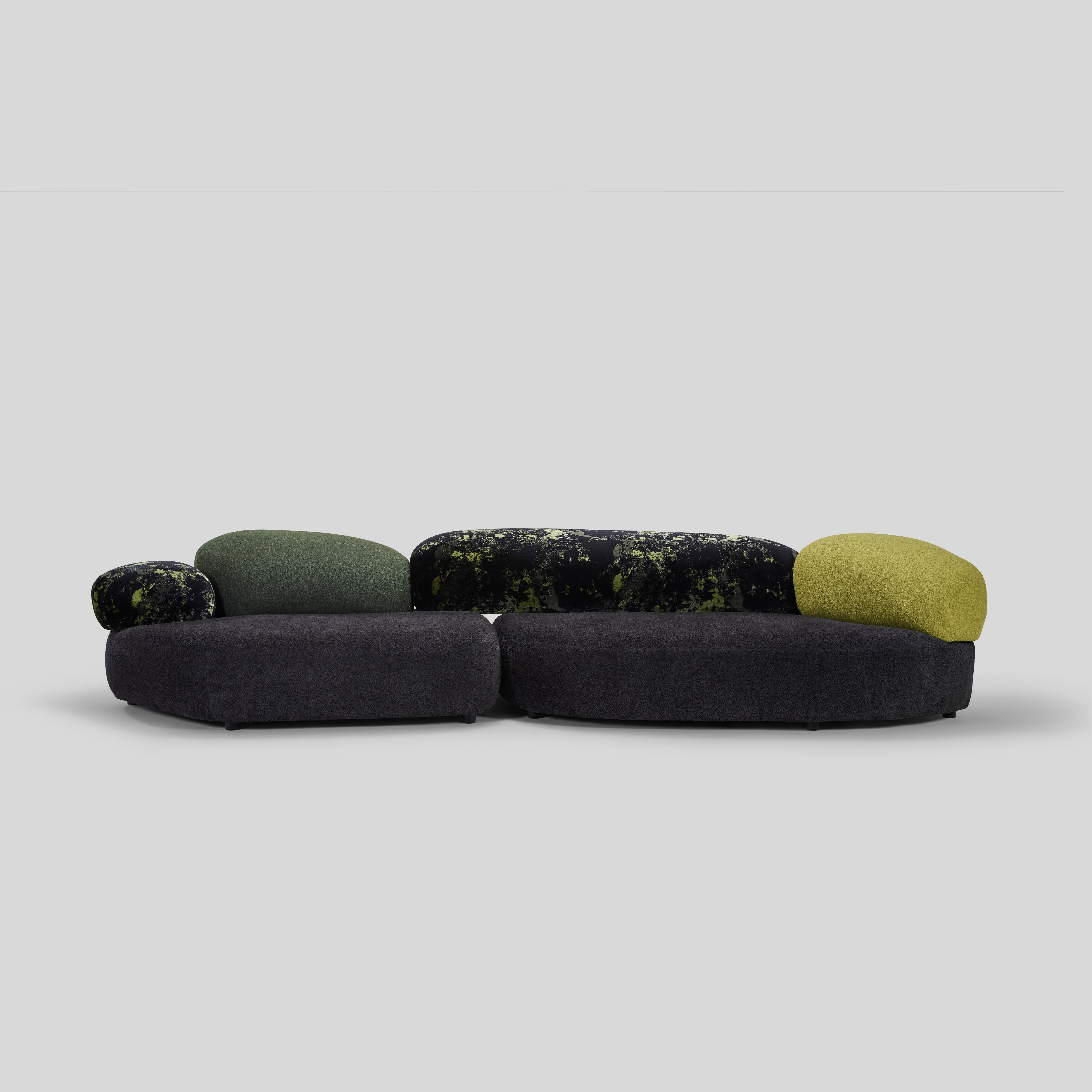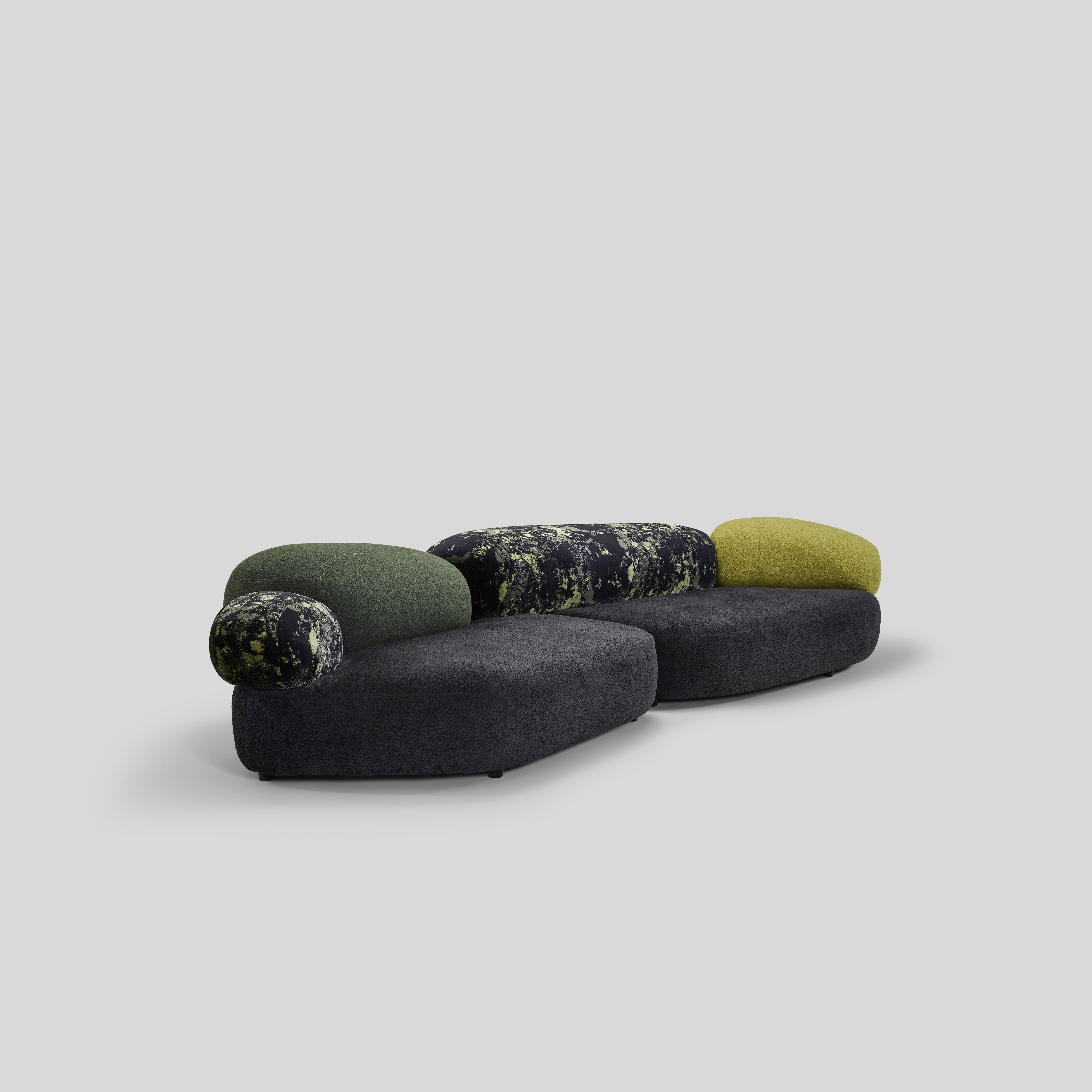 The sofa behaves like a quiet installation, where colour, form, and texture move with painterly confidence. Its asymmetric bolsters read like sculpted brushstrokes, shifting from deep moss to electric chartreuse, while the expansive seat anchors everything in a moody charcoal hush. Together they create a landscape of contrasts: soft yet assertive, playful yet composed. It feels less like furniture and more like a living artwork, inviting you to sit inside its mood rather than simply on it.