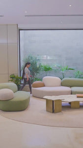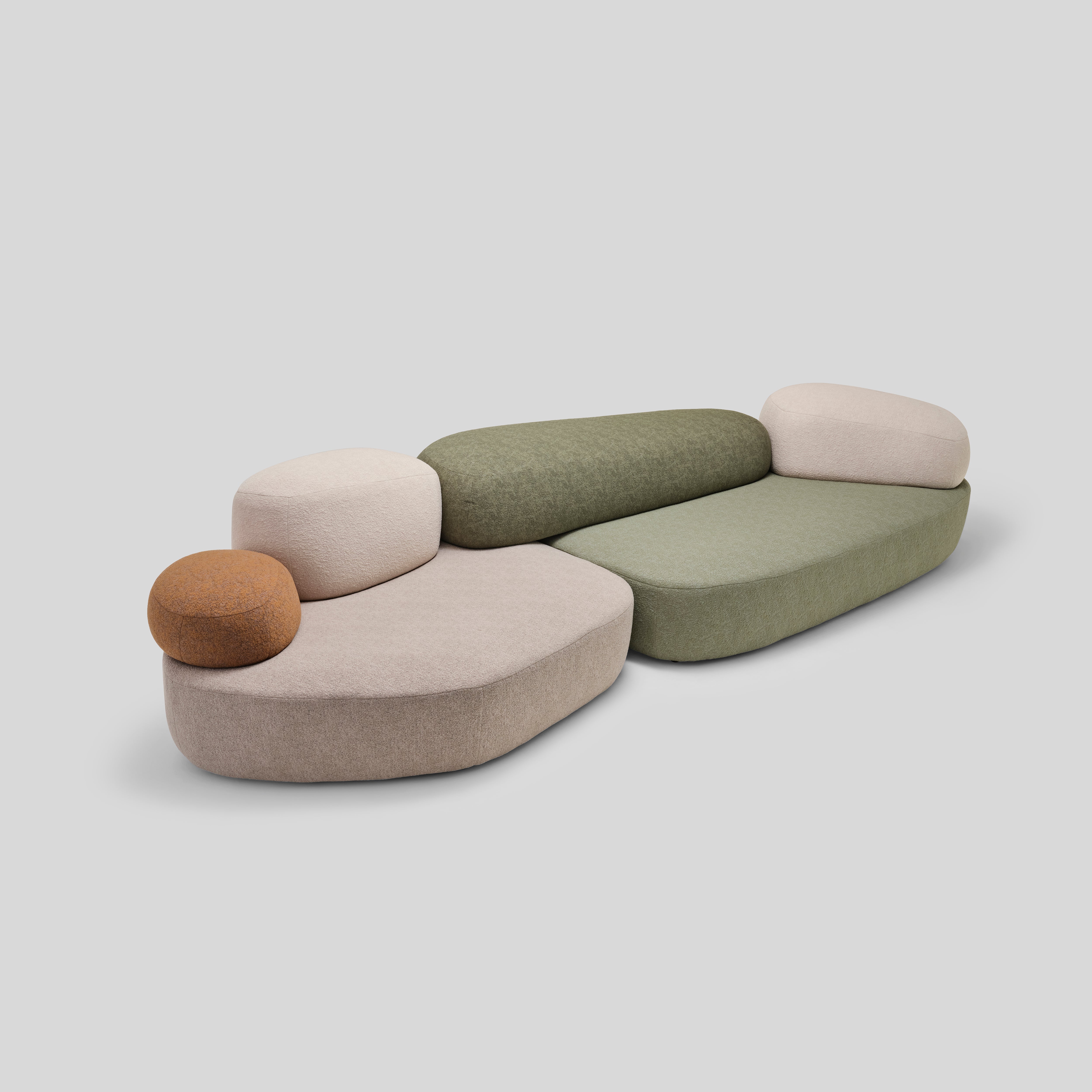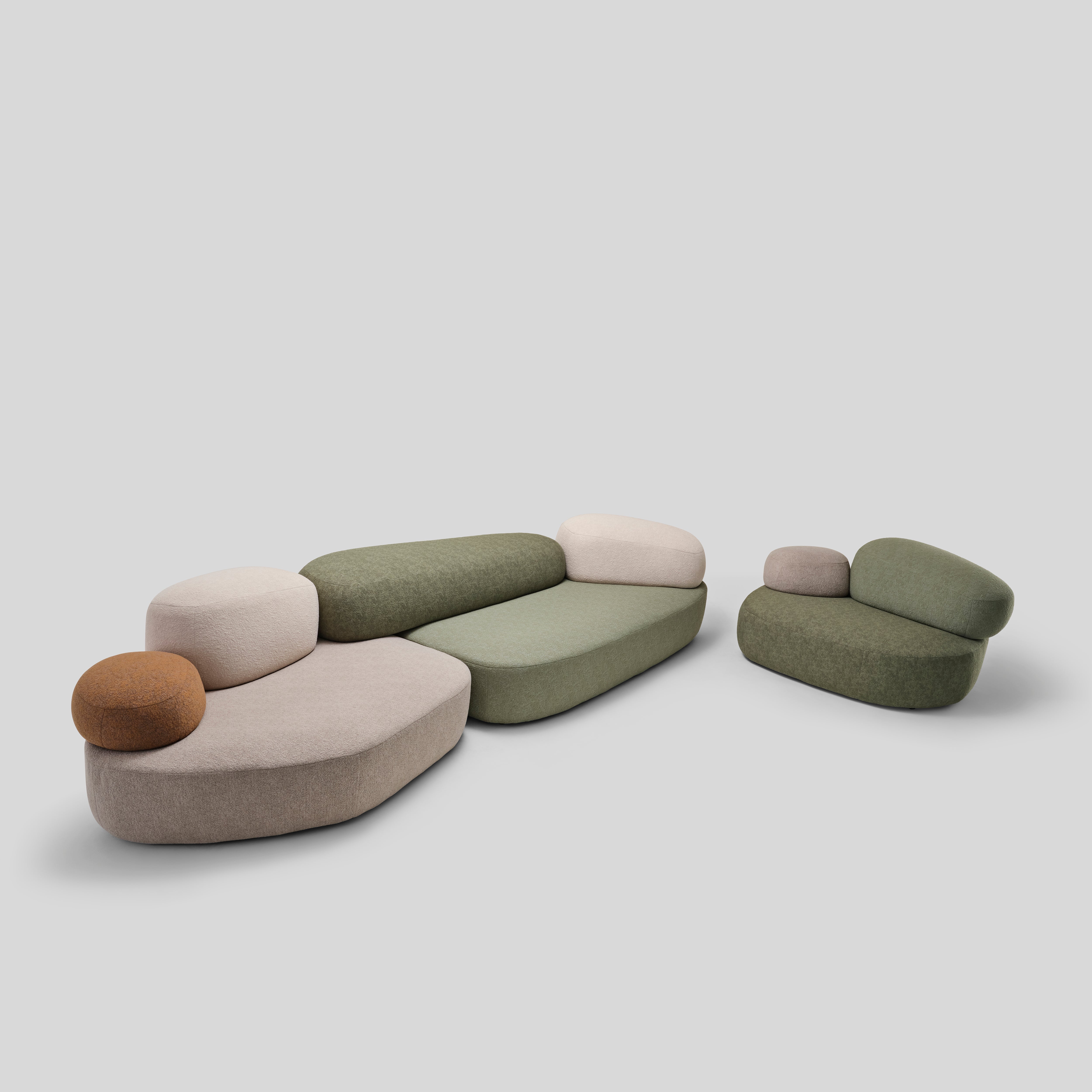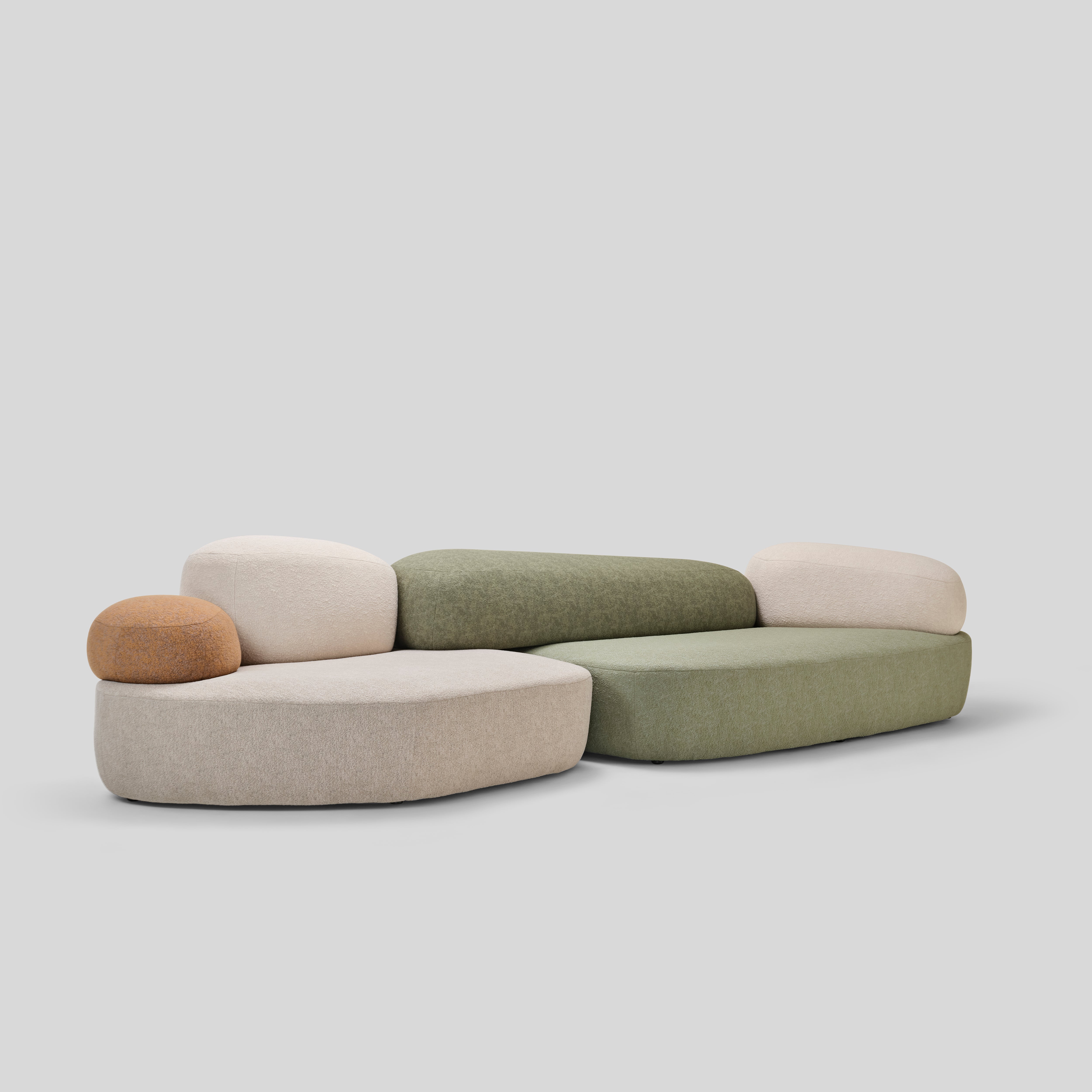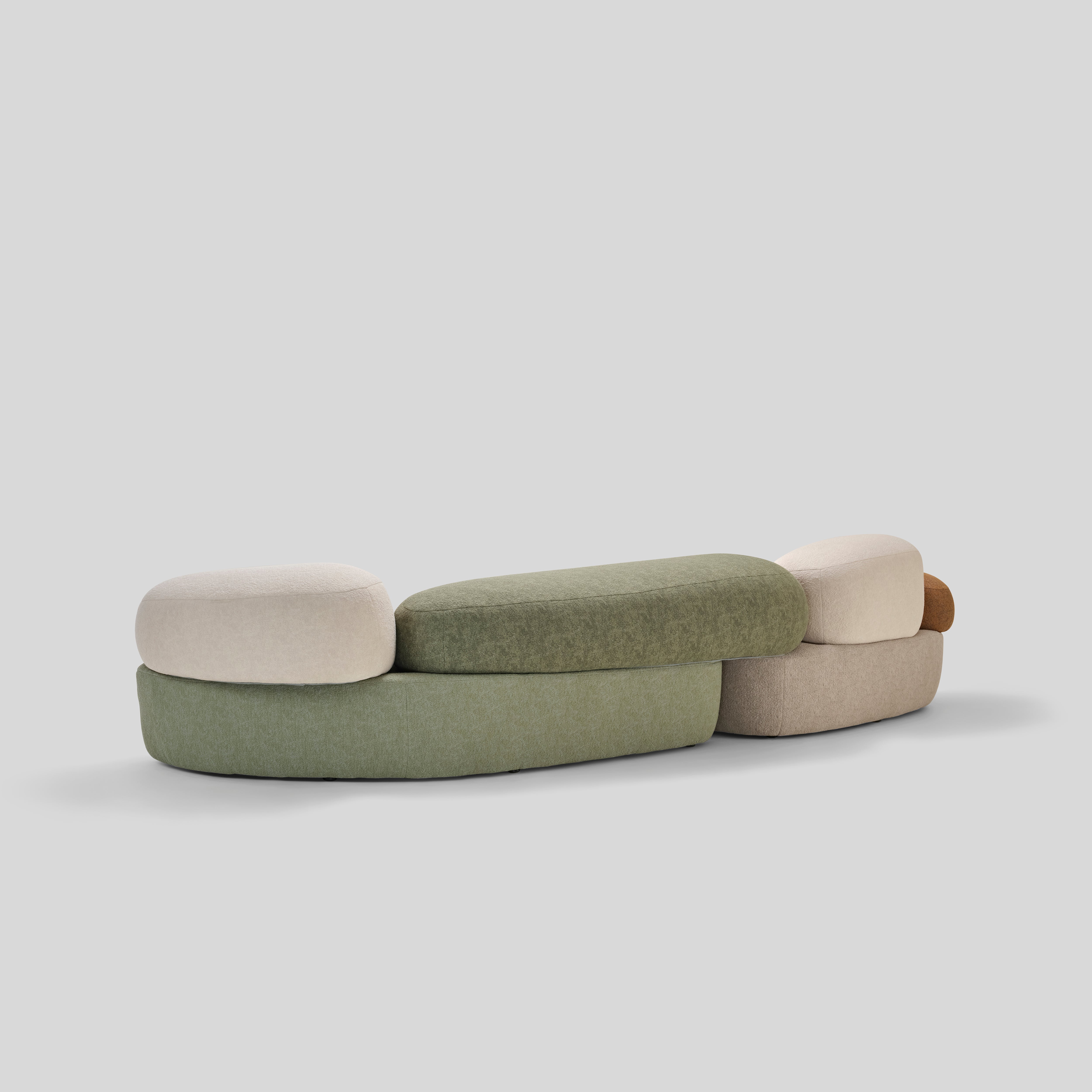 The sofa behaves like a quiet installation, where colour, form, and texture move with painterly confidence. Its asymmetric bolsters read like sculpted brushstrokes, shifting from deep moss to electric chartreuse, while the expansive seat anchors everything in a moody charcoal hush. Together they create a landscape of contrasts: soft yet assertive, playful yet composed. It feels less like furniture and more like a living artwork, inviting you to sit inside its mood rather than simply on it.