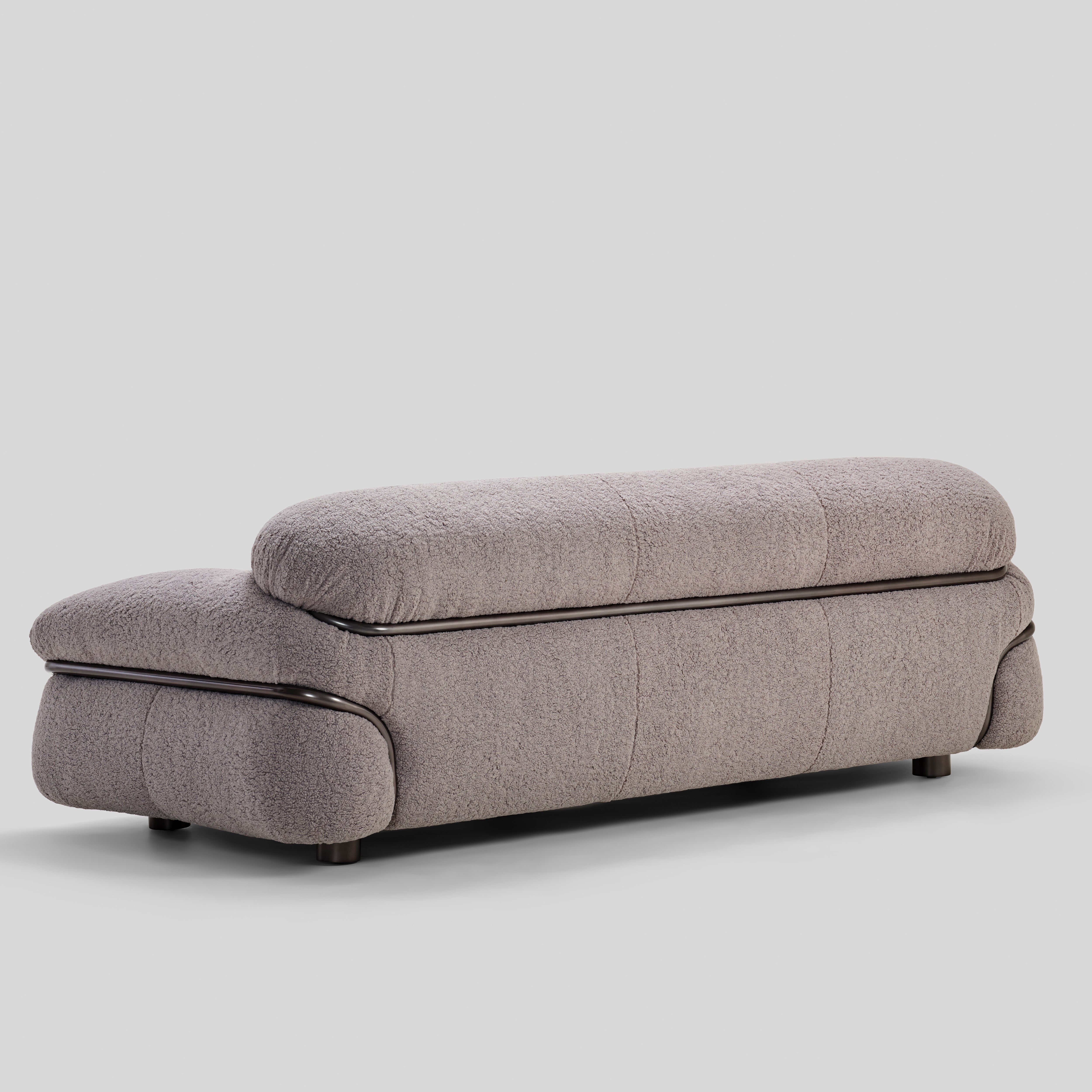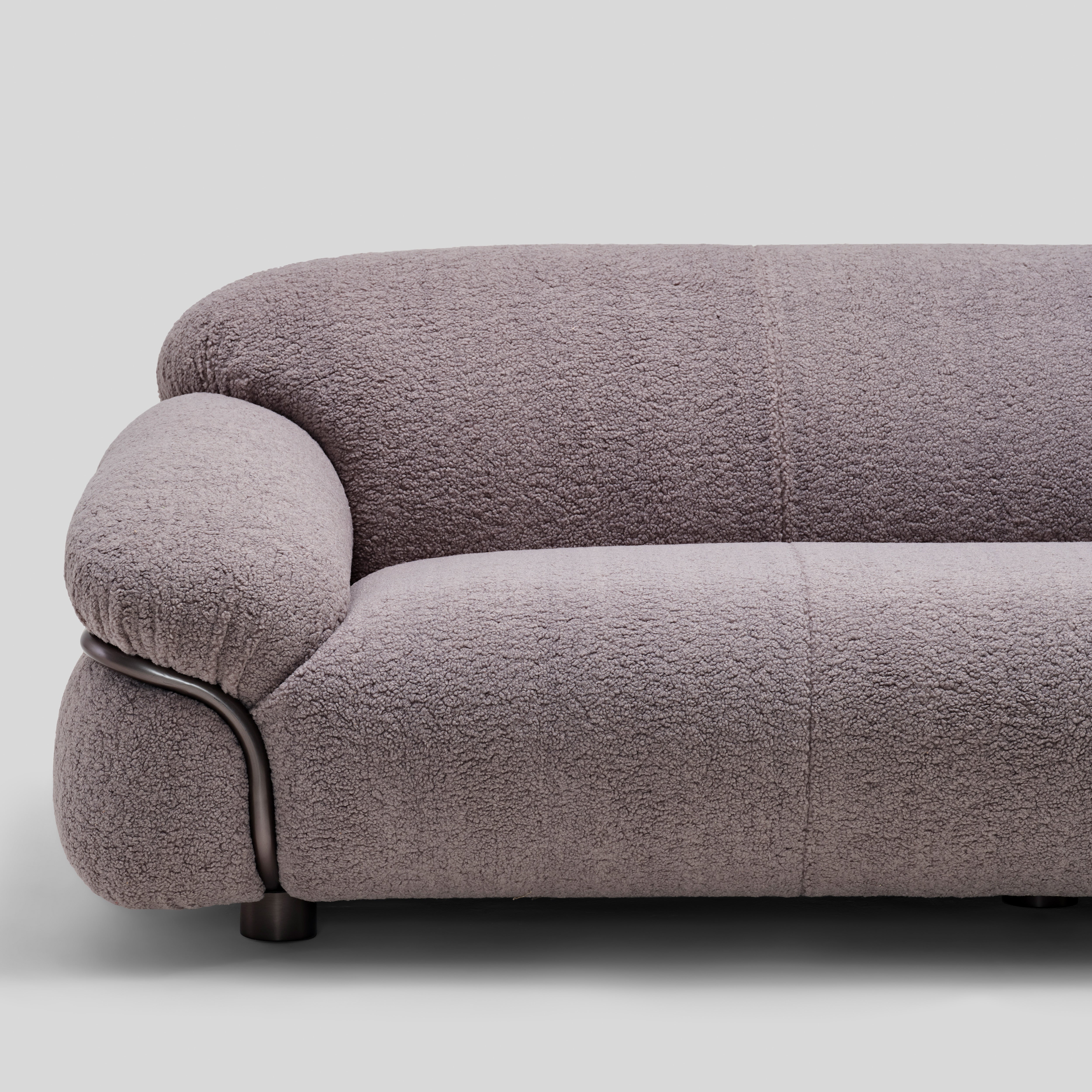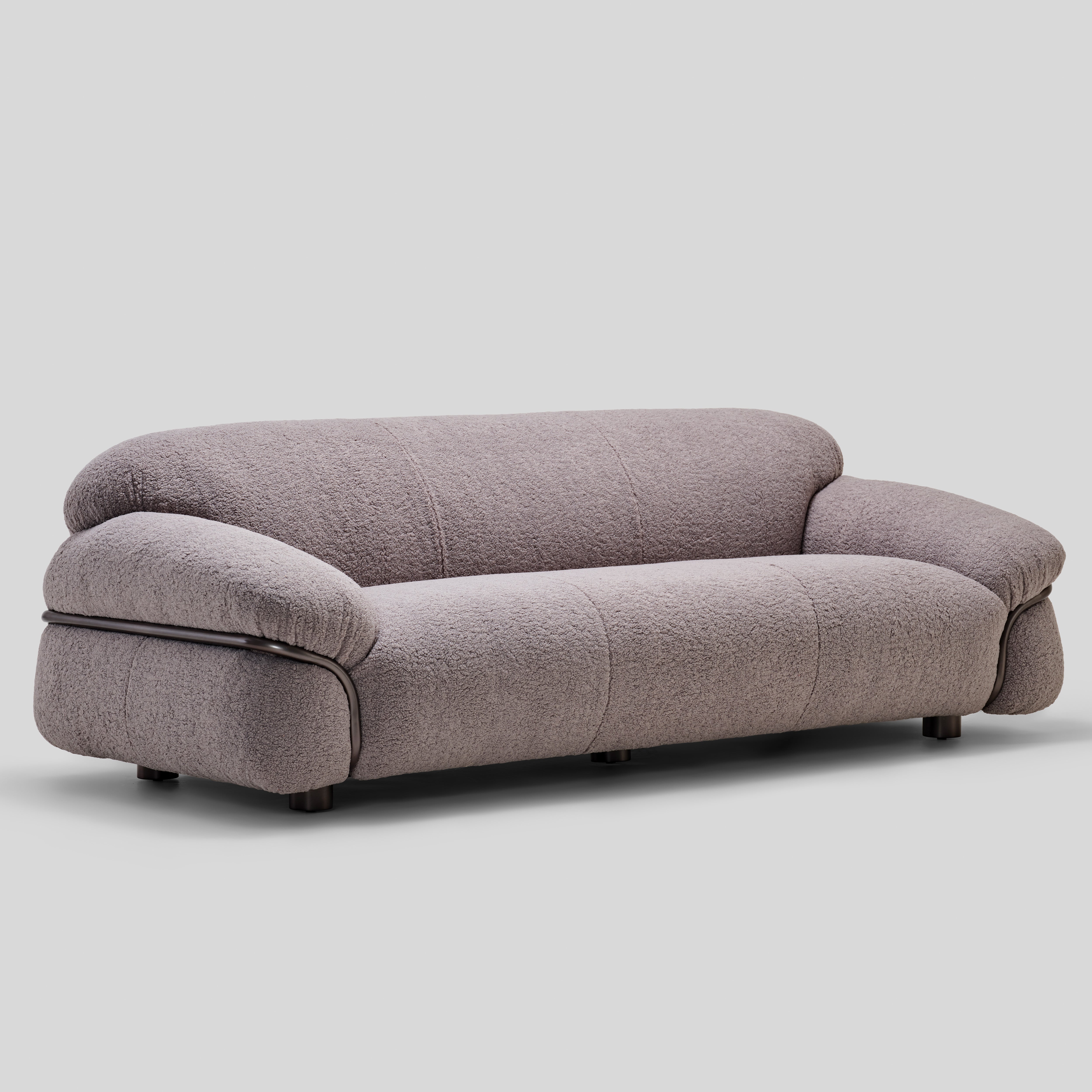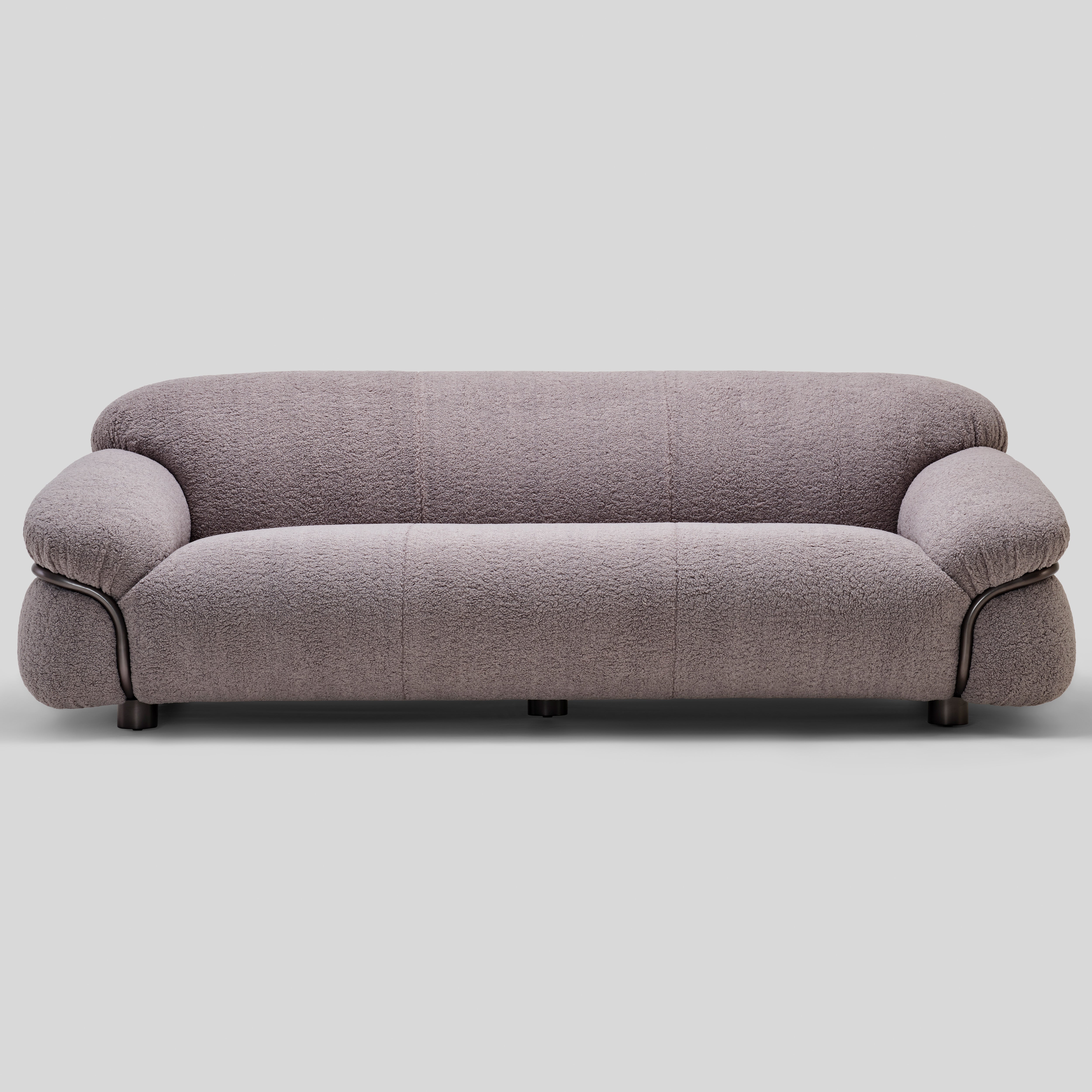 Generous in shape and beautifully cushioned, this sofa brings a mellow, inviting presence to any room. Its rounded volumes create a soft, uninterrupted silhouette, subtly traced with metal detailing that adds refinement without noise. Designed for effortless relaxation, it settles into modern homes with natural grace and quiet charm.