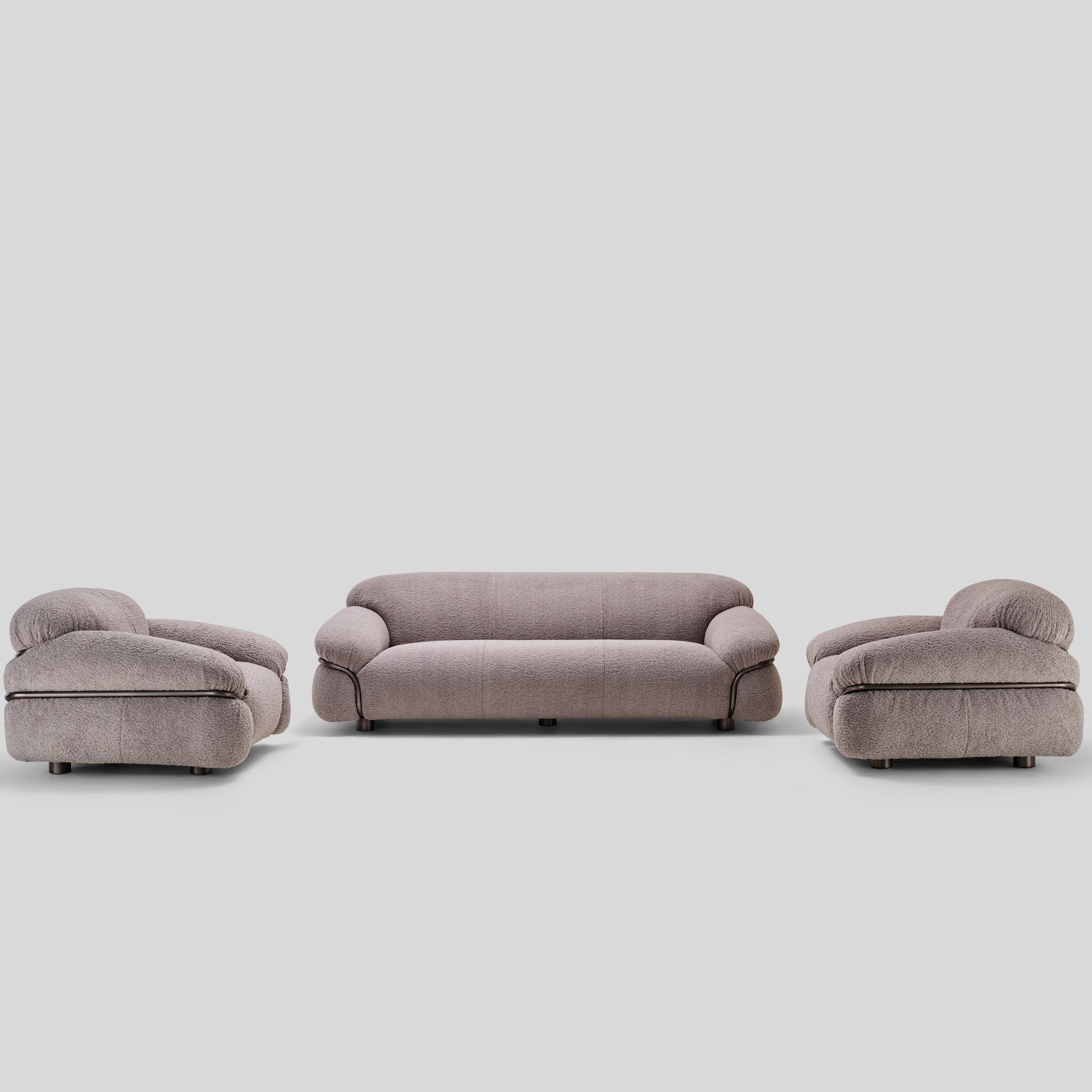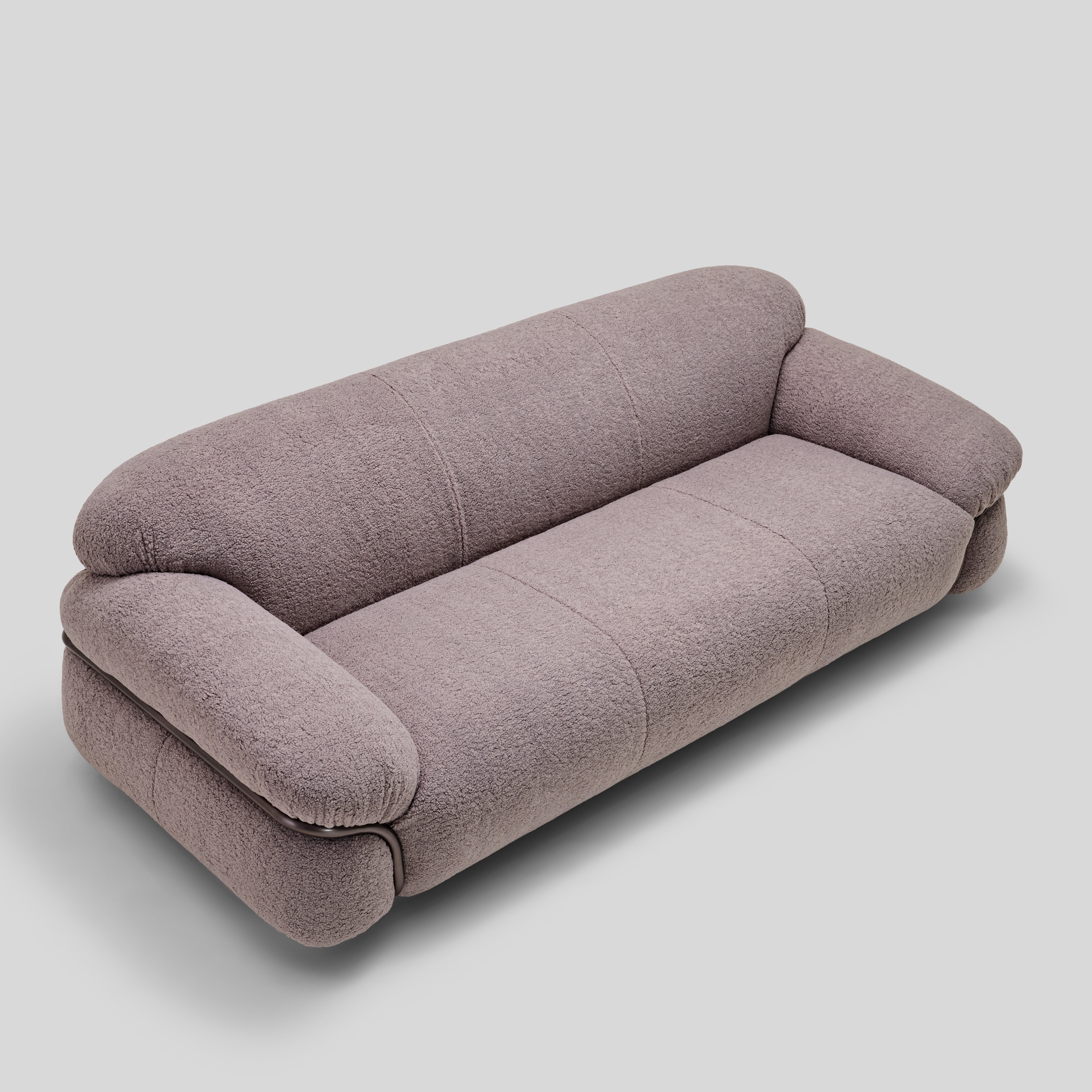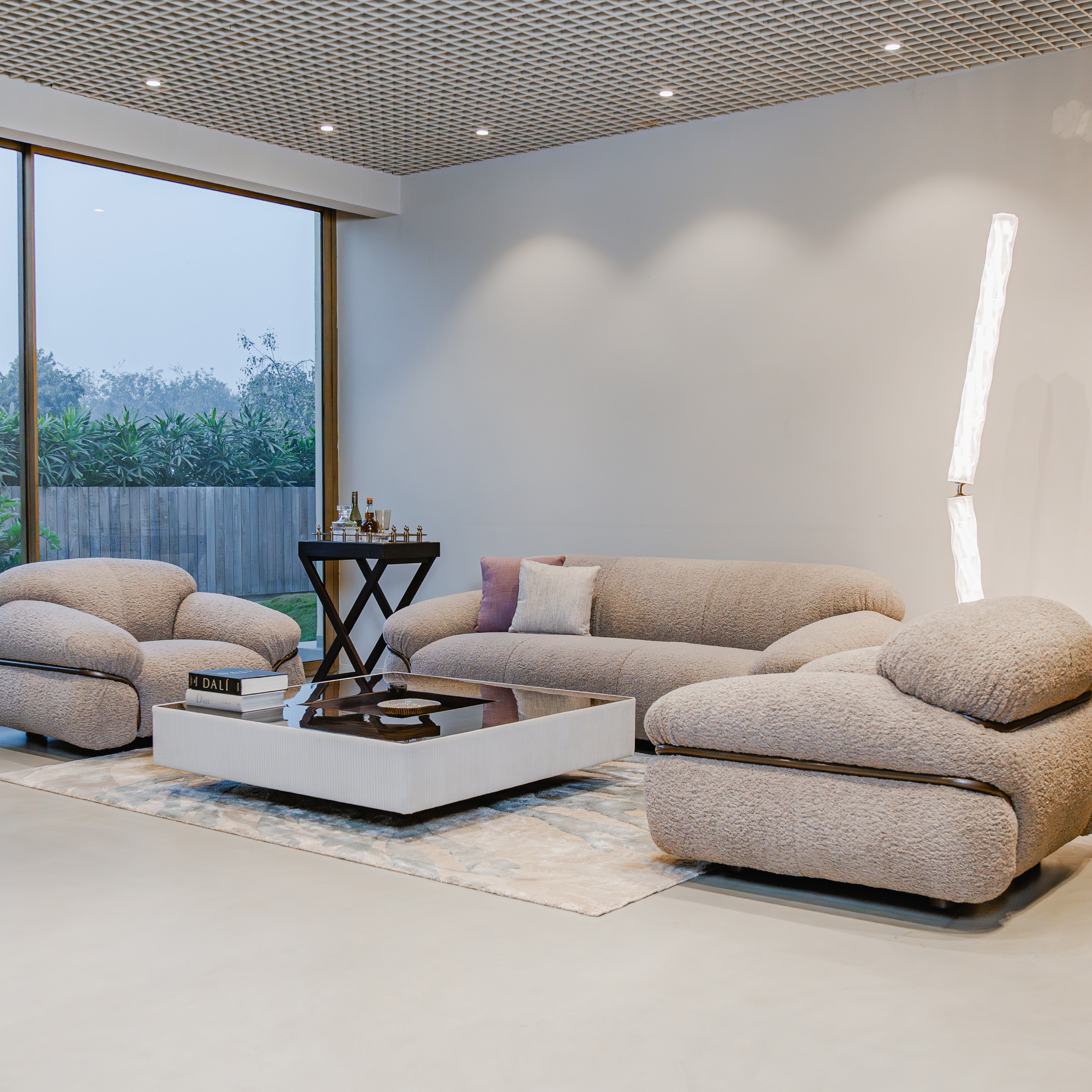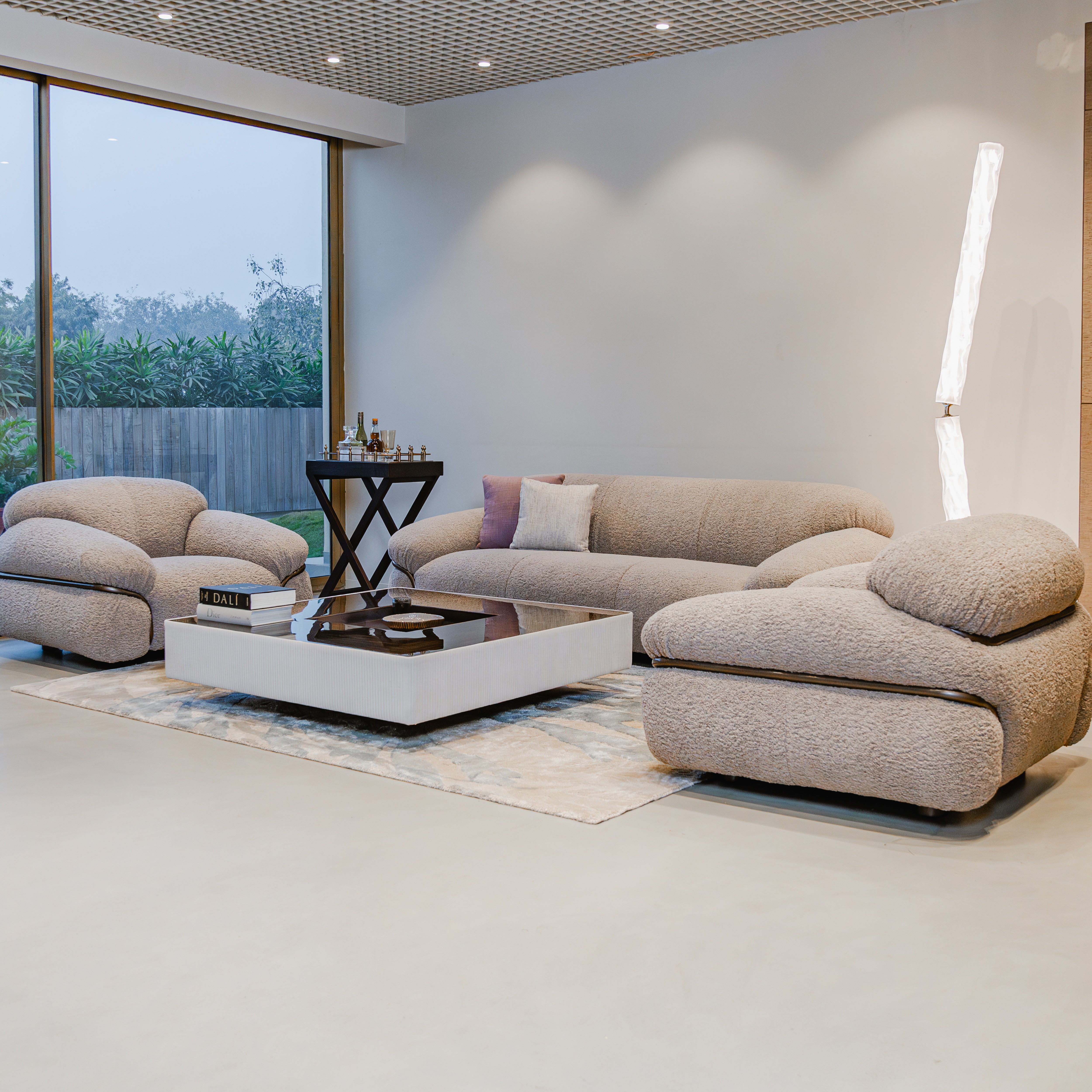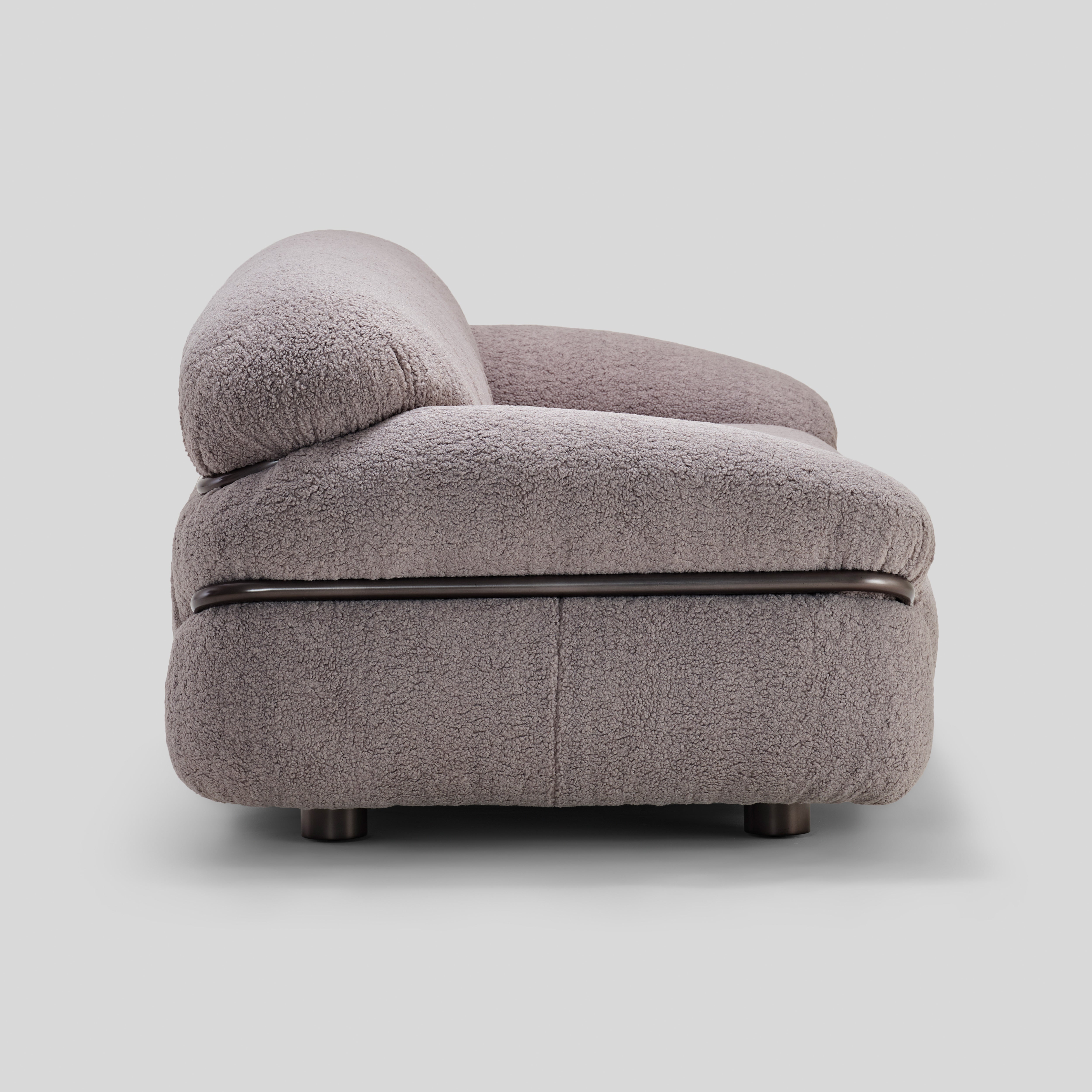 Generous in shape and beautifully cushioned, this sofa brings a mellow, inviting presence to any room. Its rounded volumes create a soft, uninterrupted silhouette, subtly traced with metal detailing that adds refinement without noise. Designed for effortless relaxation, it settles into modern homes with natural grace and quiet charm.