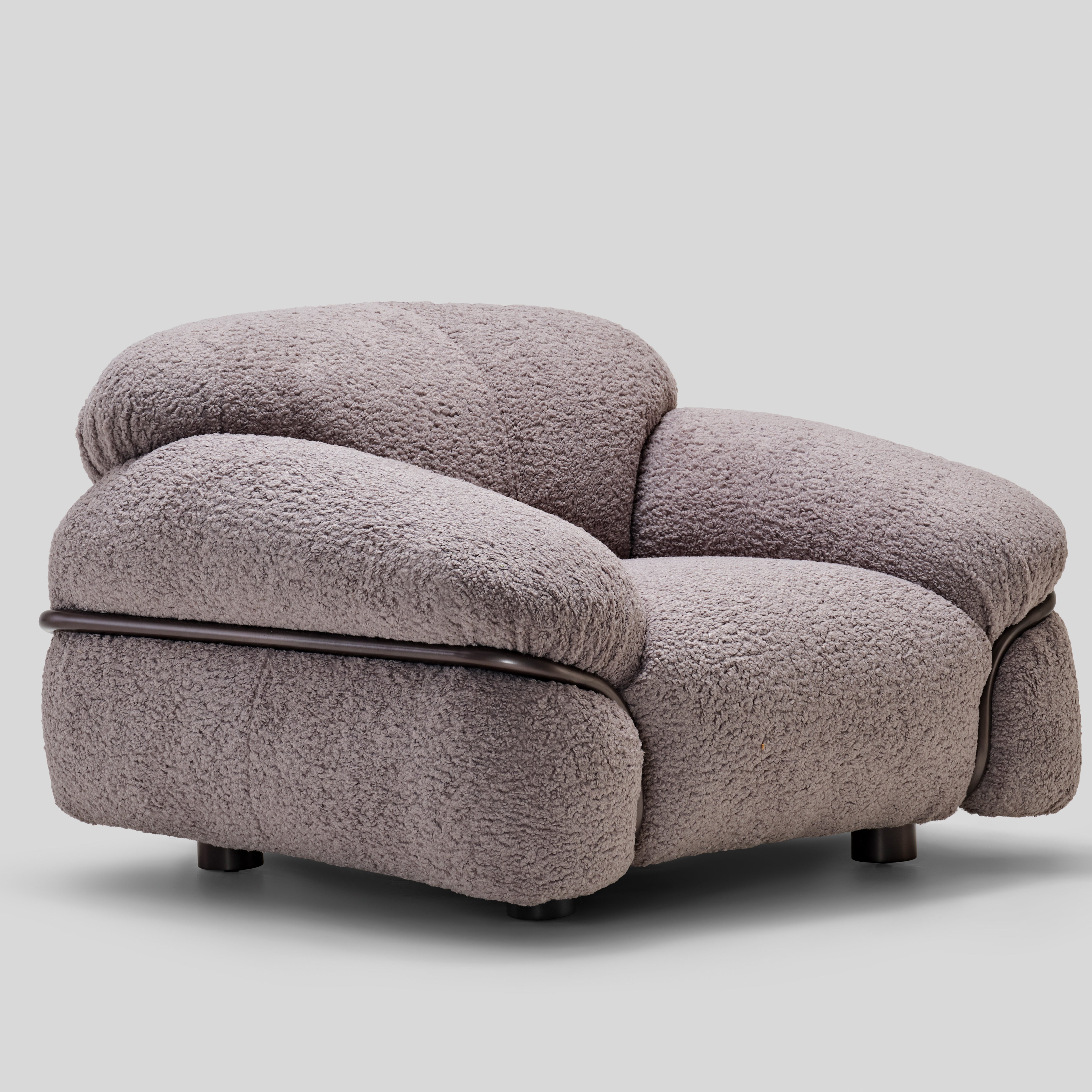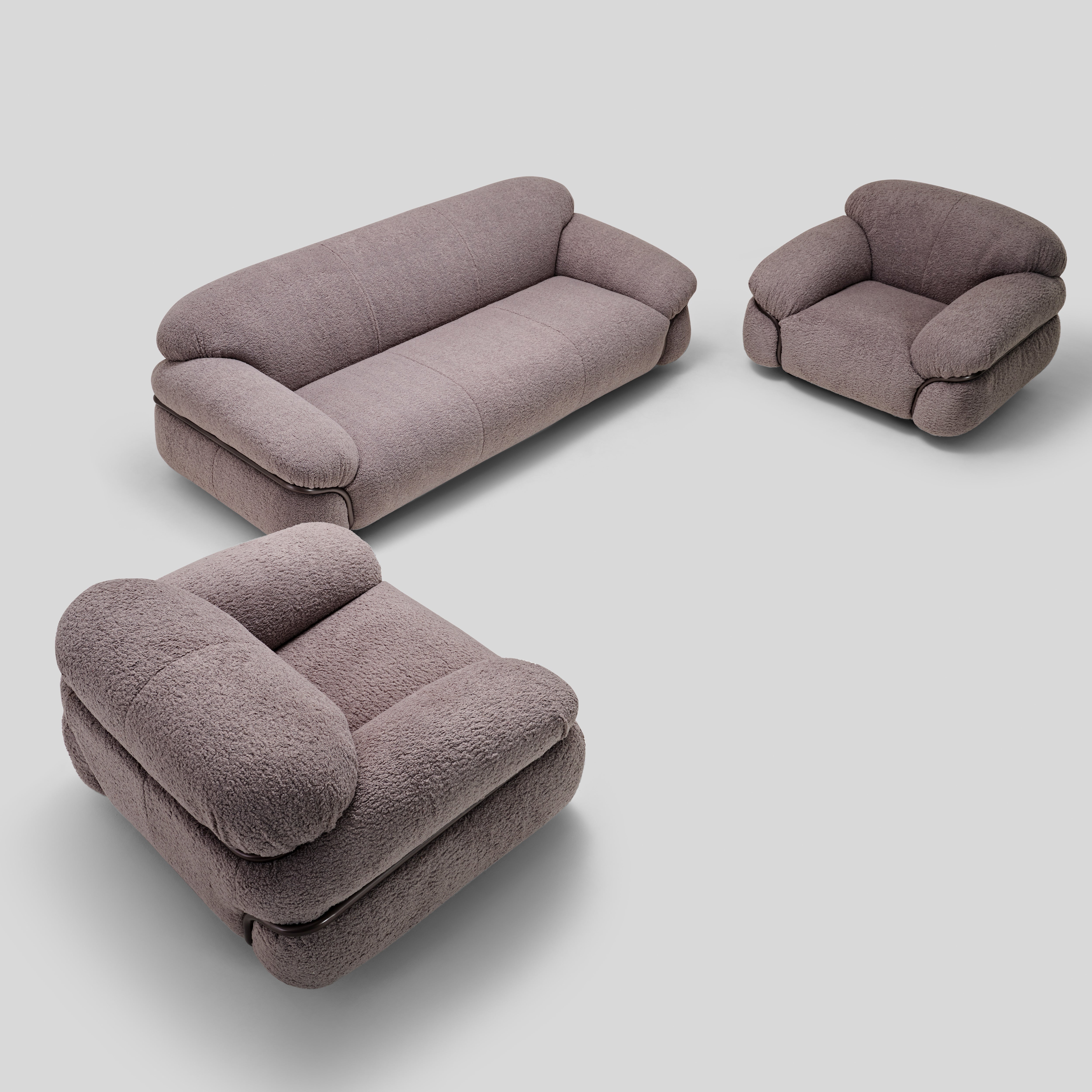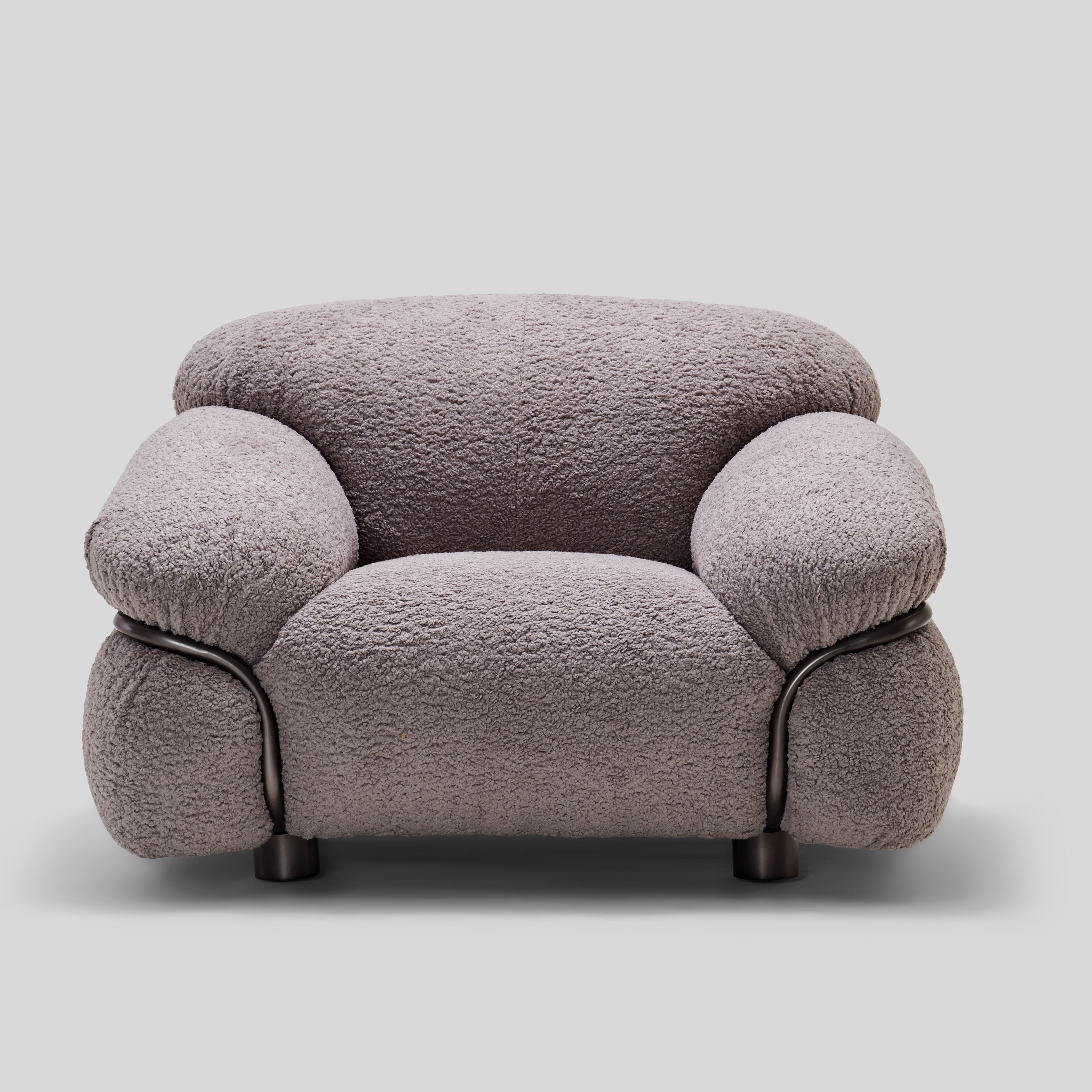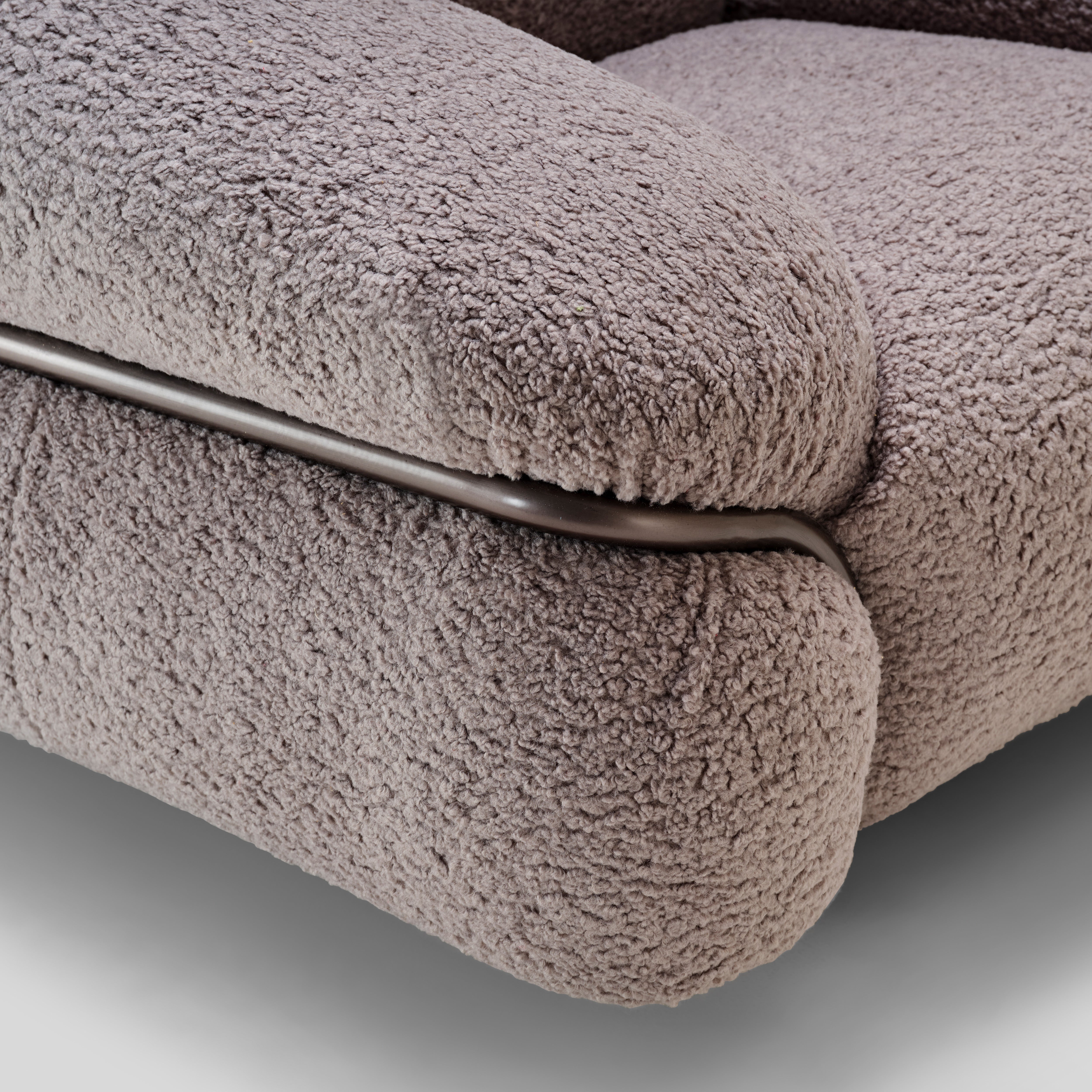 Generous in shape and beautifully cushioned, this sofa brings a mellow, inviting presence to any room. Its rounded volumes create a soft, uninterrupted silhouette, subtly traced with metal detailing that adds refinement without noise. Designed for effortless relaxation, it settles into modern homes with natural grace and quiet charm.