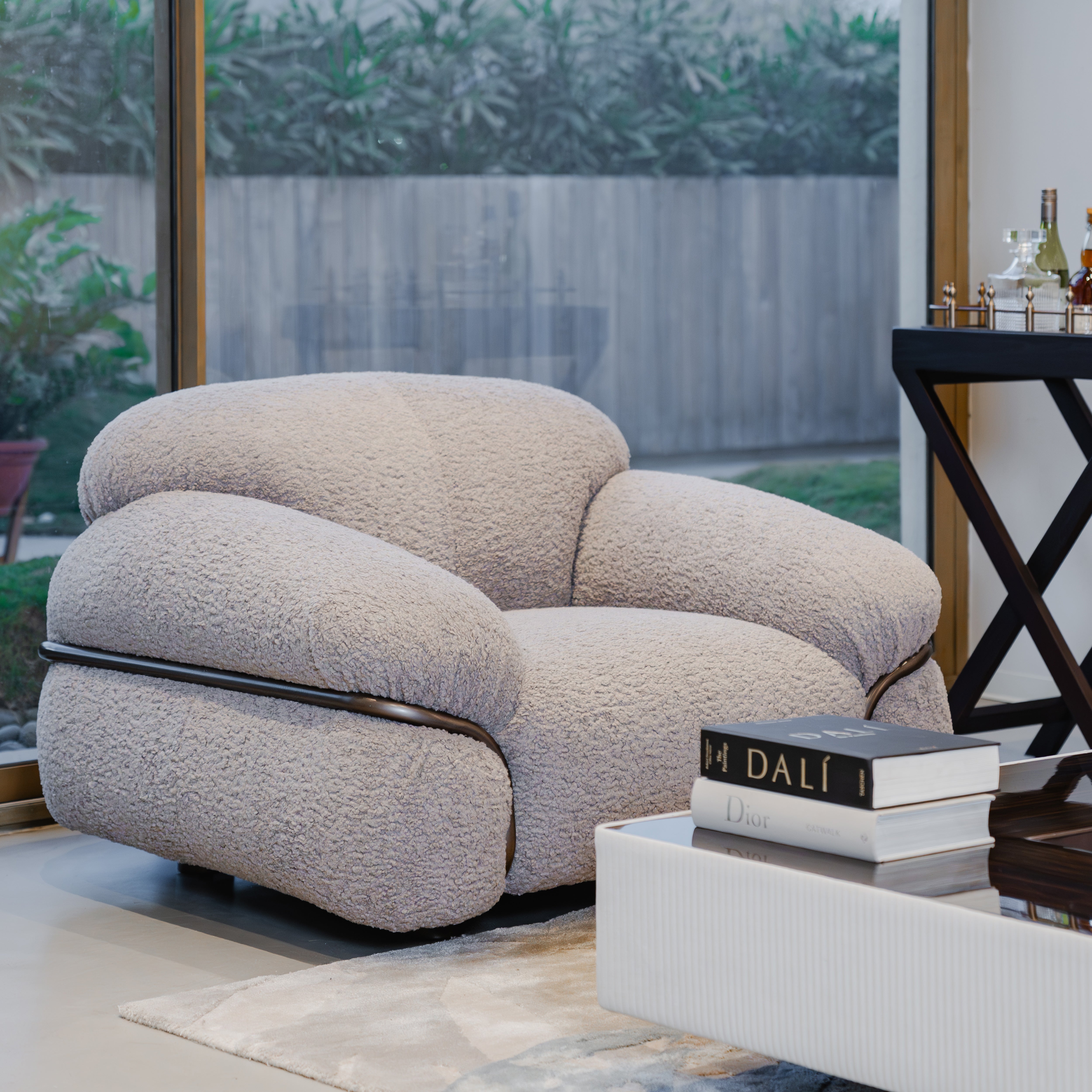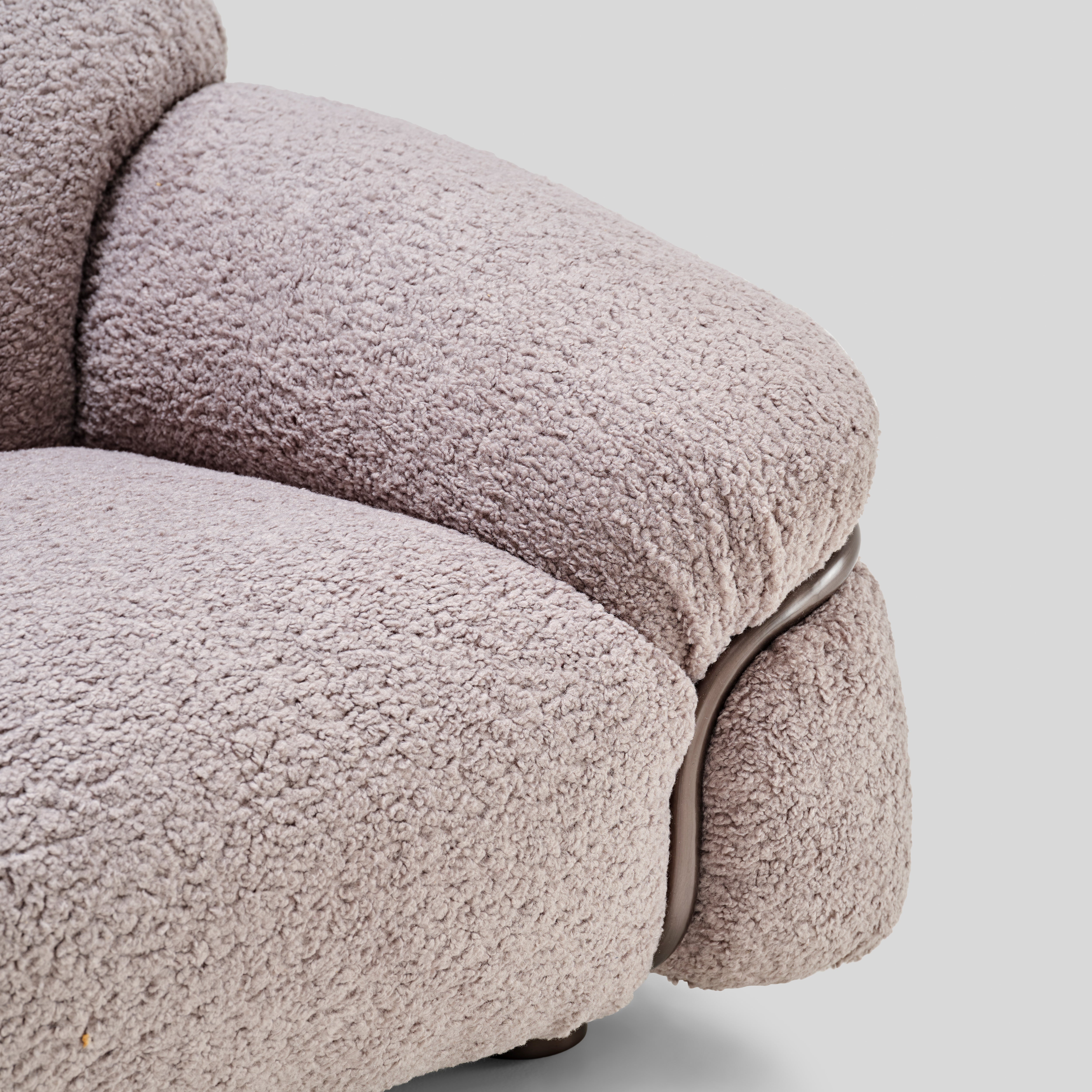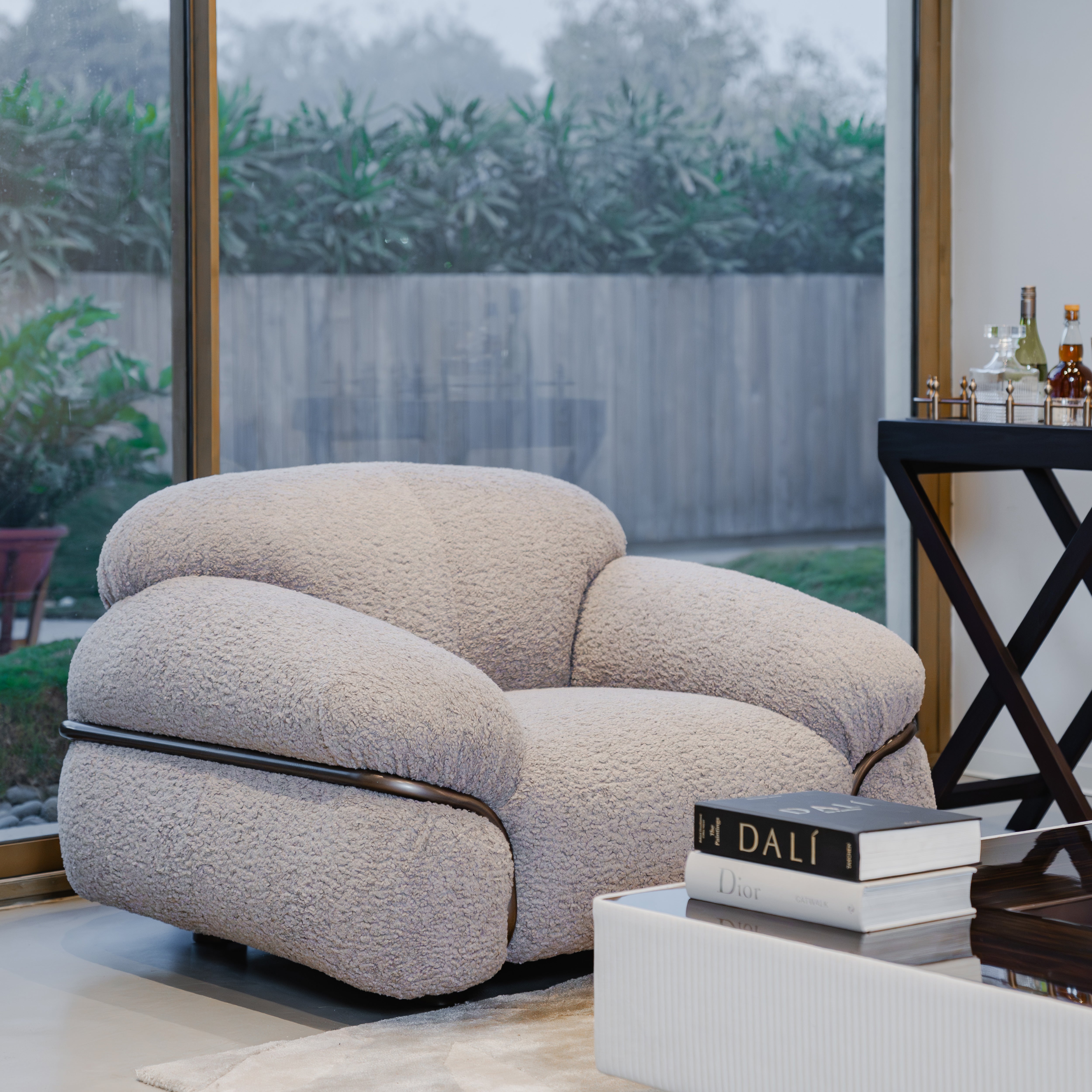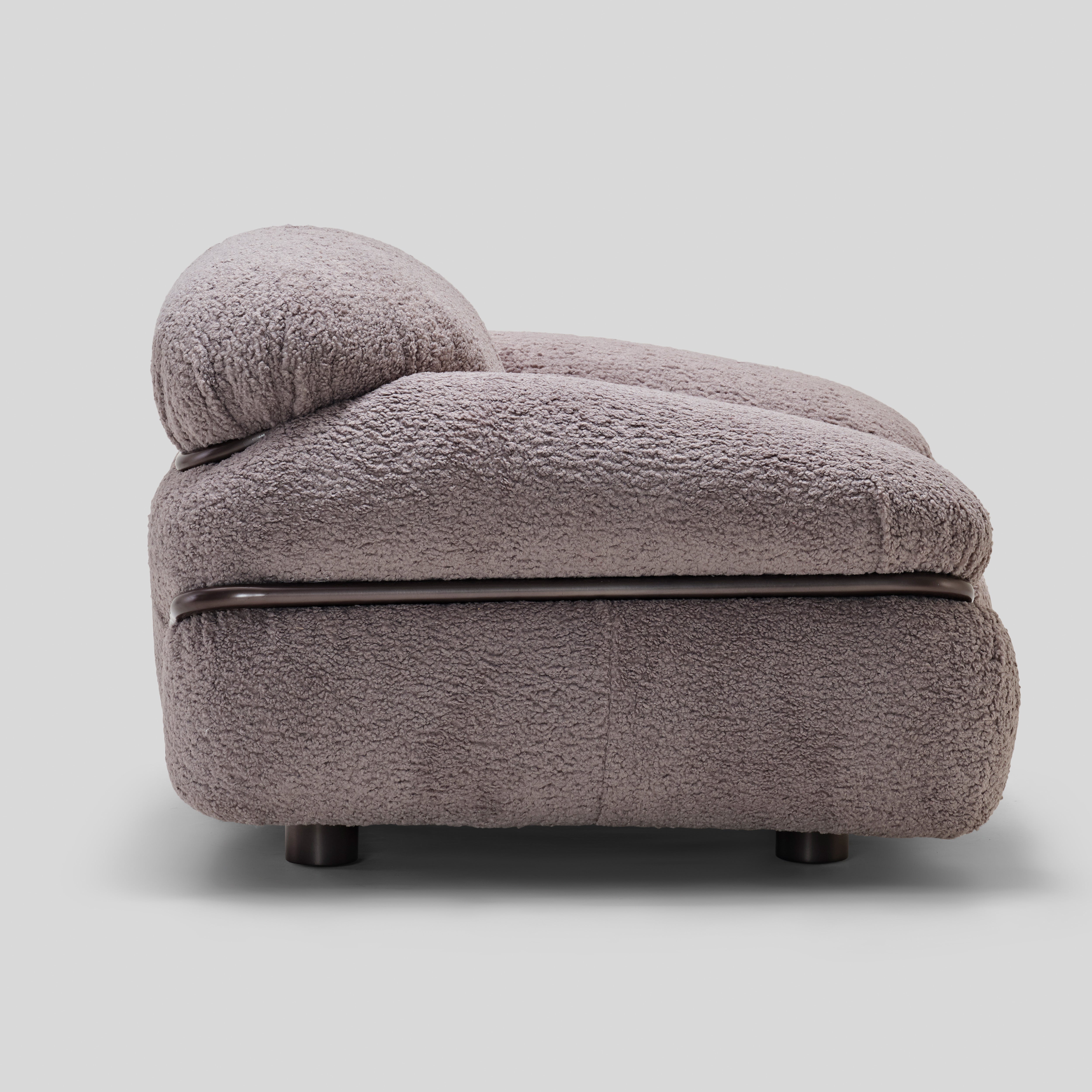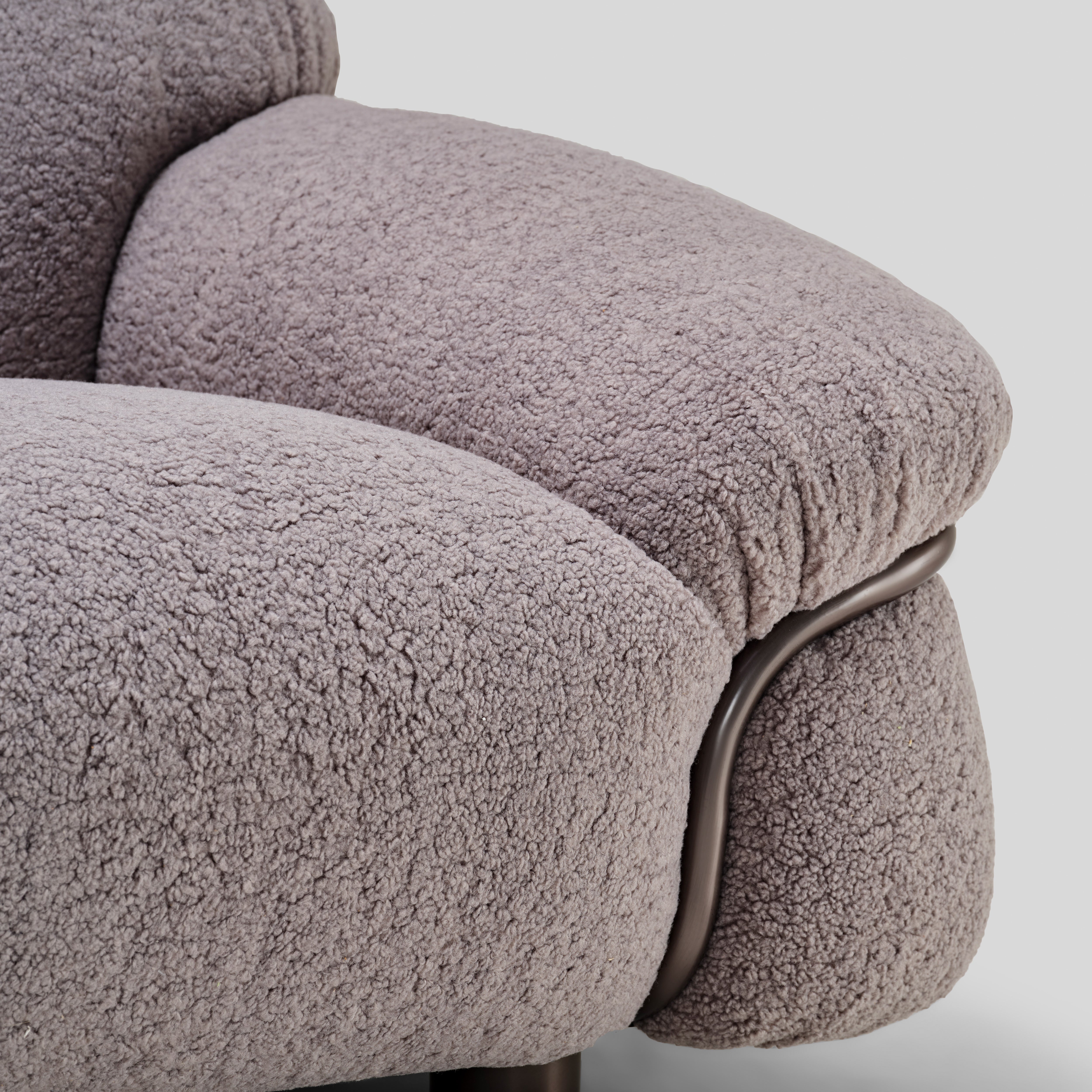 Generous in shape and beautifully cushioned, this sofa brings a mellow, inviting presence to any room. Its rounded volumes create a soft, uninterrupted silhouette, subtly traced with metal detailing that adds refinement without noise. Designed for effortless relaxation, it settles into modern homes with natural grace and quiet charm.