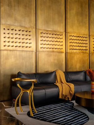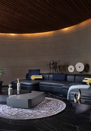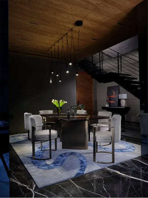 Set in elite upholstery, sculpted surfaces in rich wood and stone, each element is designed to complement the home’s clean architectural lines while introducing warmth through tones and texture. The crystalline surface catching light in ethereal glimmers of the selenite top coffee table create a subtle, celestial glow.