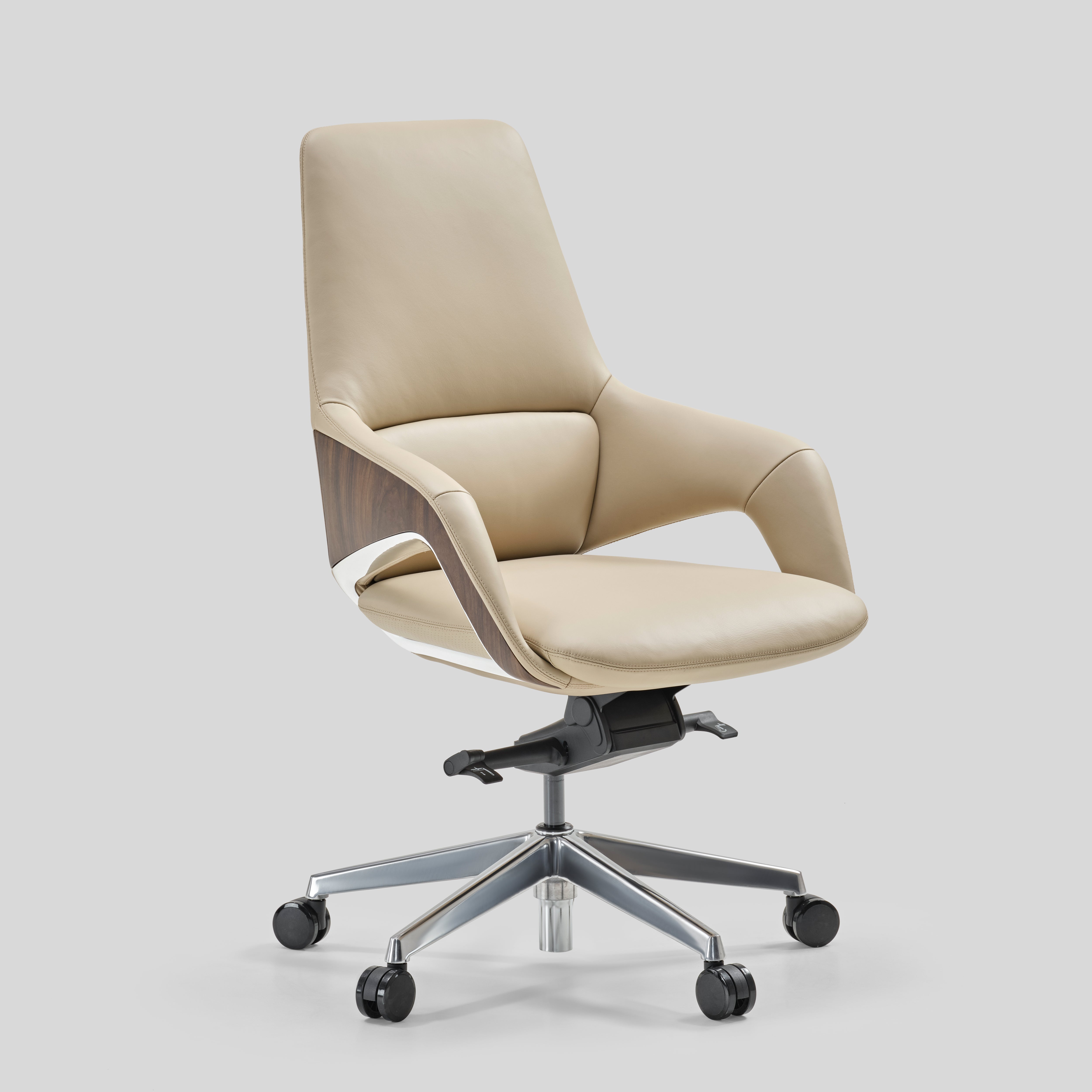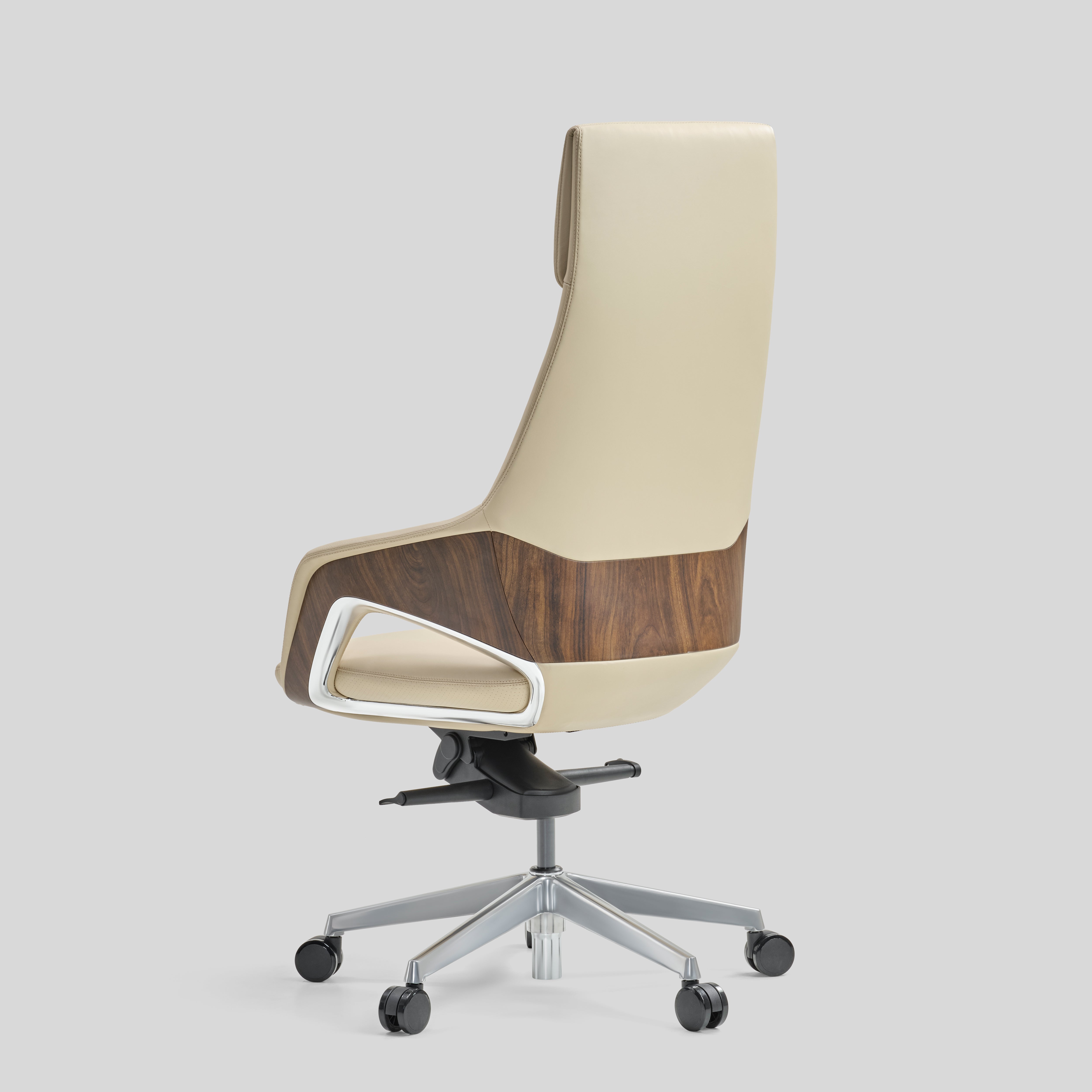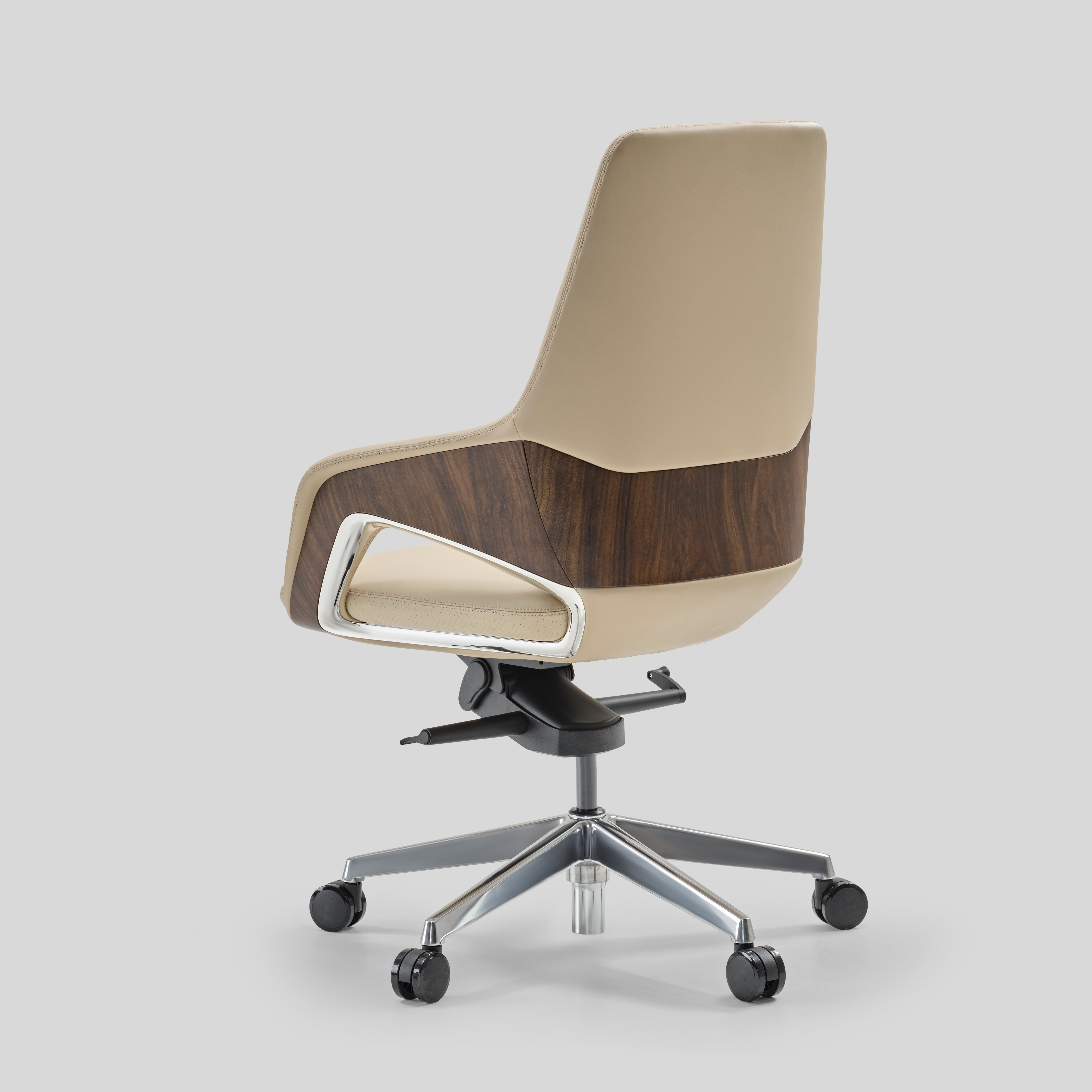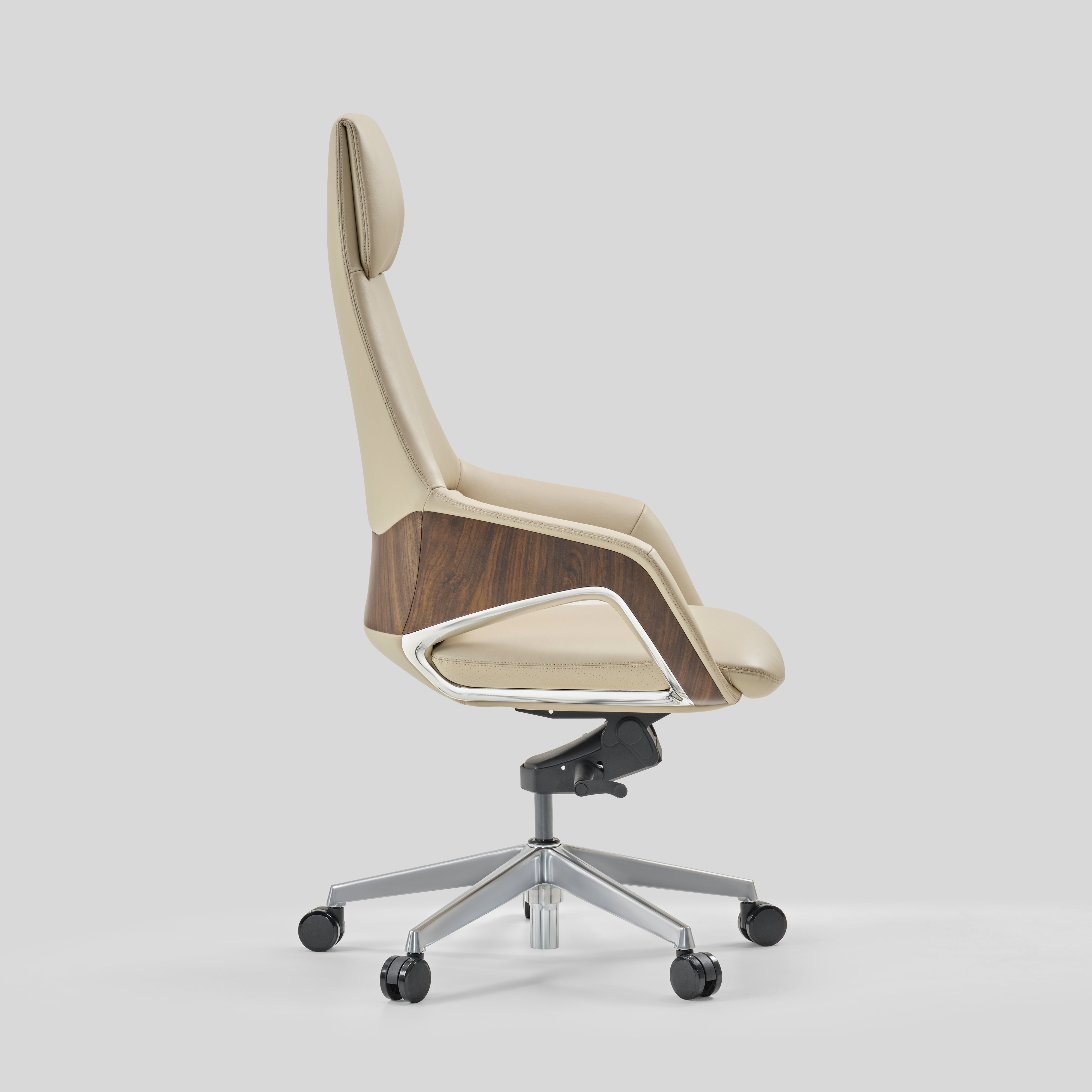 - armrest upholstered in leather with chrome and veneer accents, Base in die-cast aluminium and Nylon