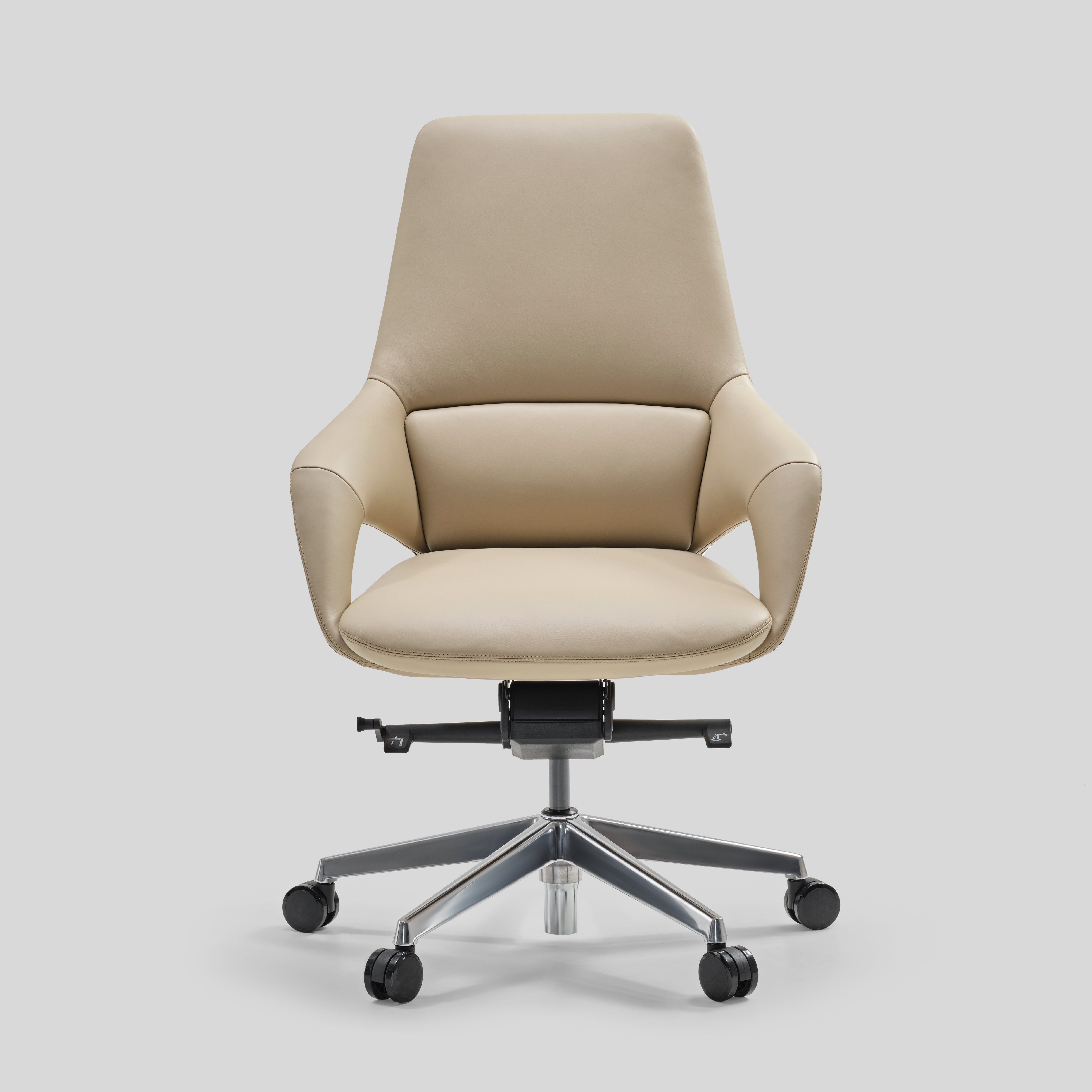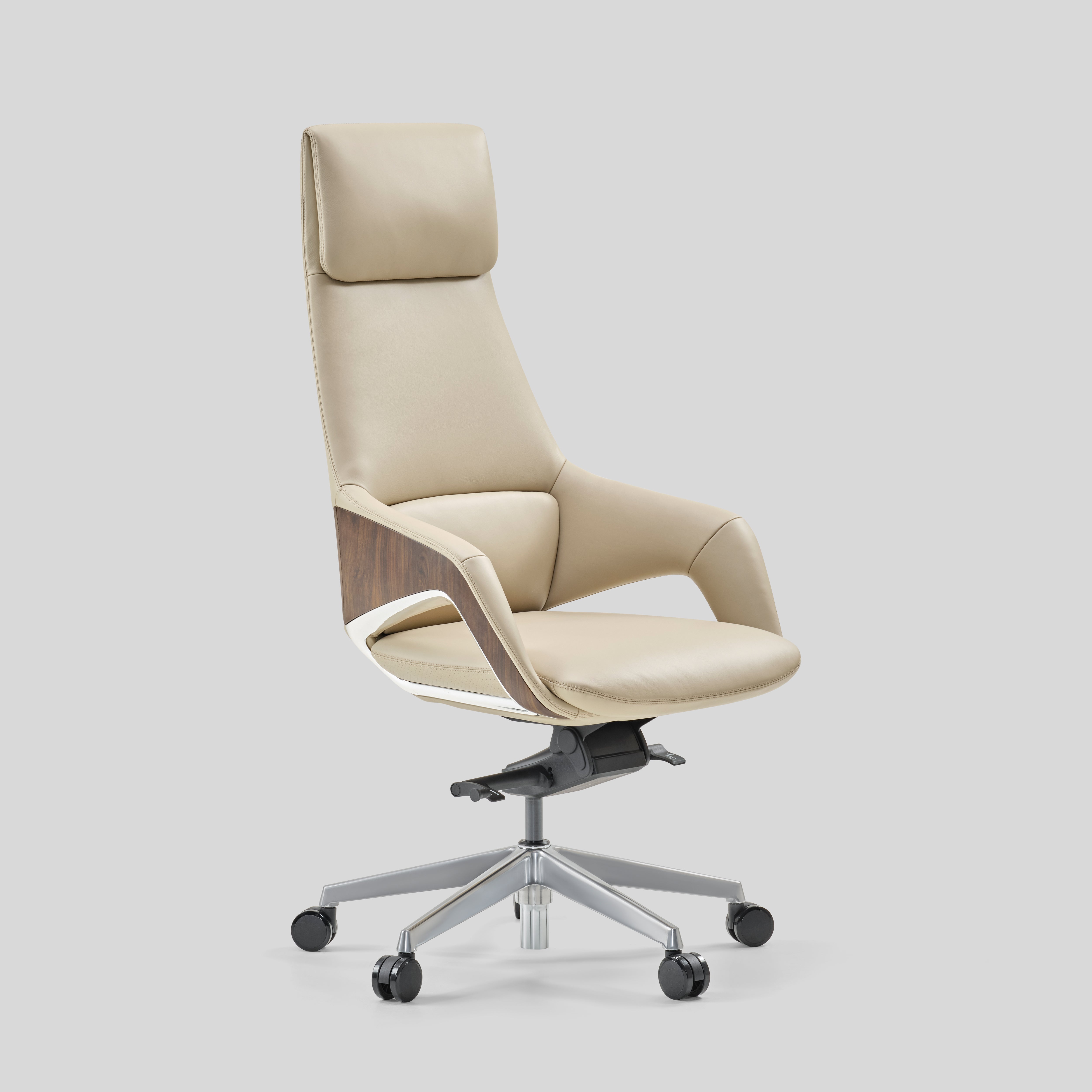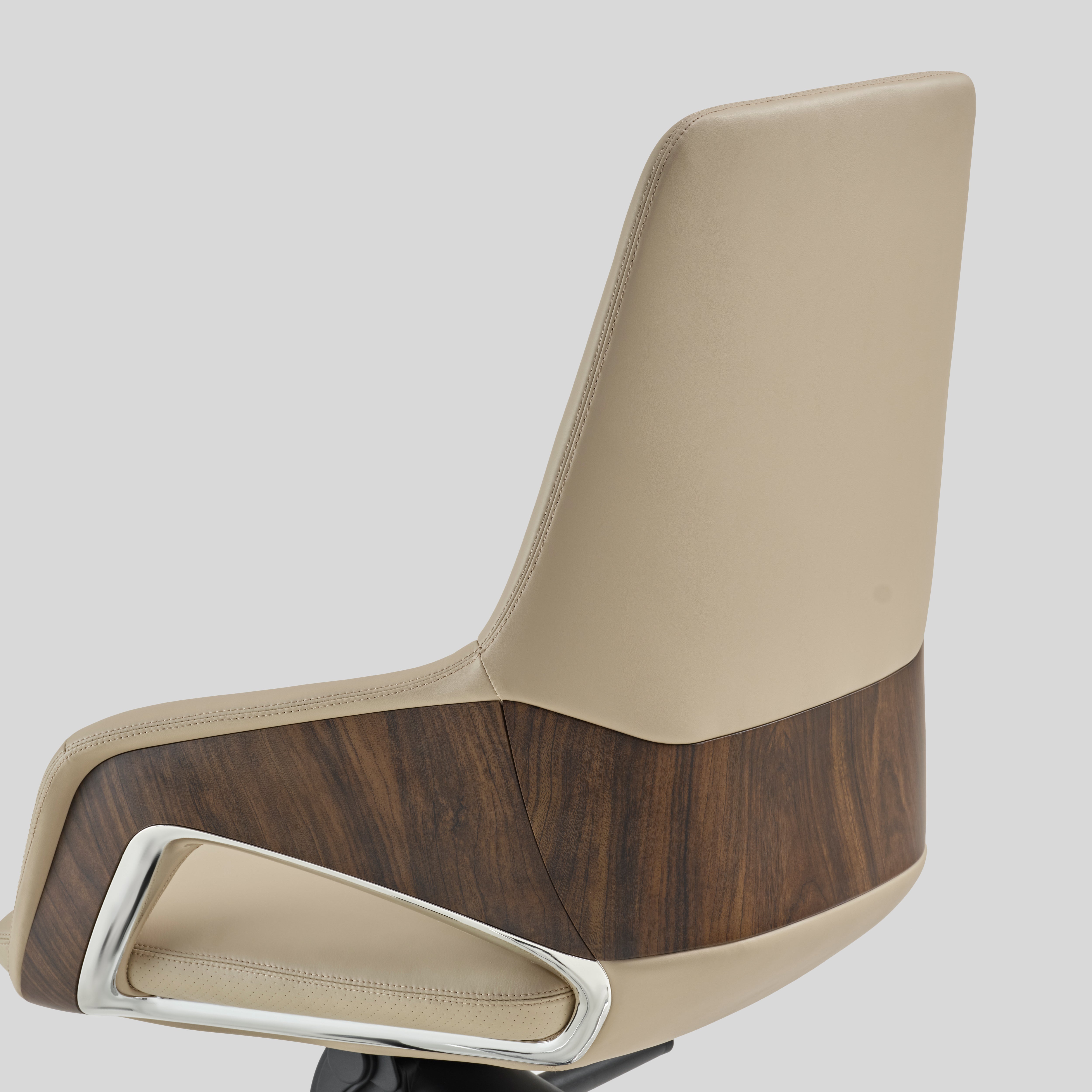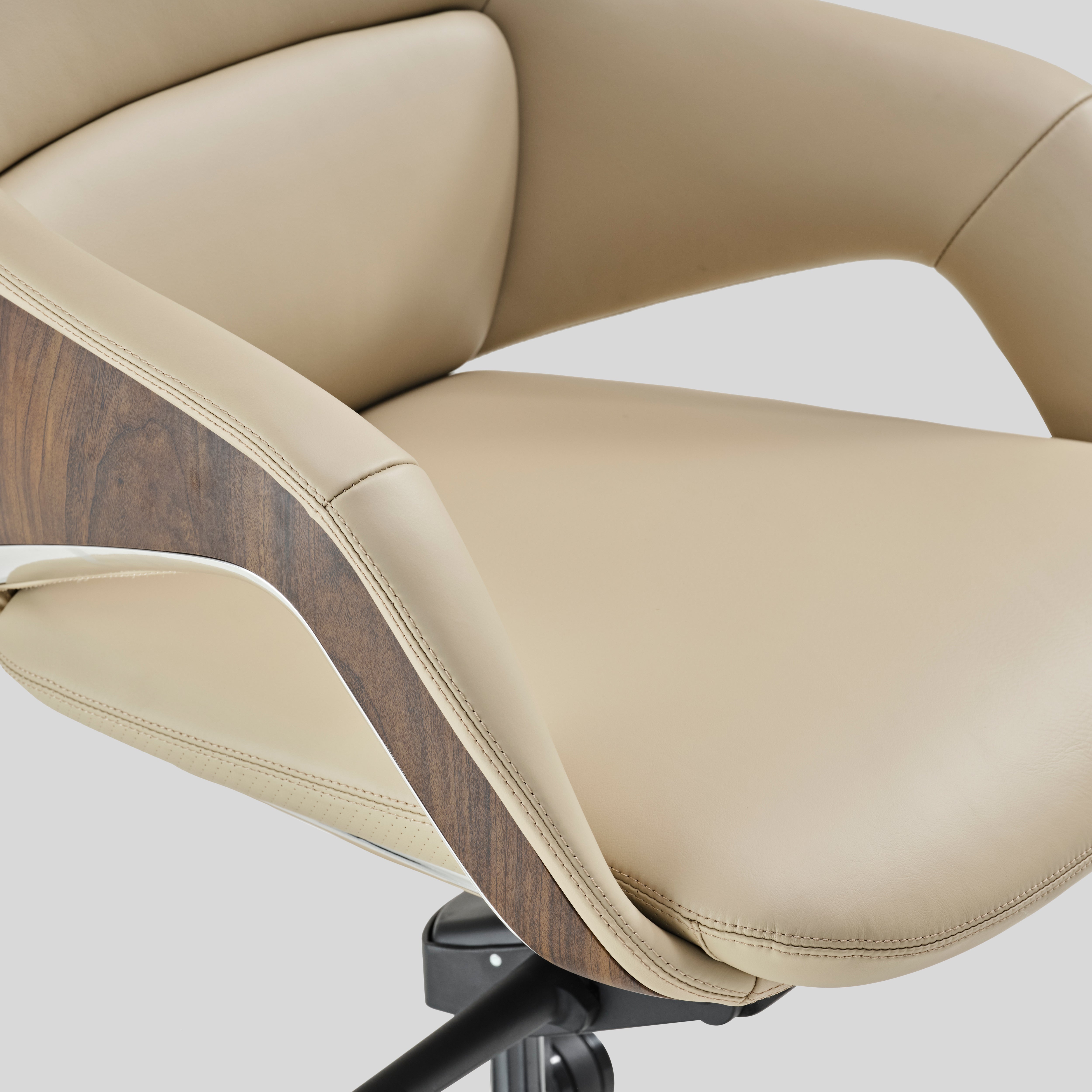 - armrest upholstered in leather with chrome and veneer accents, Base in die-cast aluminium and Nylon