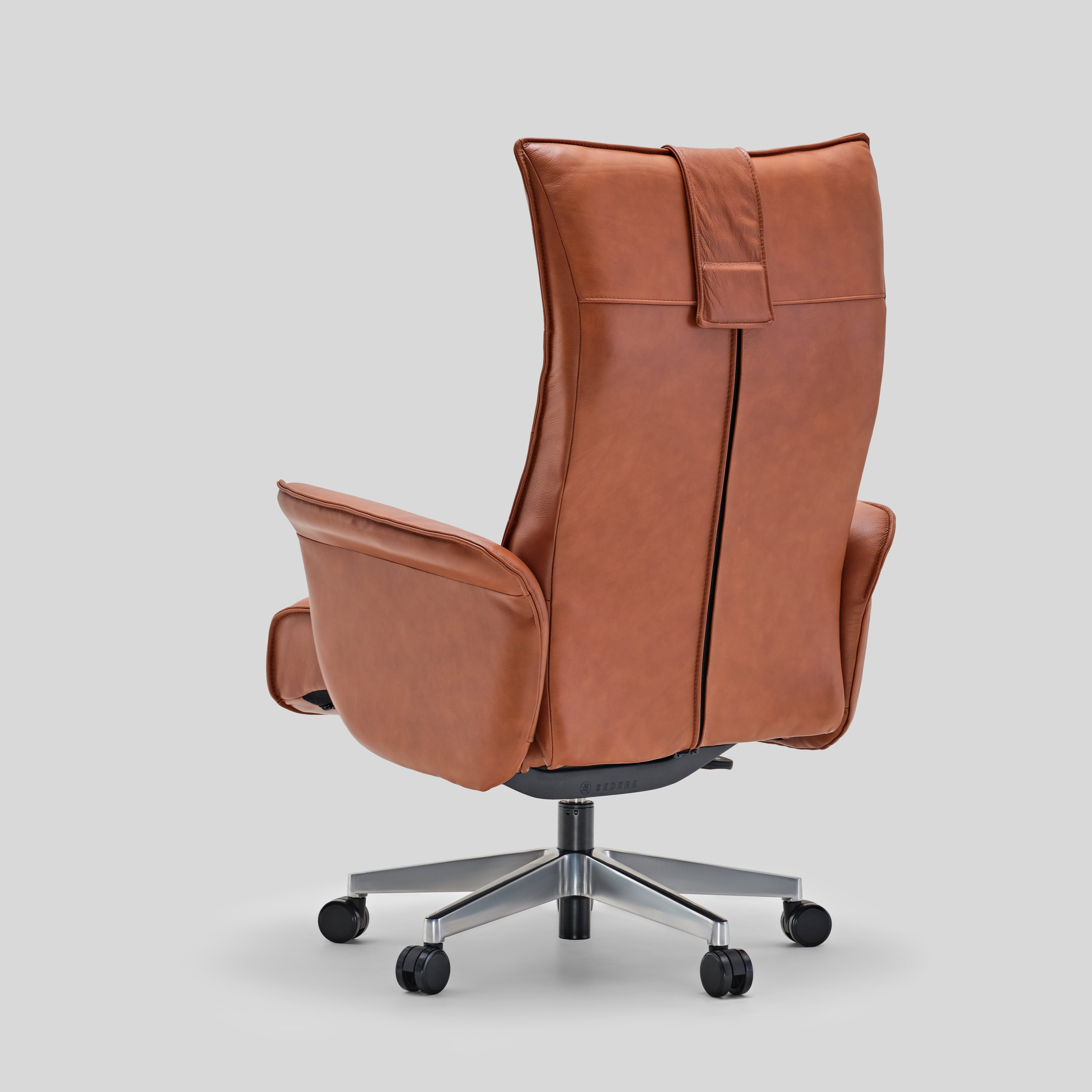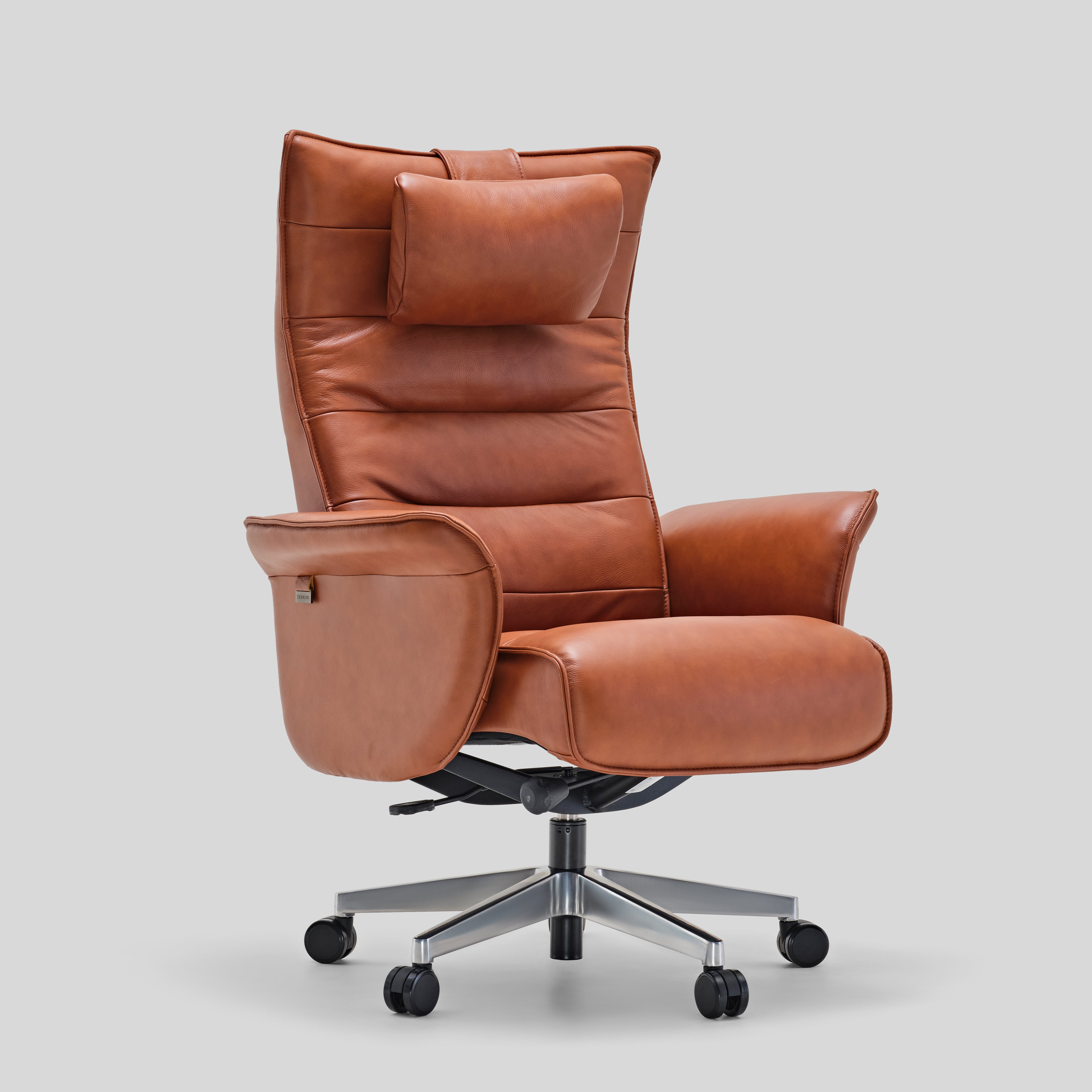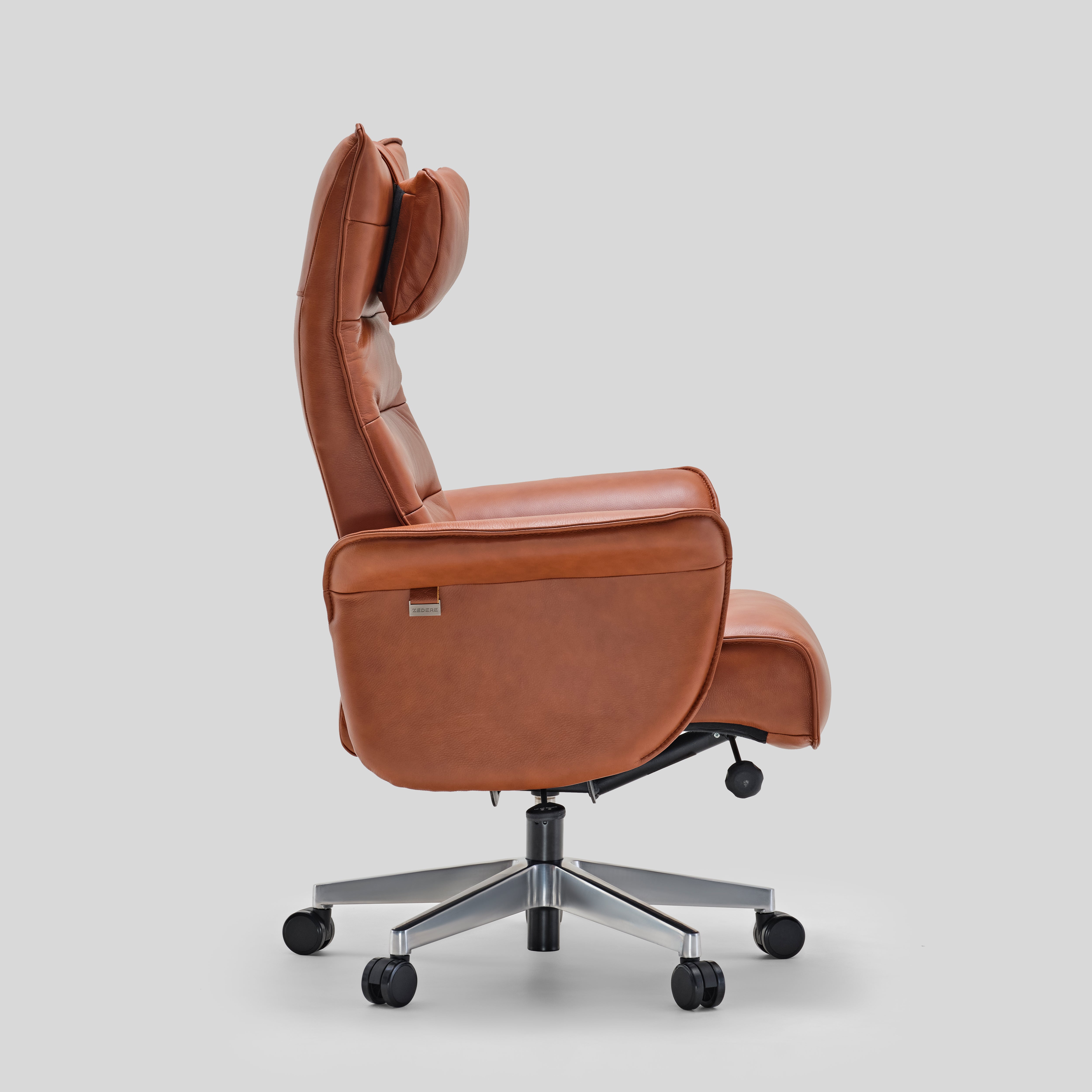 Trento office chair blends sculptural style with ergonomic intelligence. The knee-tilt single lock mechanism and strong lumbar support with detachable headrest ensures all-day comfort. a smooth 360° swivel with durable nylon casters provides effortless mobility on any office floor