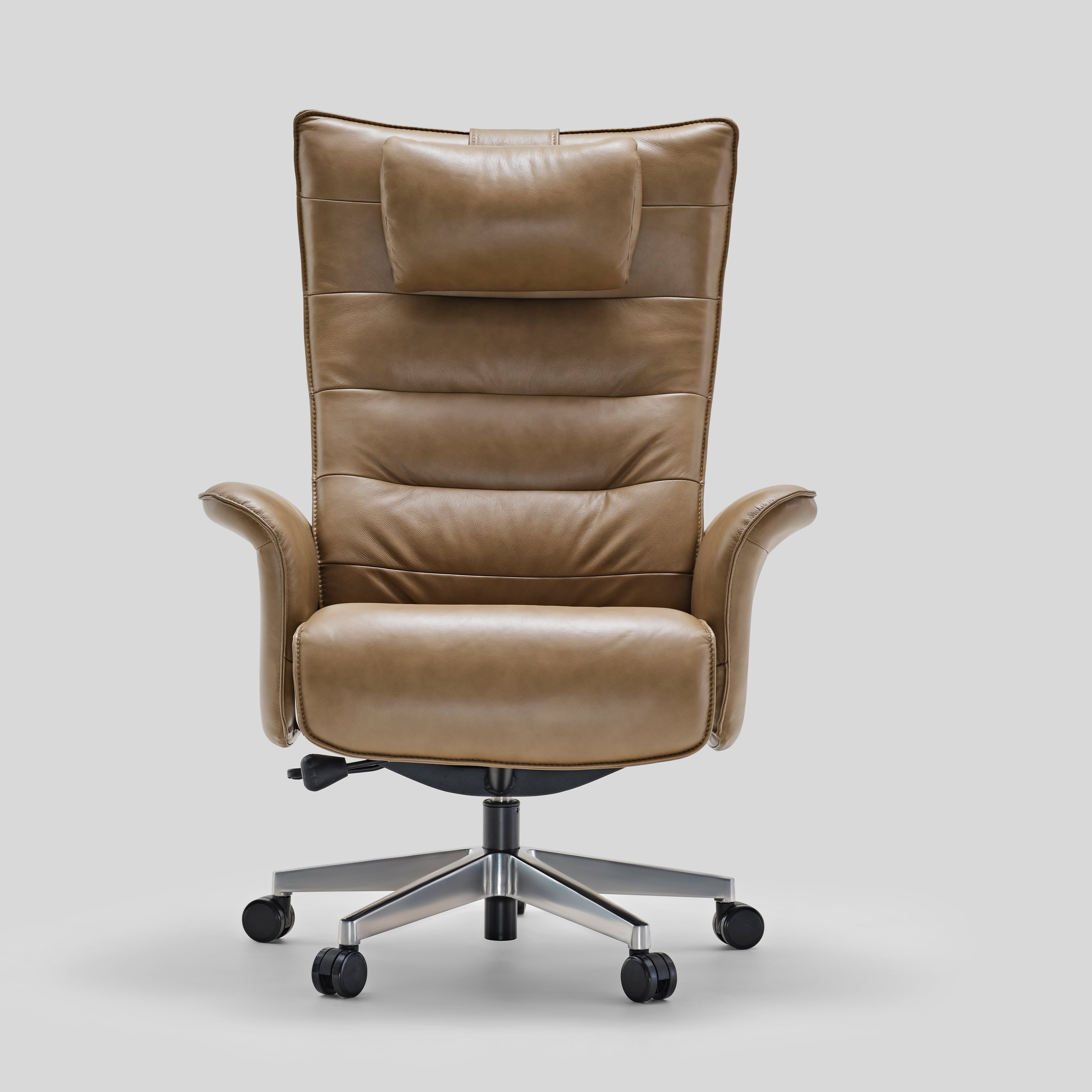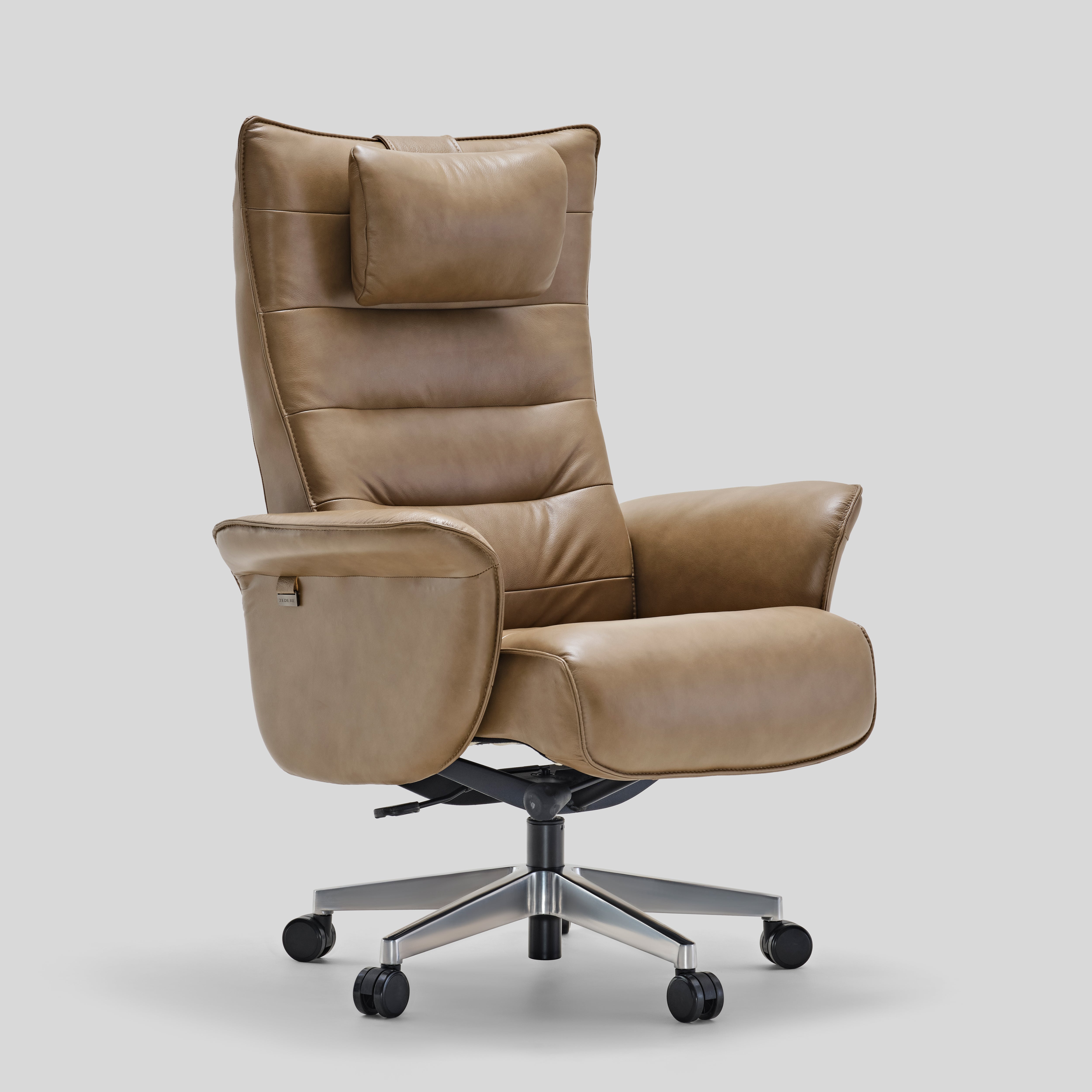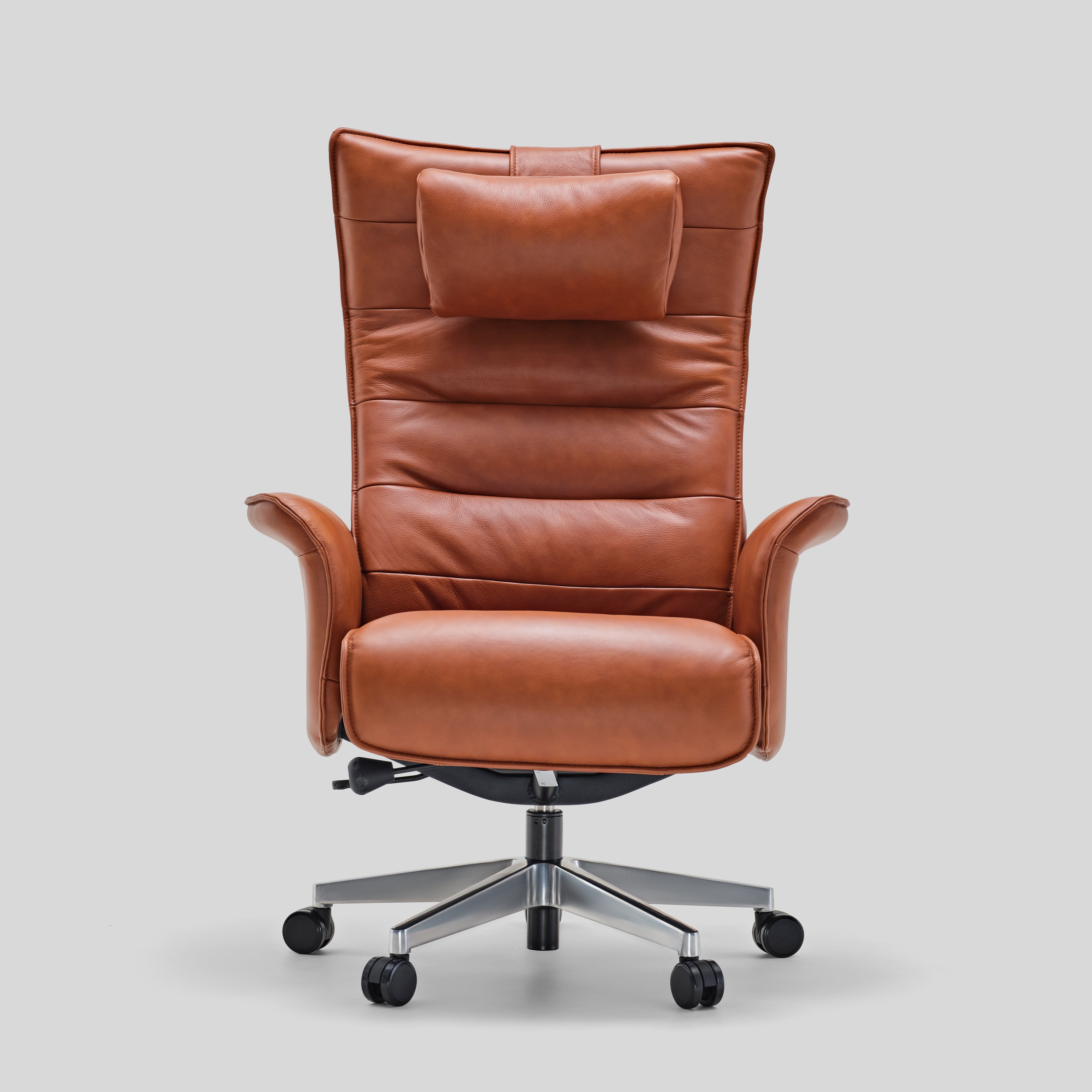 Trento office chair blends sculptural style with ergonomic intelligence. The knee-tilt single lock mechanism and strong lumbar support with detachable headrest ensures all-day comfort. a smooth 360° swivel with durable nylon casters provides effortless mobility on any office floor